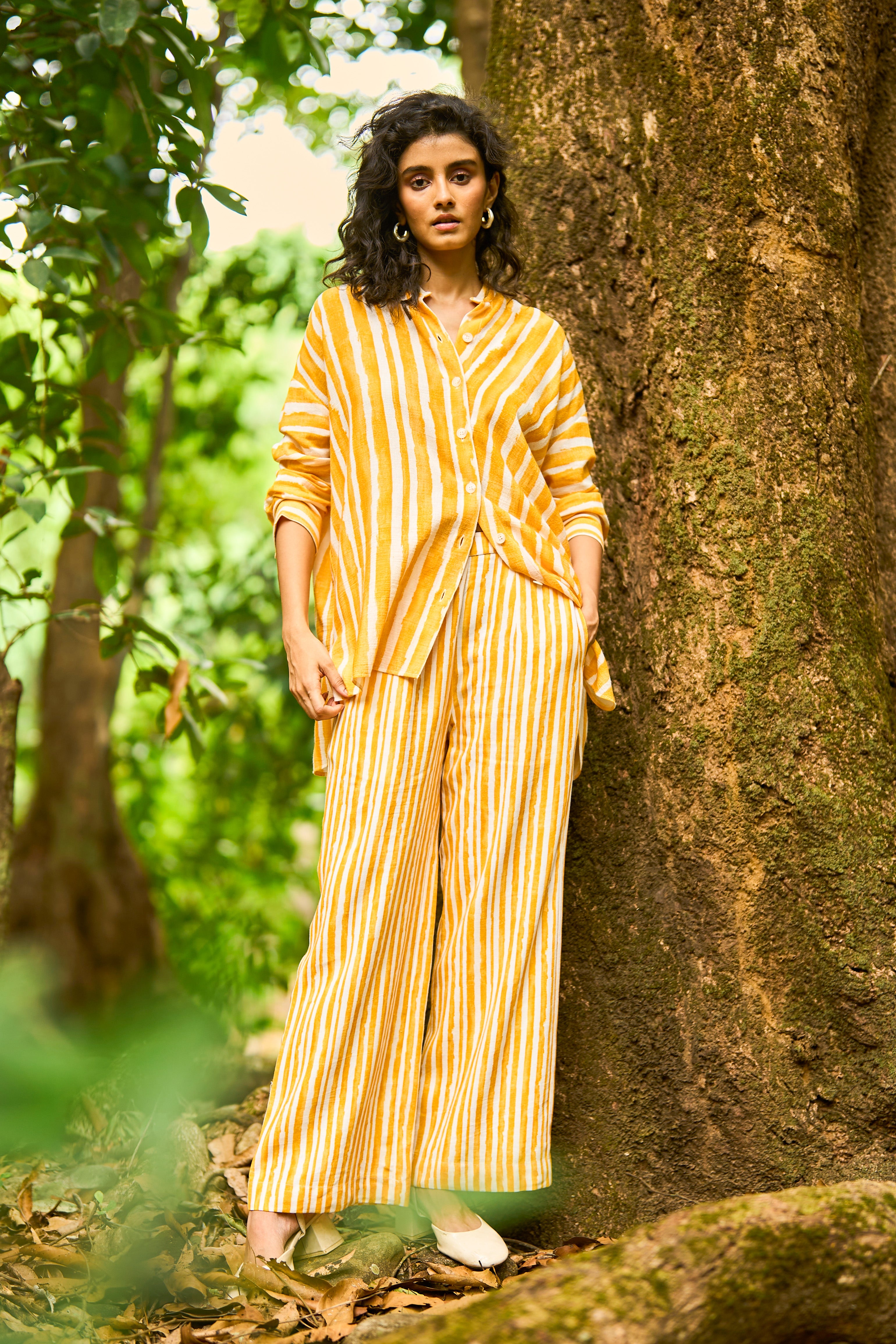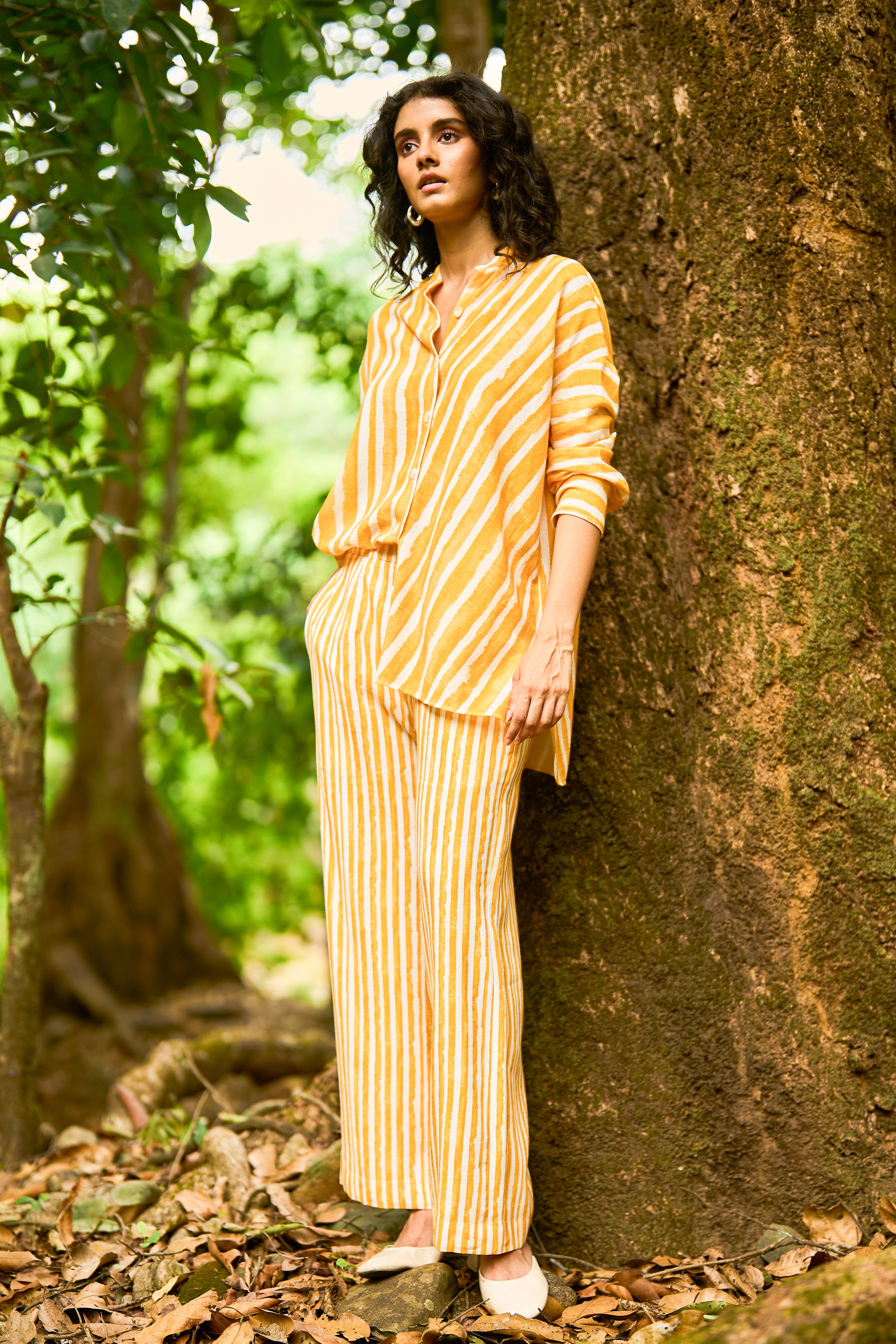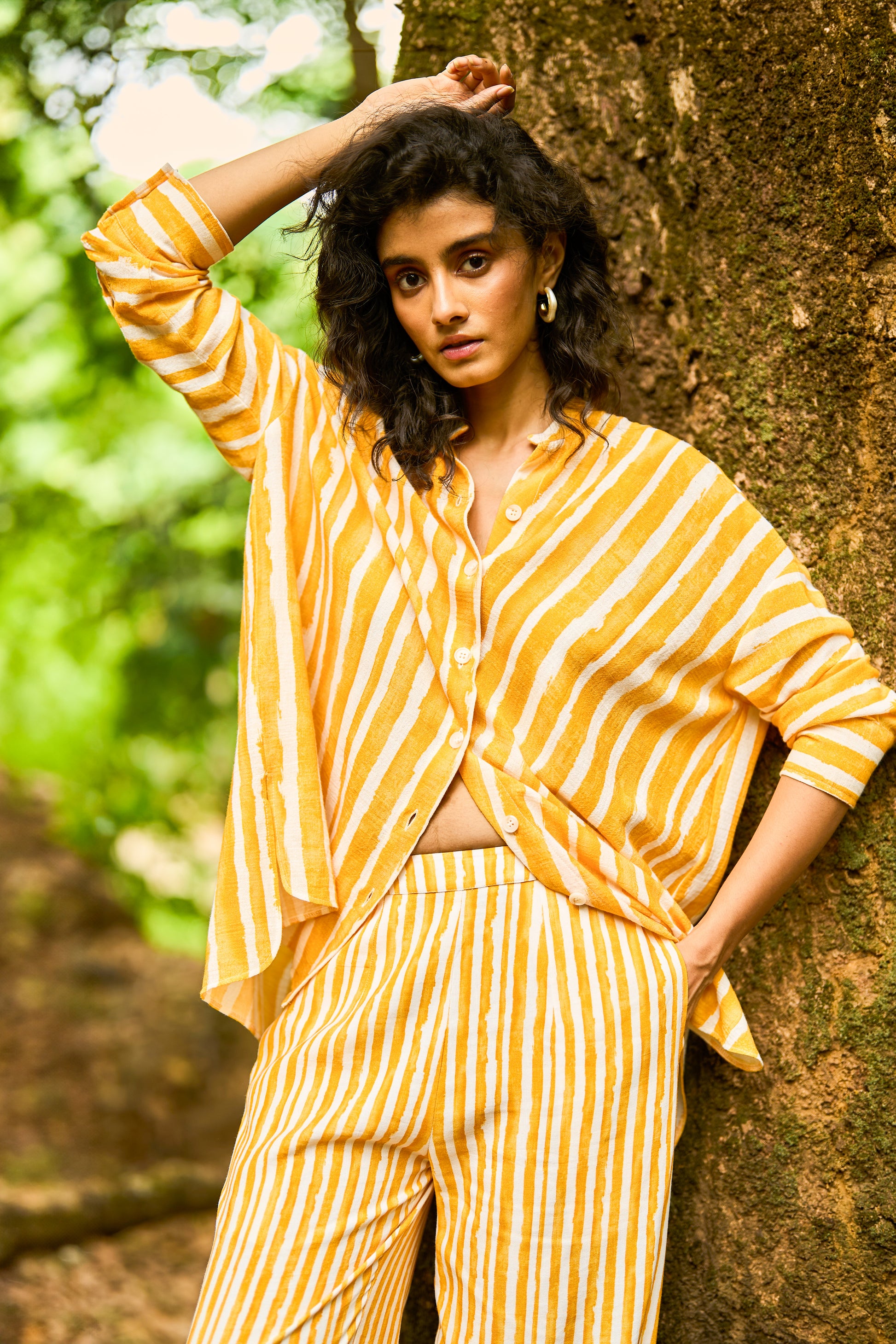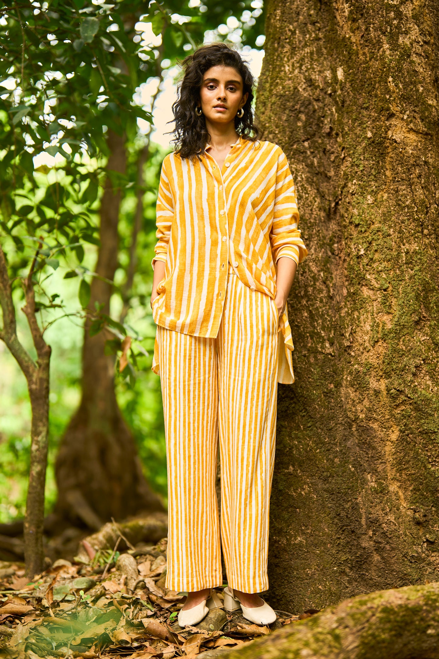 Sunflower yellow brushstroke print shirt in a gauzy summery linen. Asymmetrically placed stripe pattern with one side running slanting and the other in a vertical stripe. Band collar, button down front. Drop shoulder with a full sleeve with cuff.
