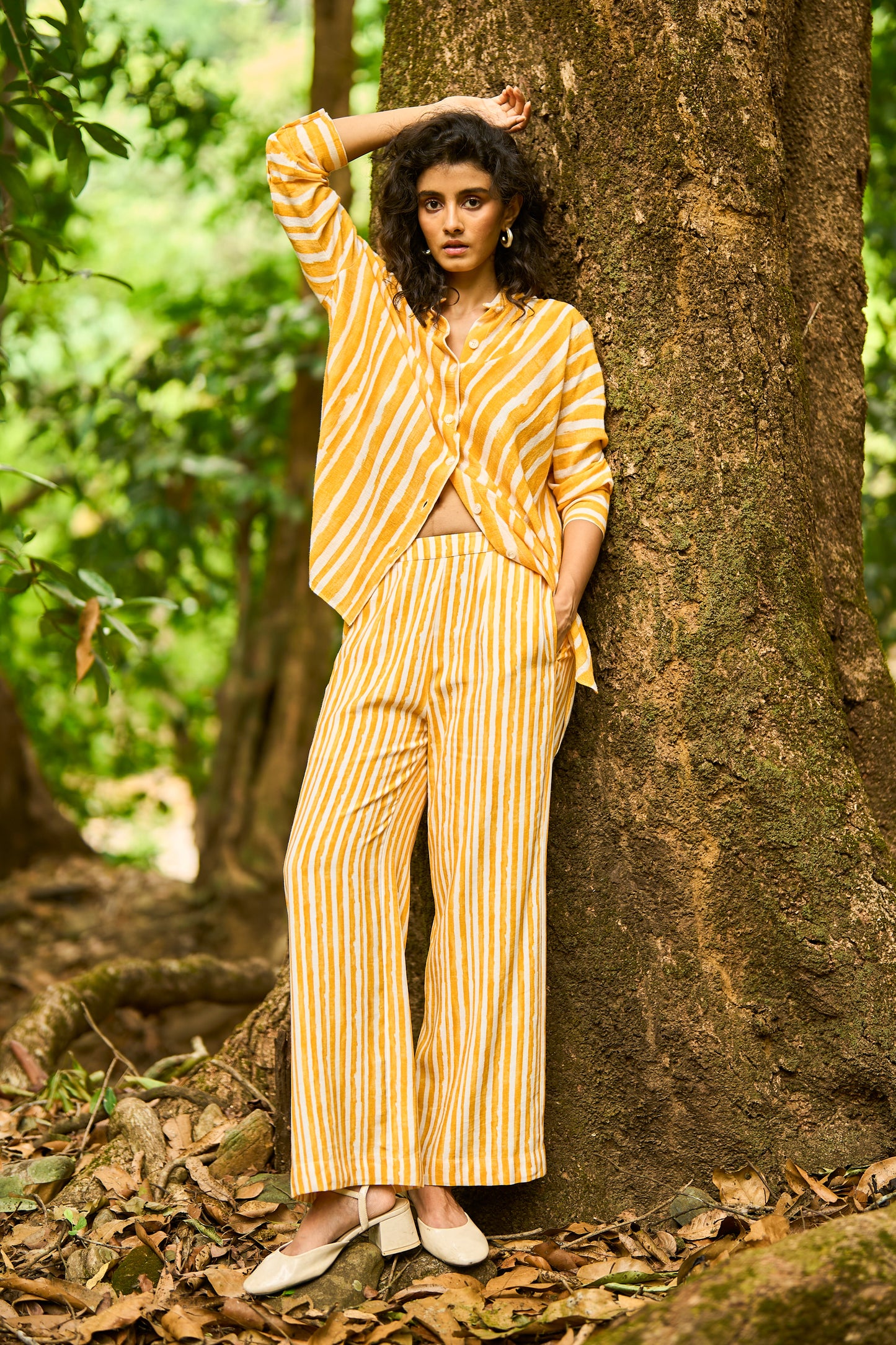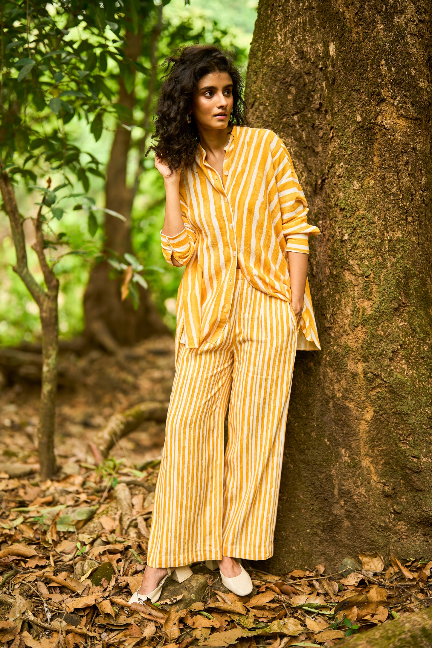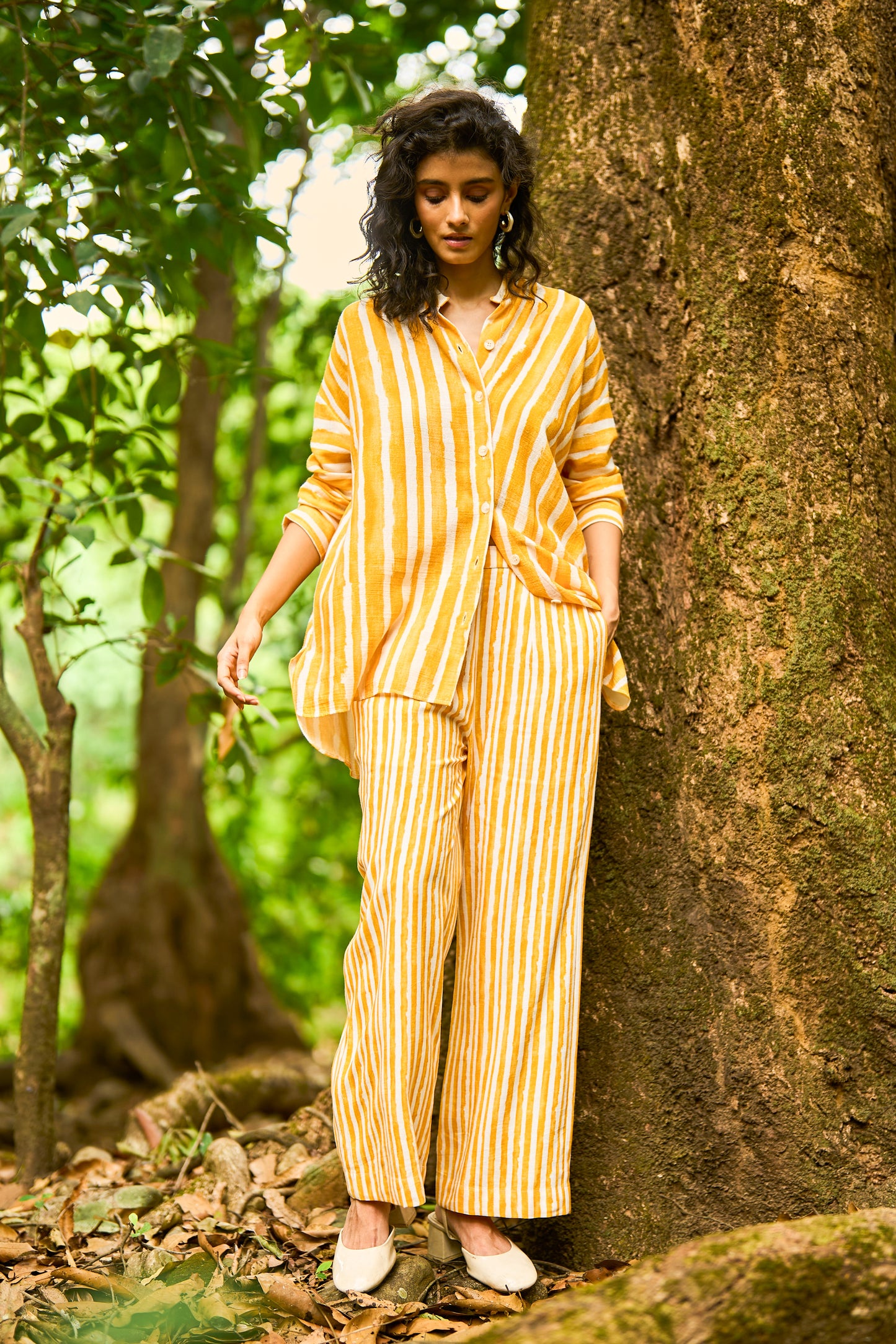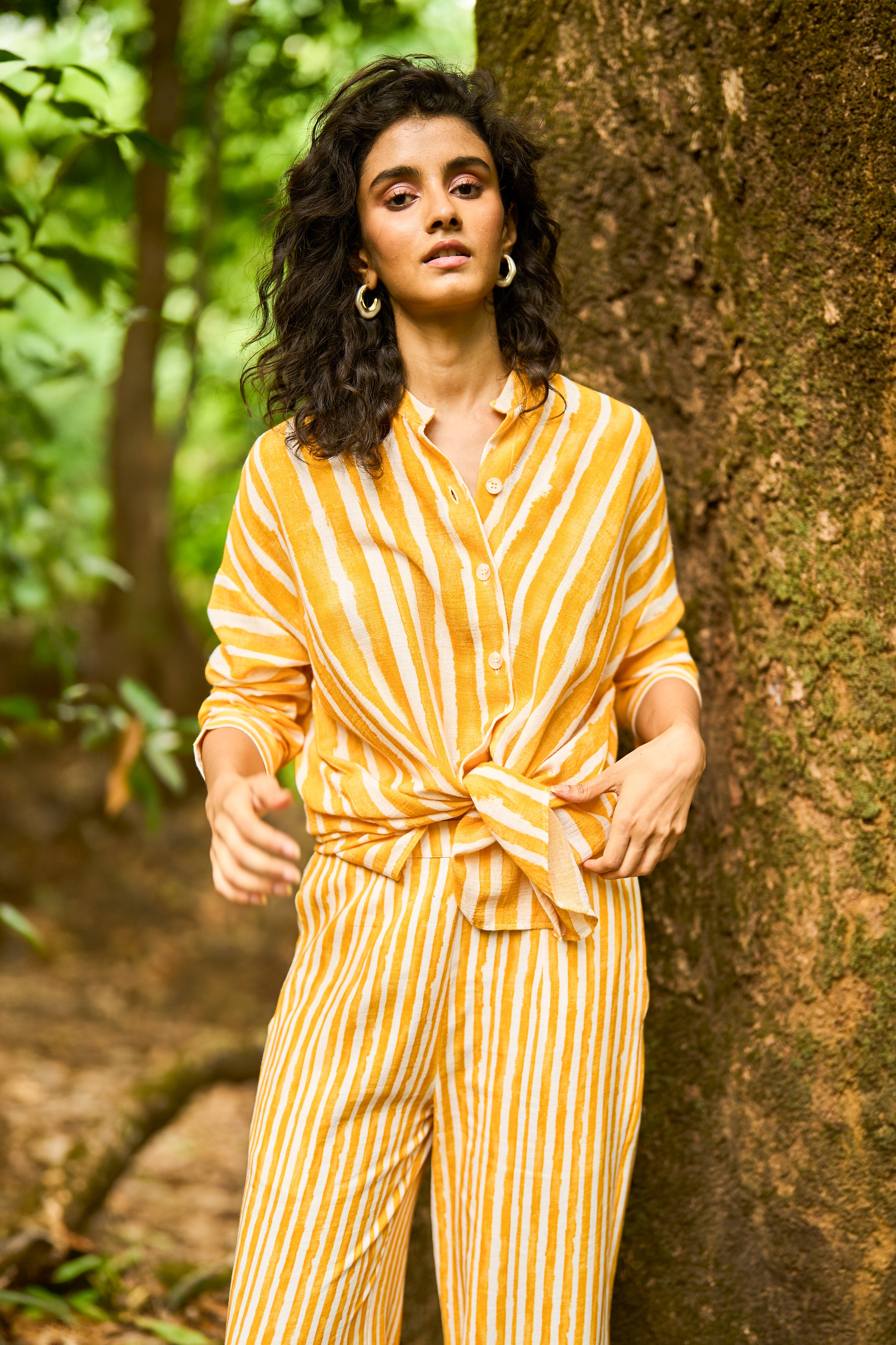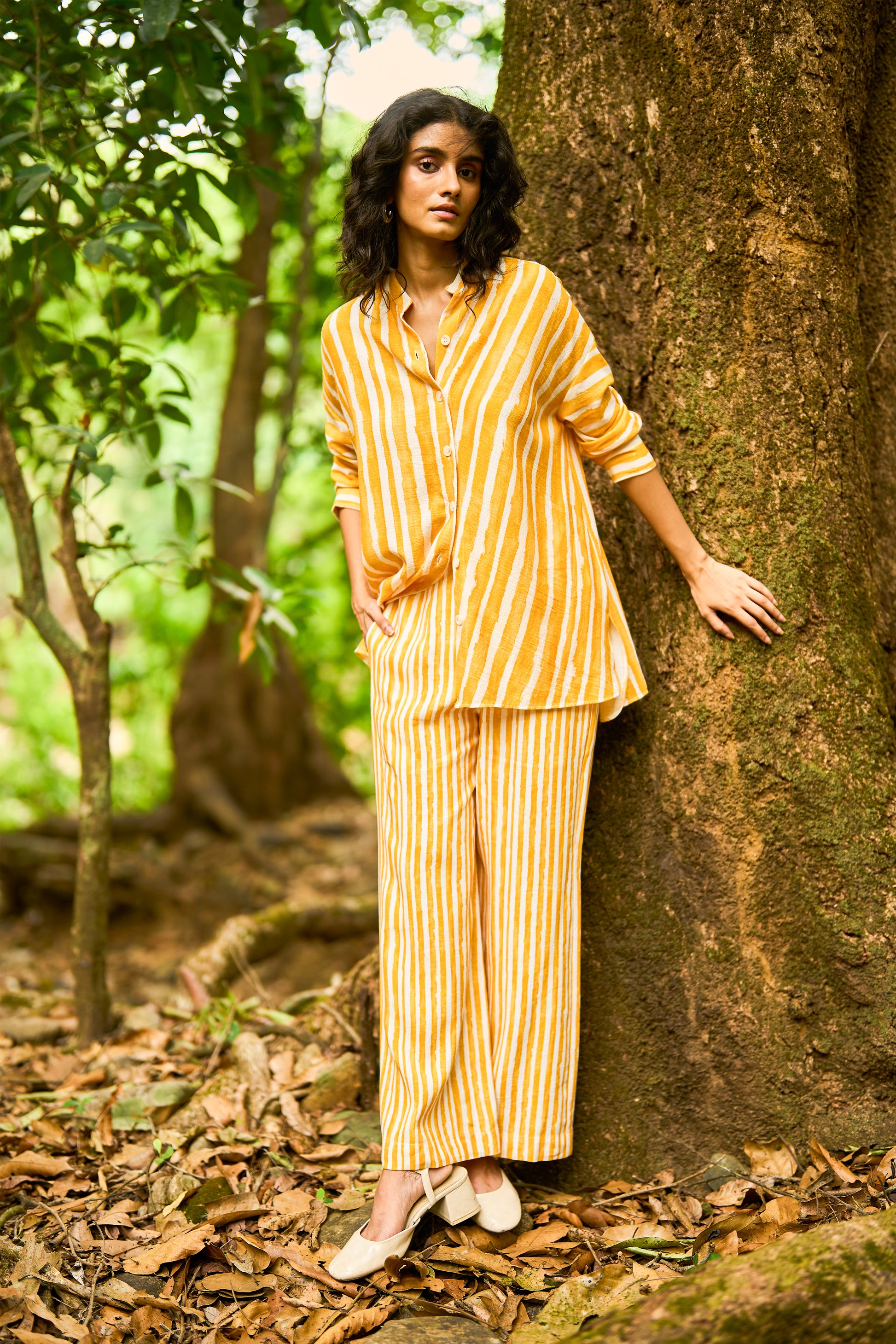 Sunflower yellow brushstroke print shirt in a gauzy summery linen. Asymmetrically placed stripe pattern with one side running slanting and the other in a vertical stripe. Band collar, button down front. Drop shoulder with a full sleeve with cuff.