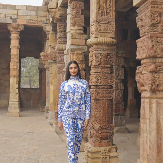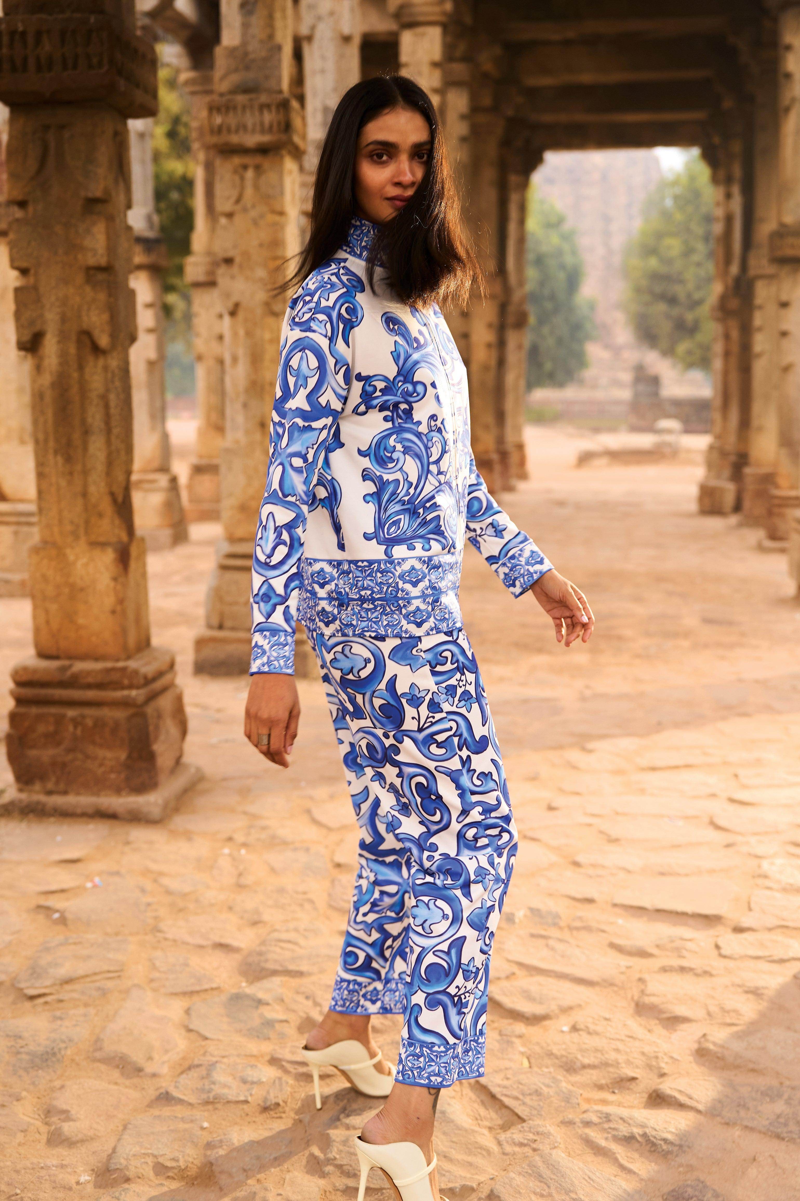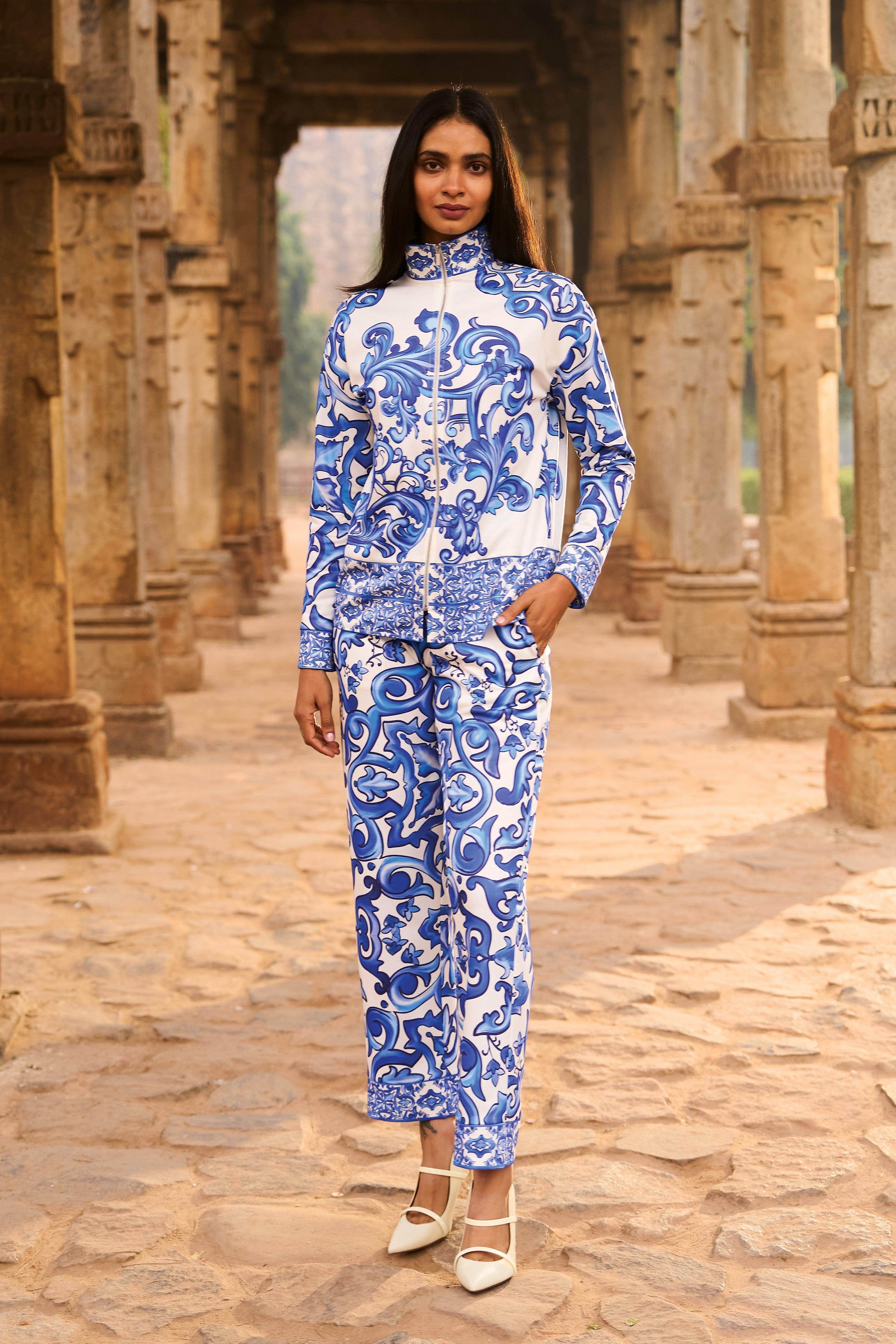 Blue on white floral ceramic inspired printed knit pant. Placed borders around the bottom hem of the pant. Fully elasticated waist, pockets in the side.