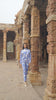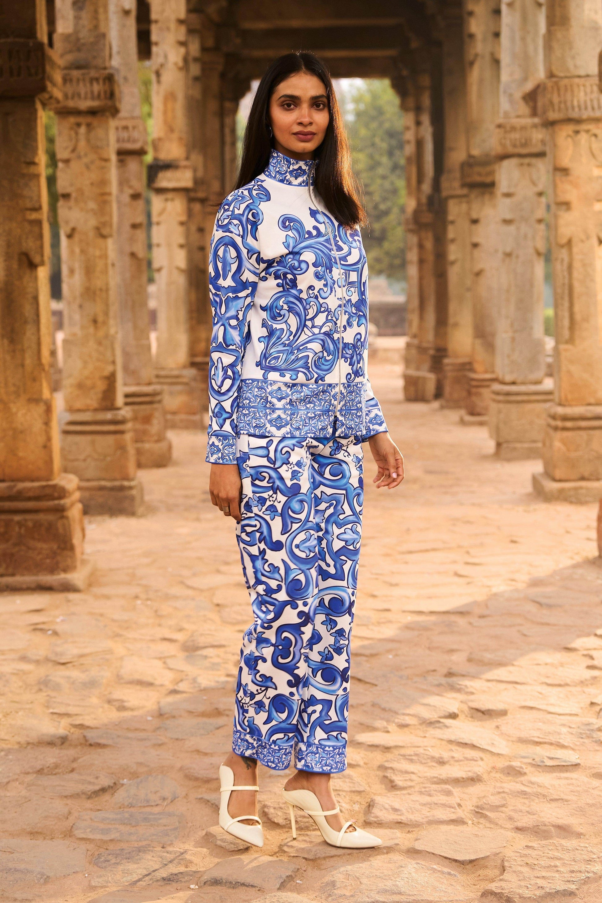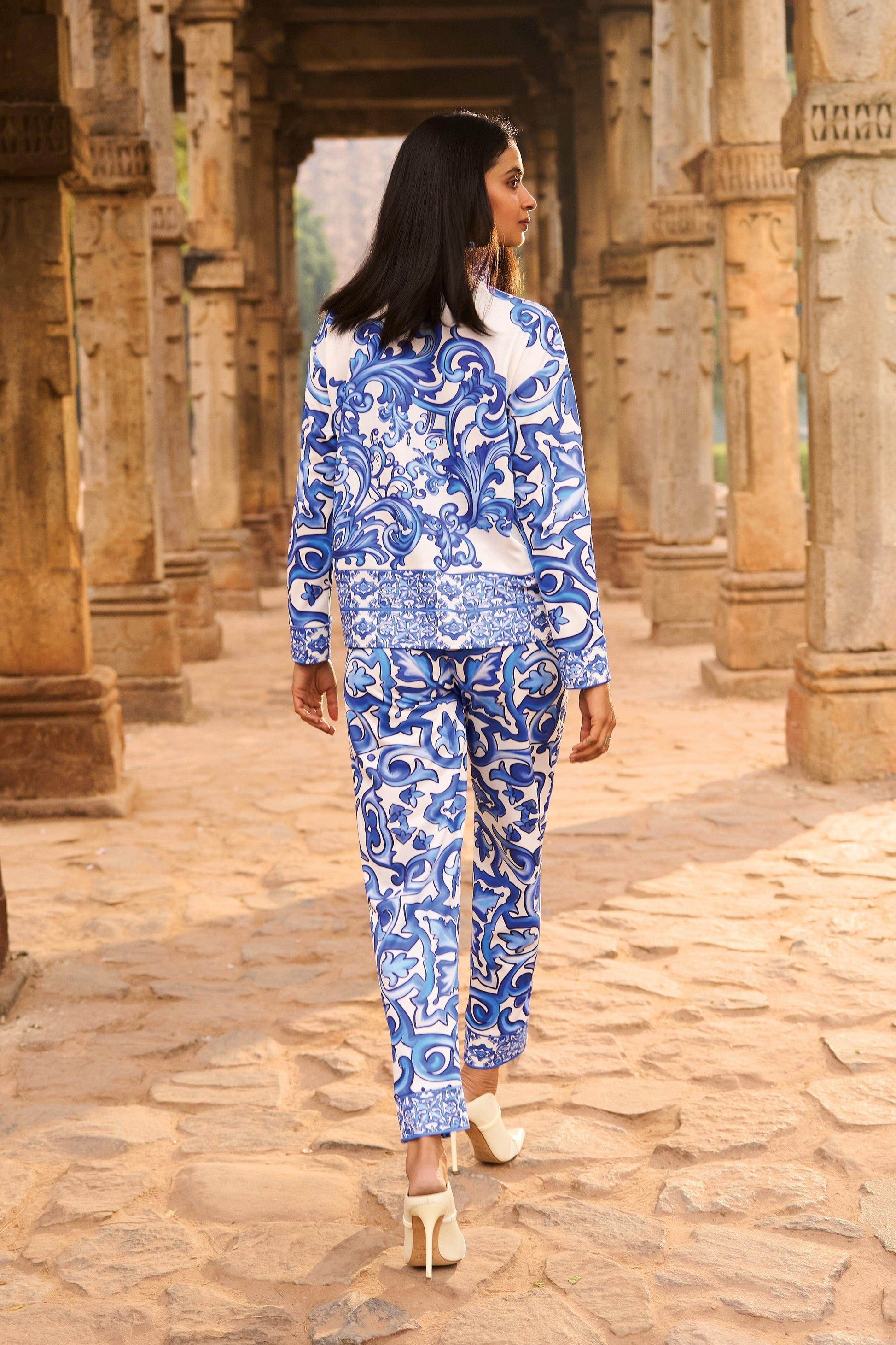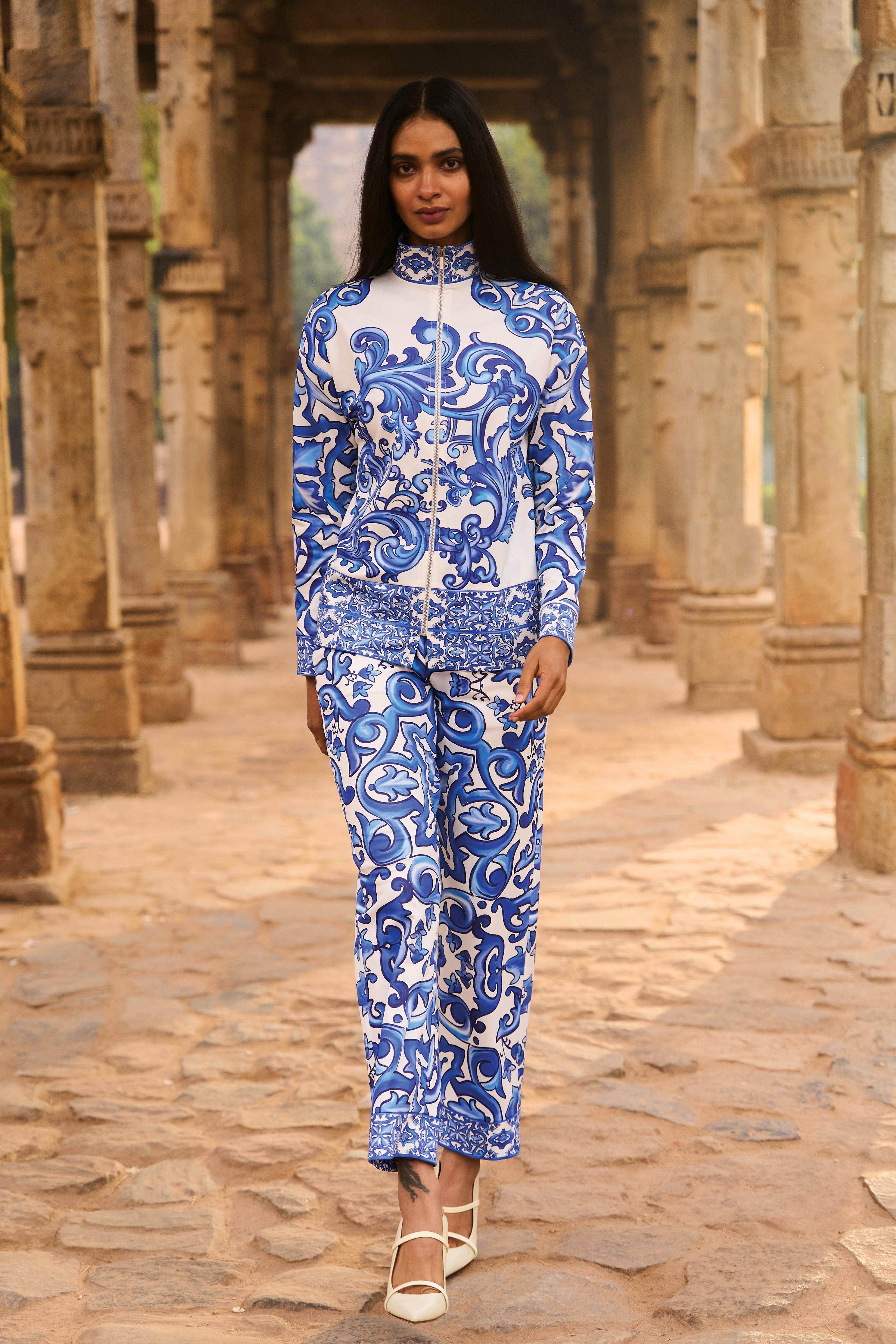 Blue on white floral ceramic inspired printed knit pant. Placed borders around the bottom hem of the pant. Fully elasticated waist, pockets in the side.
