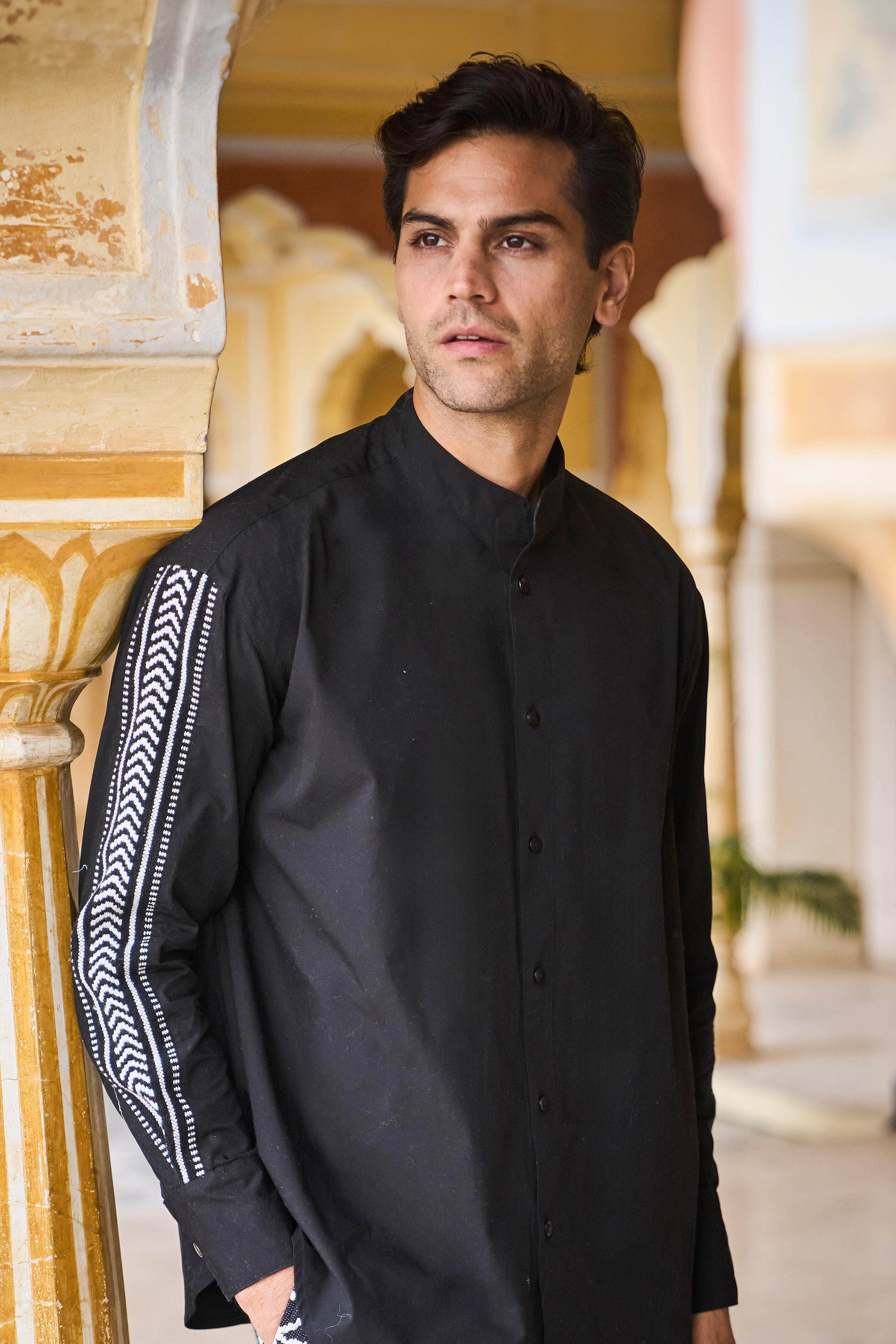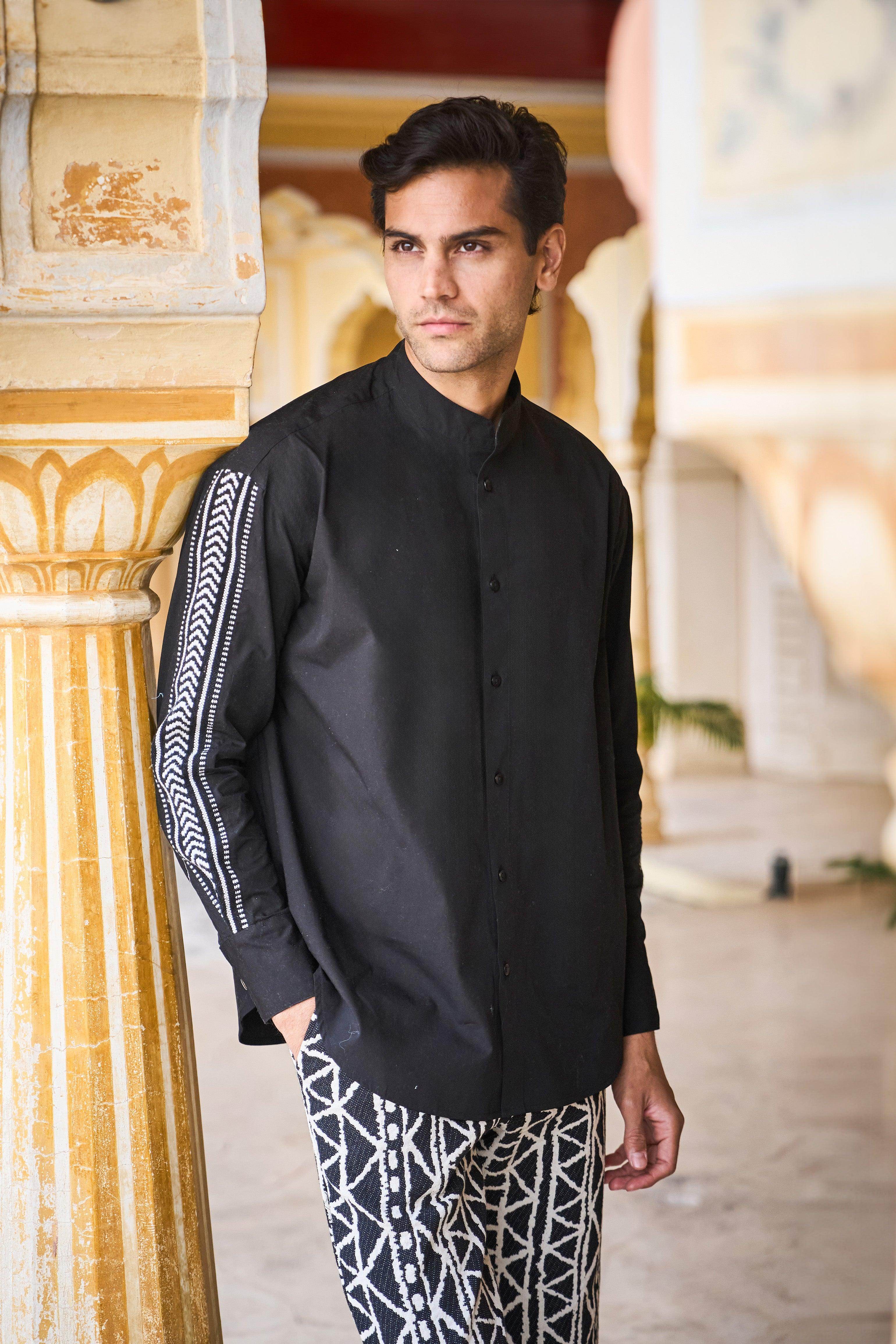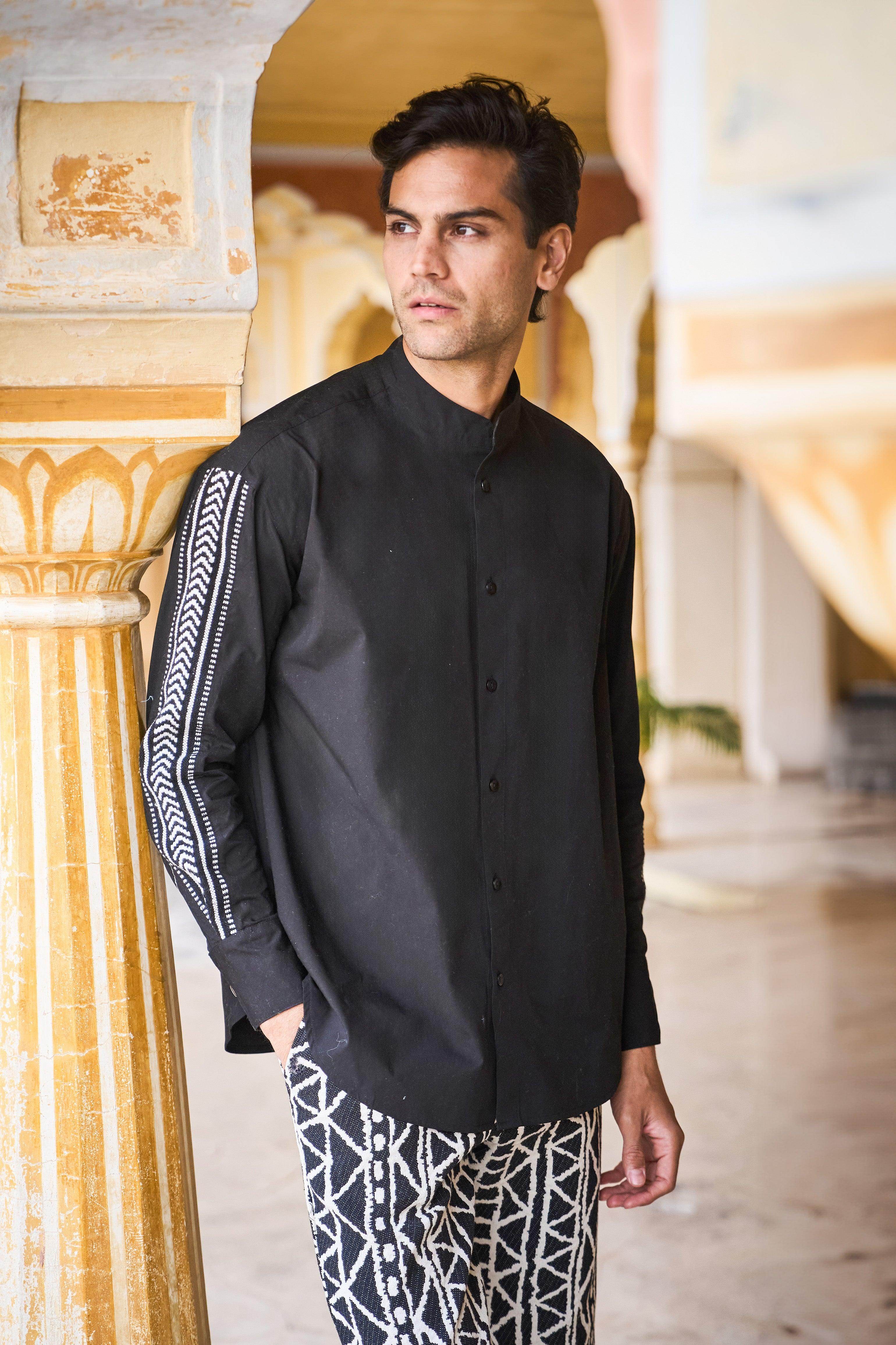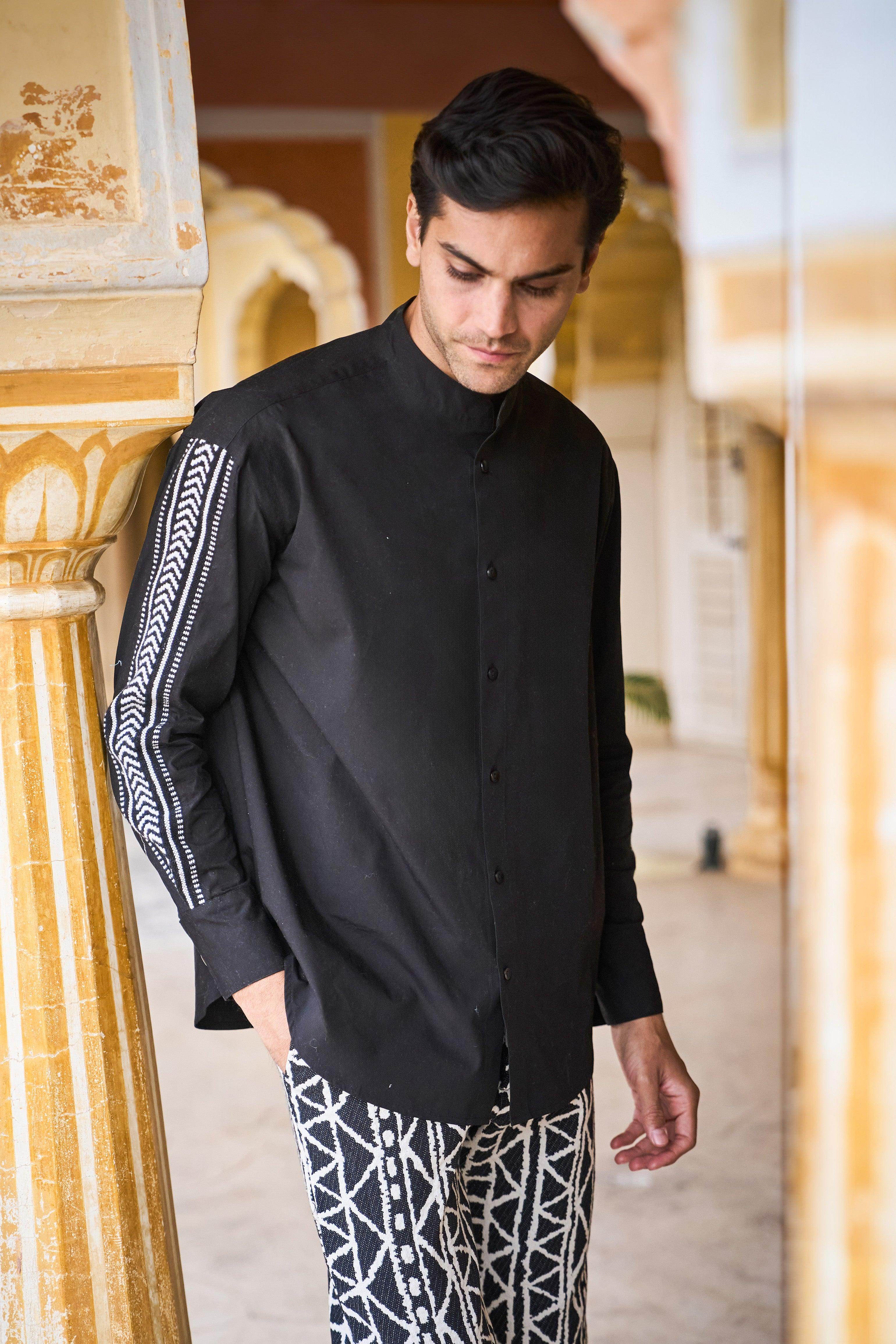 Black full sleeve shirt in organic cotton poplin with a contrast black and white chevron jacquard insert down the sleeves. Button down front placket with snap button closure at the sleeve cuff. Relaxed fit. Band collar, curved hem.
