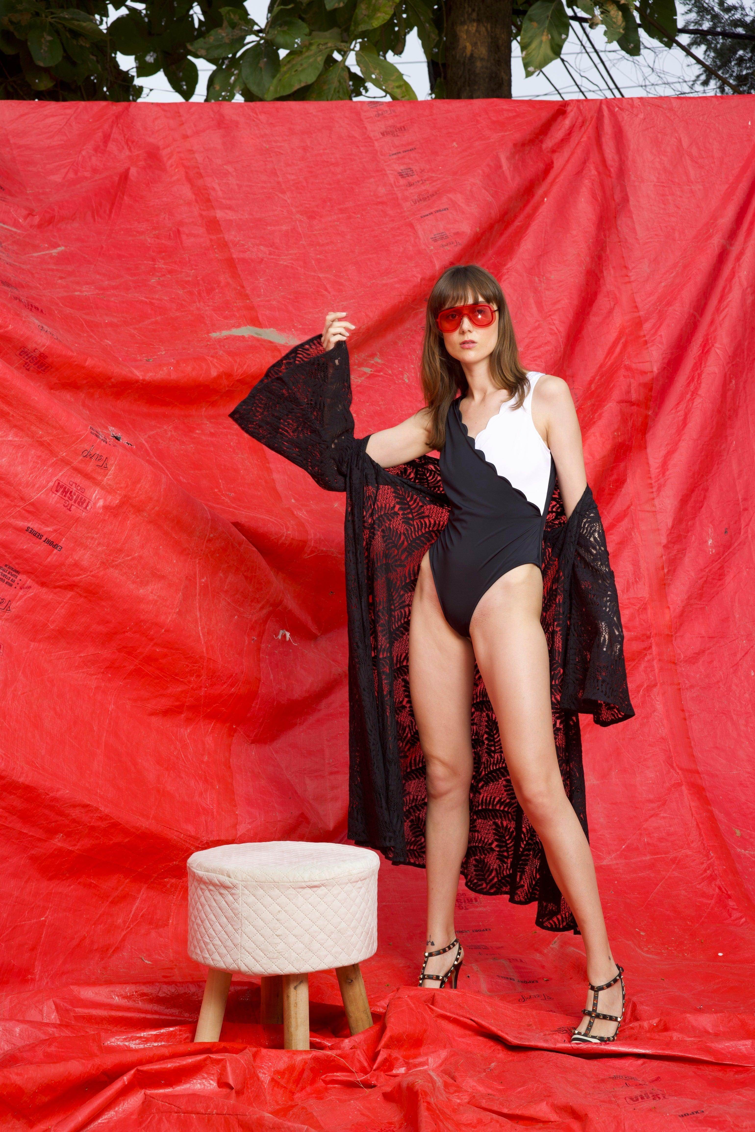 Color block one-piece swimsuit in black and white with scallop and back neck tie detail. Made of high performance, sustainable techno-fabric; 100% recycled polyester from pre and post consumer materials. Resistant to chlorine, suntan creams and oils.