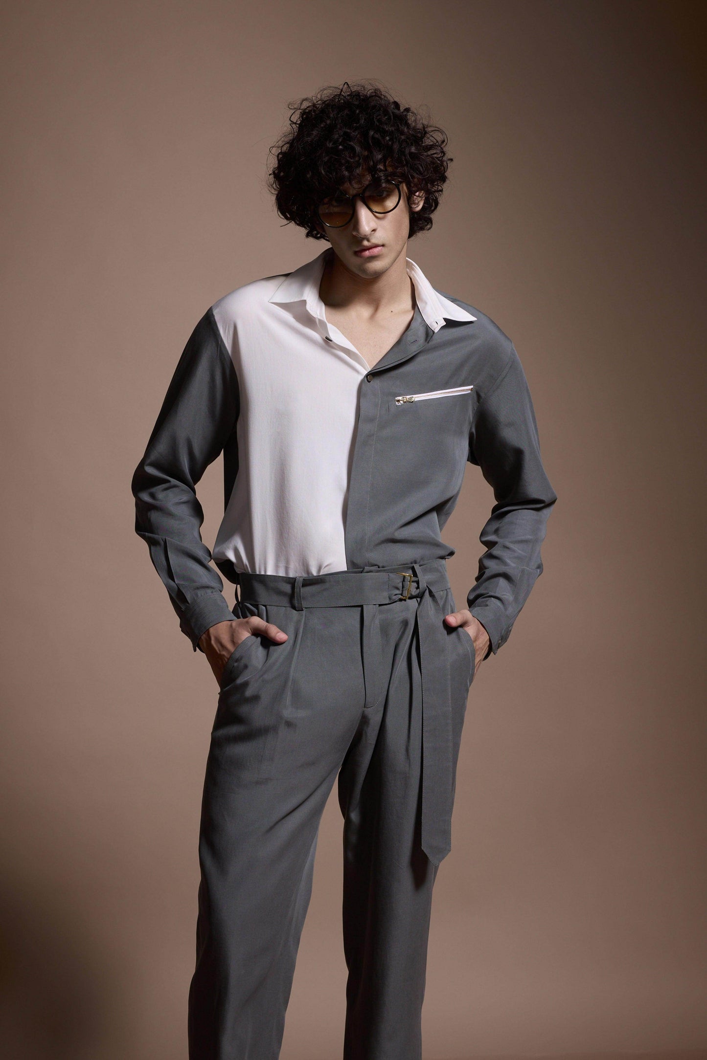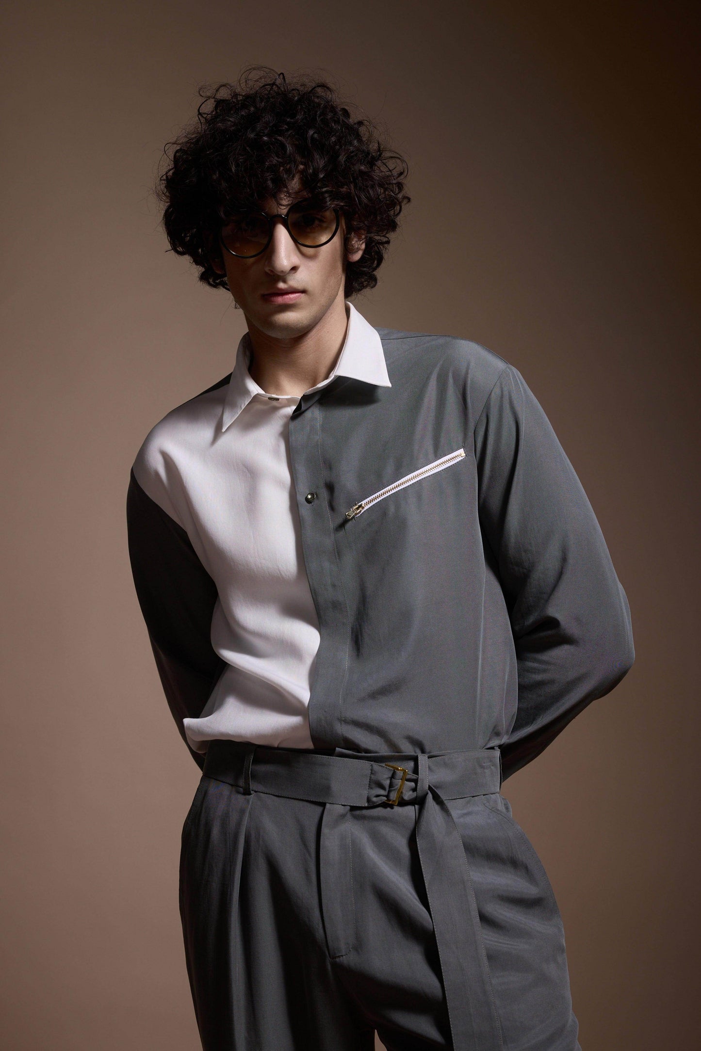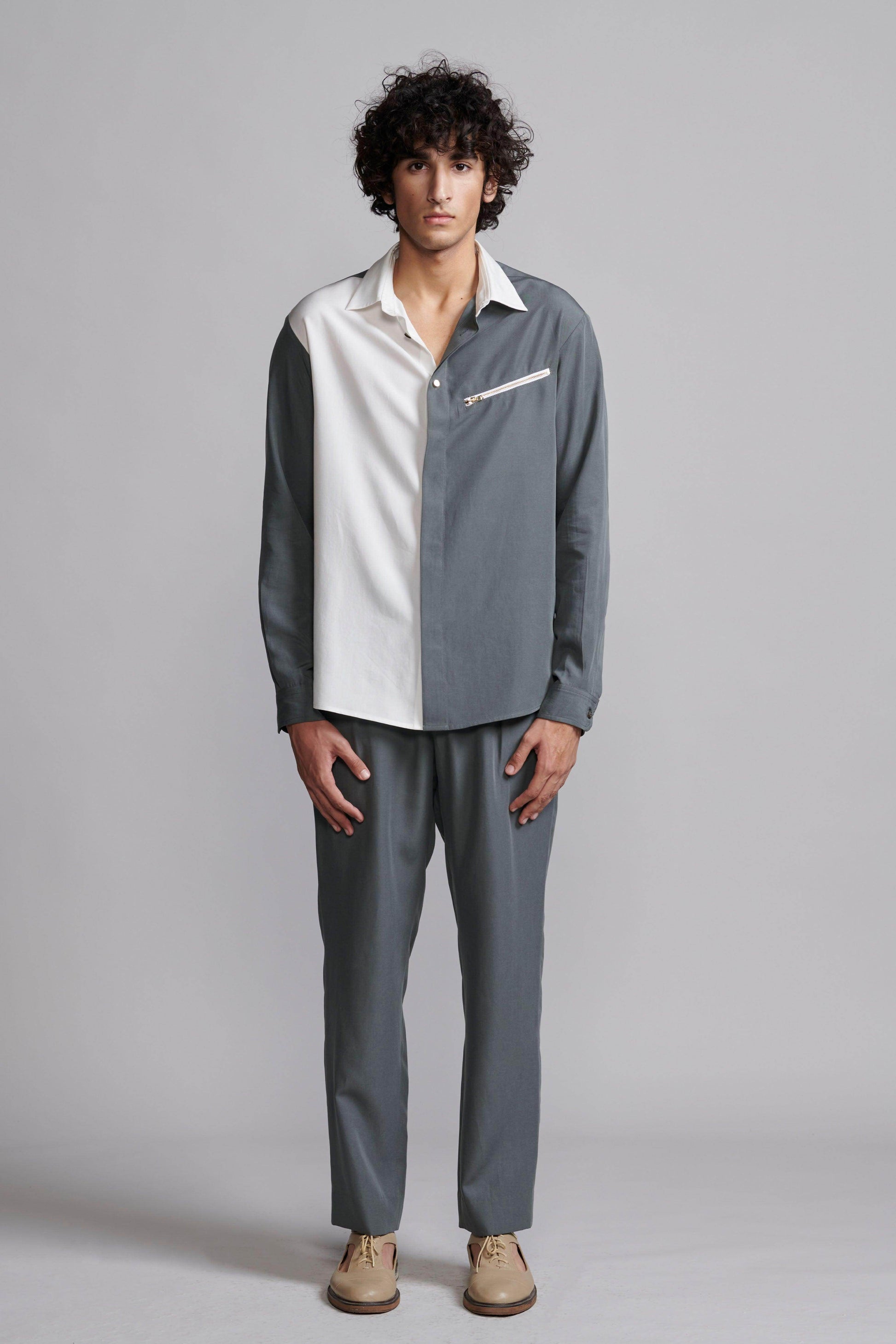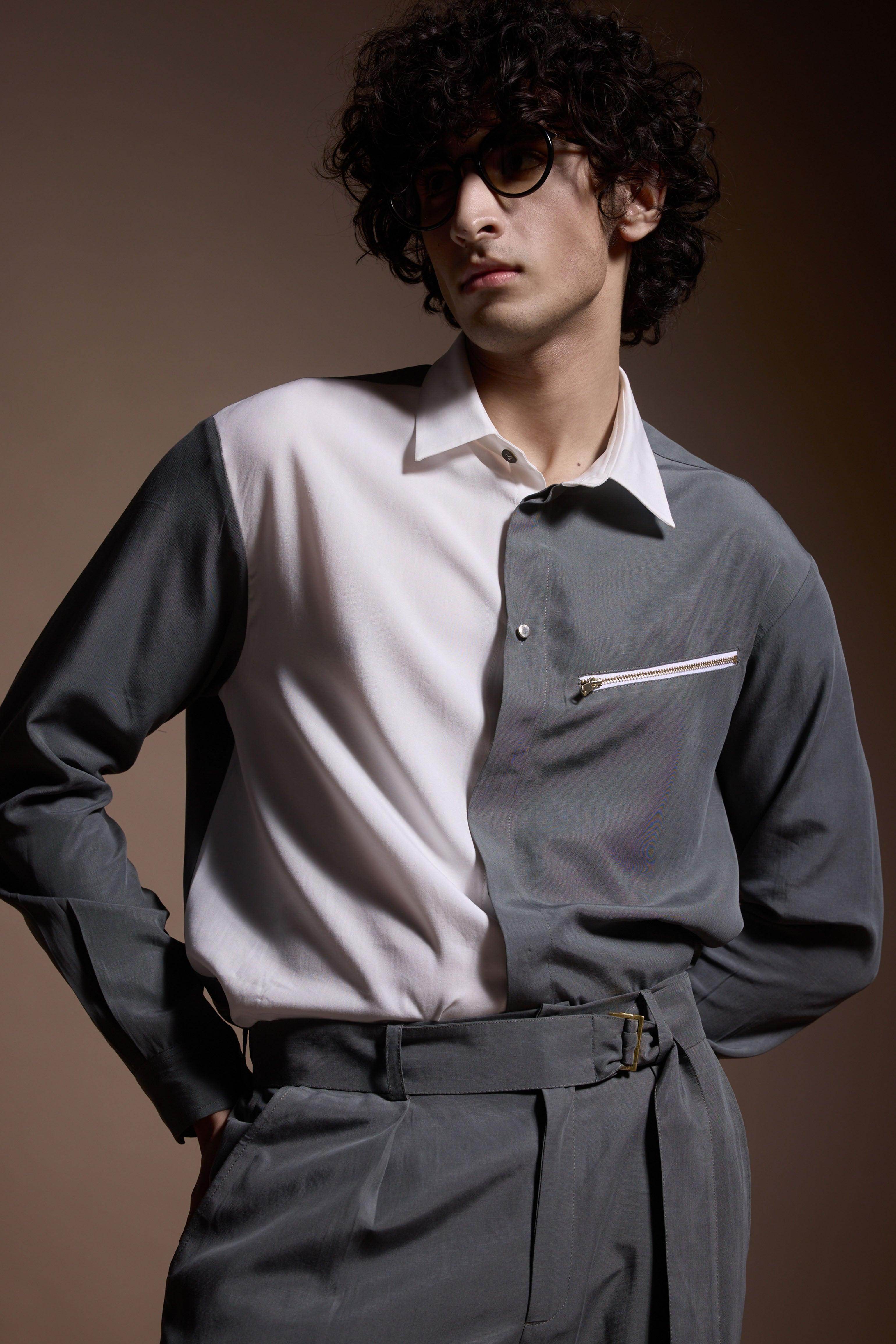 Grey and white colour blocked shirt. Single gold button and zip detail on the front. Full sleeve, concealed placket and shirt collar. High-low hem, side seam slits, and a concealed pocket with a golden zipper detail. Soft pleating detail on the back yoke to add shape.