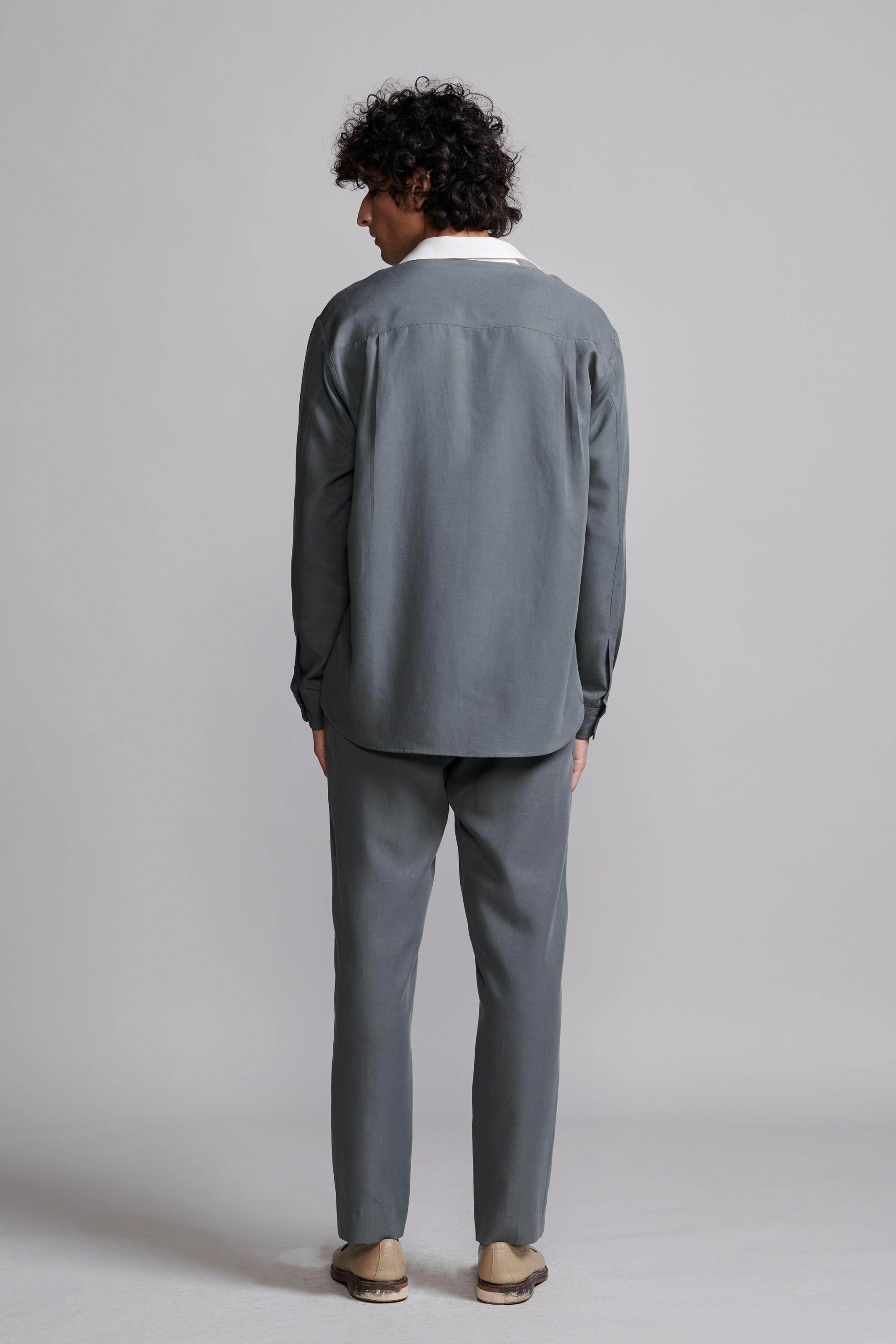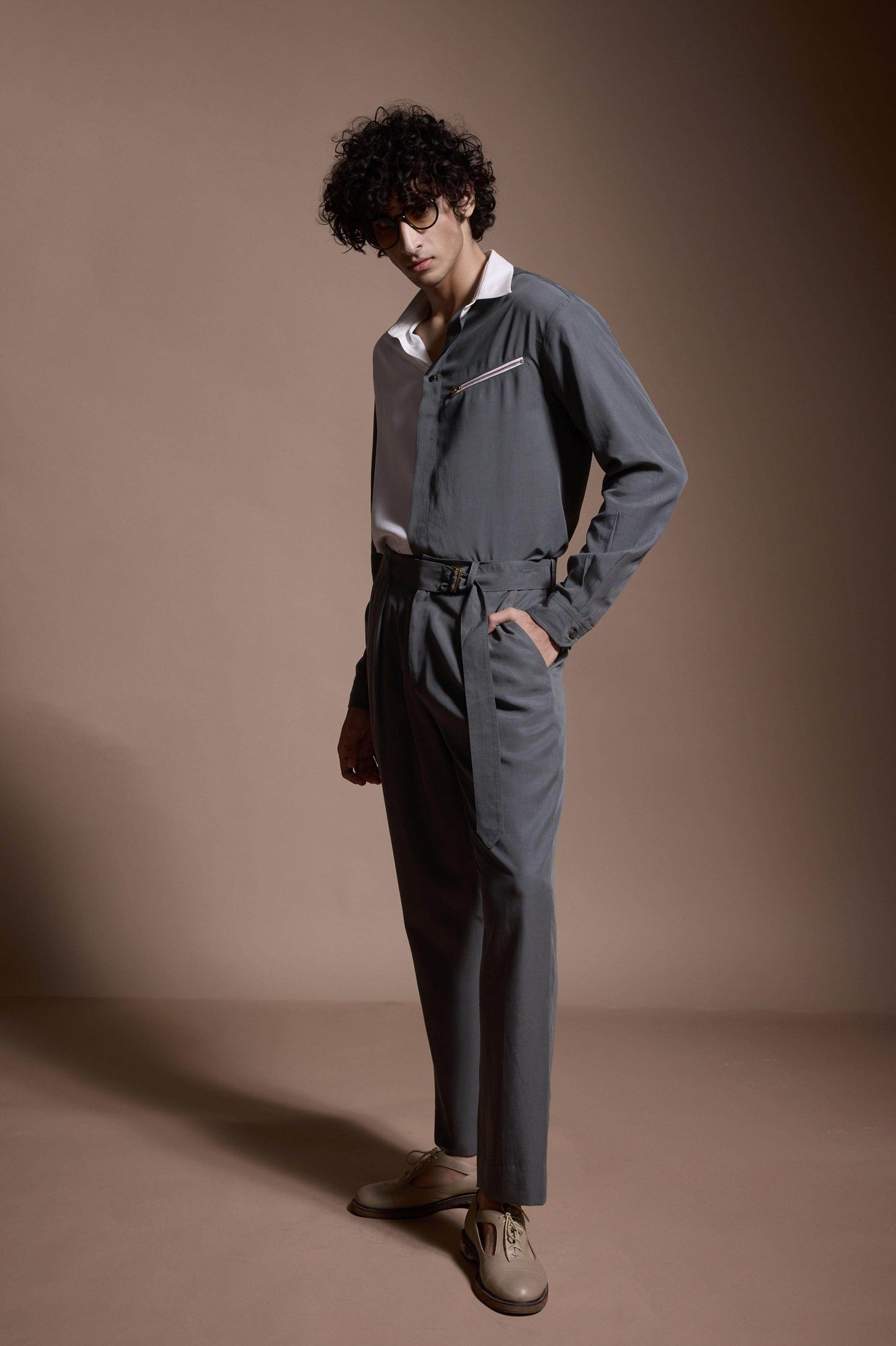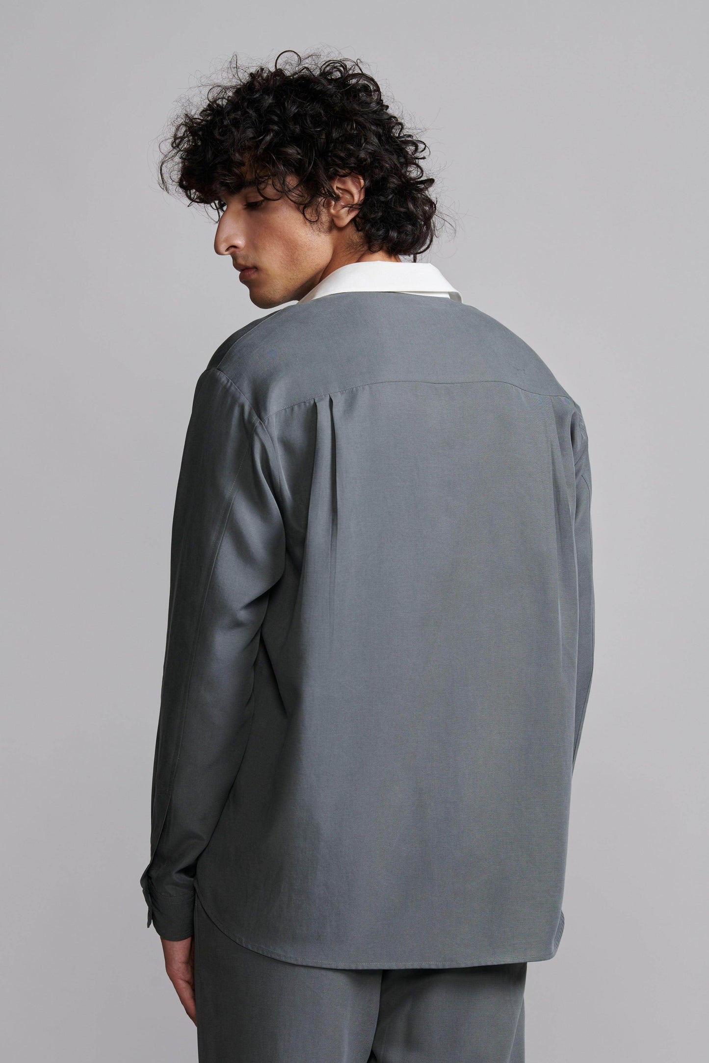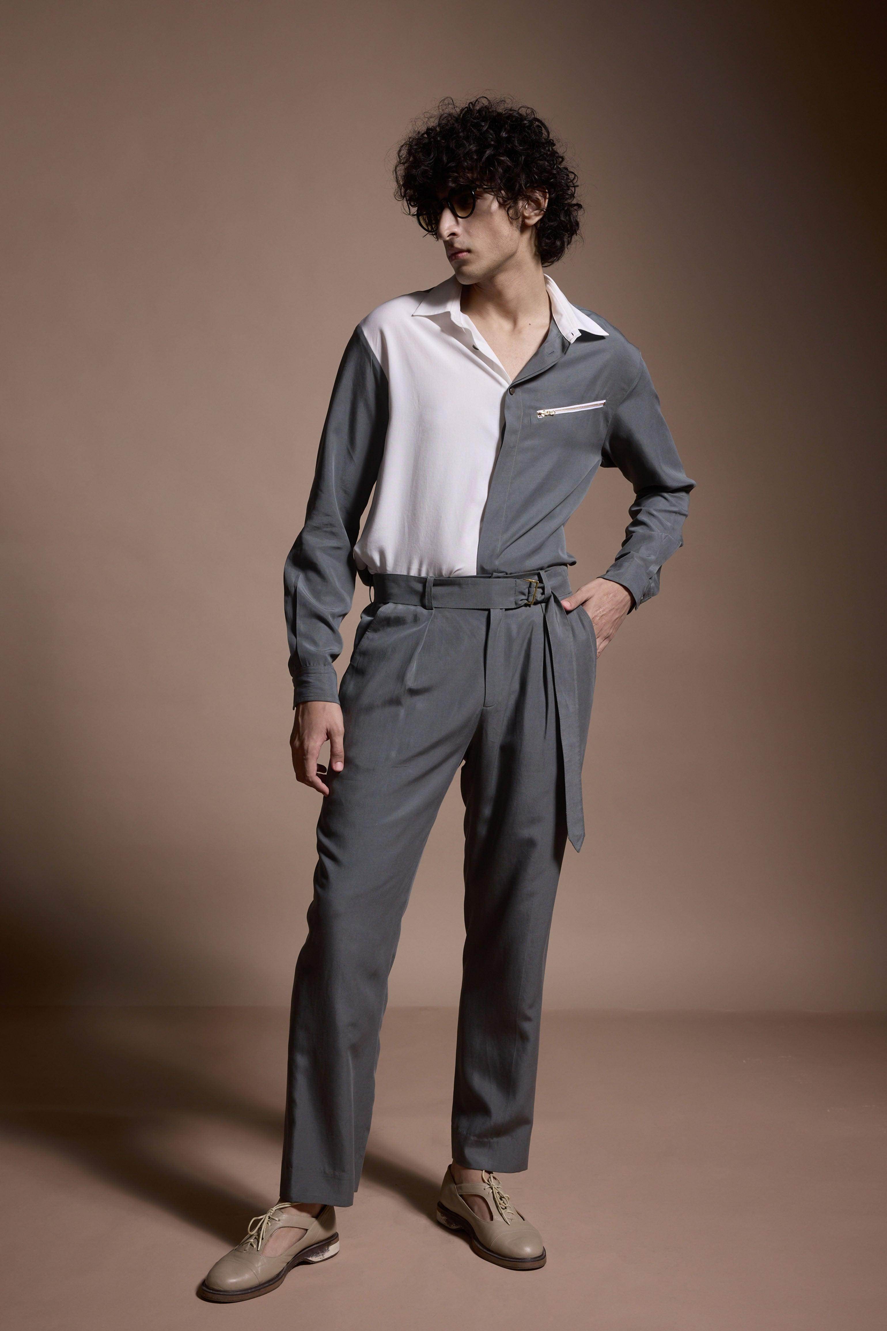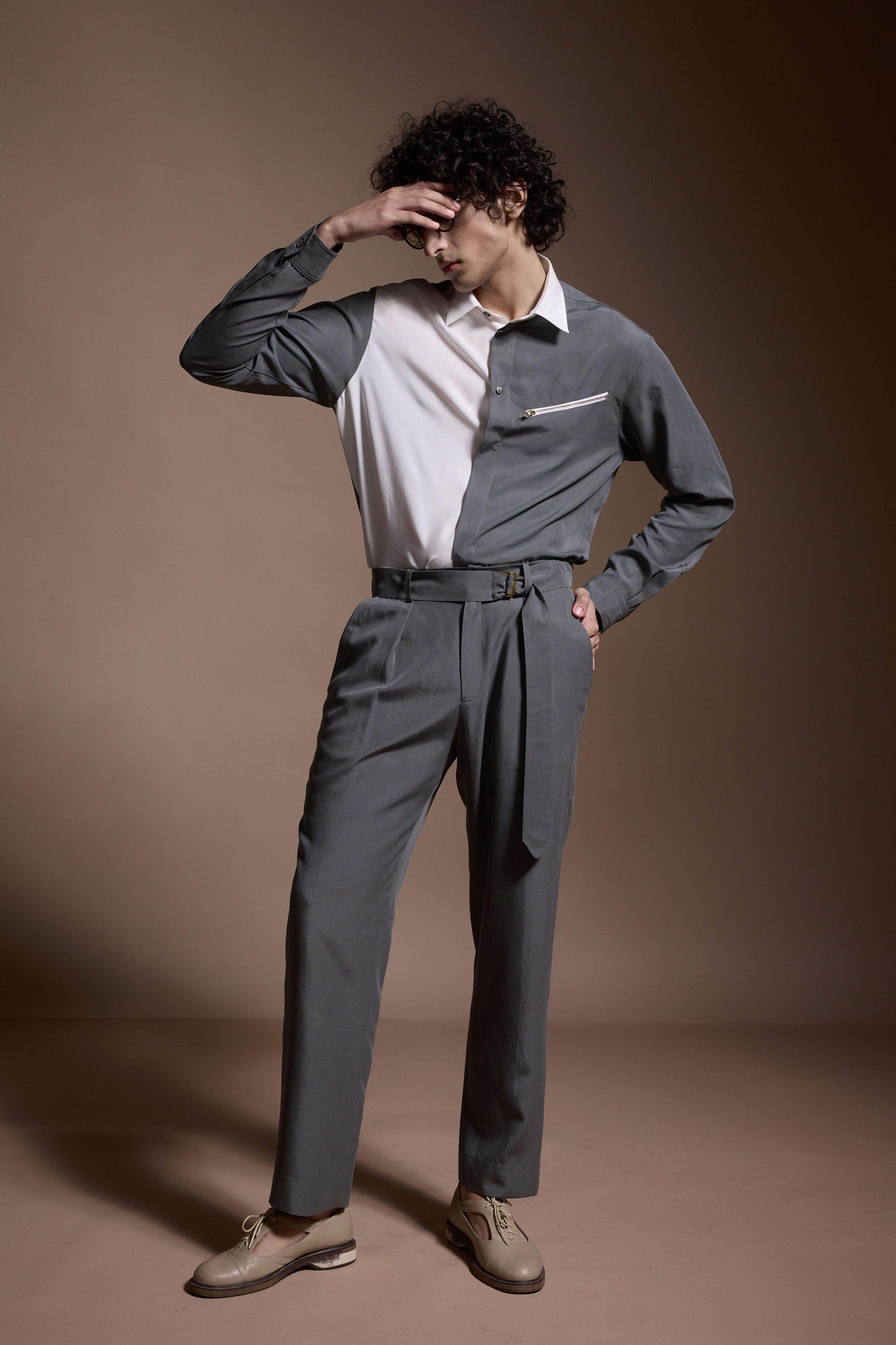 Grey and white colour blocked shirt. Single gold button and zip detail on the front. Full sleeve, concealed placket and shirt collar. High-low hem, side seam slits, and a concealed pocket with a golden zipper detail. Soft pleating detail on the back yoke to add shape.