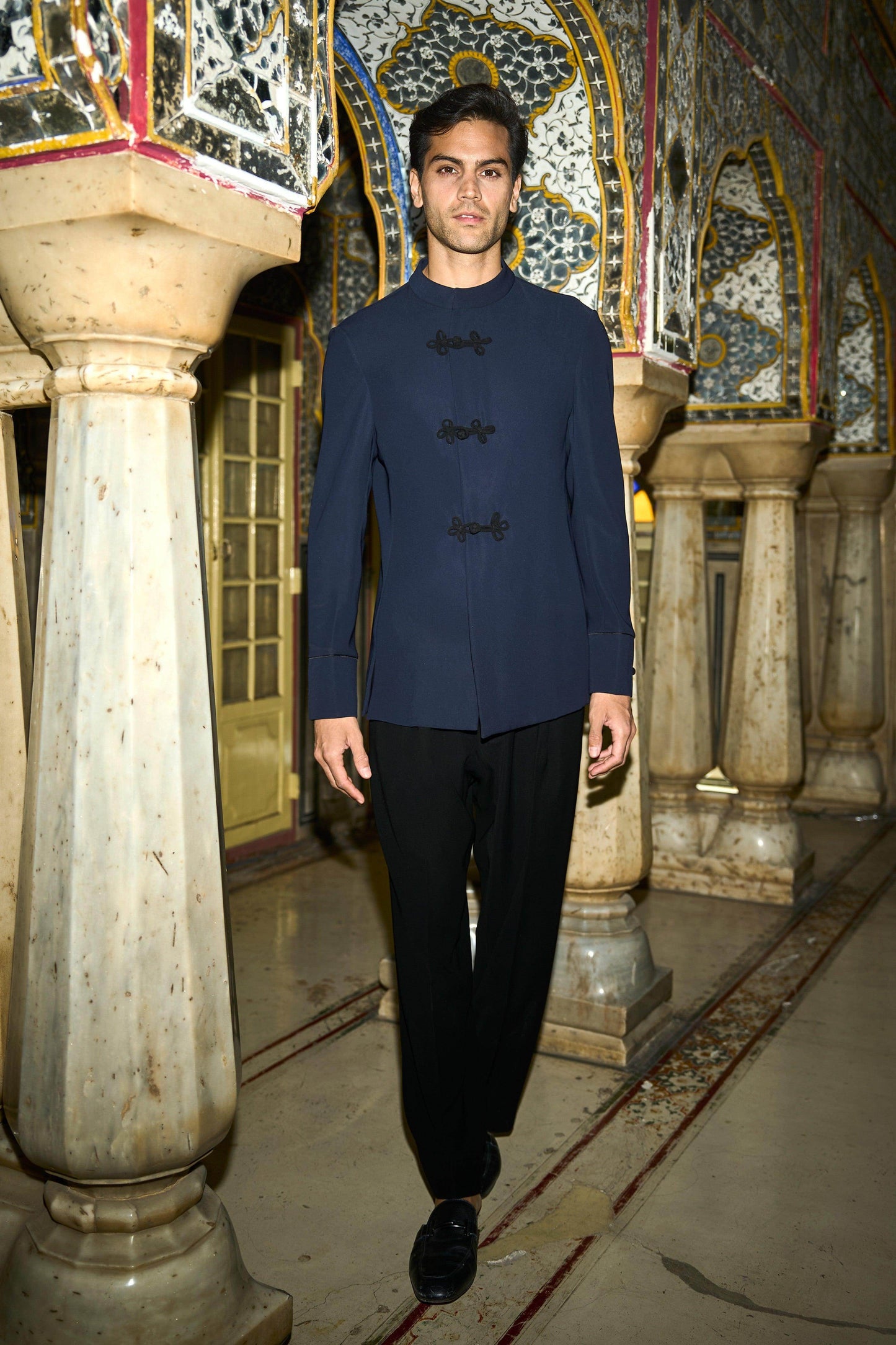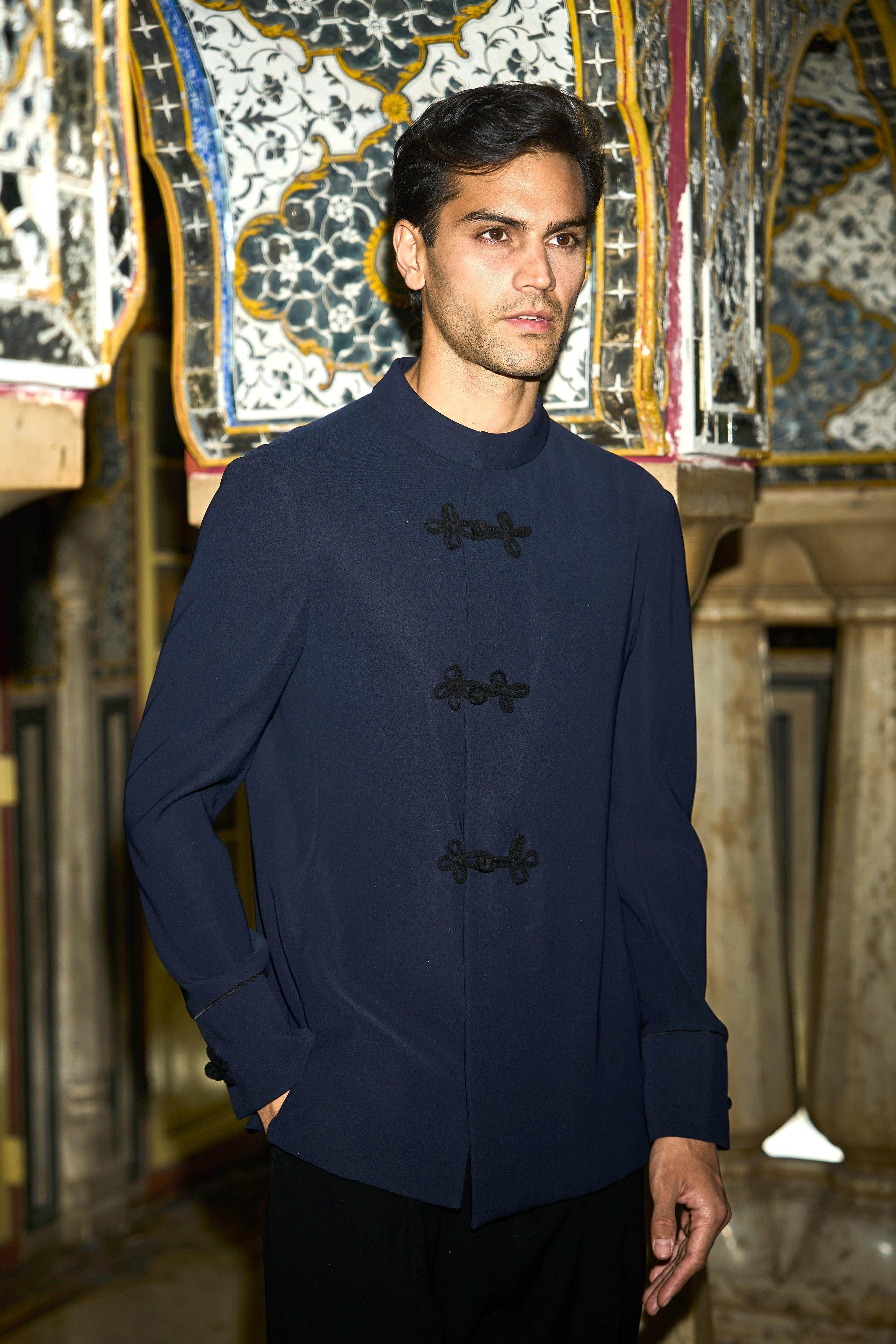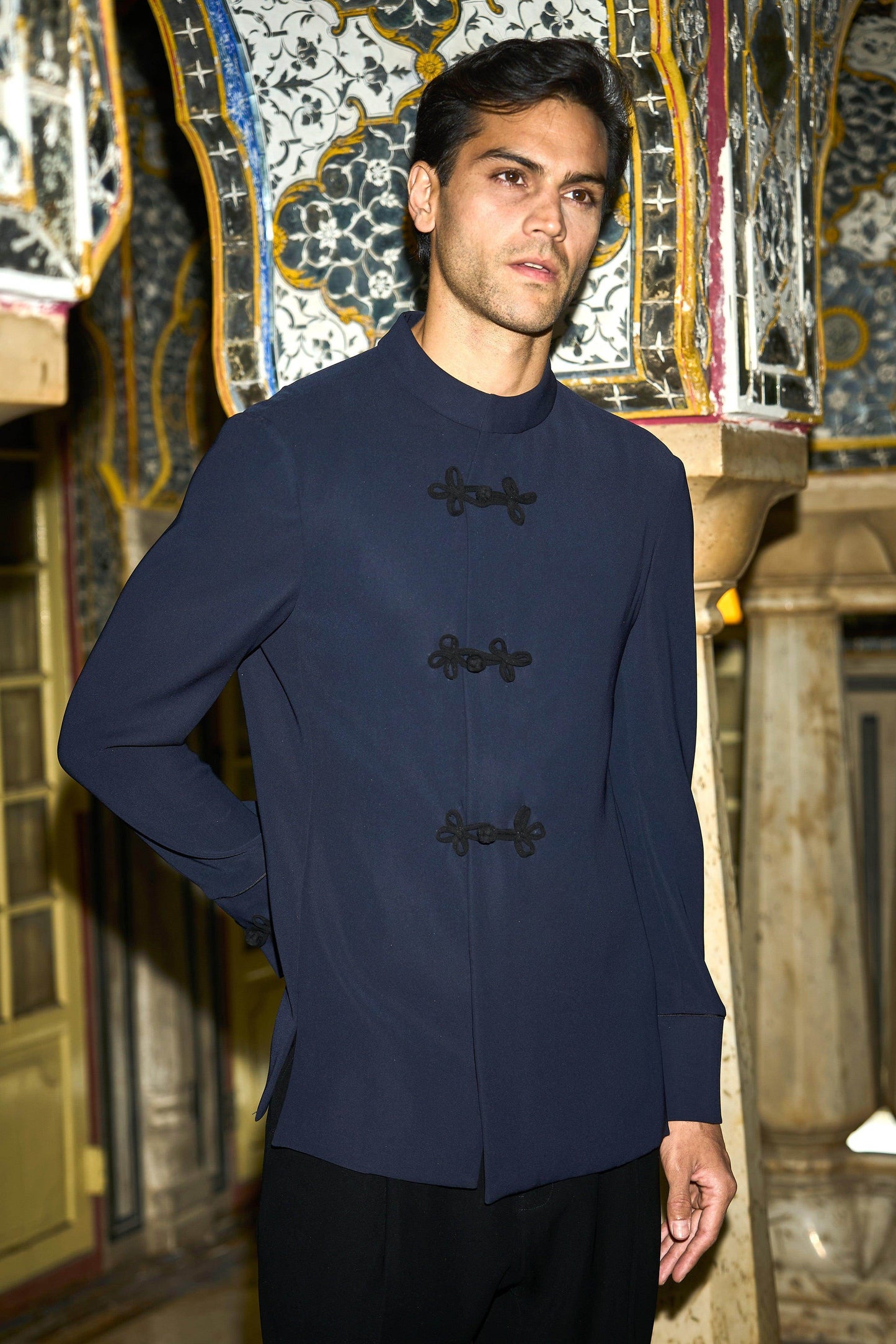 Navy full sleeve top with contrast hand twisted black buttons down the front and on the sleeve cuff. Concealed functional zipper placket. Contrast piping on the sleeve cuffs. Band collar with single snap button closure. Relaxed fit. Can be worn as a shirt or a jacket. Paired with straight cut pant with hand sewn pleat in the front. Pockets in the side and back. Hook/eye and zipper closure. Belt loops at the waist. Relaxed fit.