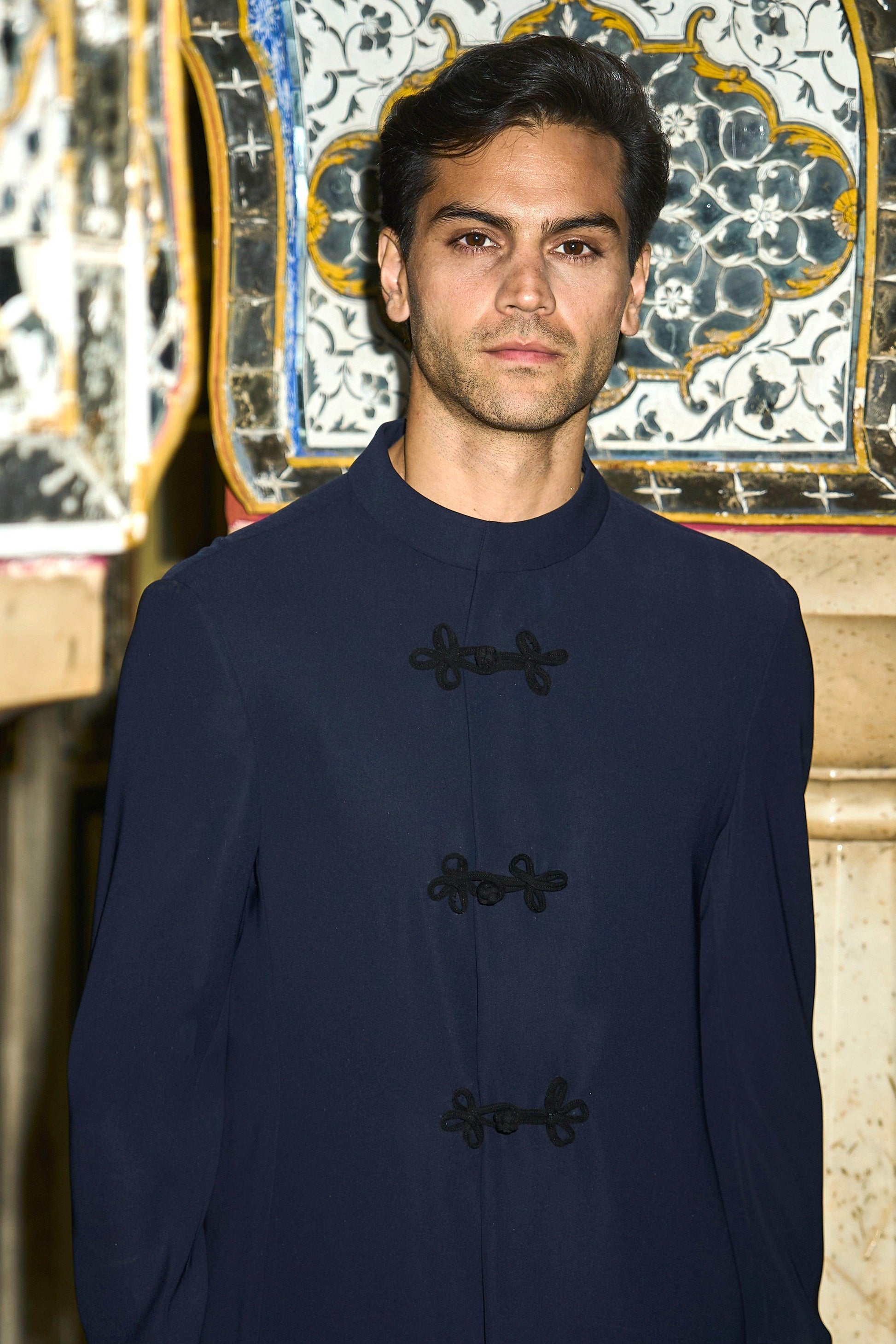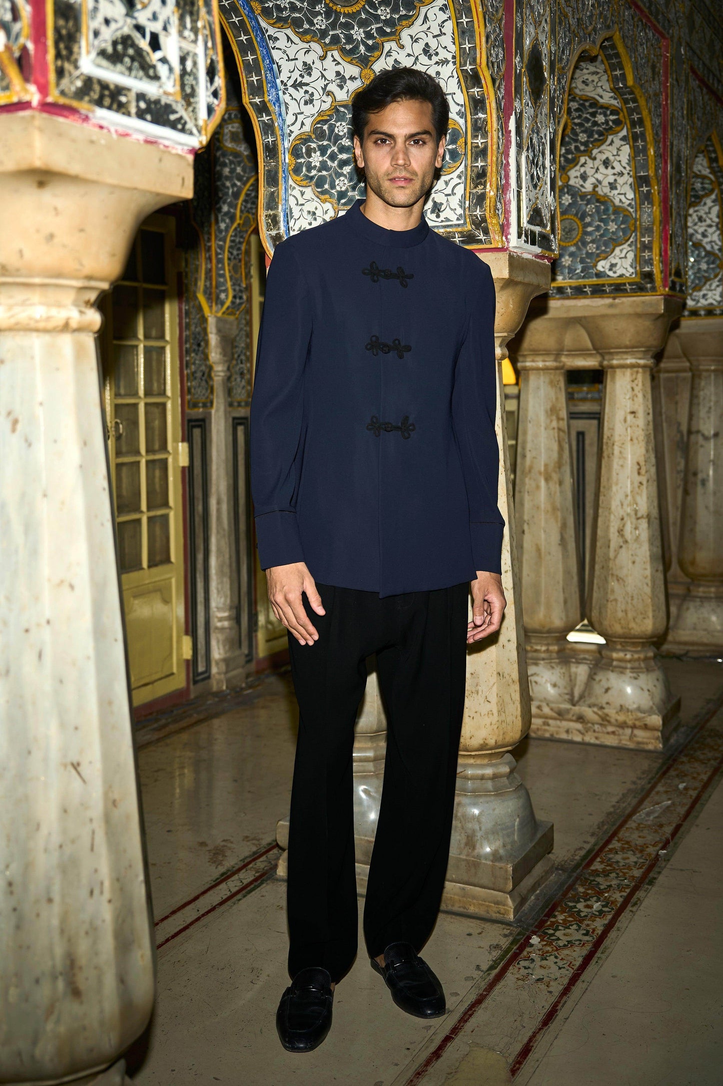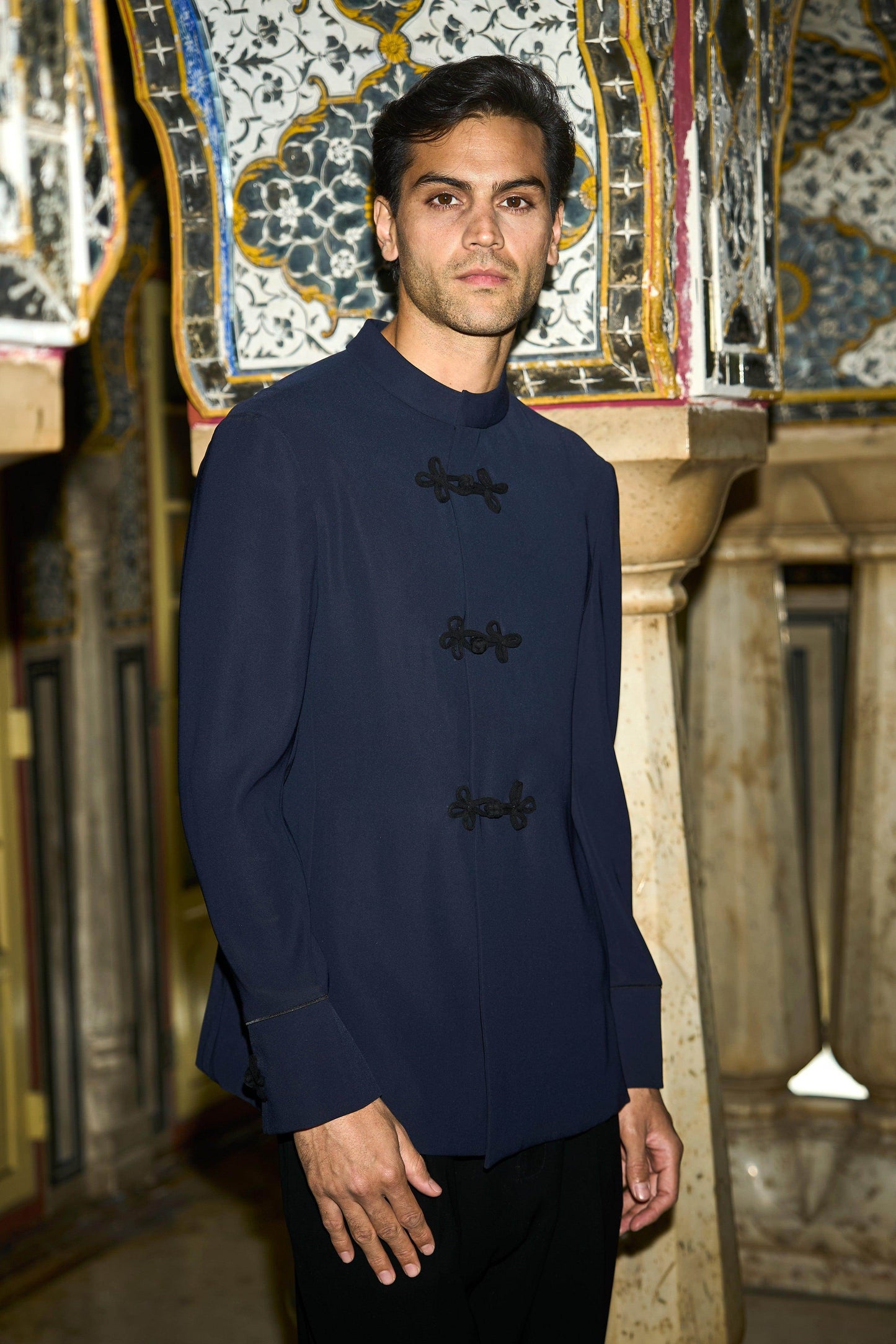 Navy full sleeve top with contrast hand twisted black buttons down the front and on the sleeve cuff. Concealed functional zipper placket. Contrast piping on the sleeve cuffs. Band collar with single snap button closure. Relaxed fit. Can be worn as a shirt or a jacket. Paired with straight cut pant with hand sewn pleat in the front. Pockets in the side and back. Hook/eye and zipper closure. Belt loops at the waist. Relaxed fit.