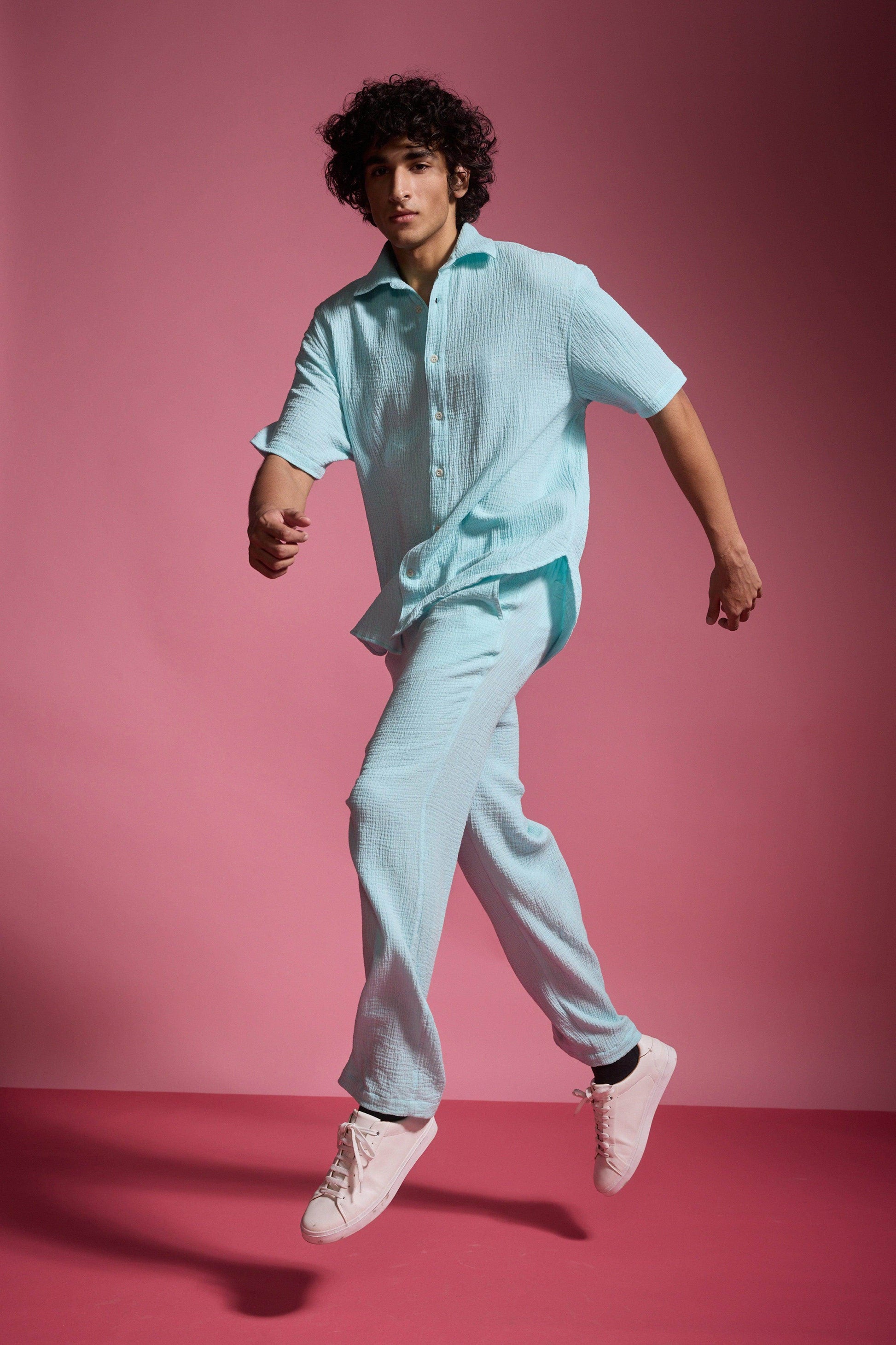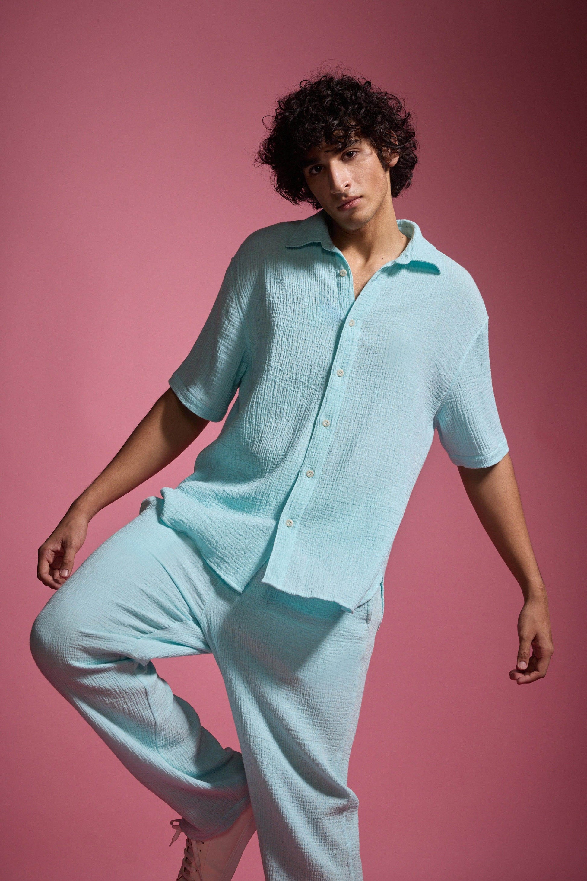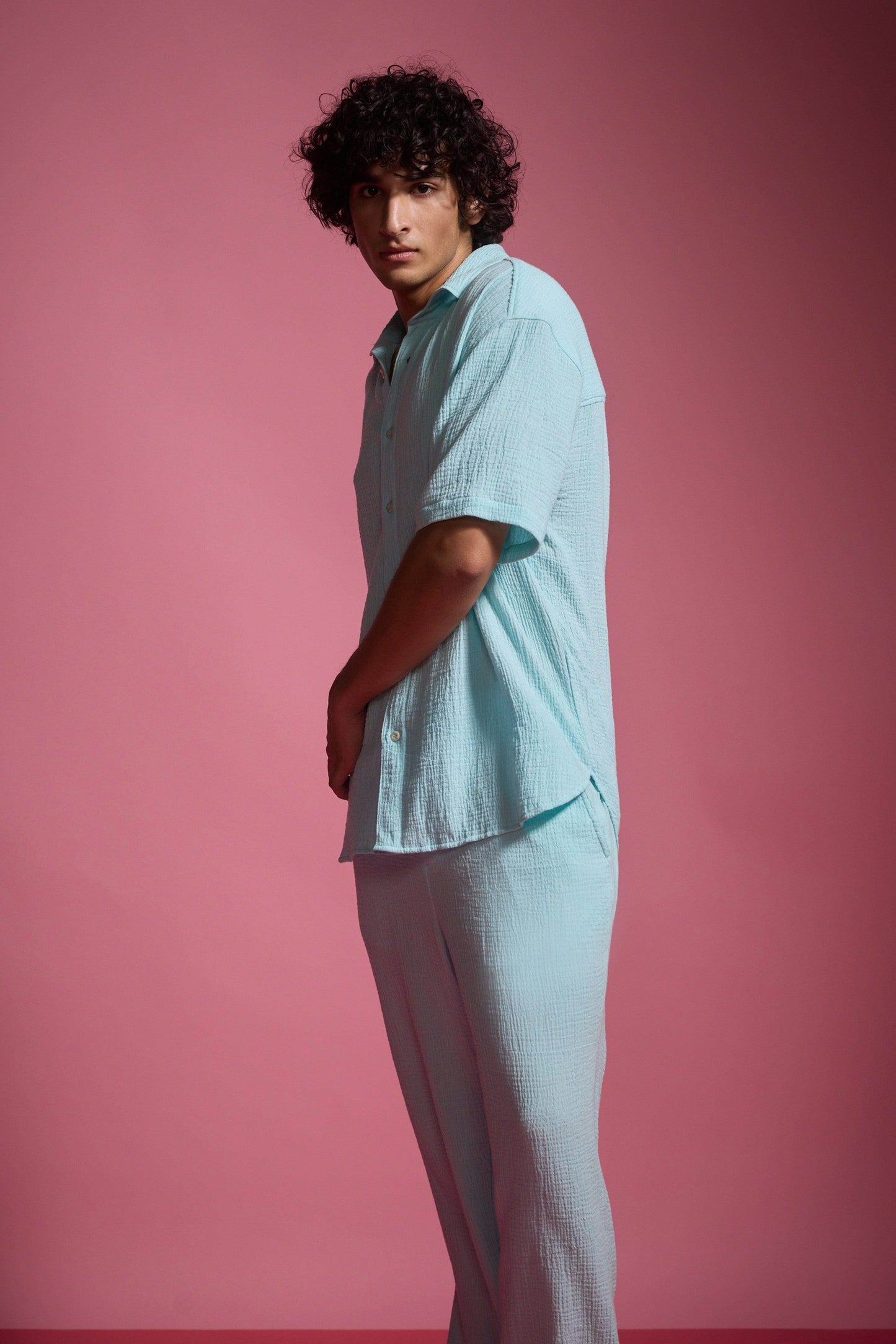 Boxy shirt in textured organic crinkle cotton fabric. Features a button-down placket, curved hem, shirt collar, and half sleeves. Paired with Straight cut pants in textured organic crinkle cotton fabric. Features an elastic waistband with drawstrings, and side and back pockets.
