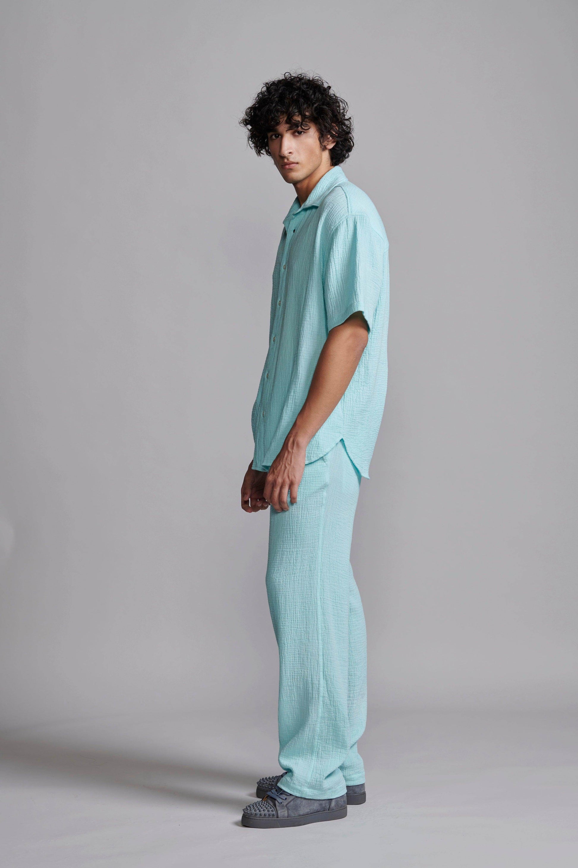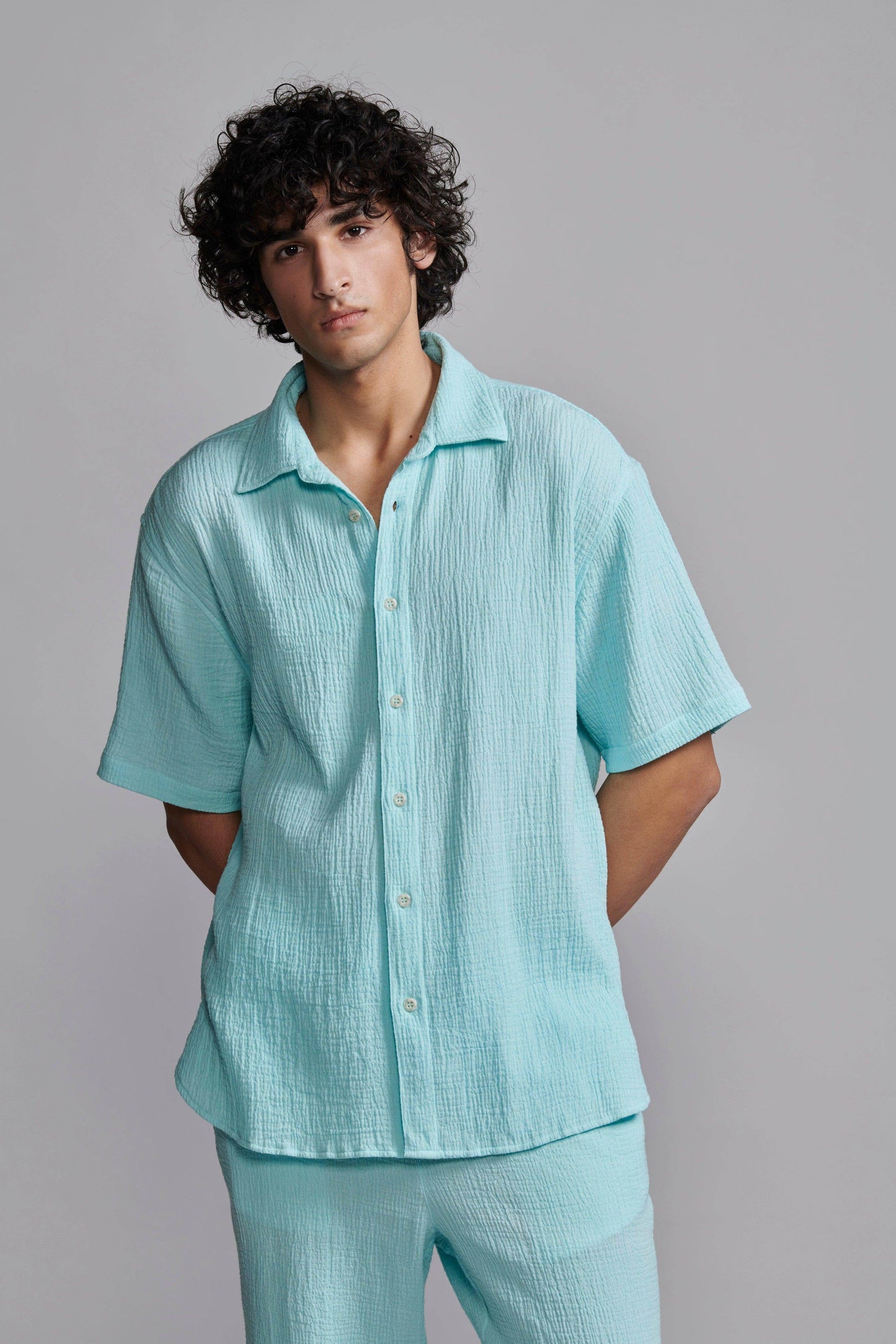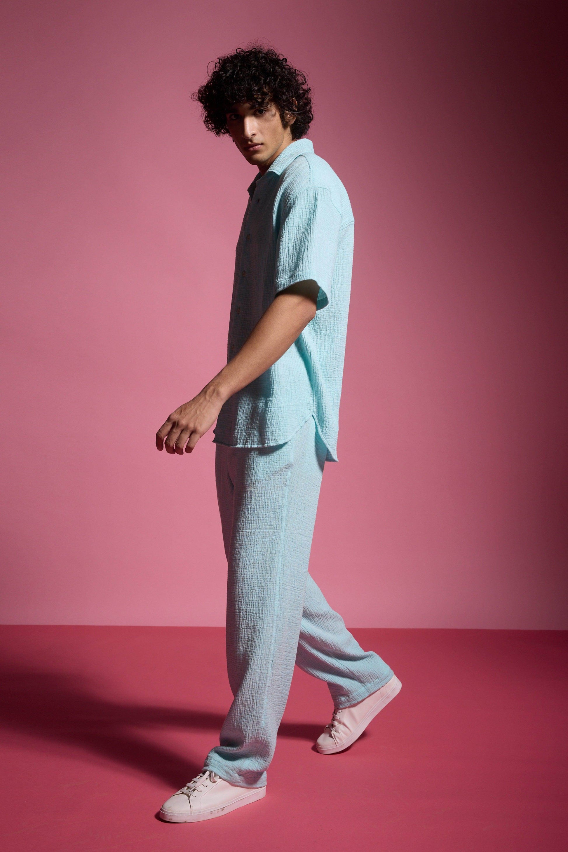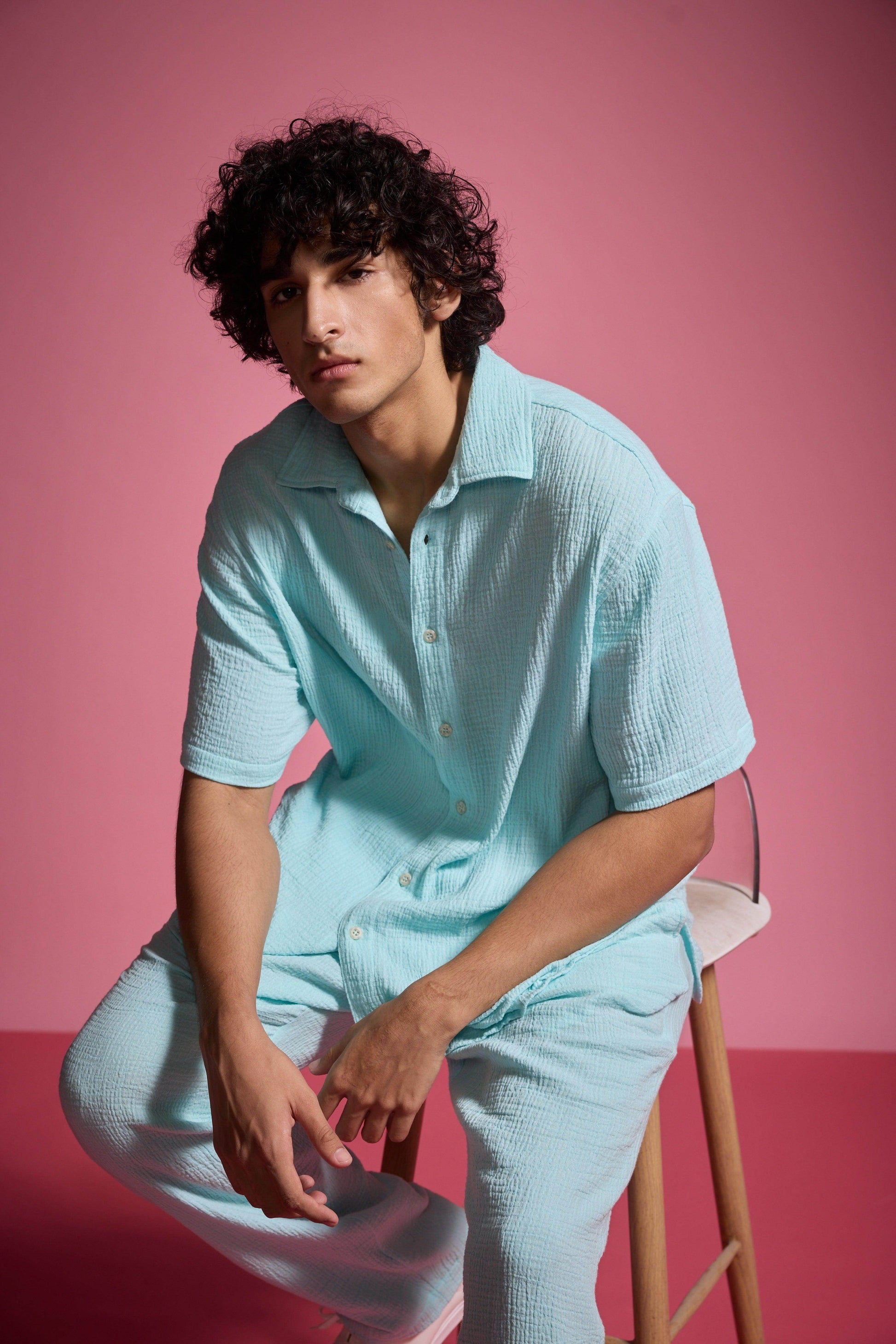 Boxy shirt in textured organic crinkle cotton fabric. Features a button-down placket, curved hem, shirt collar, and half sleeves. Paired with Straight cut pants in textured organic crinkle cotton fabric. Features an elastic waistband with drawstrings, and side and back pockets.