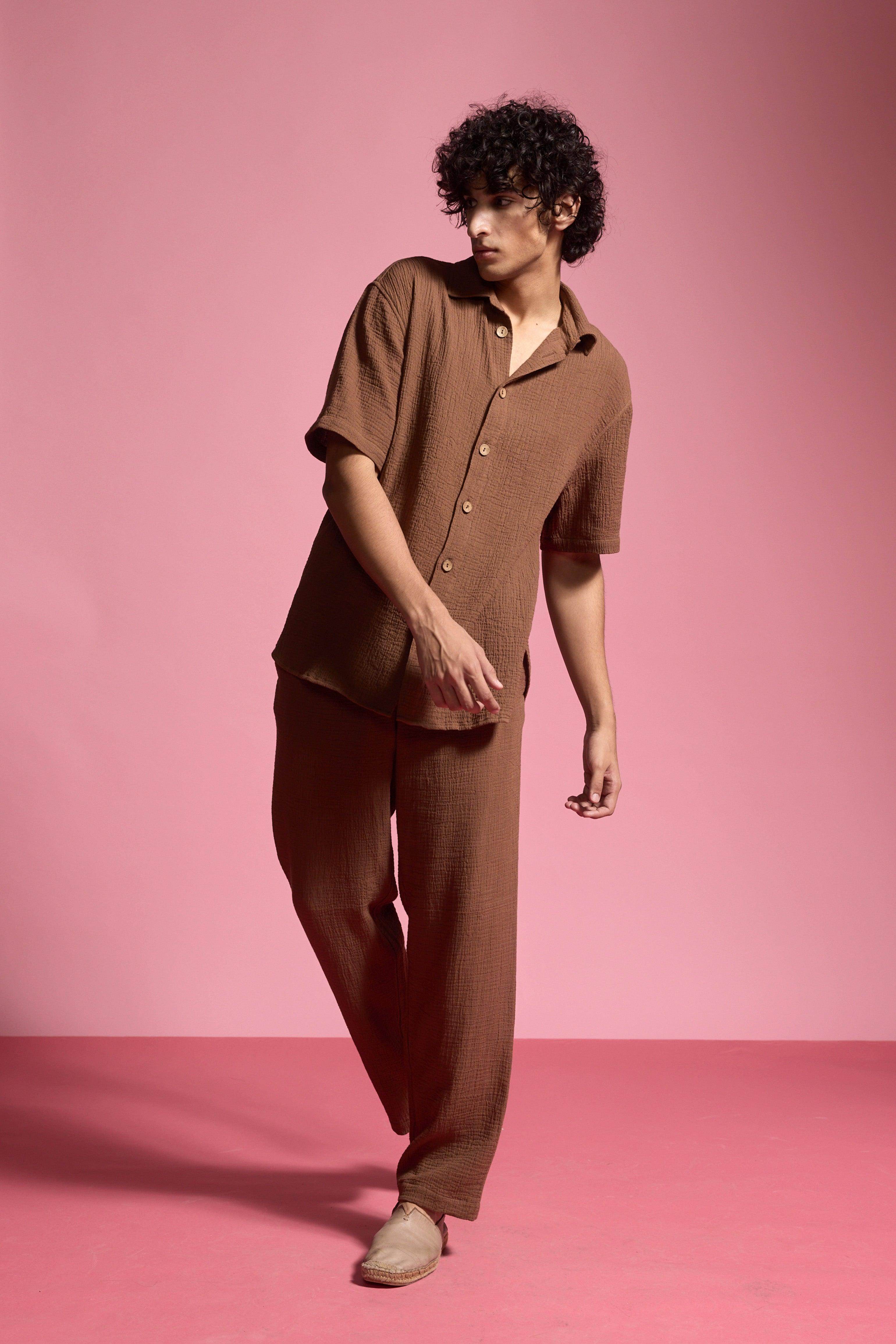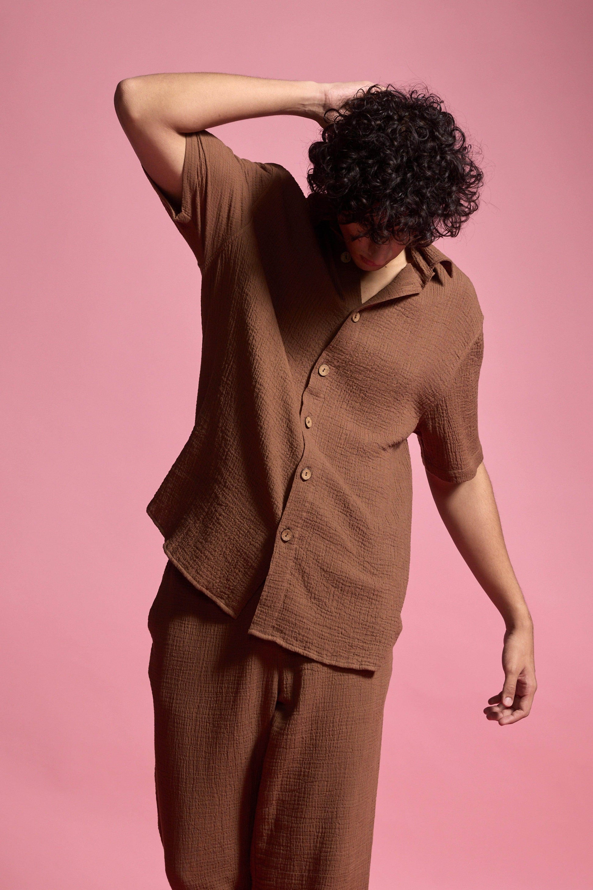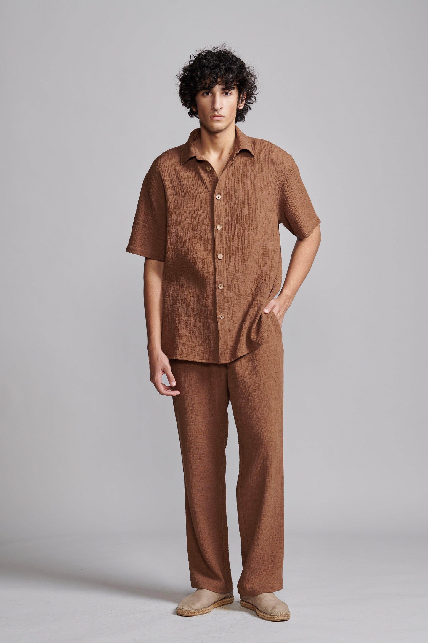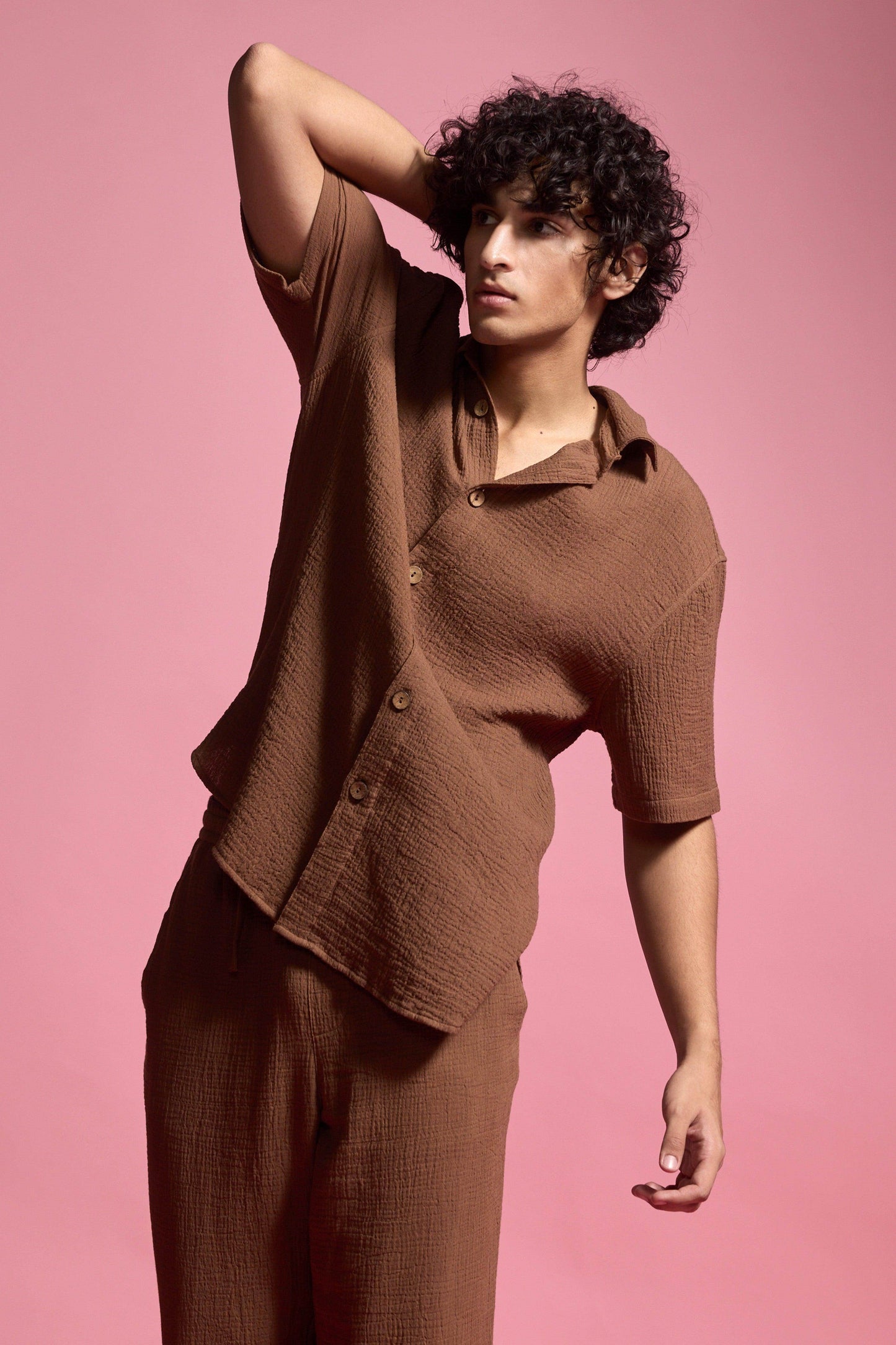 Boxy shirt in textured organic crinkle cotton fabric. Features a button-down placket, curved hem, shirt collar, and half sleeves. Paired with Straight cut pants in textured organic crinkle cotton fabric. Features an elastic waistband with drawstrings, and side and back pockets.