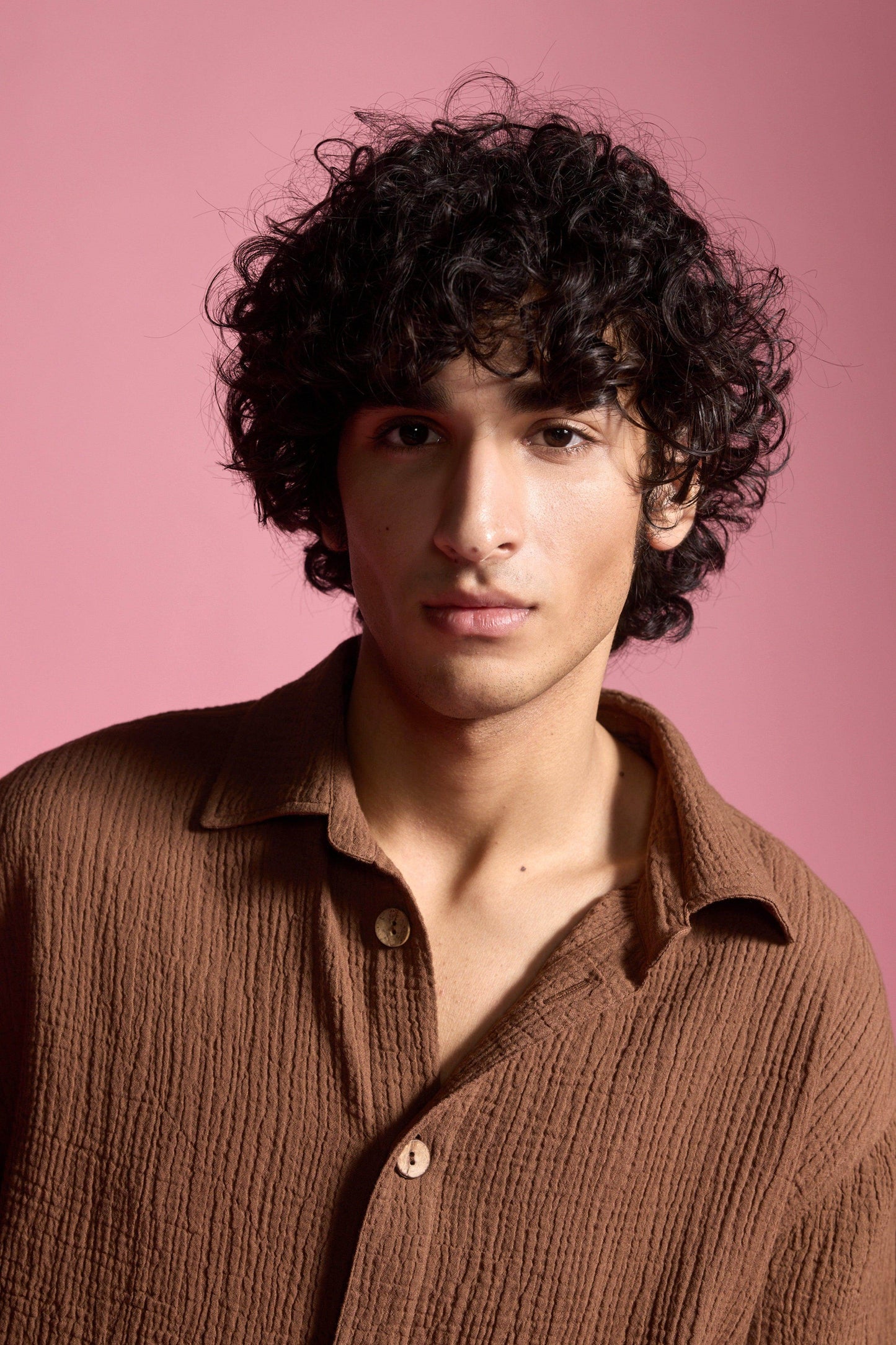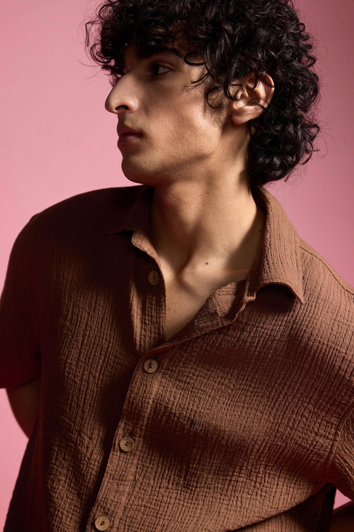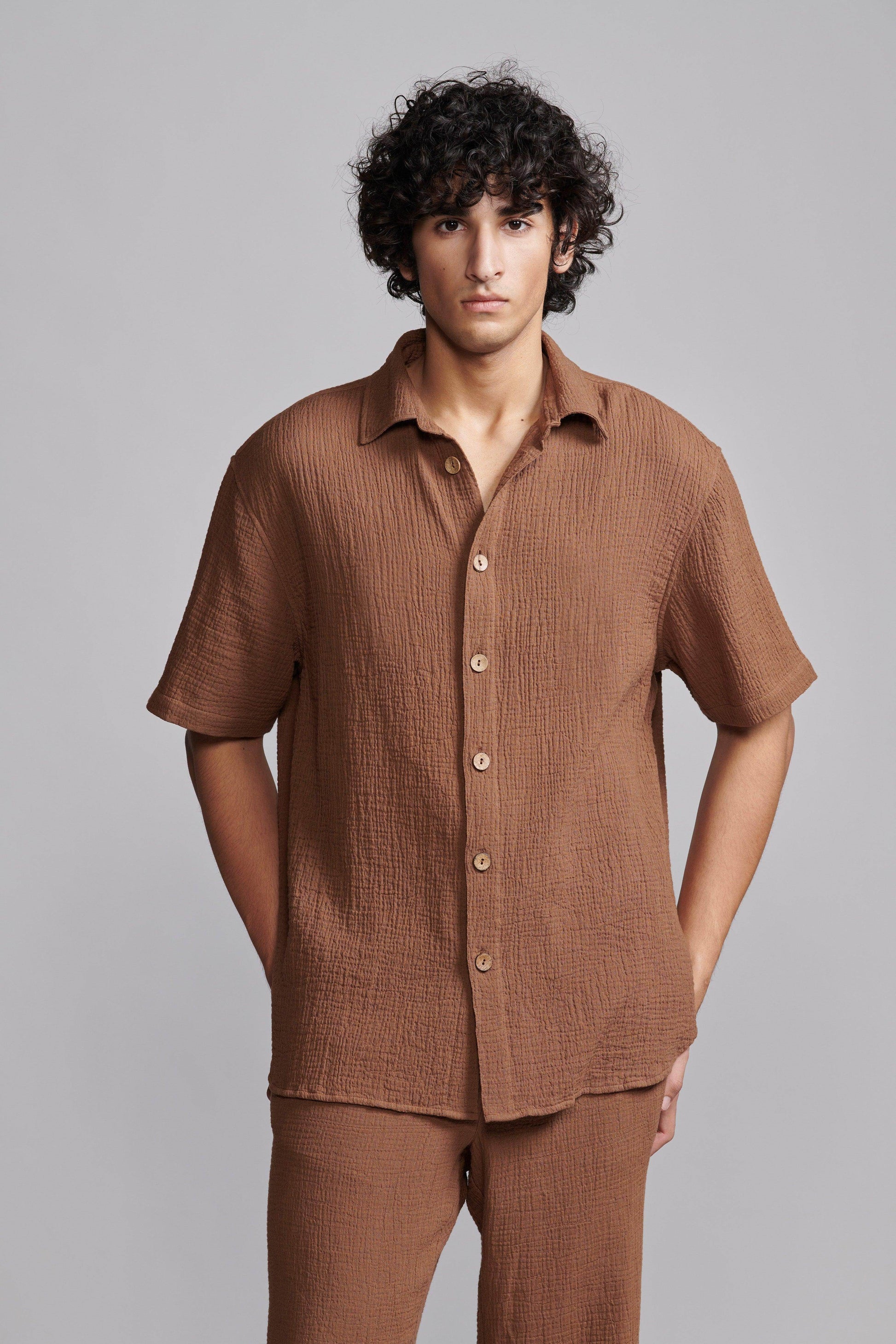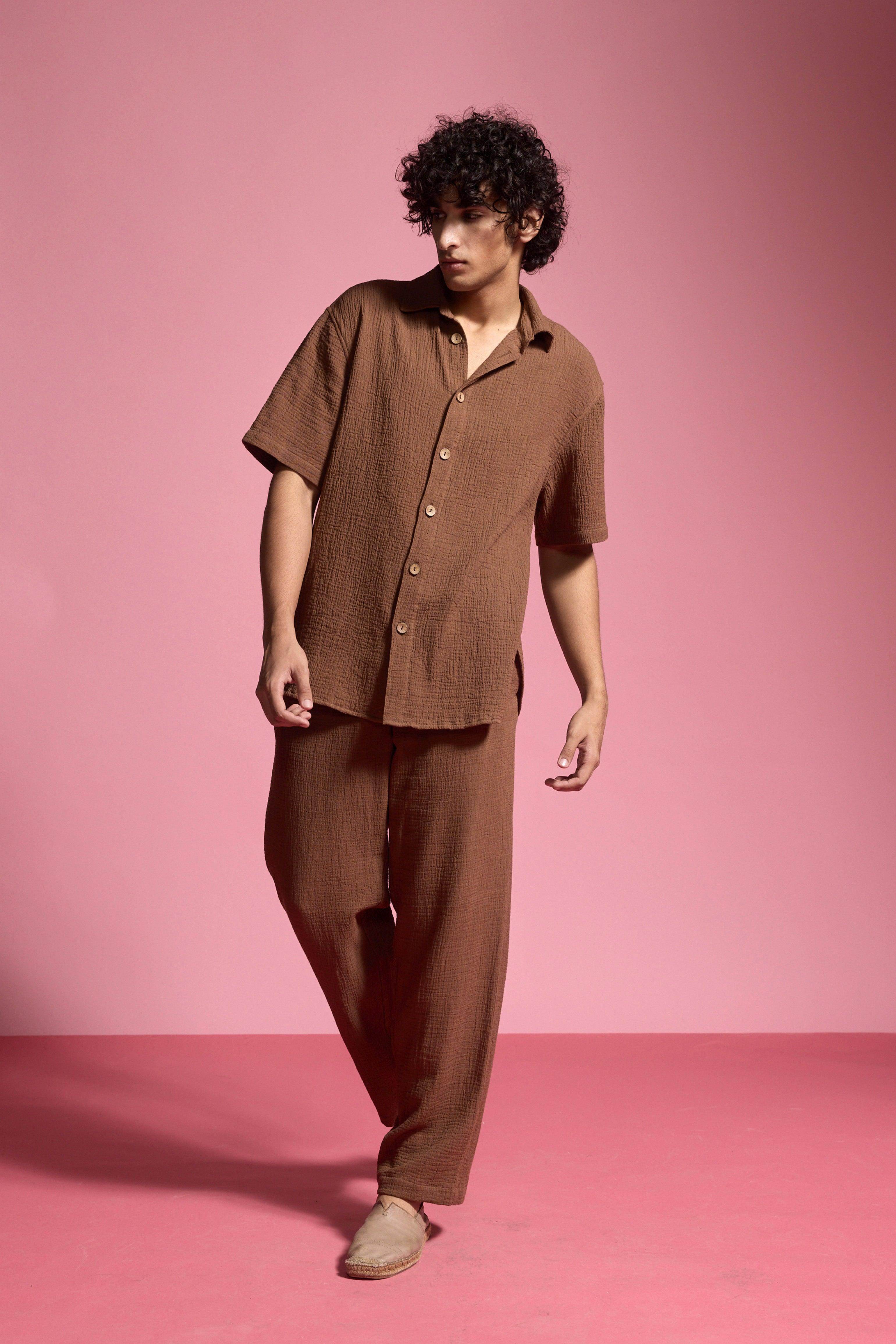 Boxy shirt in textured organic crinkle cotton fabric. Features a button-down placket, curved hem, shirt collar, and half sleeves. Paired with Straight cut pants in textured organic crinkle cotton fabric. Features an elastic waistband with drawstrings, and side and back pockets.