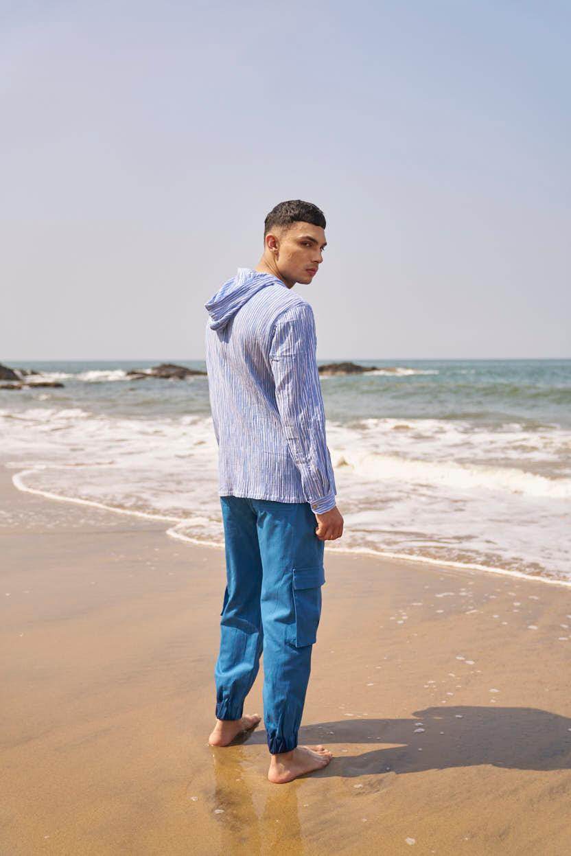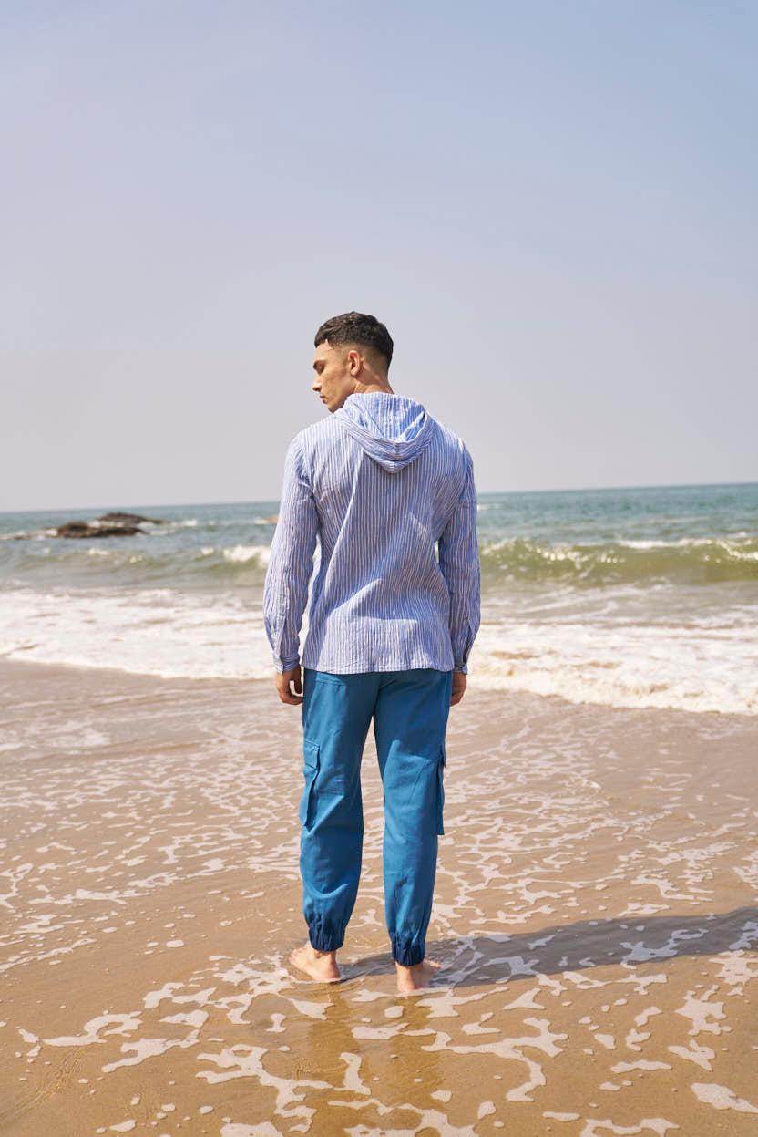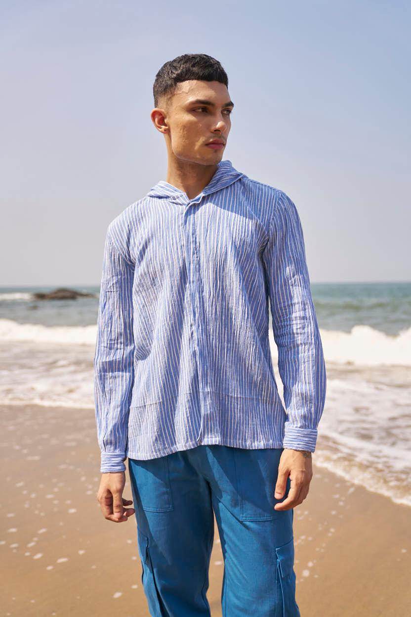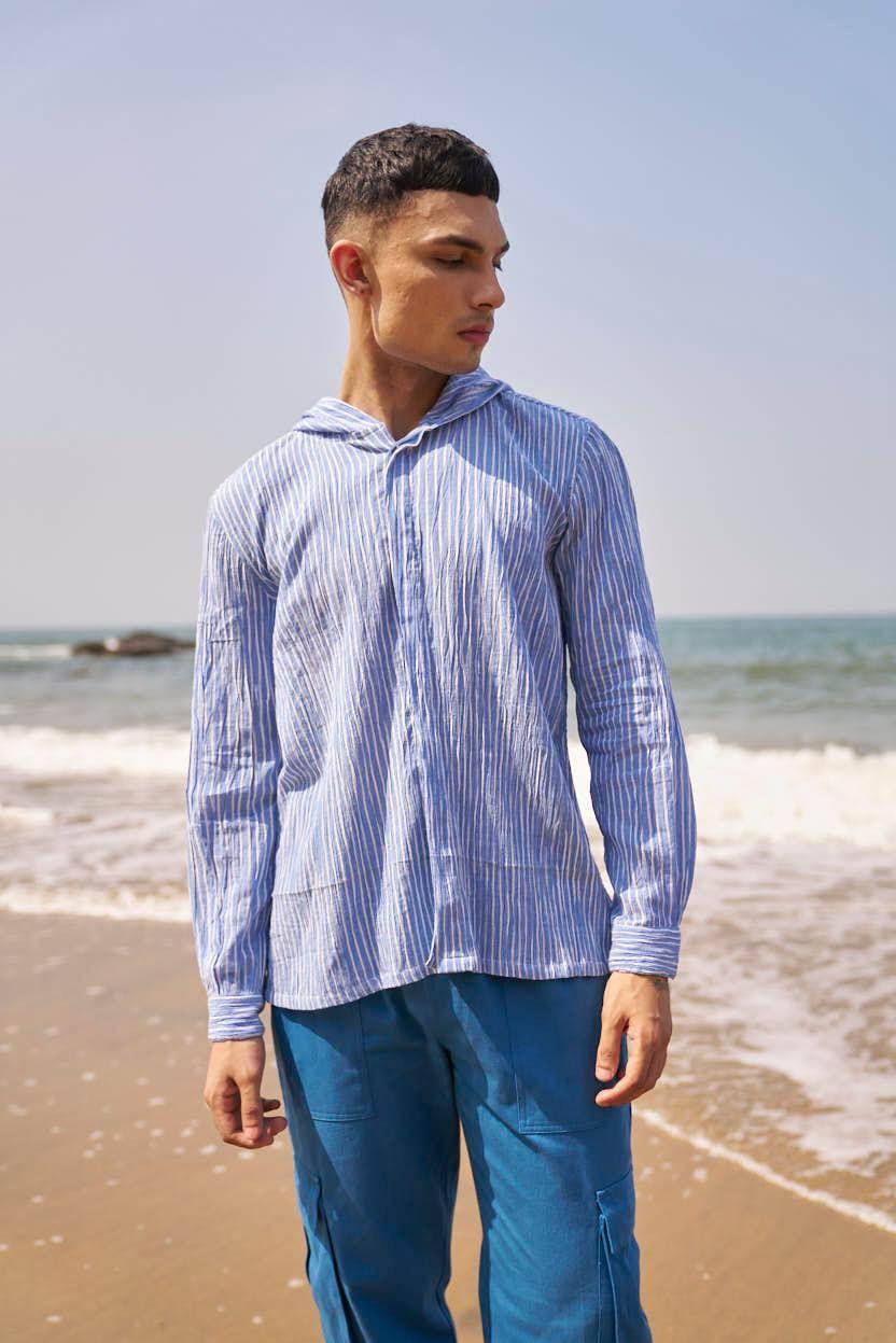 Button down blue and white stripe hoodie shirt in a soft crinkle cotton. Full sleeves with a concealed button placket in the front. Relaxed fit.