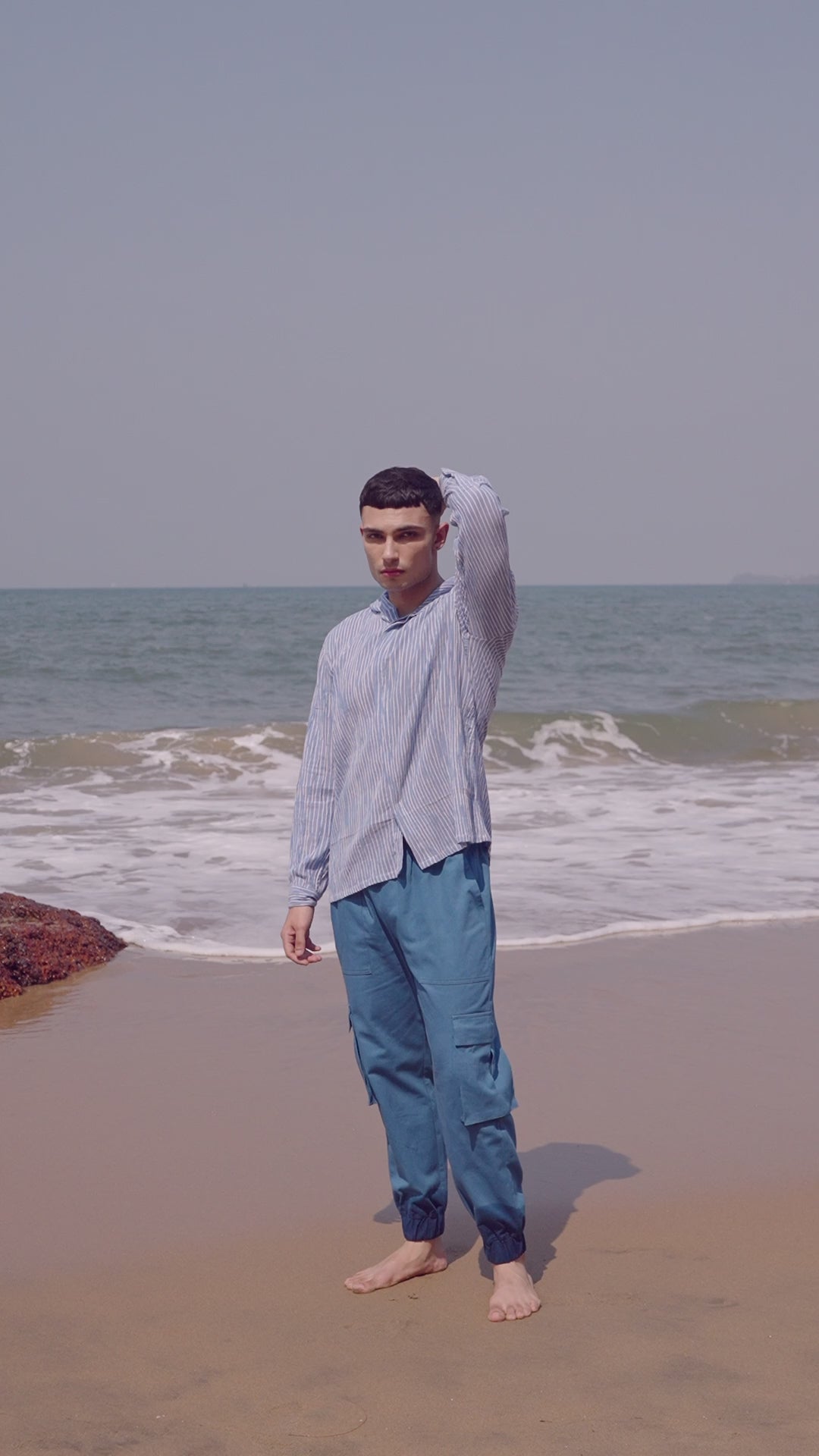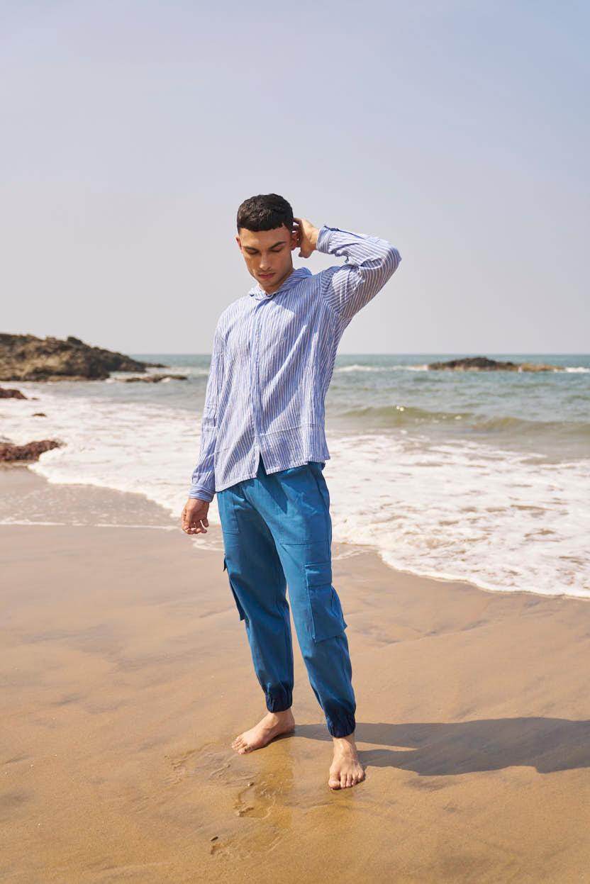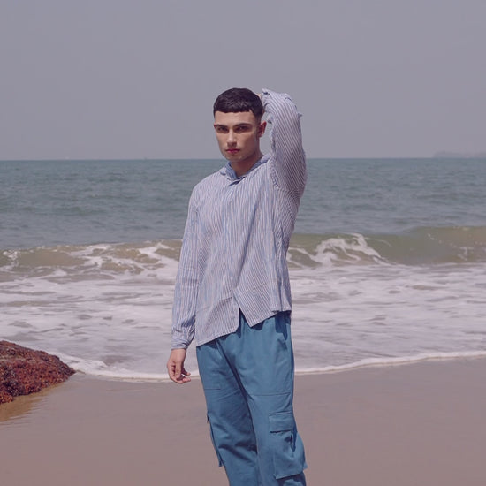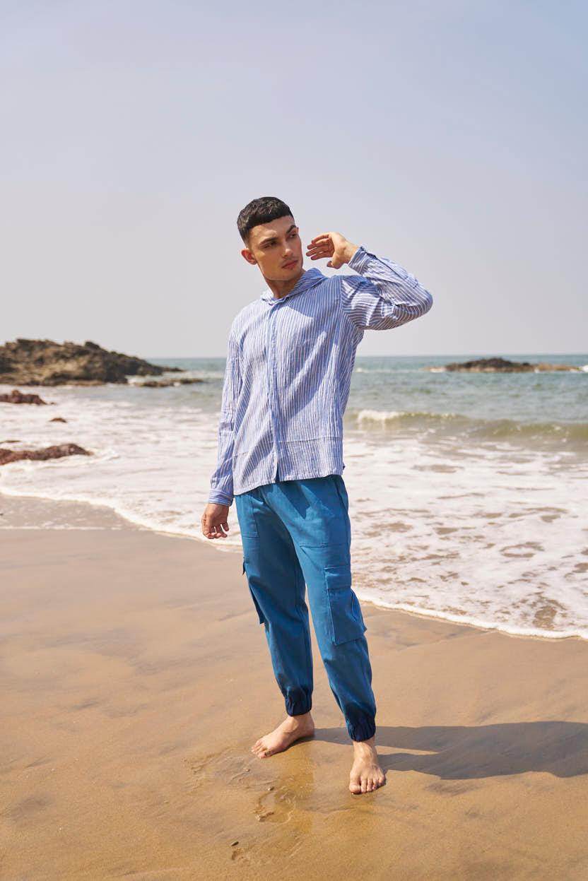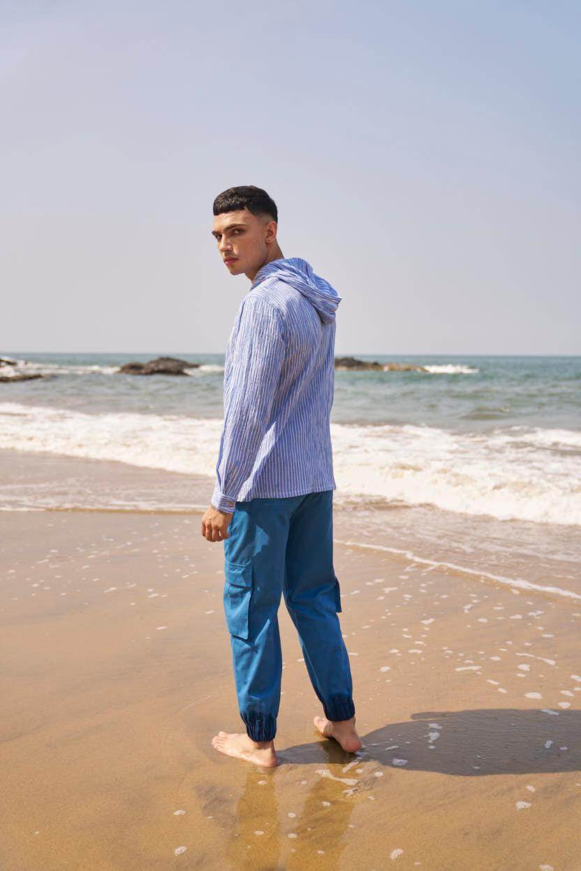 Button down blue and white stripe hoodie shirt in a soft crinkle cotton. Full sleeves with a concealed button placket in the front. Relaxed fit.