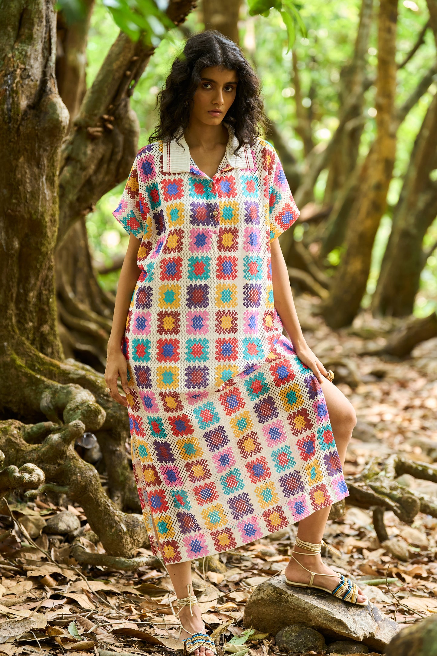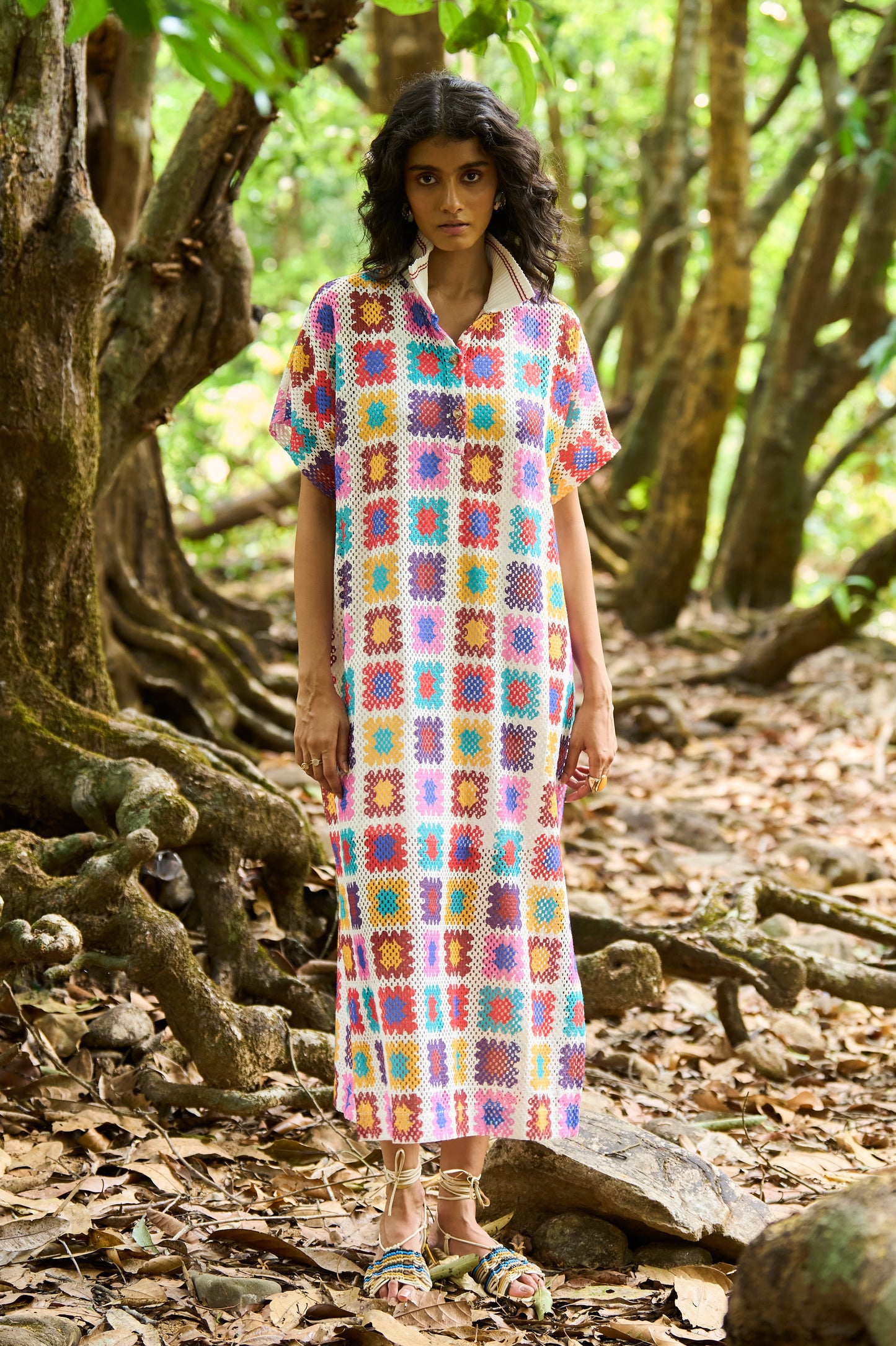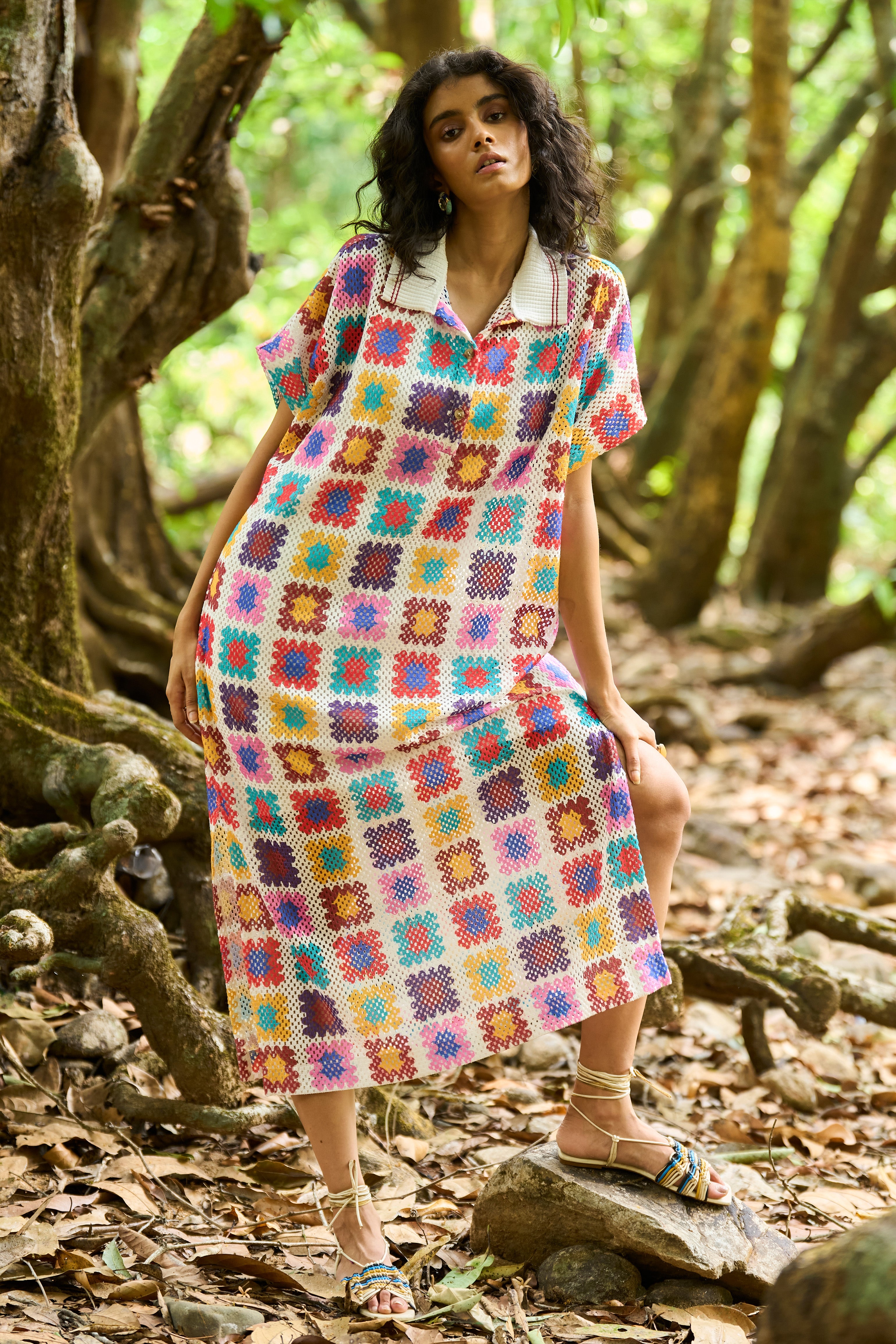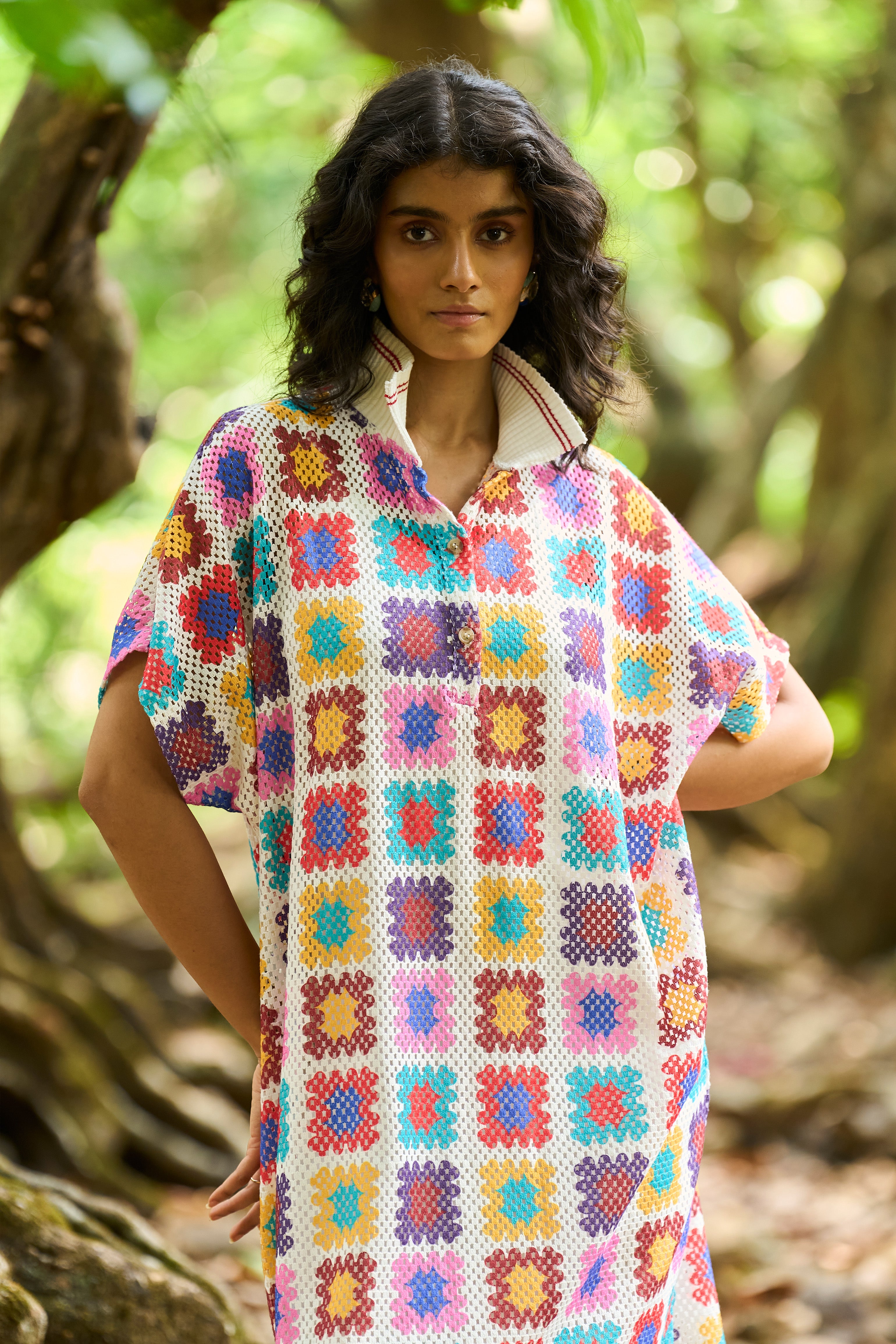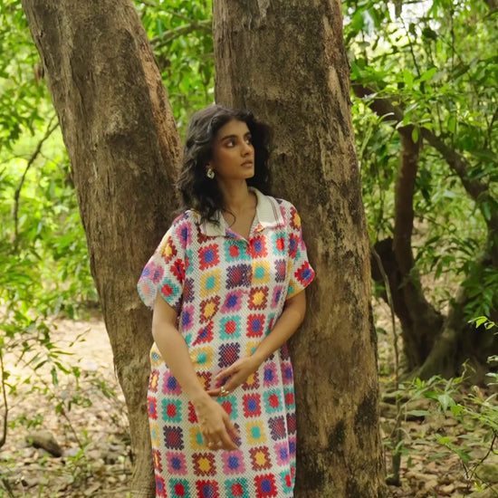 Full-length shirt dress in a multicolour crochet inspired watercolour print on an airy knitted crochet lace. Ribbed collar with a contrast red tipping detail. Popover dress with a front placket, side slits and dolman half sleeves. Comes with a slip.
