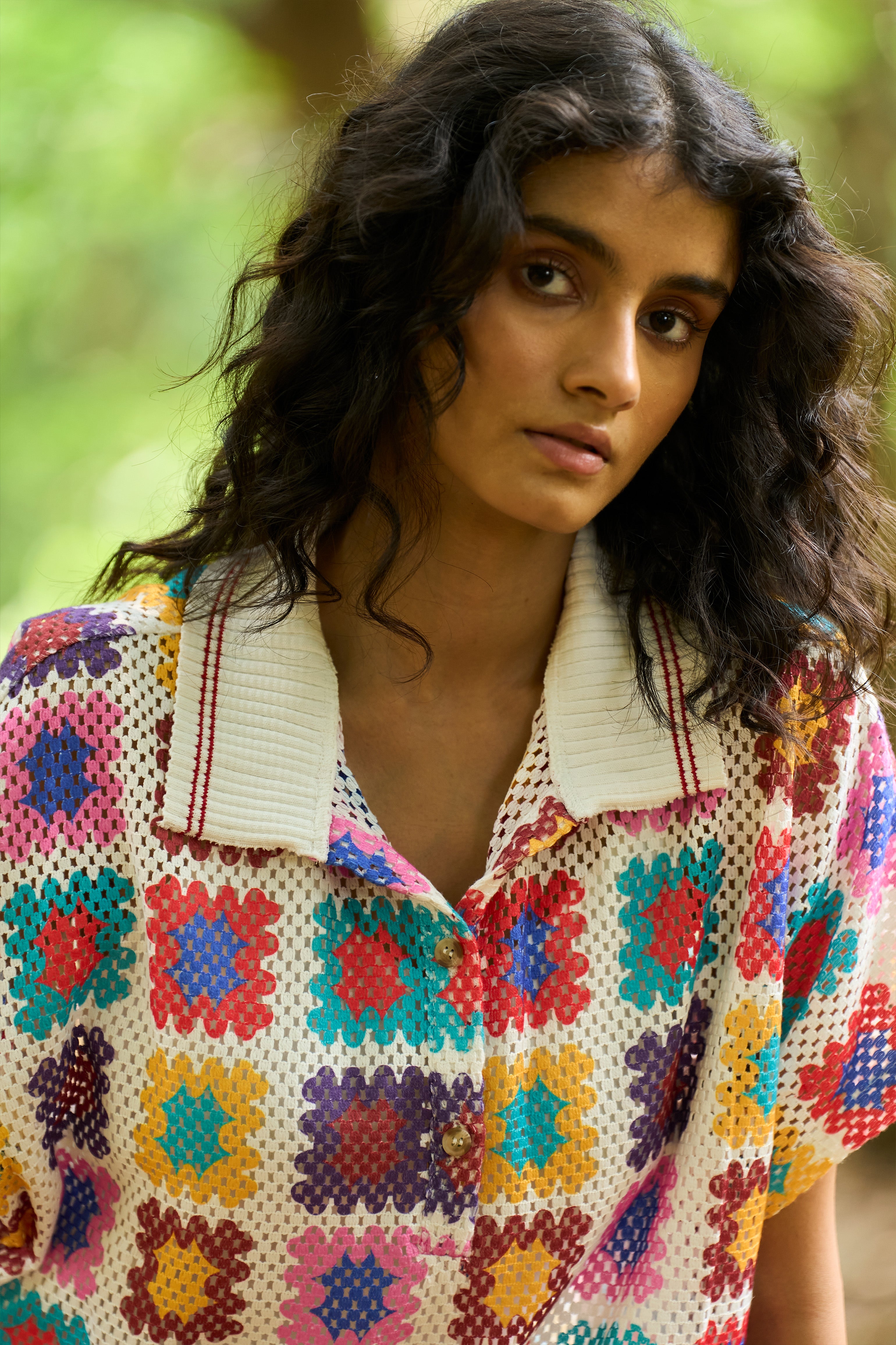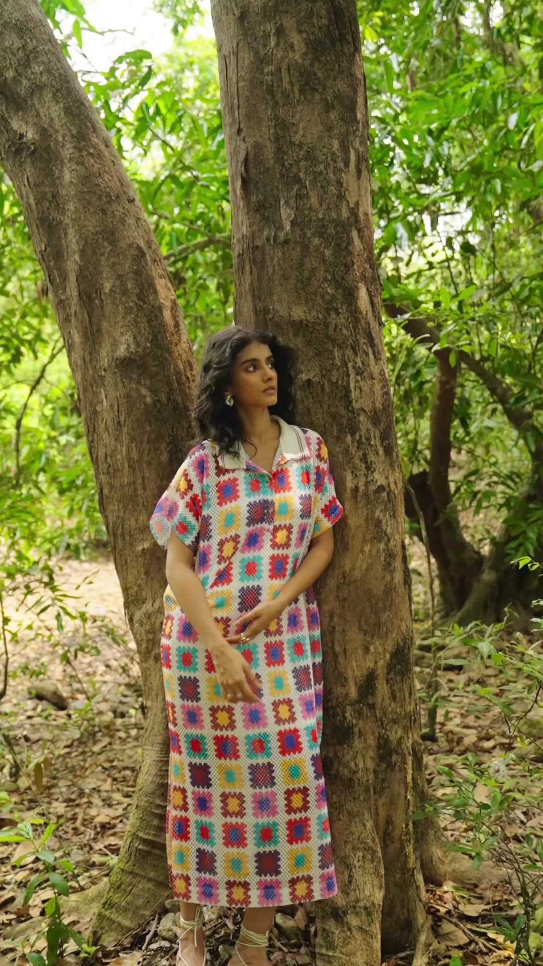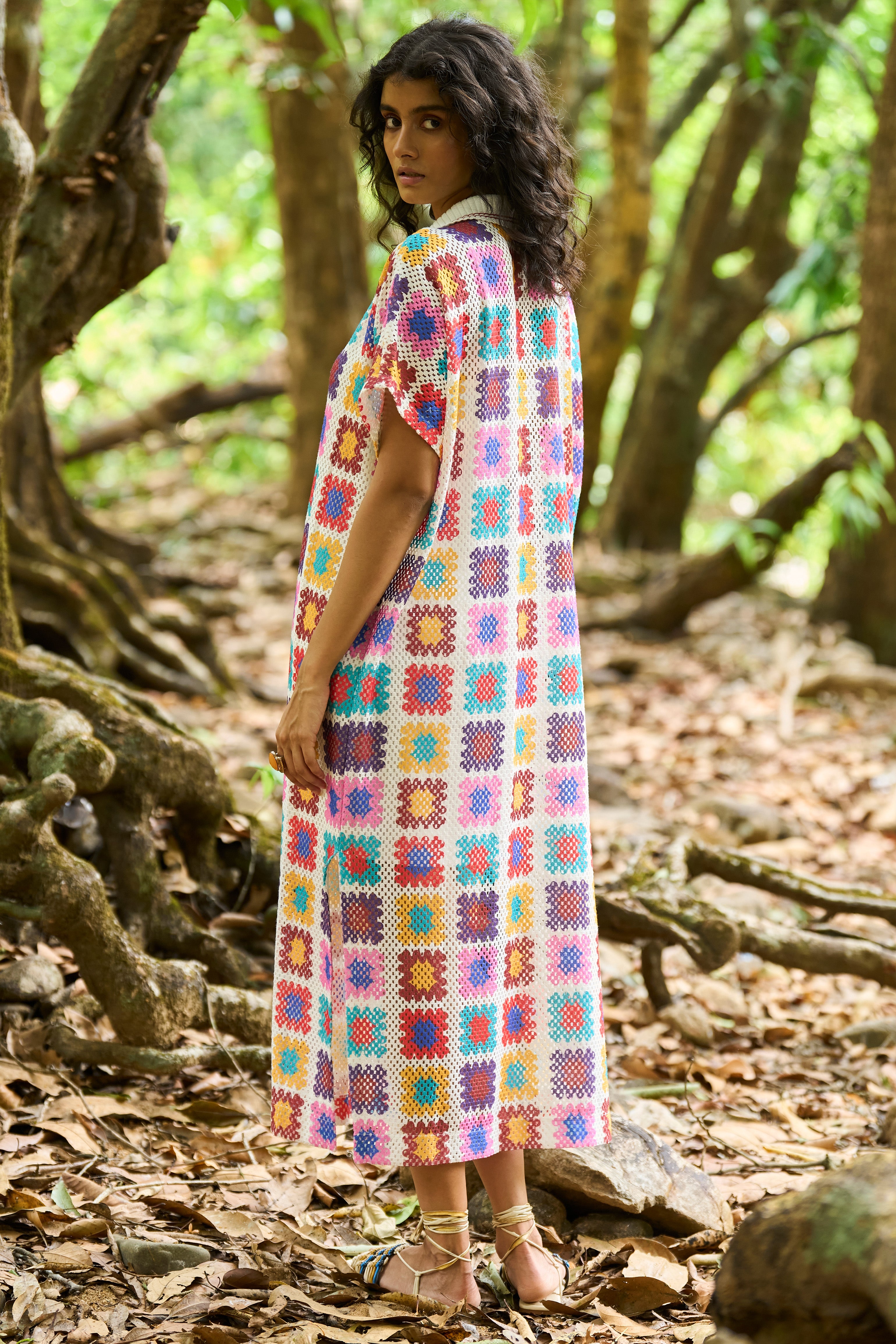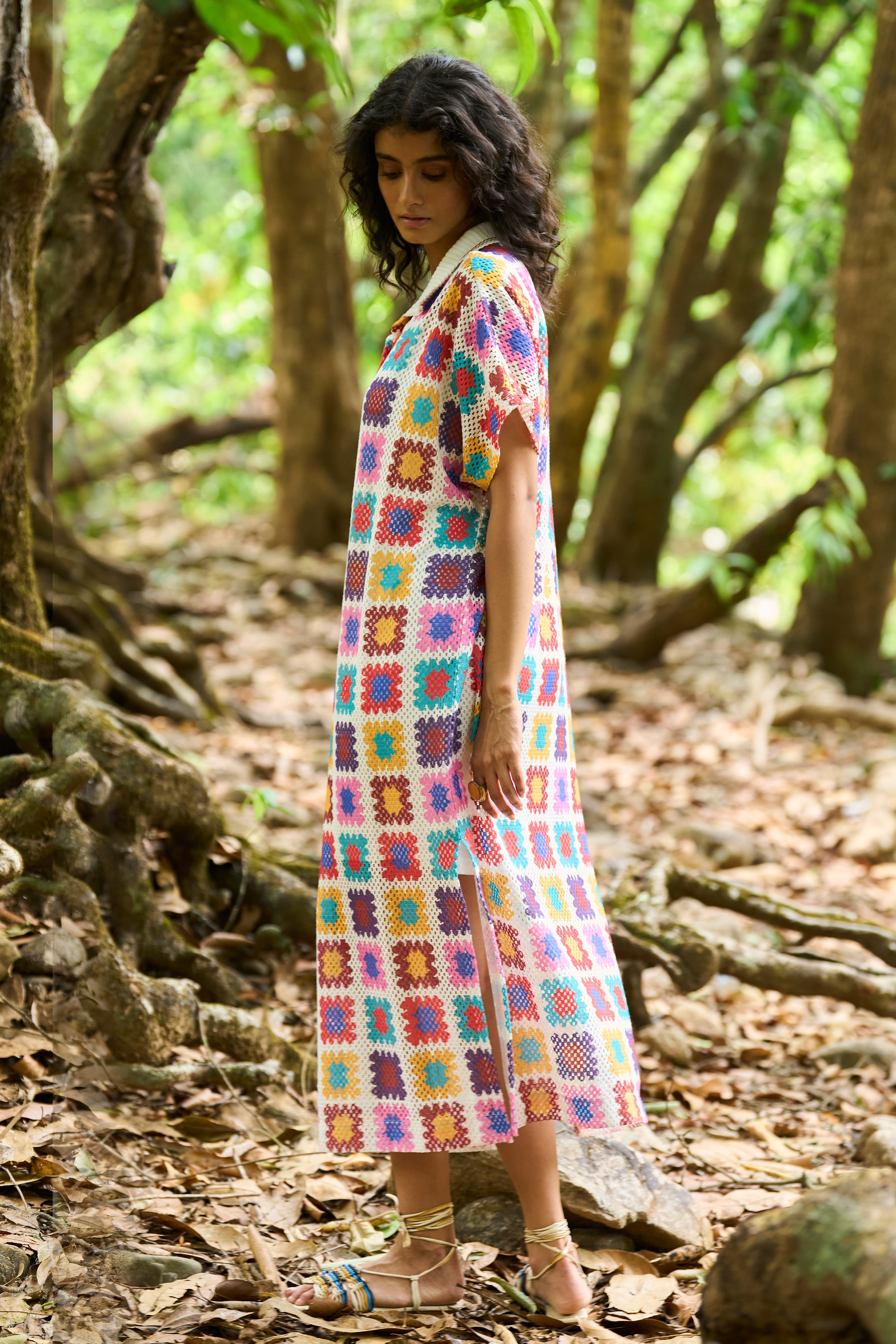 Full-length shirt dress in a multicolour crochet inspired watercolour print on an airy knitted crochet lace. Ribbed collar with a contrast red tipping detail. Popover dress with a front placket, side slits and dolman half sleeves. Comes with a slip.
