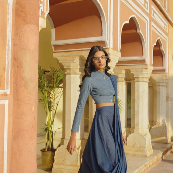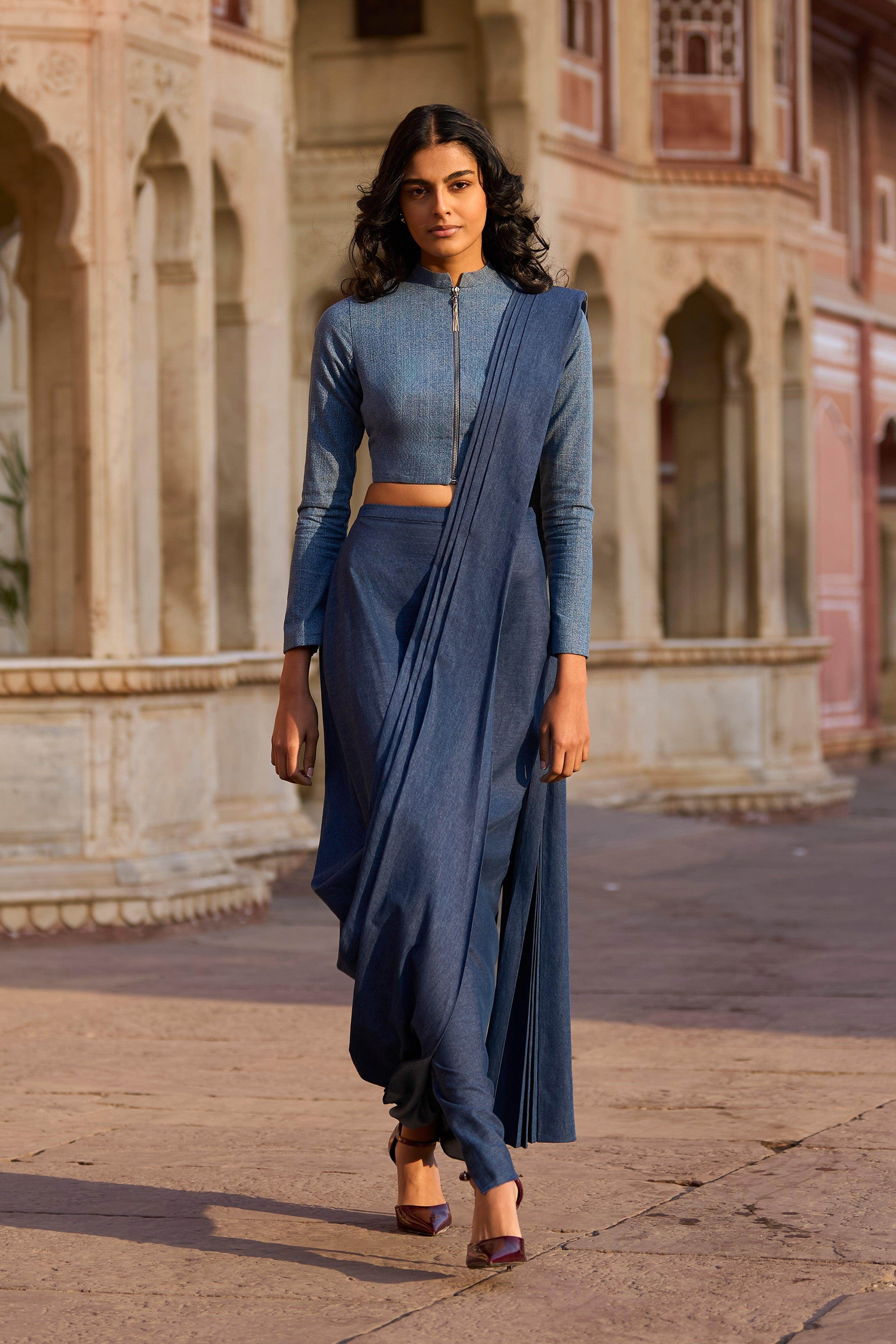 Cropped shirt in denim with full sleeves and a band collar. Silver zip with tassled puller front closure. Fully lined. Paired with a tonal darker draped and wrapped straight cut maxi-skirt with hand applied pleats in a drapey washed denim fabric. Includes a free-flowing pleated panel attached at the waist, mimicking a sari drape. Secured with hook/eye and zip closure in the side.