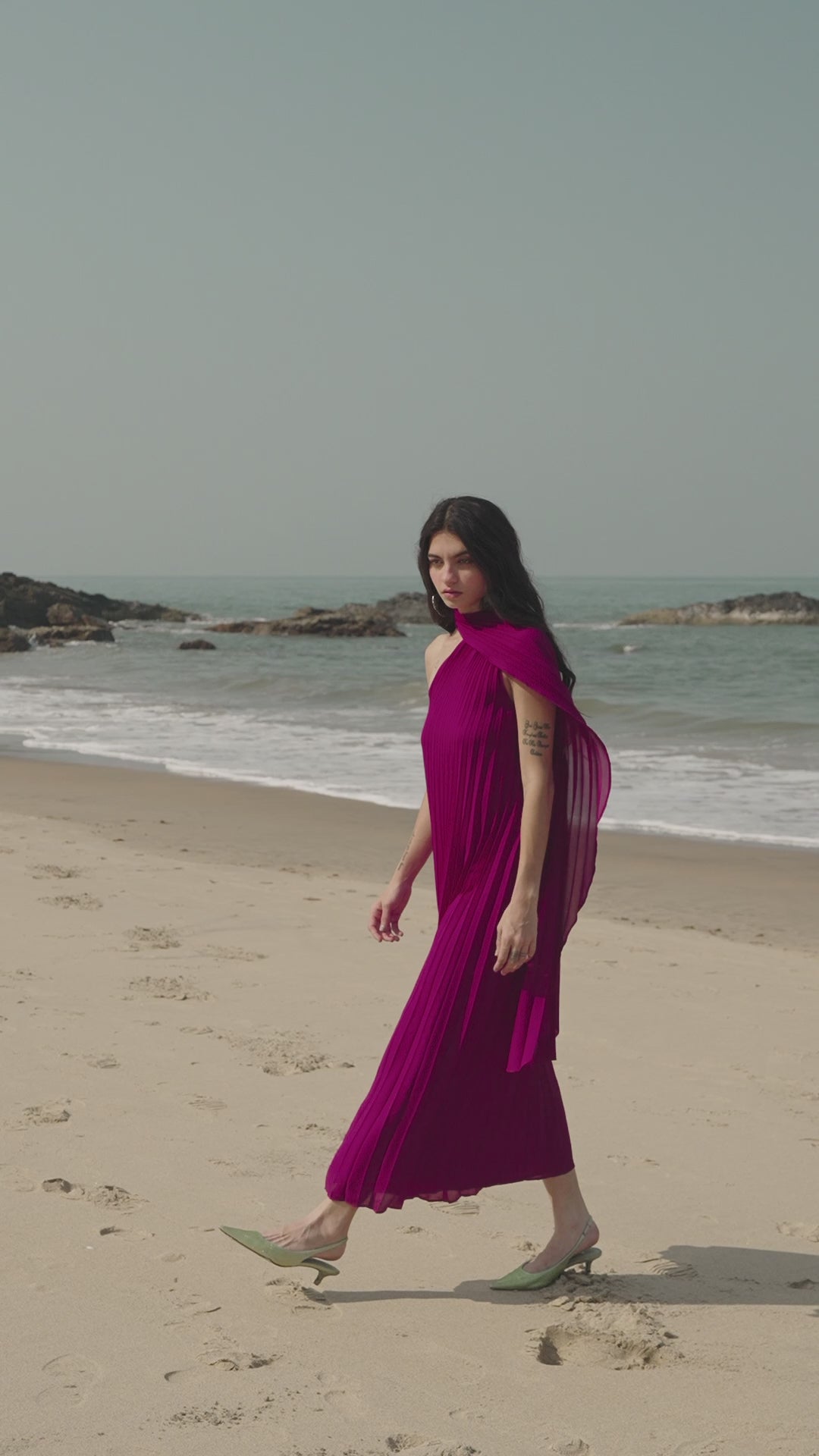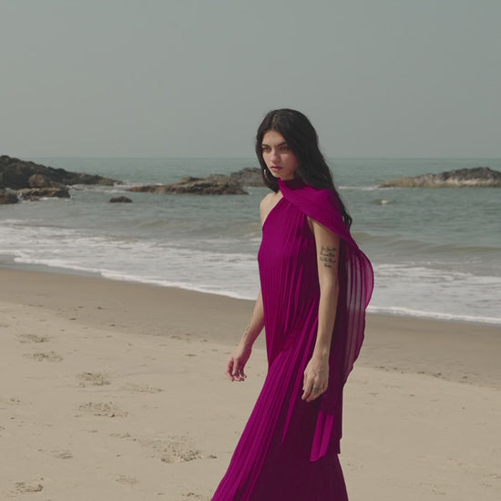 One shoulder sunray pleated midi dress. The dress has a slit on one side and is fully lined. Comes with a detached pleated scarf panel that is buttoned around the neck and draped over one shoulder.