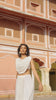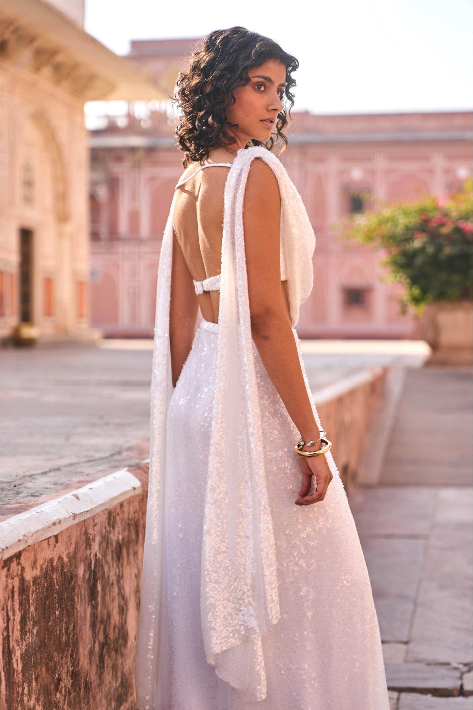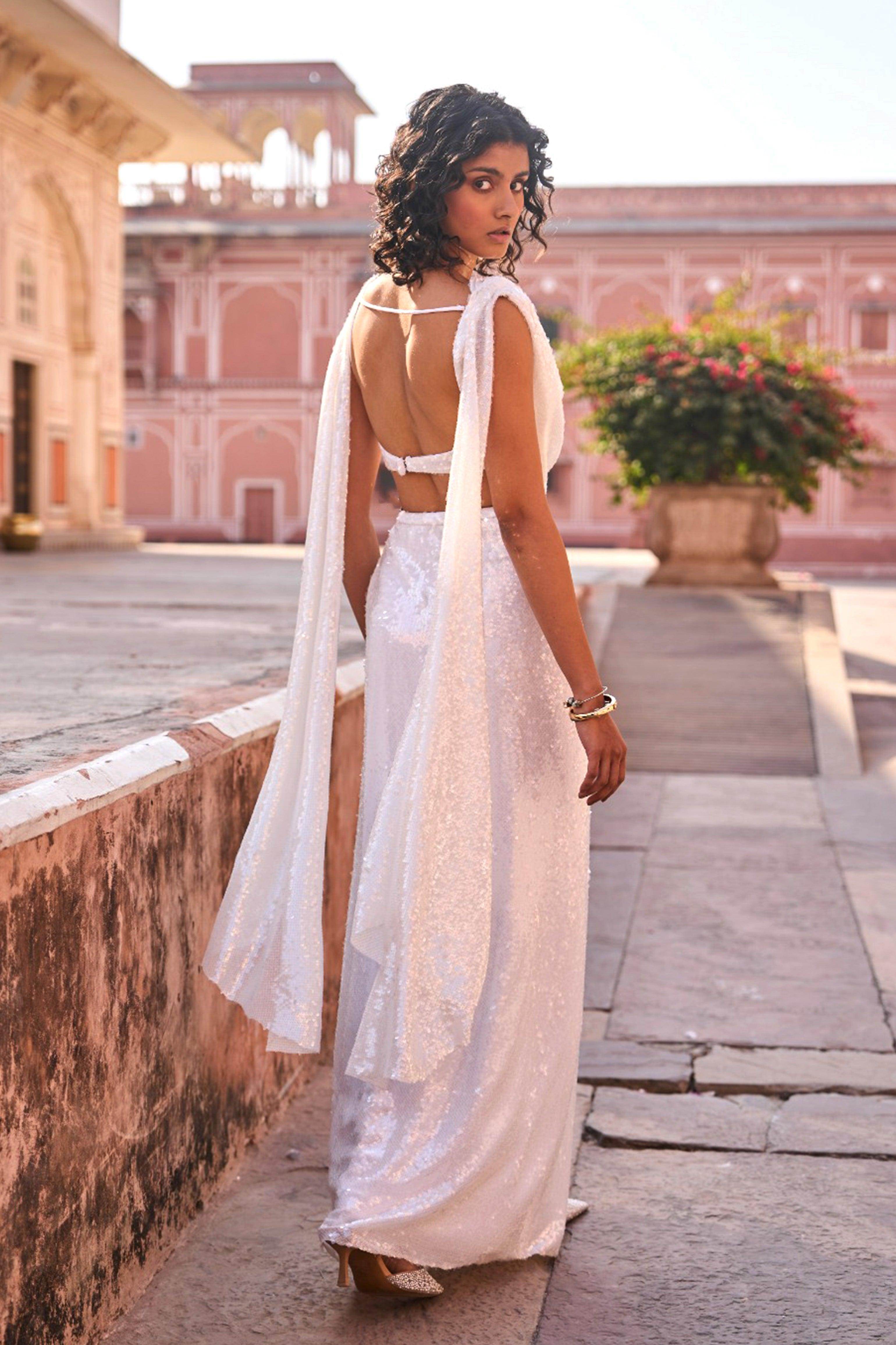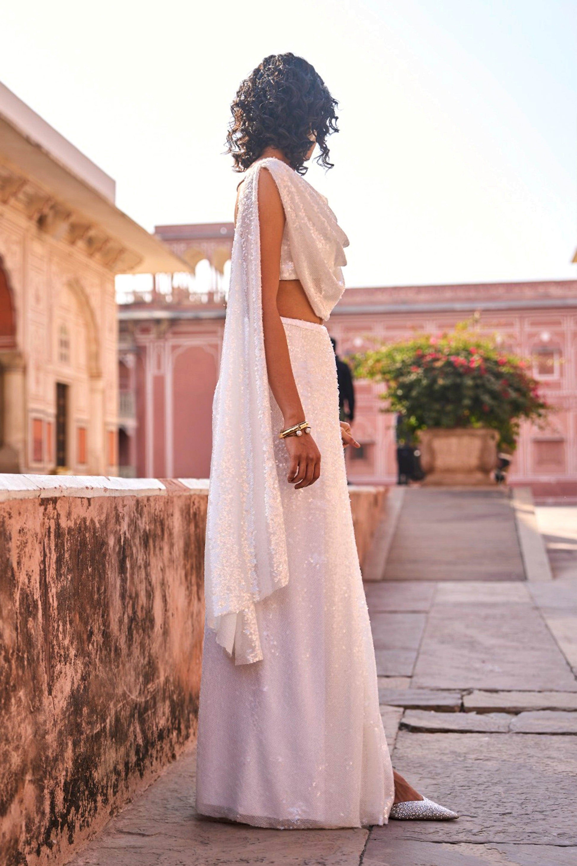 Allover sequin embroidered crop top with hand applied drape cowl detailing in the front. Flowing panels over the shoulder inspired by a sari drape. String and hook/eye closure at the back. Paired with a matching draped skirt with hand applied pleats in the front. Hook and button closure on the front. Garment is fully lined.