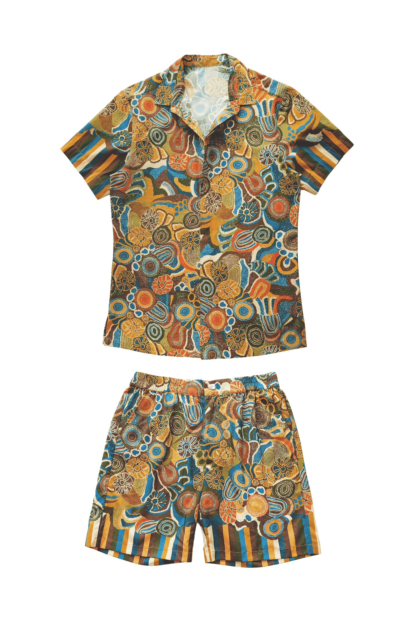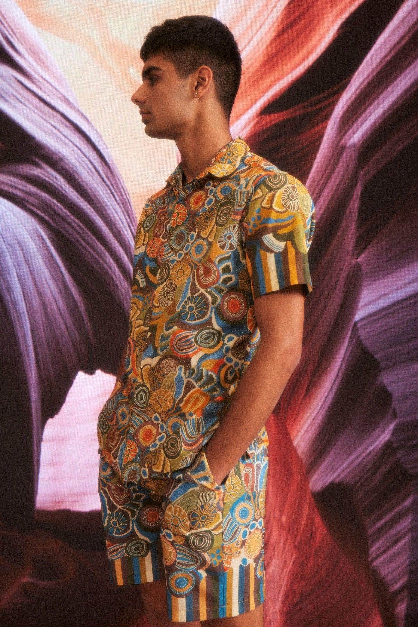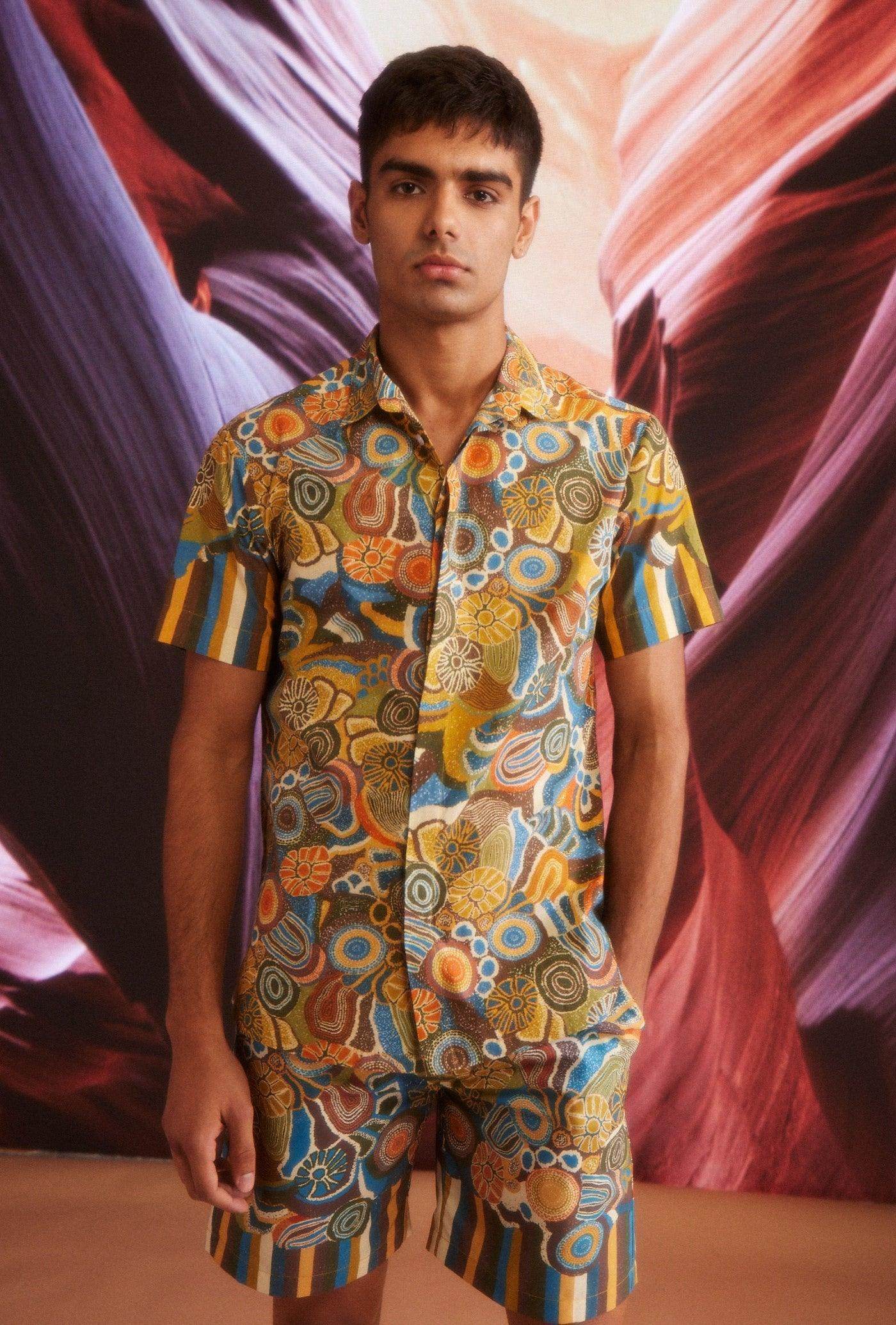 Abstract printed half sleeve shirt and short set in earth tones. Half sleeve shirt with concealed button placket. Paired with matching shorts. Elasticated at the back. Pockets on the side and back. Button closure and zip at the front. Placed stripe border on the sleeve cuff and the hem of the shorts.