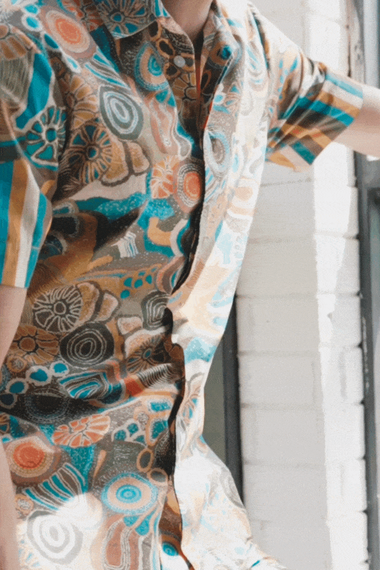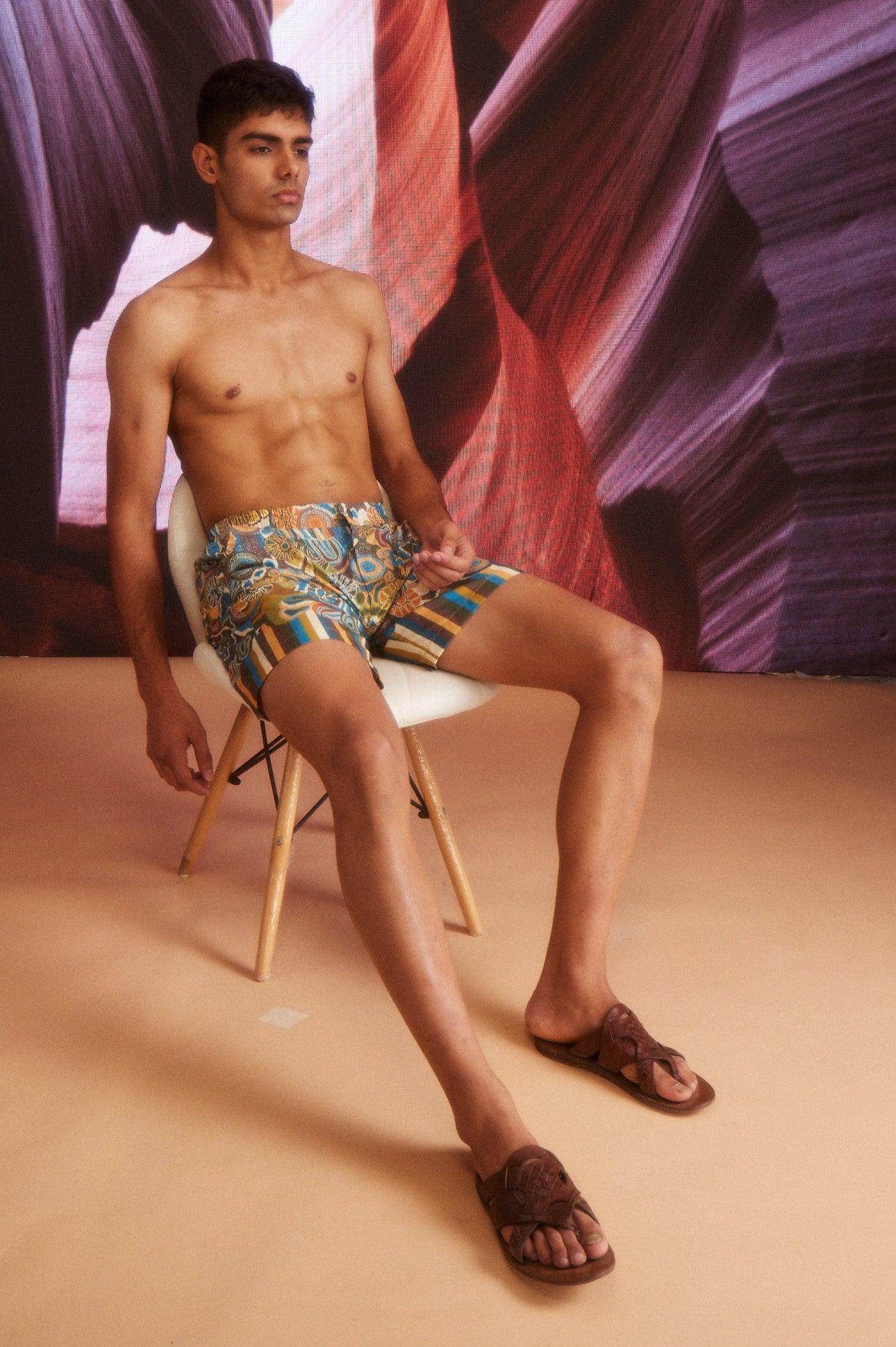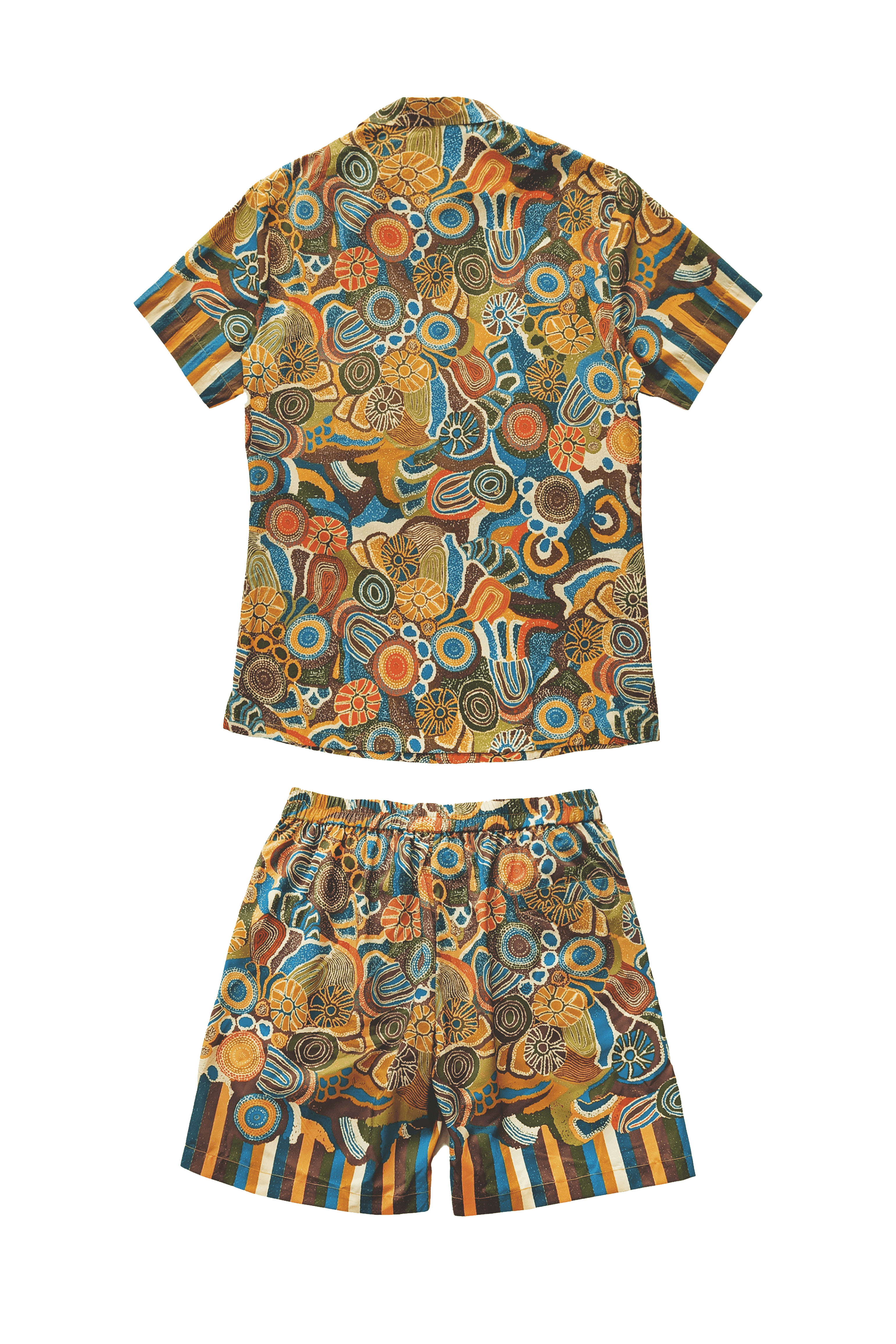 Abstract printed half sleeve shirt and short set in earth tones. Half sleeve shirt with concealed button placket. Paired with matching shorts. Elasticated at the back. Pockets on the side and back. Button closure and zip at the front. Placed stripe border on the sleeve cuff and the hem of the shorts.