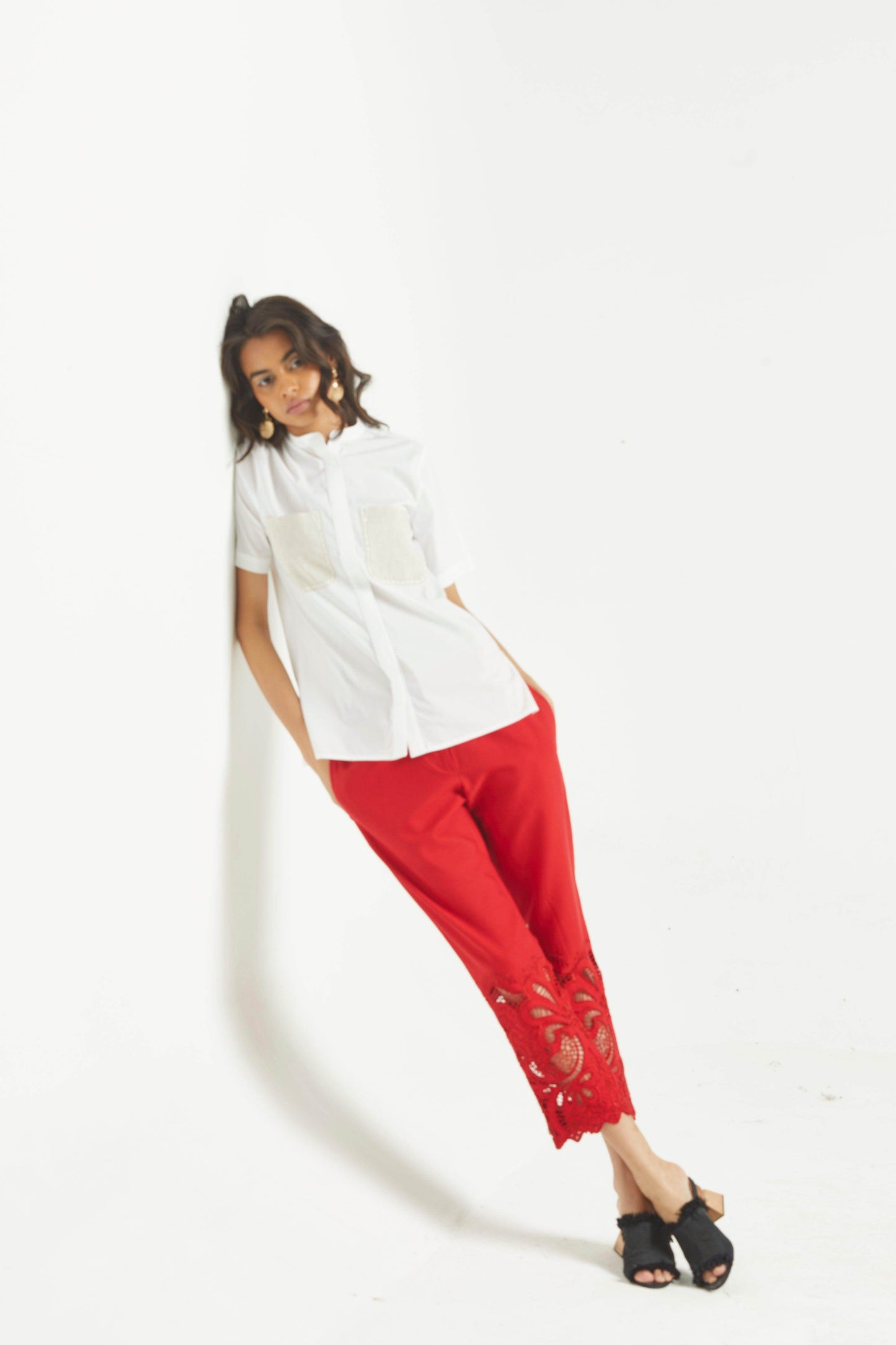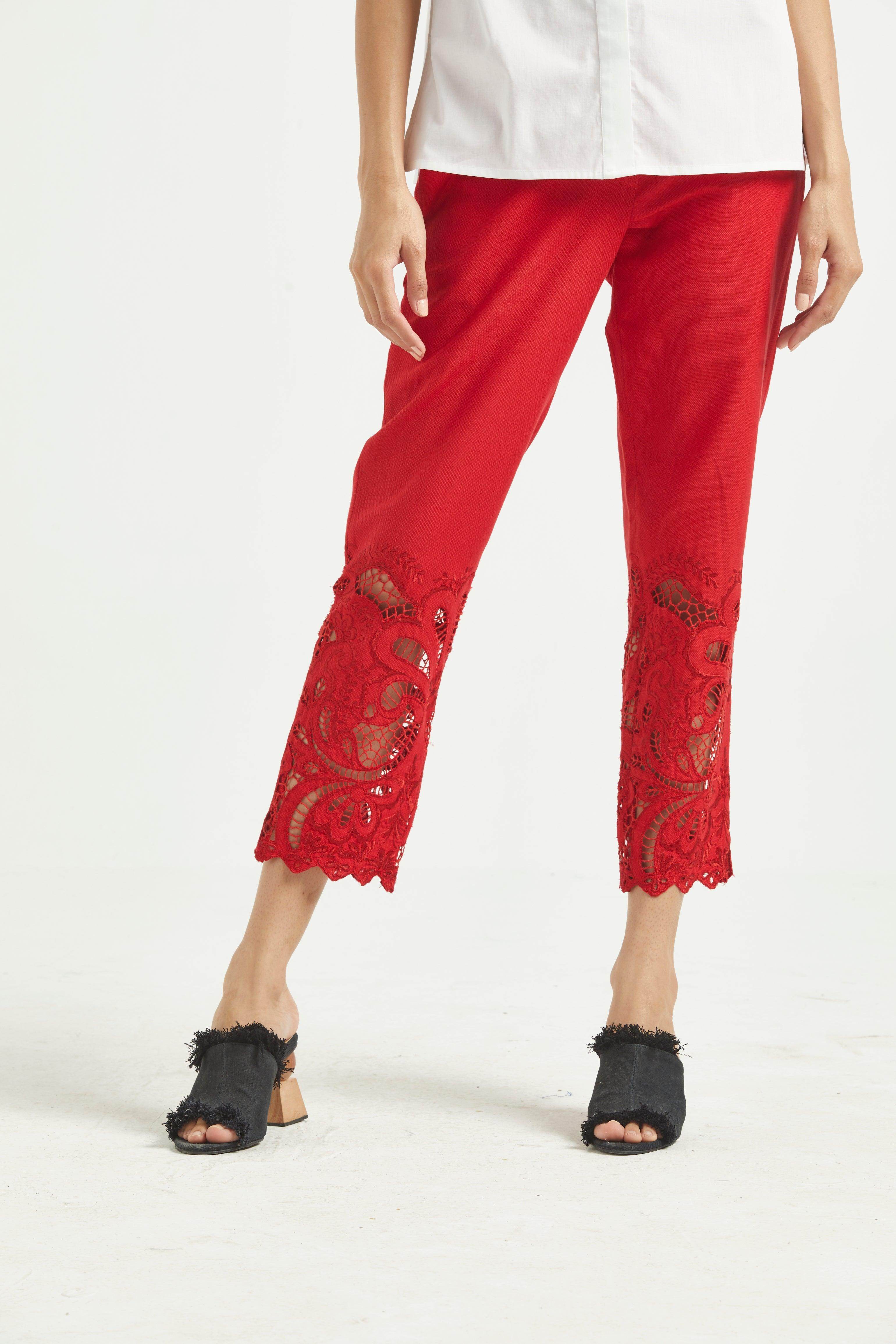 Tapered fit pants. Cutwork embroidery detail below the knee, scalloped hem. Zip fly, hook closure at the front. Pockets on the side. waist?