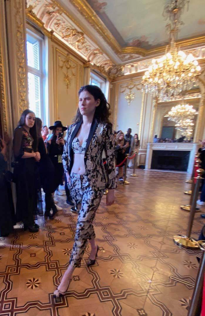 Our signature allover Gara stitch embroidery jacket and tapered fit pants paired with Gara stitch embroidered bralette. The jacket and bralette are fully lined. Metallic gold button closure on the sleeves and front in the jacket.