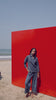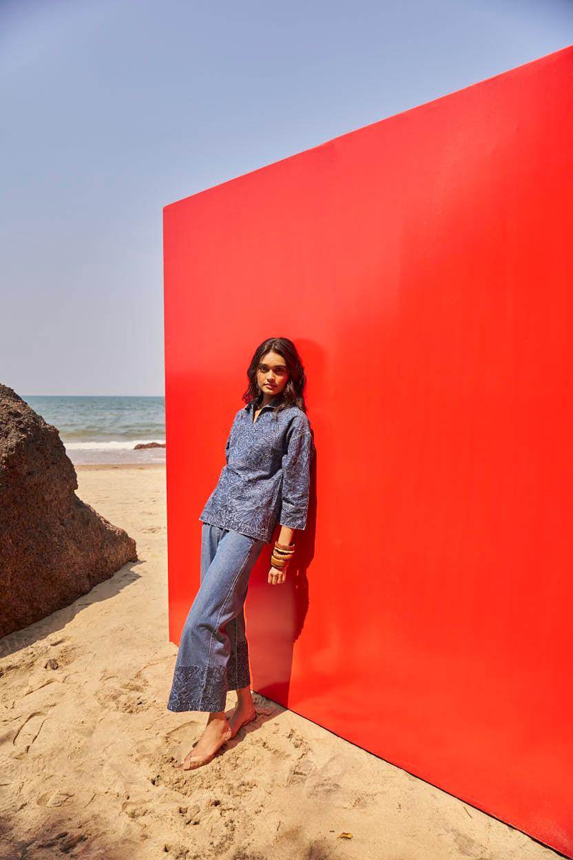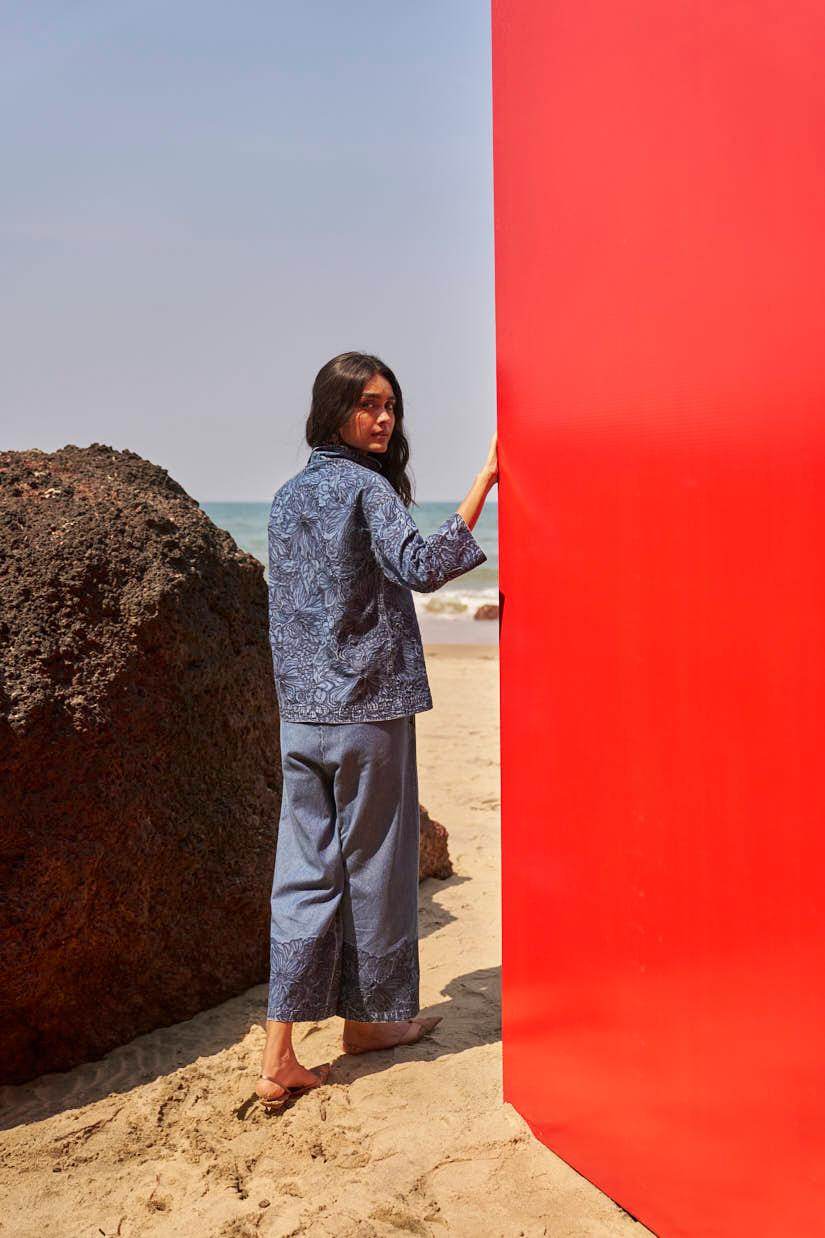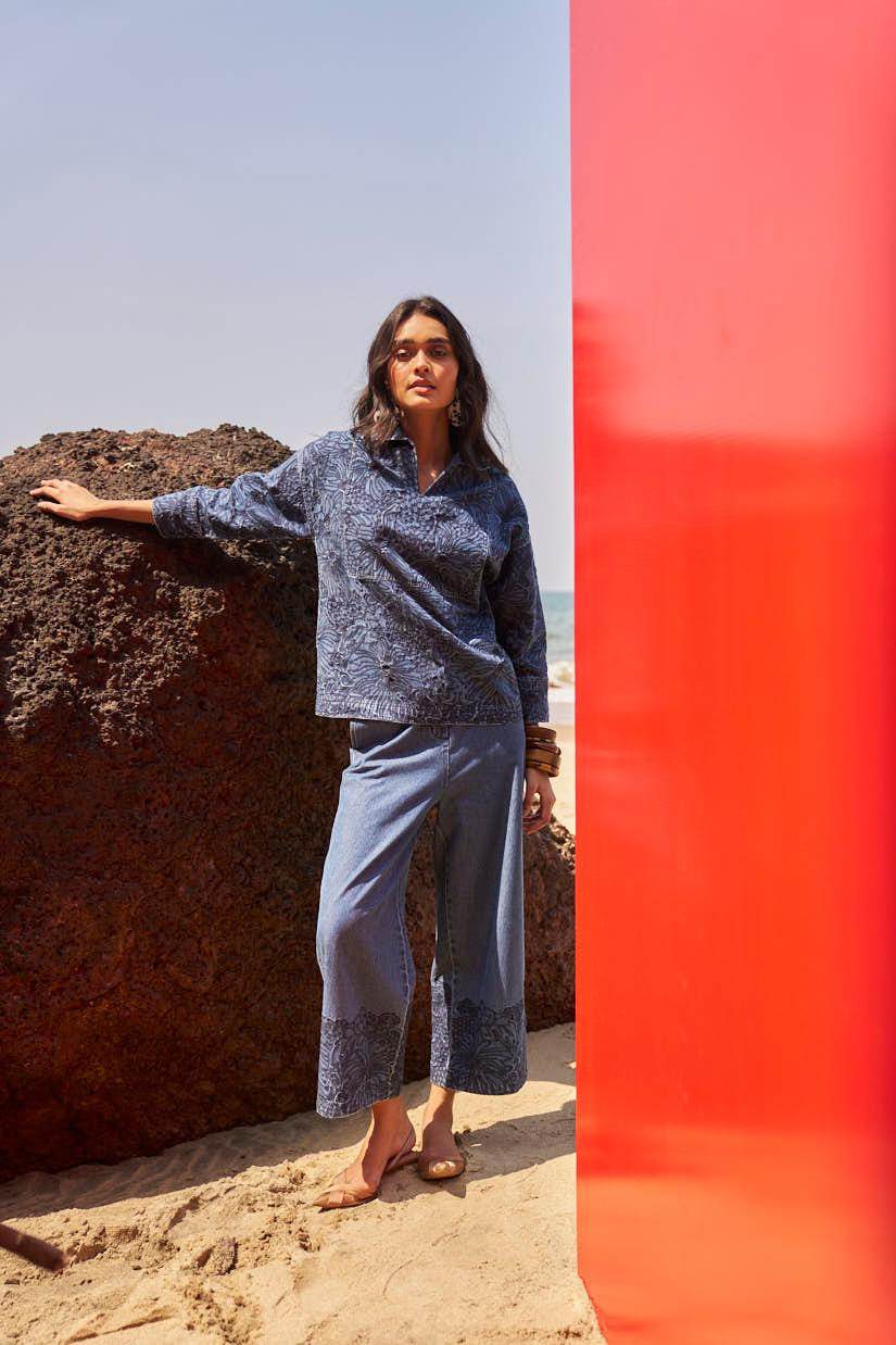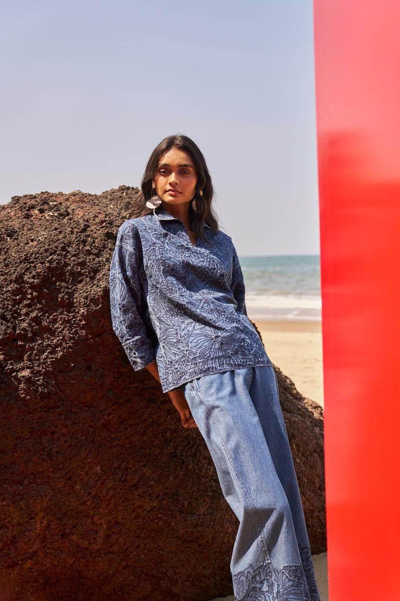 All-over embroidered washed denim popover top. Shirt collar with drop 3/4th sleeves. Bib stitch detail in the front. Paired with washed denim pant with floral embroidery at the hem. Hook/eye and zip closure in the front. Pockets at the sides. Wide legged, relaxed fit.
