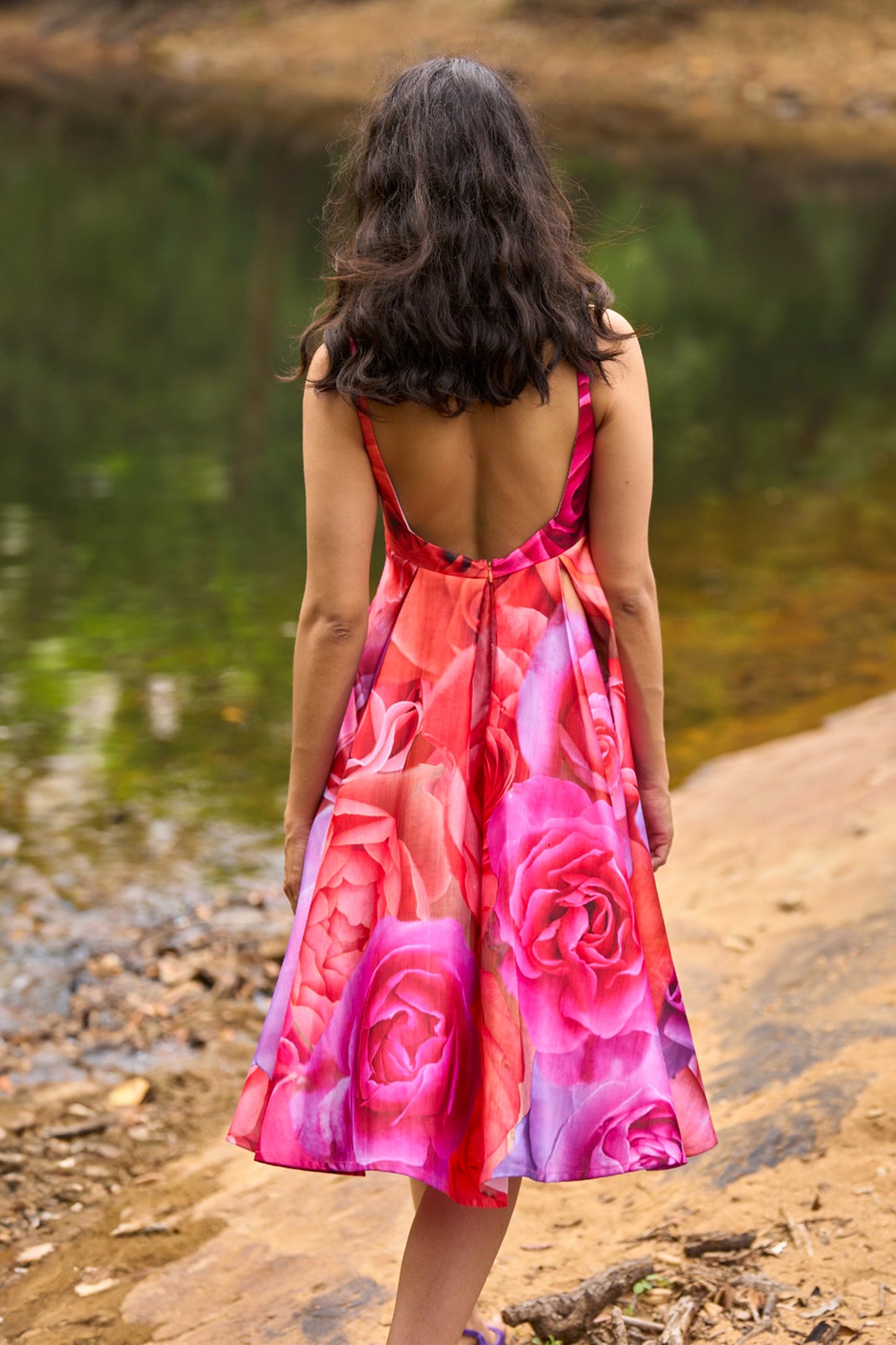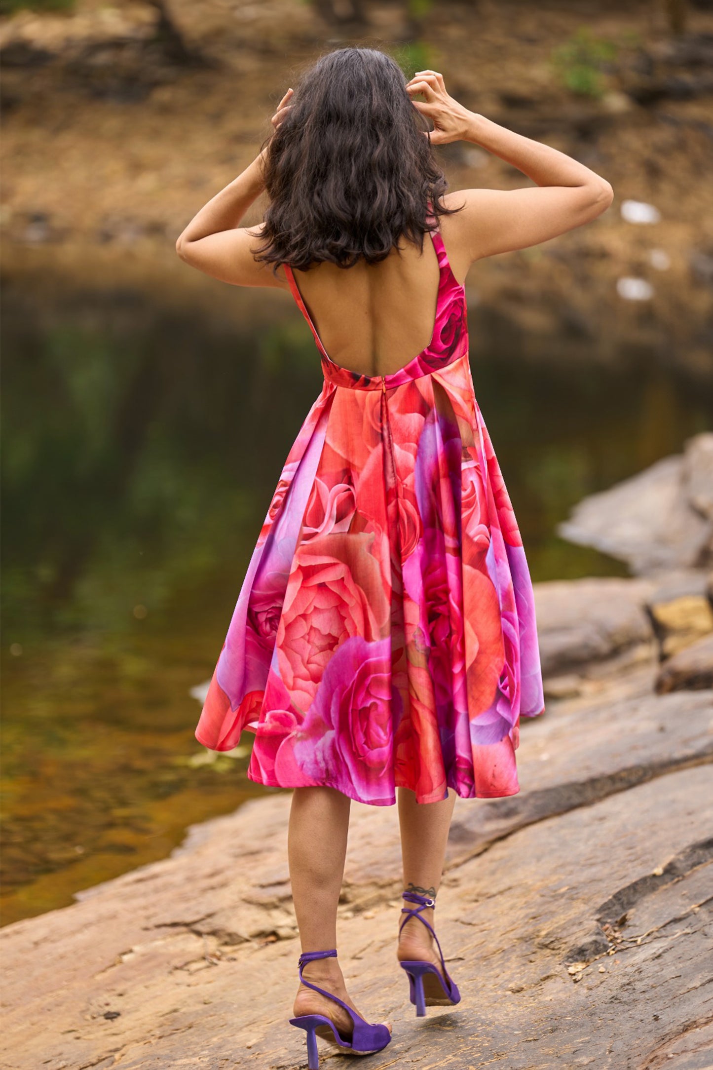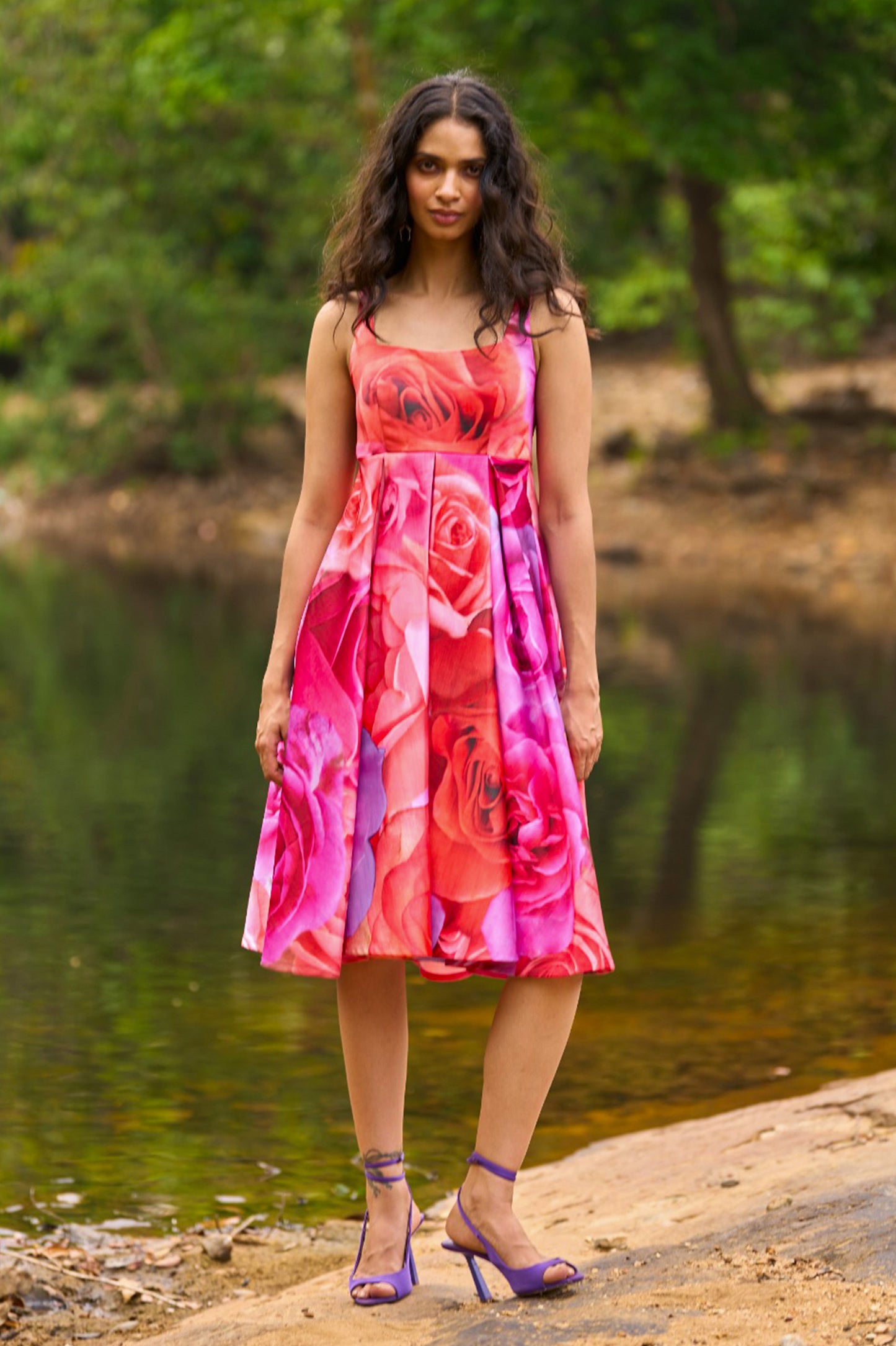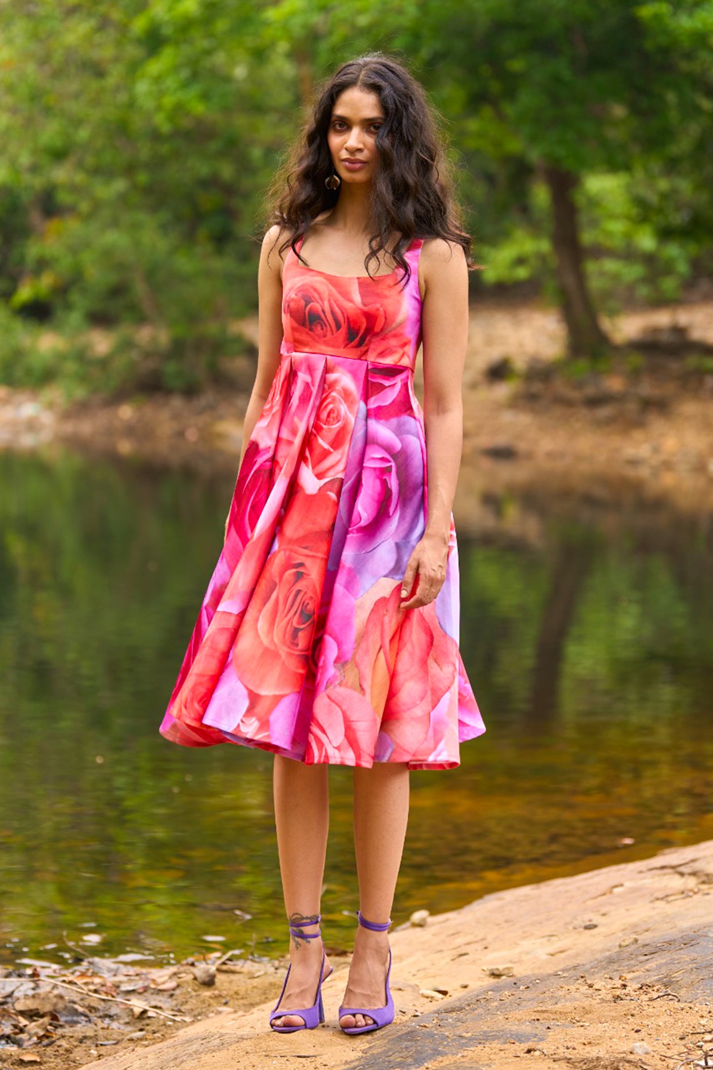 Floral printed fit-and-flare silhouette dress with box pleats and a scoop neckline. Flowing, exaggerated flare toward the hem. Features a back zip closure. The top is lined. Pockets in the sides.