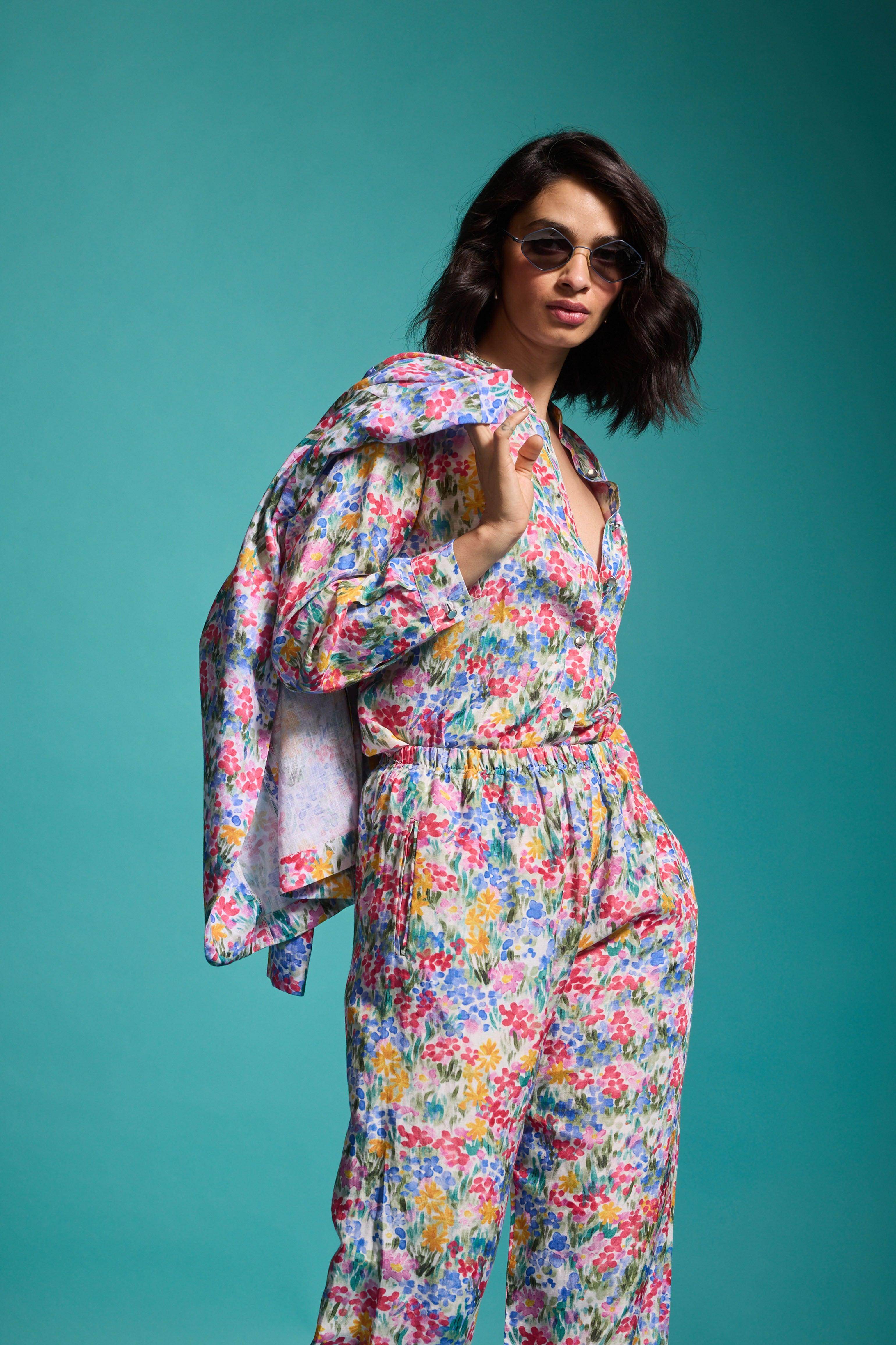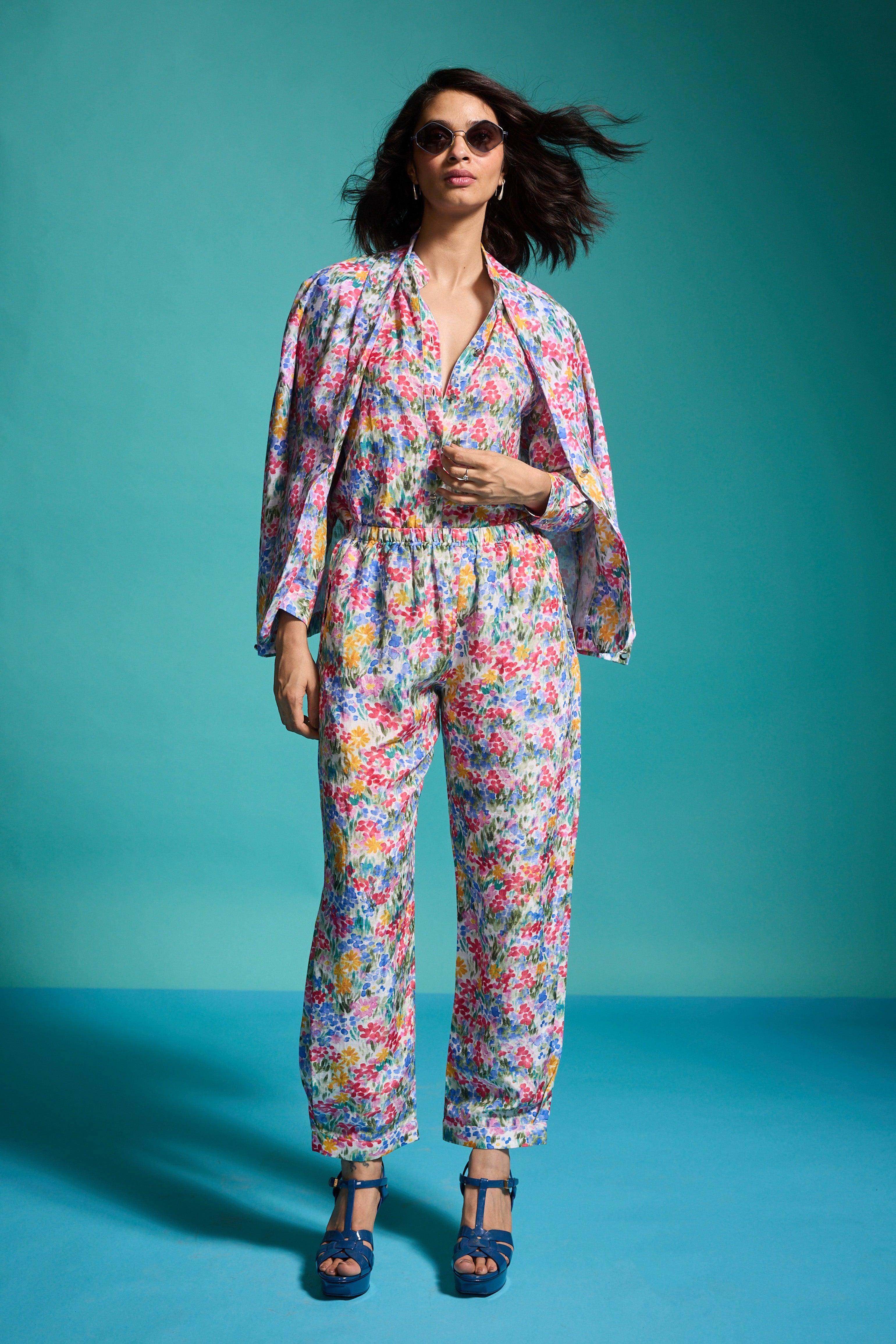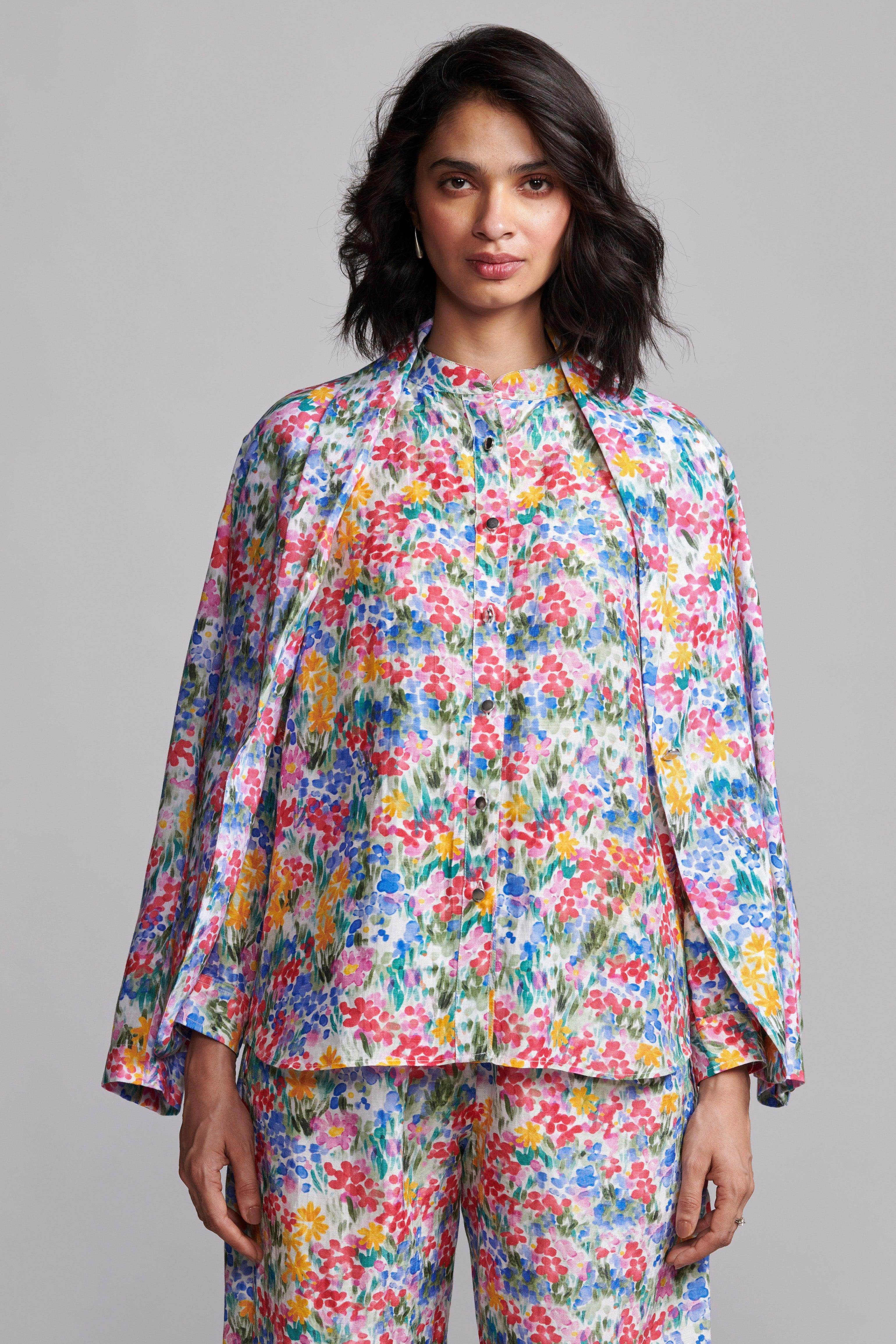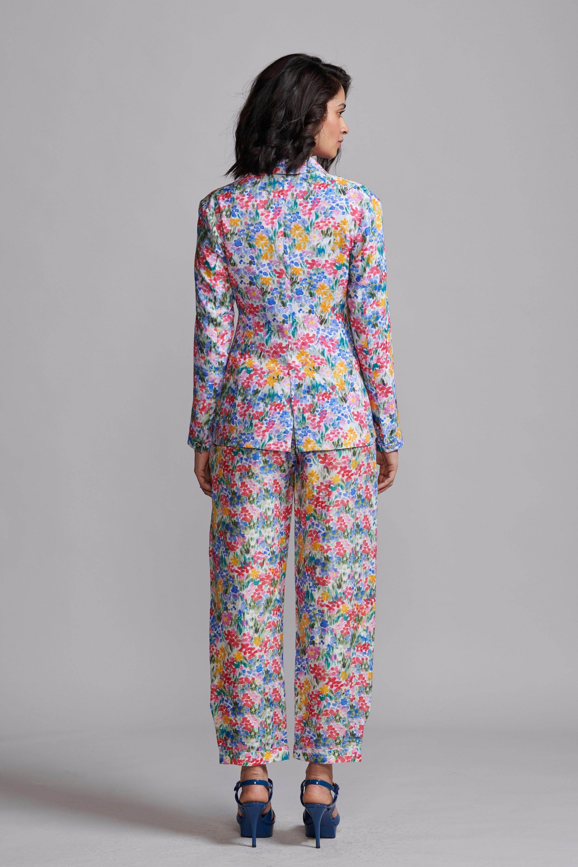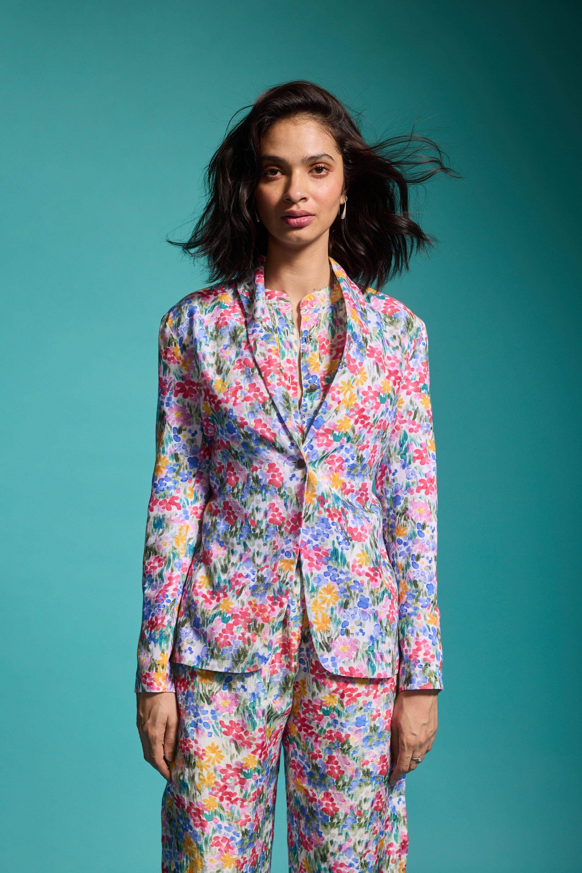 Hand-painted multicolour floral print blazer in a breathable natural linen blend. Features a shawl collar and single metallic button closure at the front and cuffs. Unstructured and unlined.