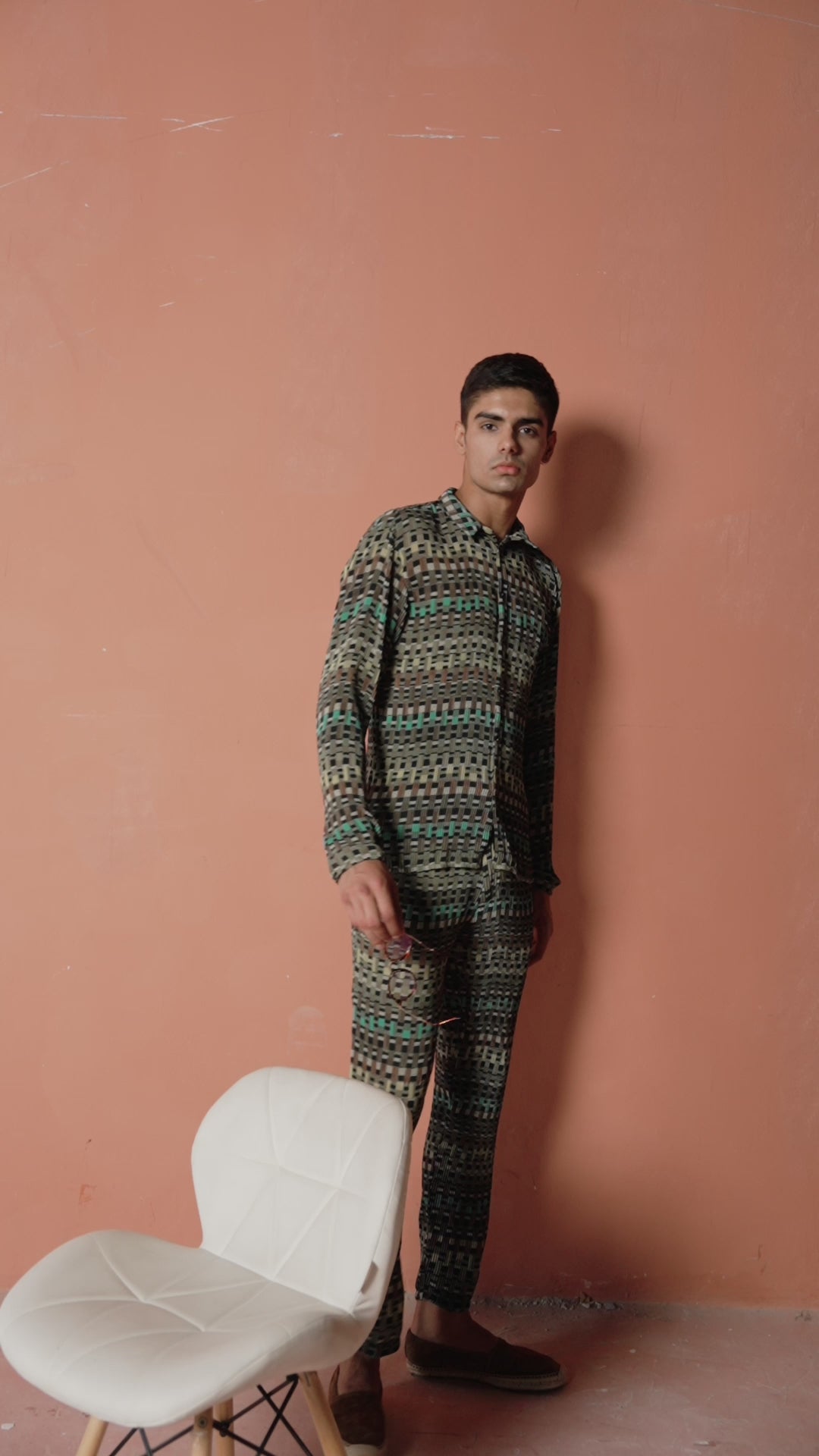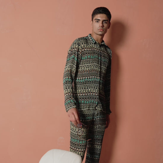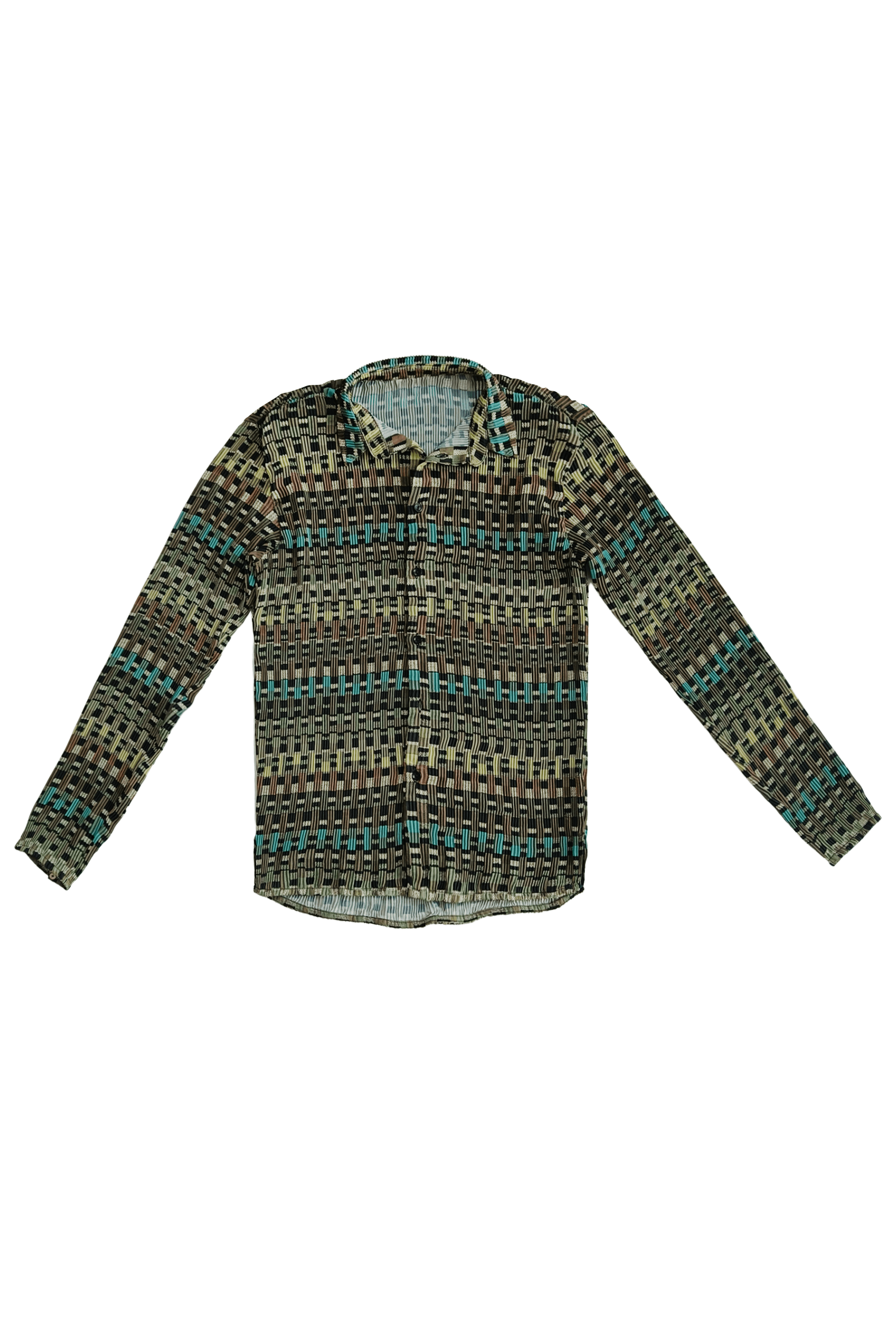 Multi-color geometric print shirt. Button down front and full sleeves. Relaxed fit.