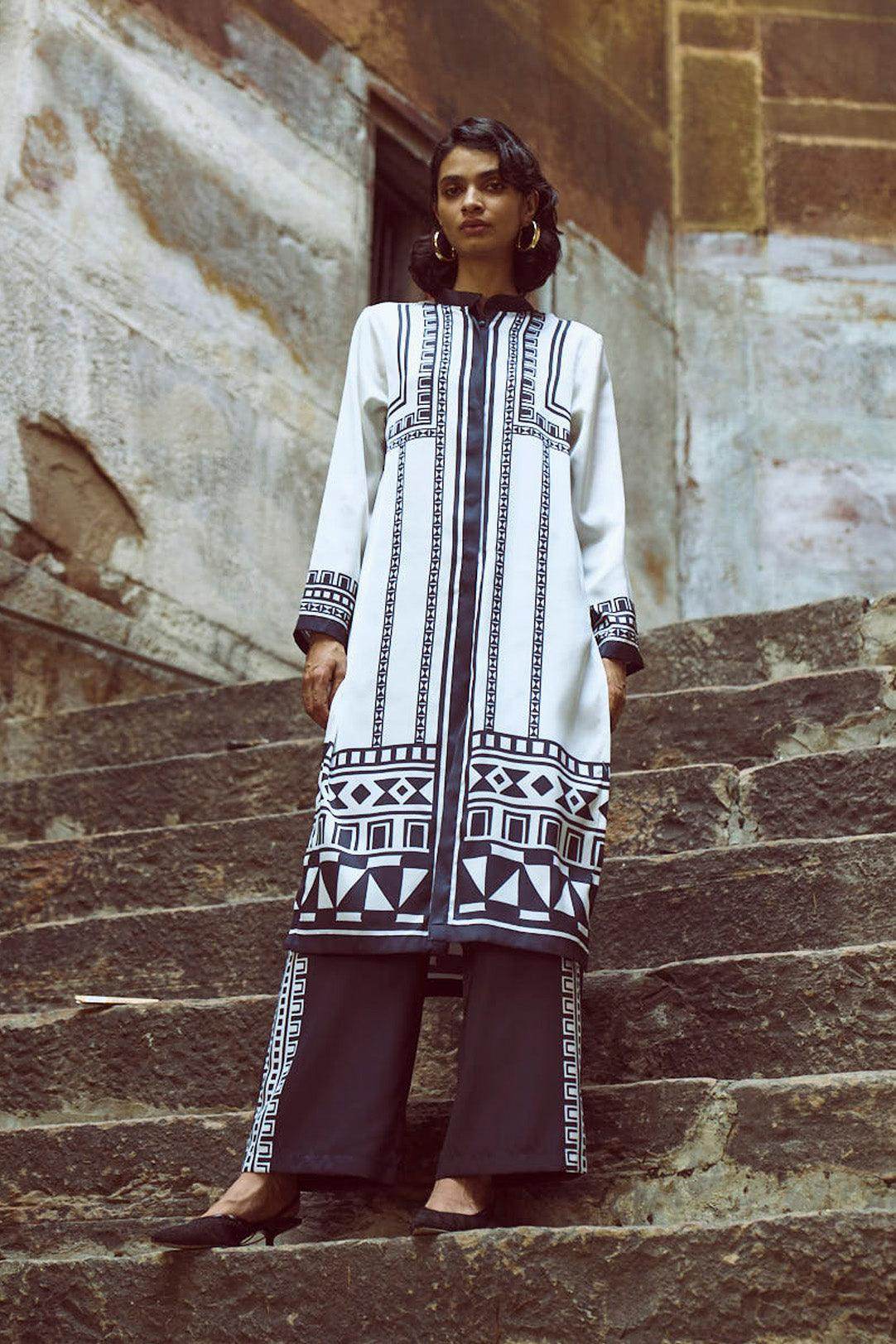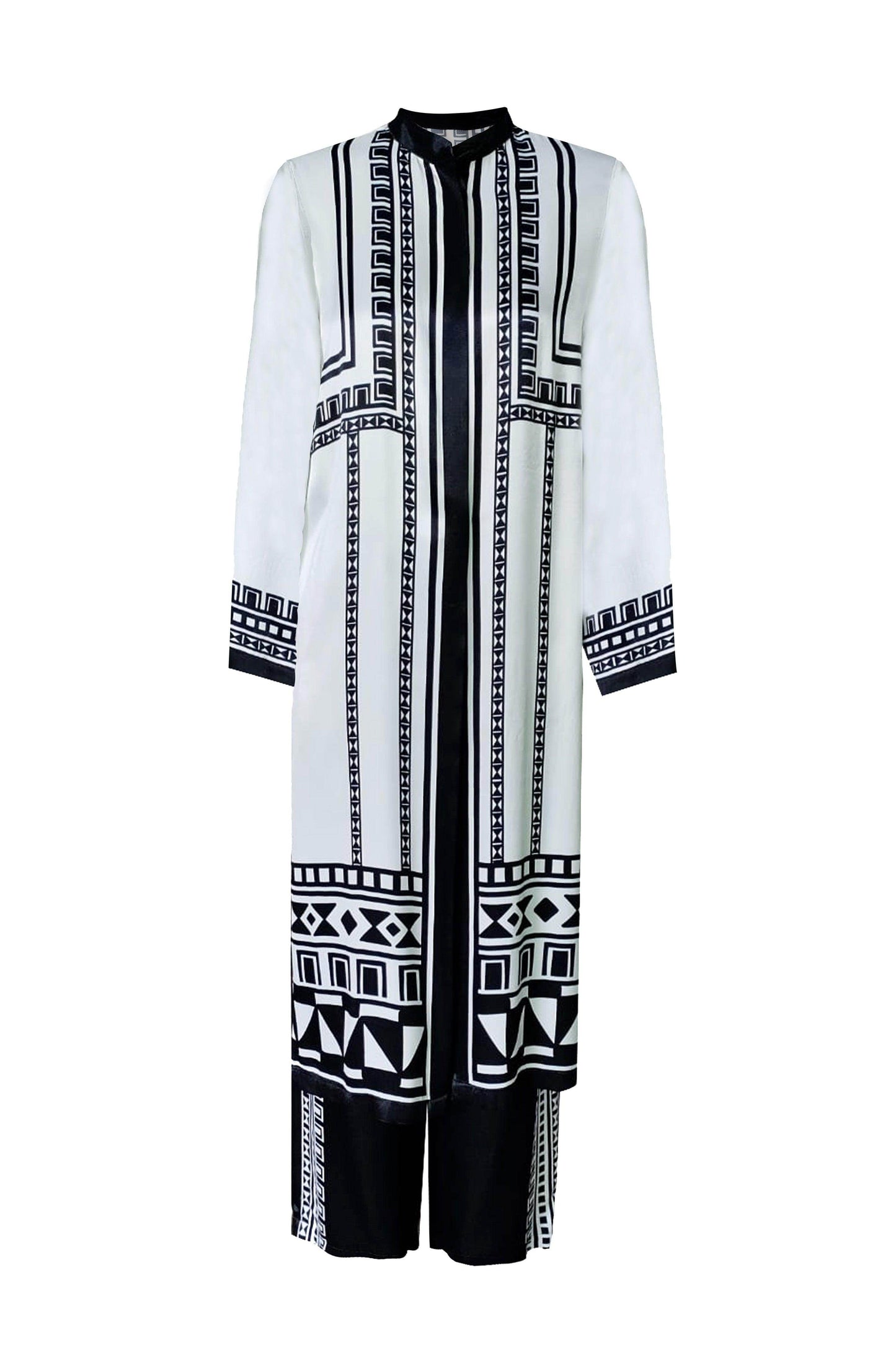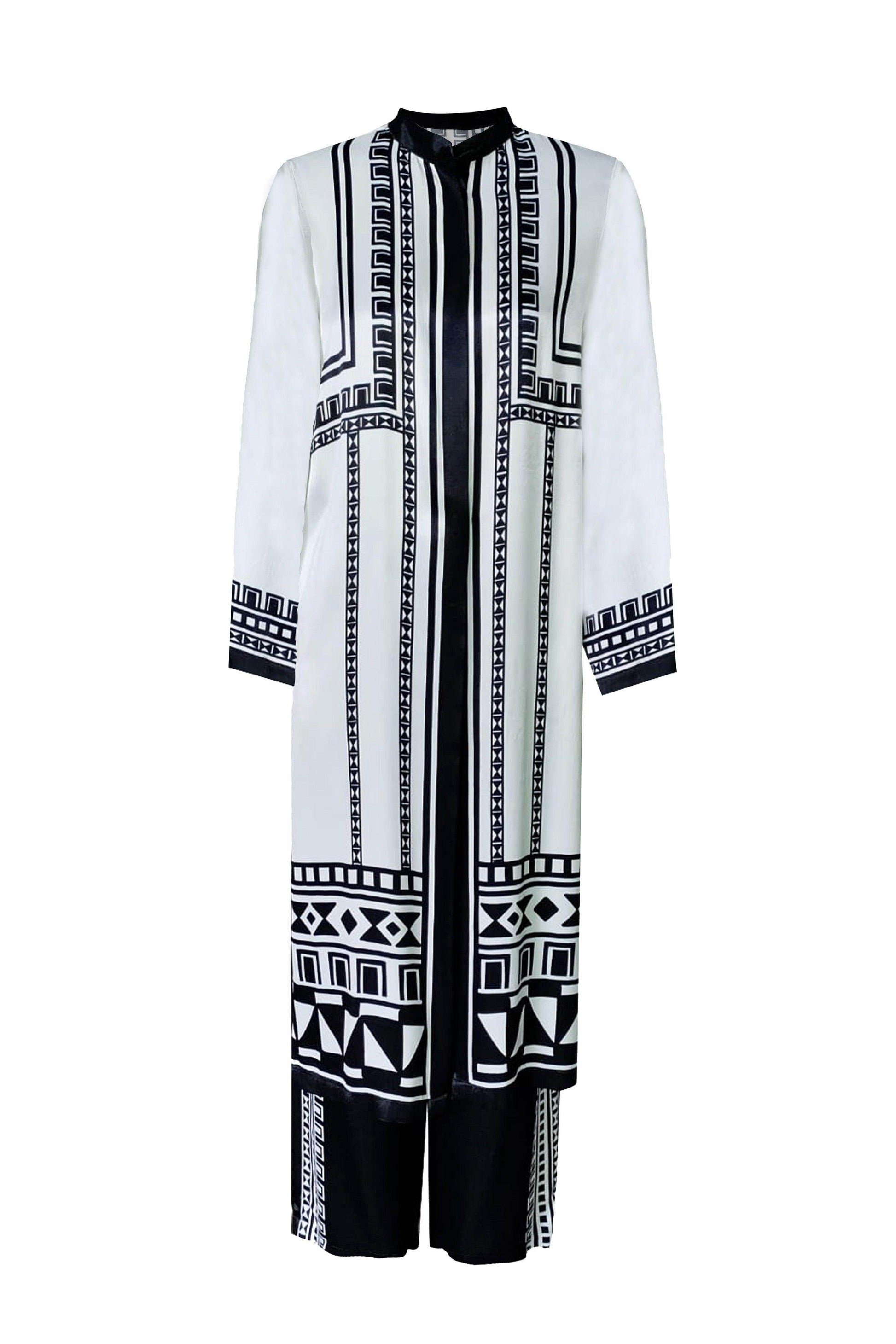 Band collar longline graphic printed top. Black tribal motifs pattern placed on a white base. Band collar, concealed placket. Long sleeves. Slits on the side. Paired with a contrasting black pants with white tribal motifs down the side seam. The pant is semi elasticated with a zip and hook closure in the front. Pockets in the side.