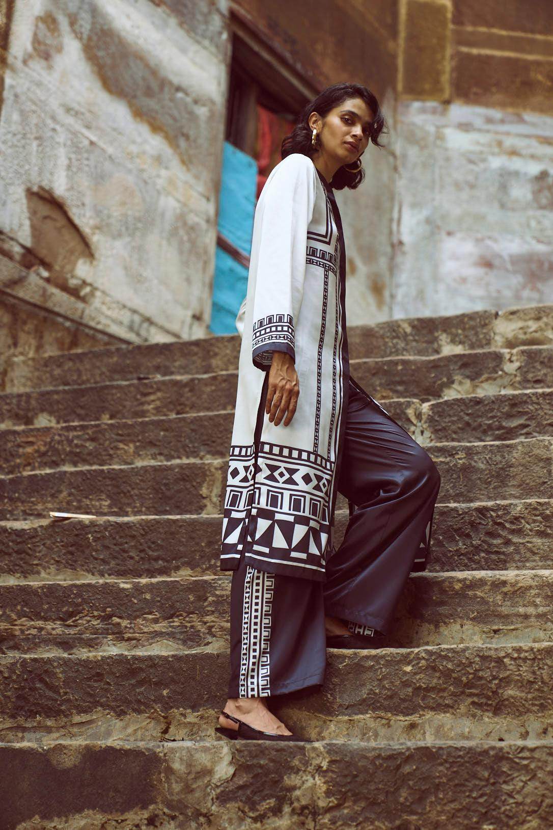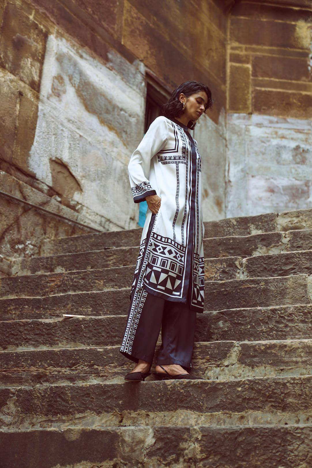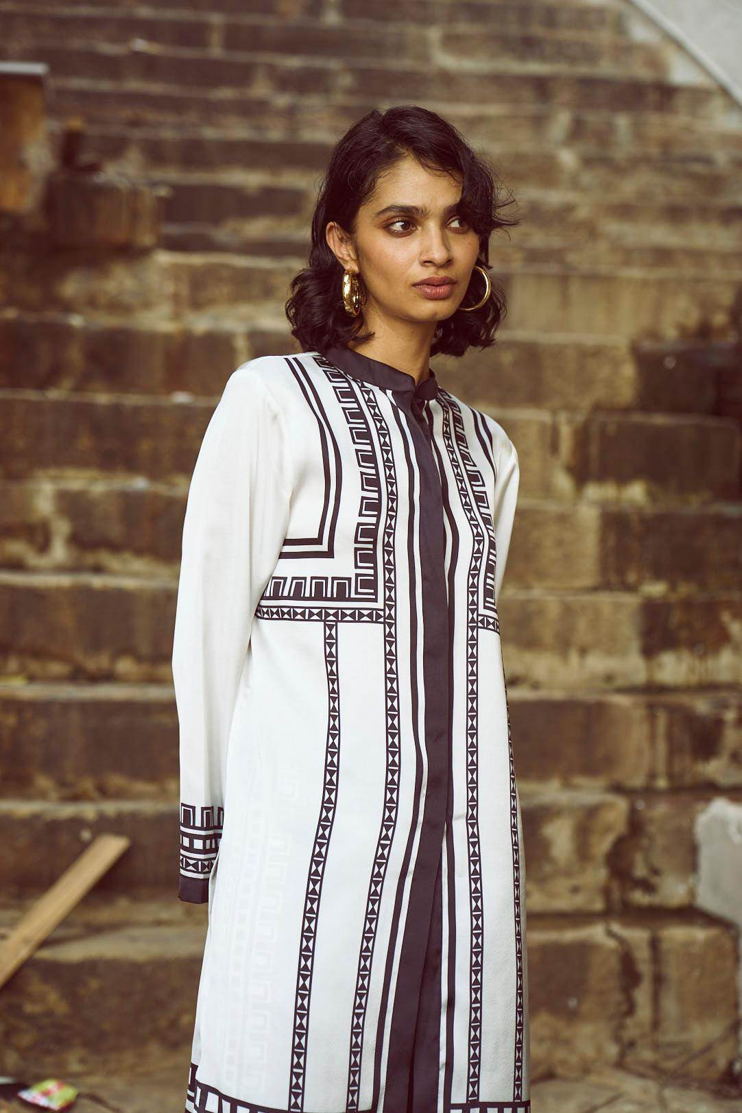 Band collar longline graphic printed top. Black tribal motifs pattern placed on a white base. Band collar, concealed placket. Long sleeves. Slits on the side.