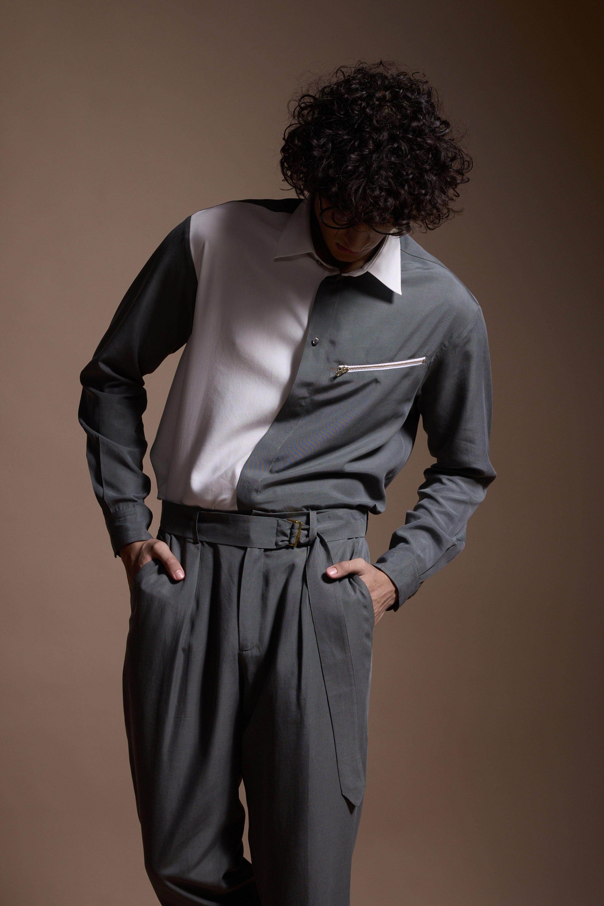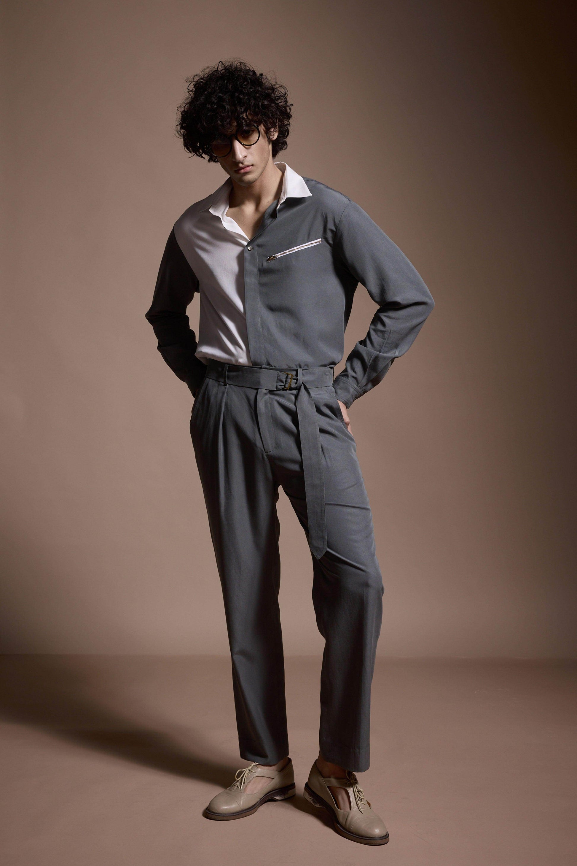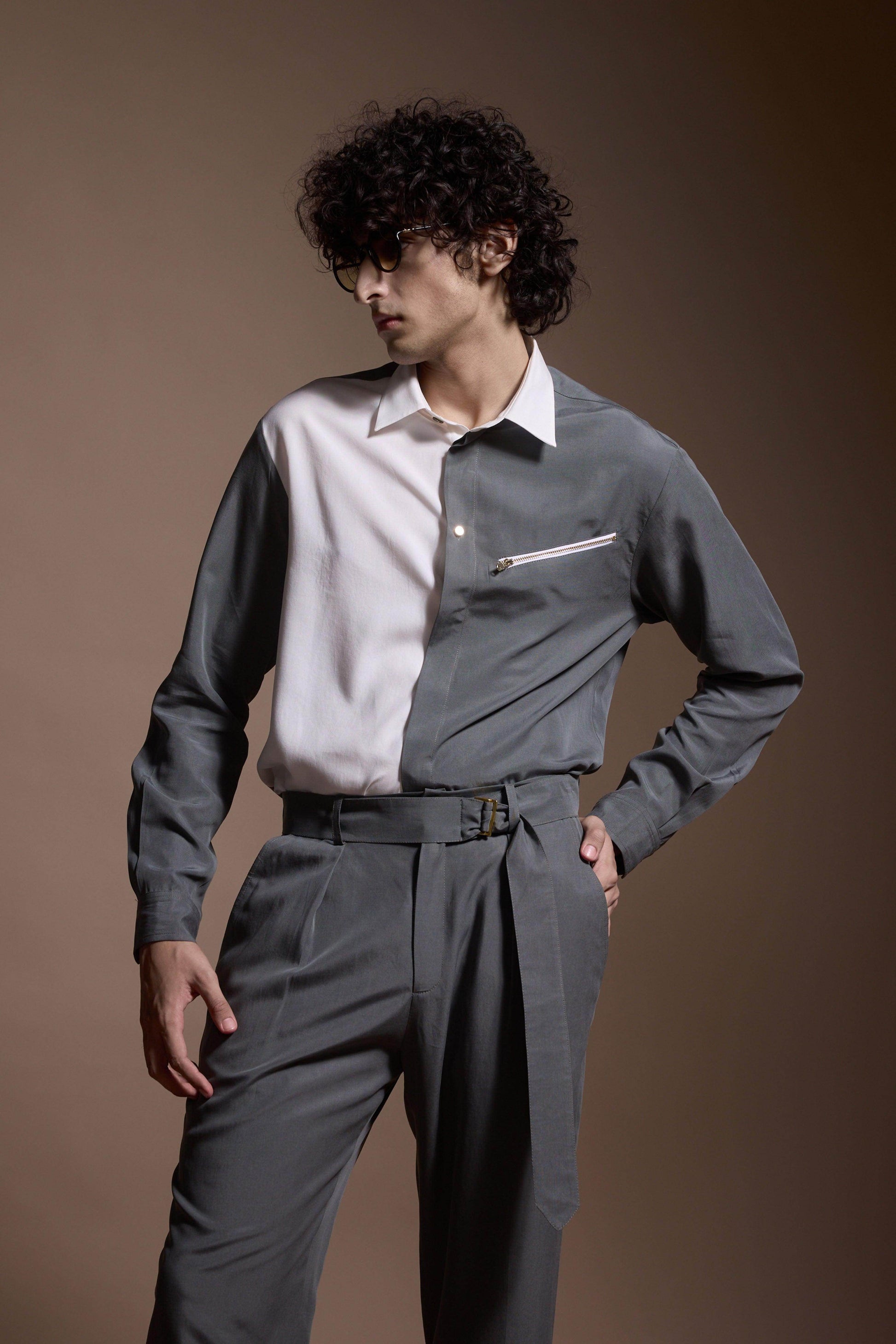 Grey and white colour blocked shirt. Single gold button and zip detail on the front. Full sleeve, concealed placket and shirt collar. High-low hem, side seam slits, and a concealed pocket with a golden zipper detail. Soft pleating detail on the back yoke to add shape. Paired with a grey straight pant.Semi elasticated at the waist with a golden snap button and zip closure in the front. Pockets in the sides and faux pockets in the back. Exaggerated belt loops. Comes with a self fabric belt with an adjustable gold buckle.