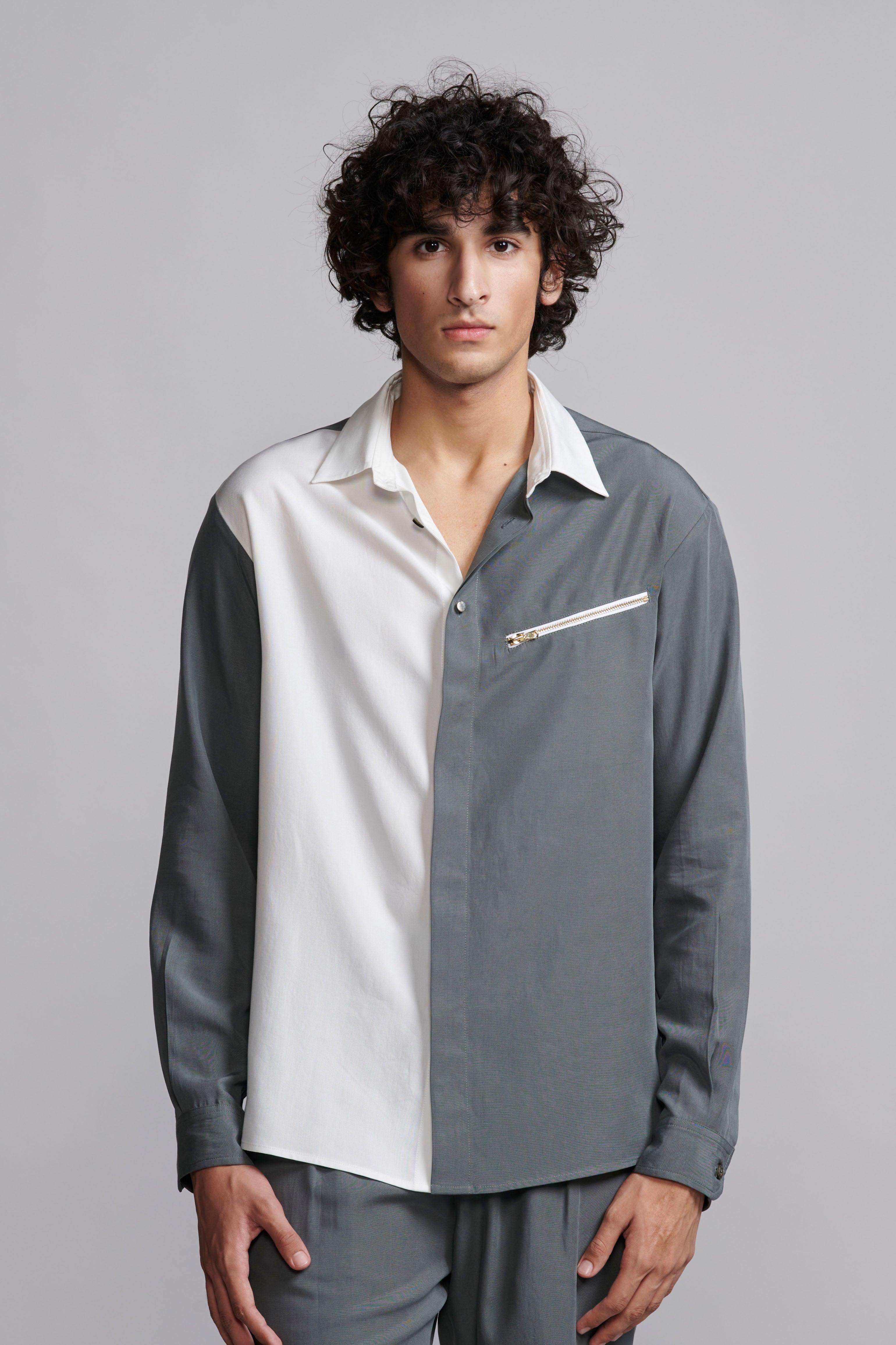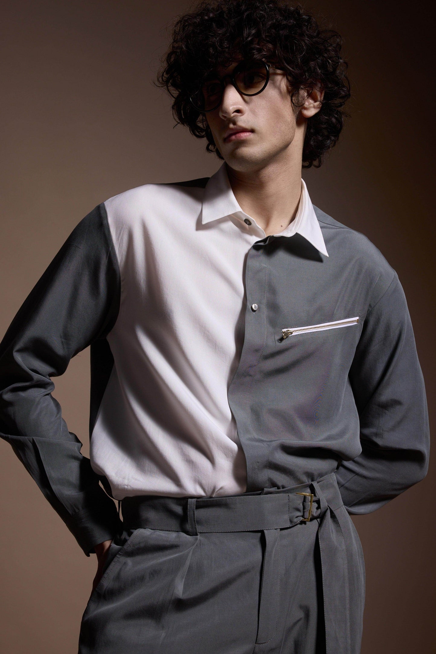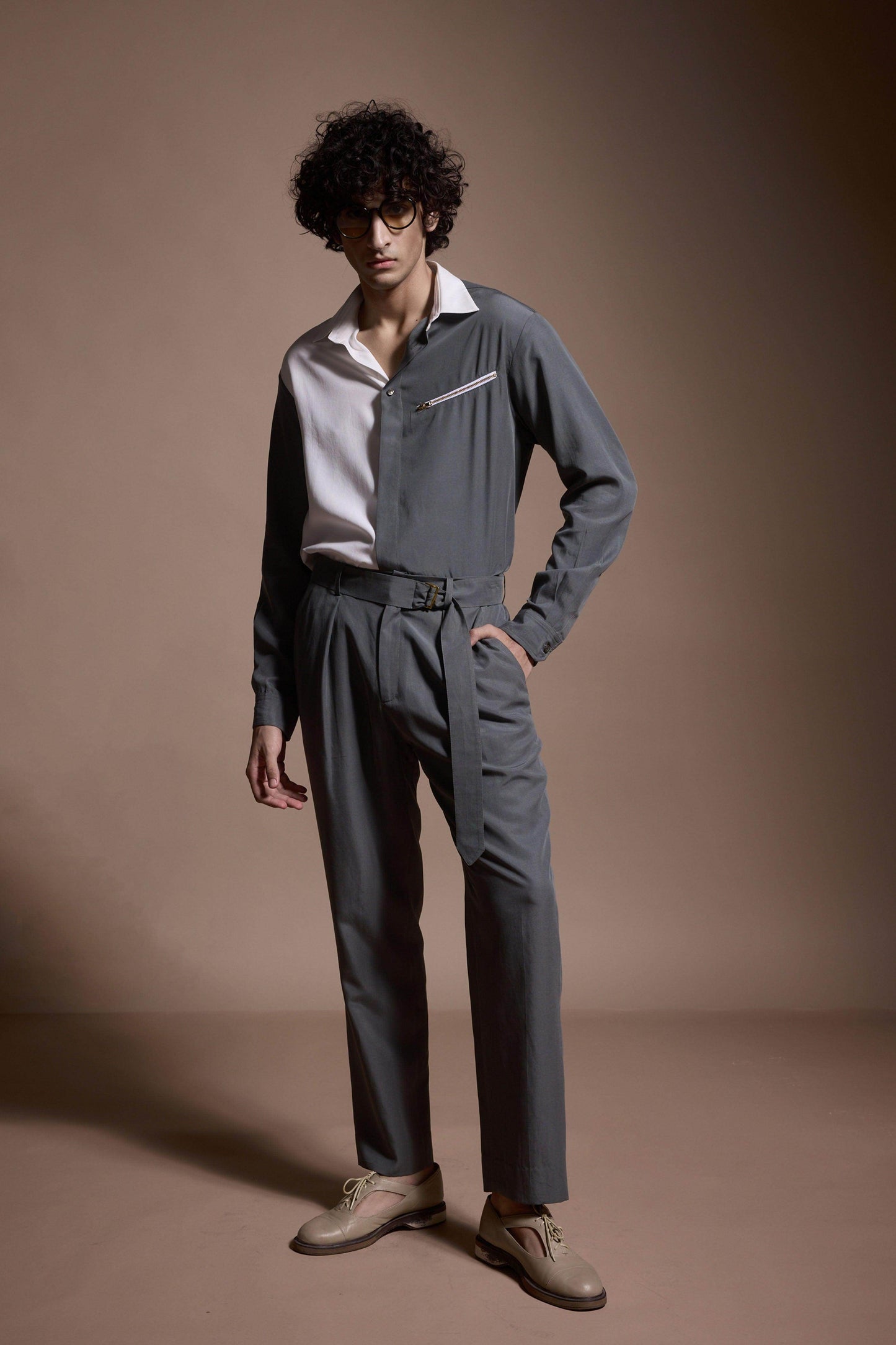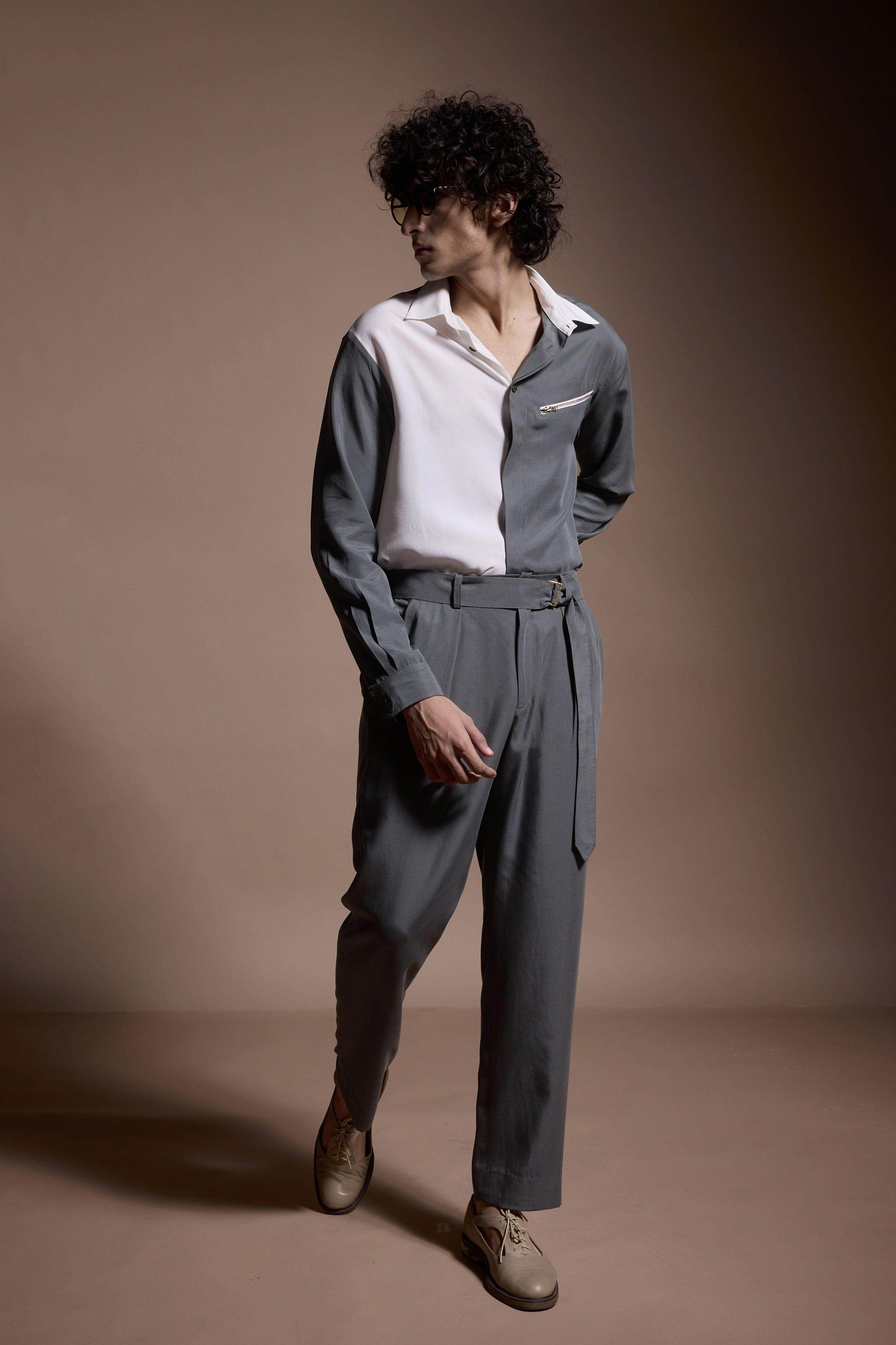 Grey and white colour blocked shirt. Single gold button and zip detail on the front. Full sleeve, concealed placket and shirt collar. High-low hem, side seam slits, and a concealed pocket with a golden zipper detail. Soft pleating detail on the back yoke to add shape. Paired with a grey straight pant.Semi elasticated at the waist with a golden snap button and zip closure in the front. Pockets in the sides and faux pockets in the back. Exaggerated belt loops. Comes with a self fabric belt with an adjustable gold buckle.