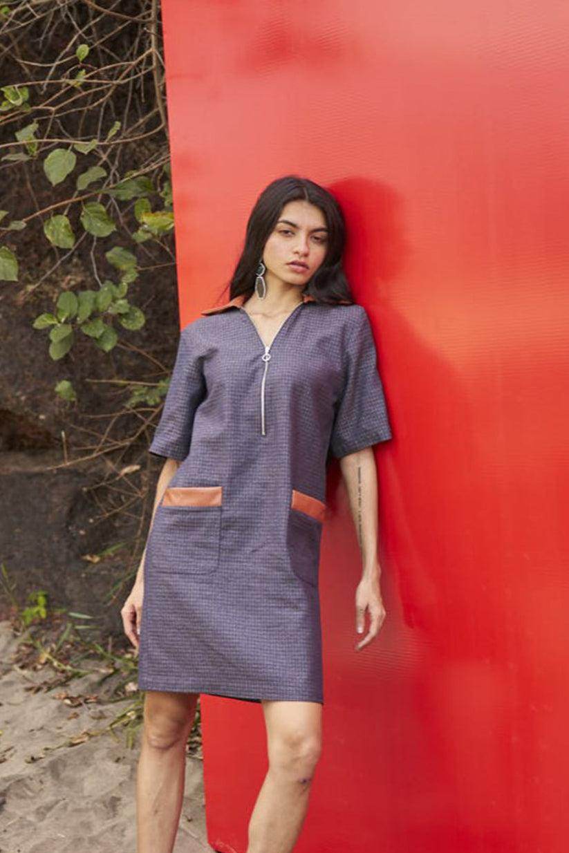 Indigo textured weave popover mini dress with brown leather collar and pocket detailing. Patch pockets and zip placket in the front.