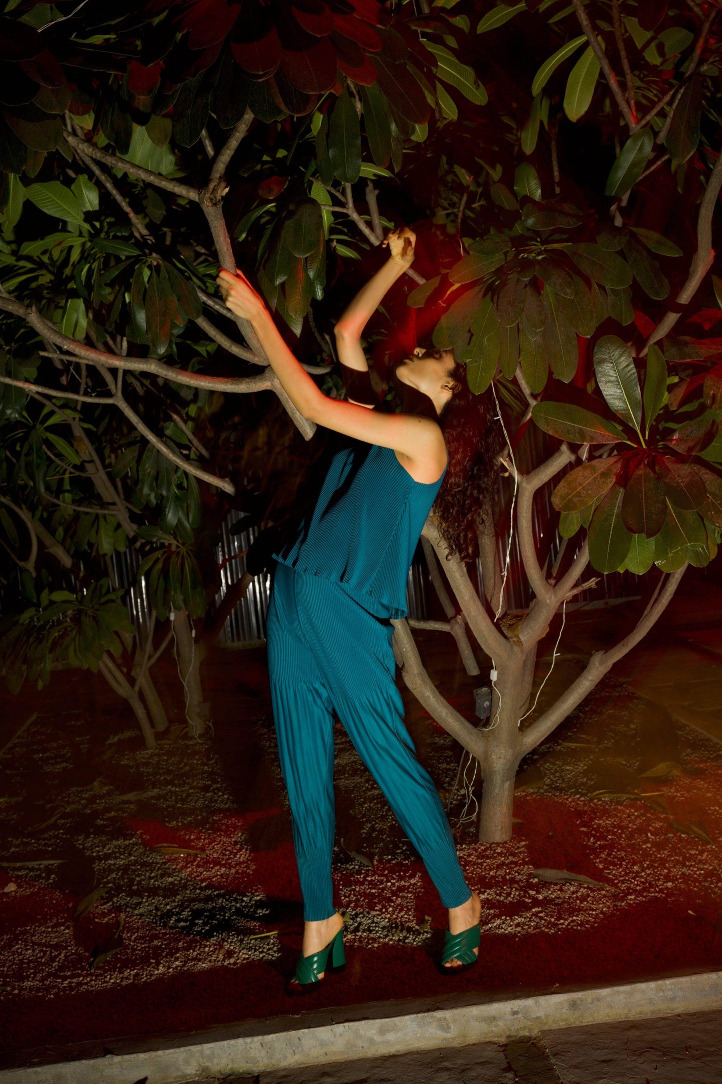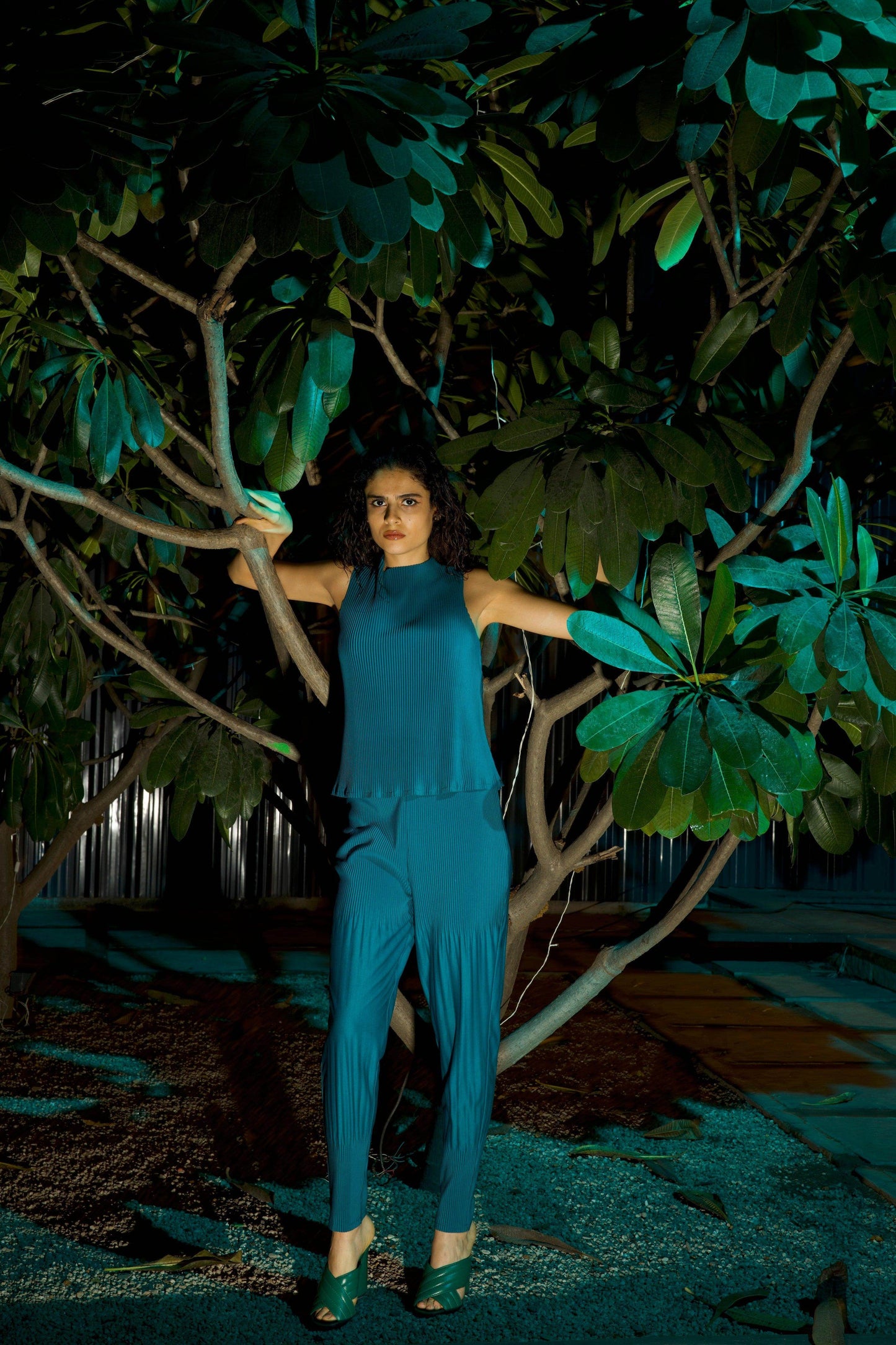 Irregular sunray pleated drum pants. Elasticated waist, raw-edge hem.