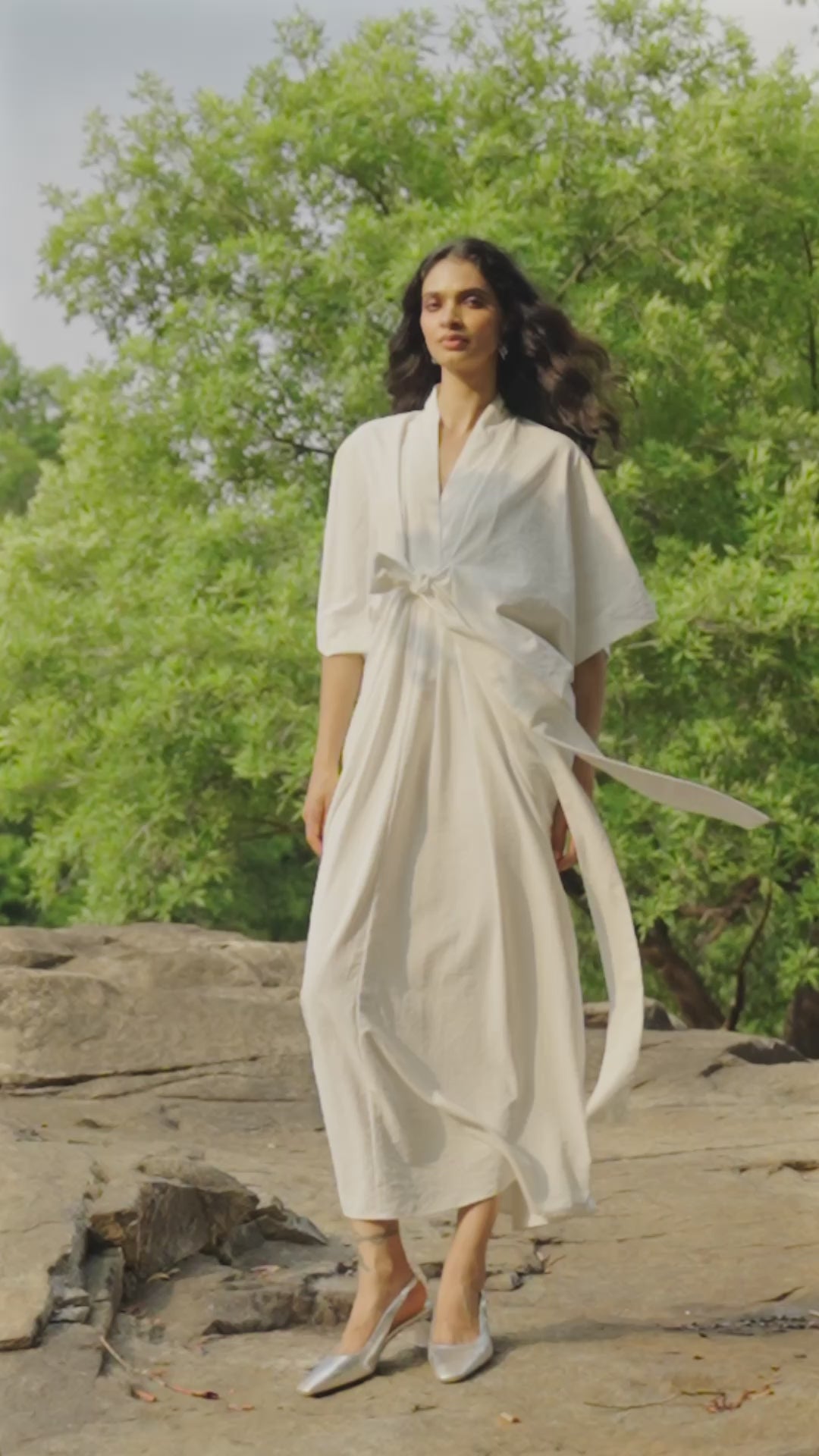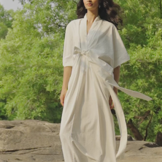 Ivory kaftan dress with a V-neckline and fluid, drop shoulder sleeves. Tie knot detail at the front. Hand applied pleats in the front and back add a flattering shape as the dress tapers toward the hem.