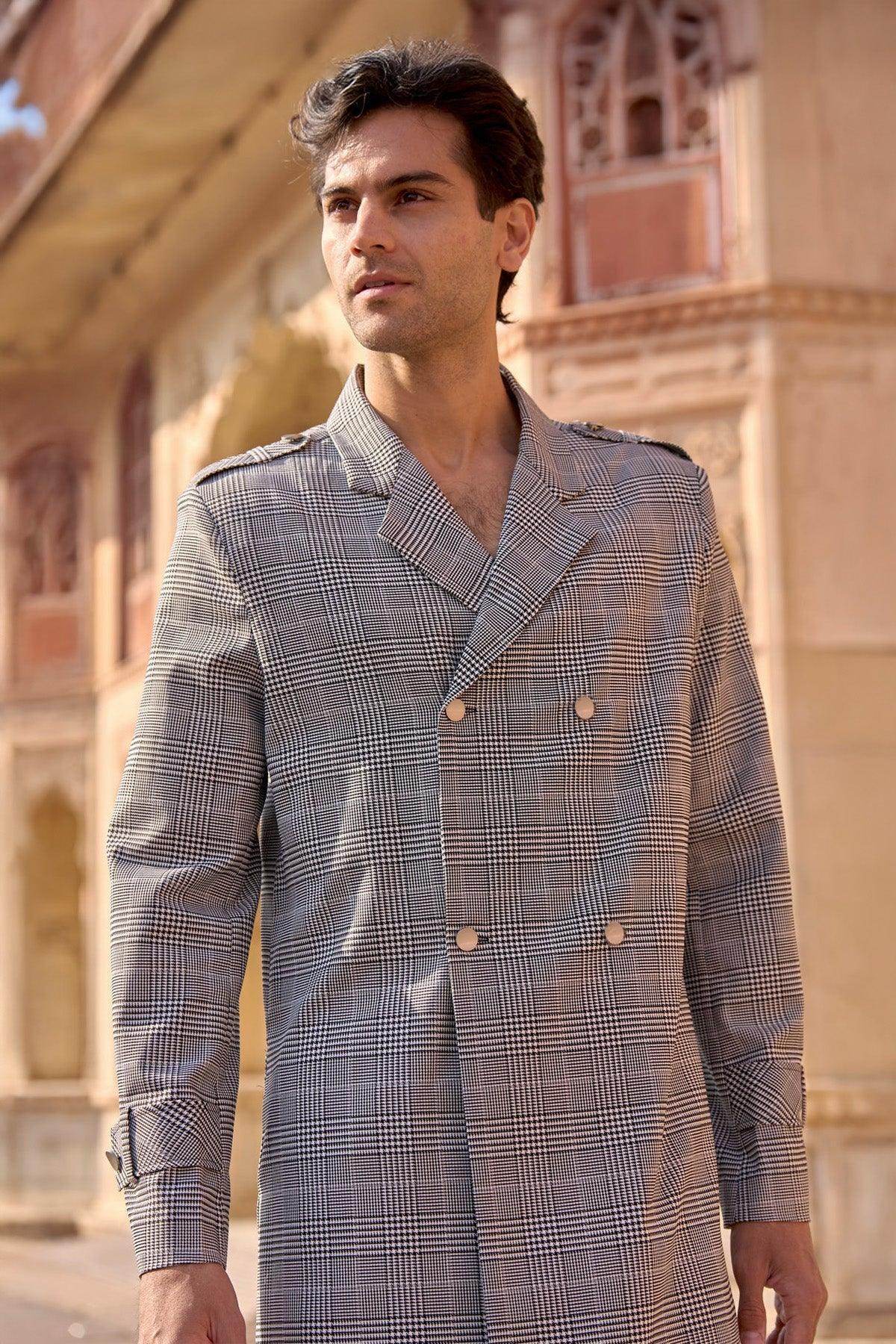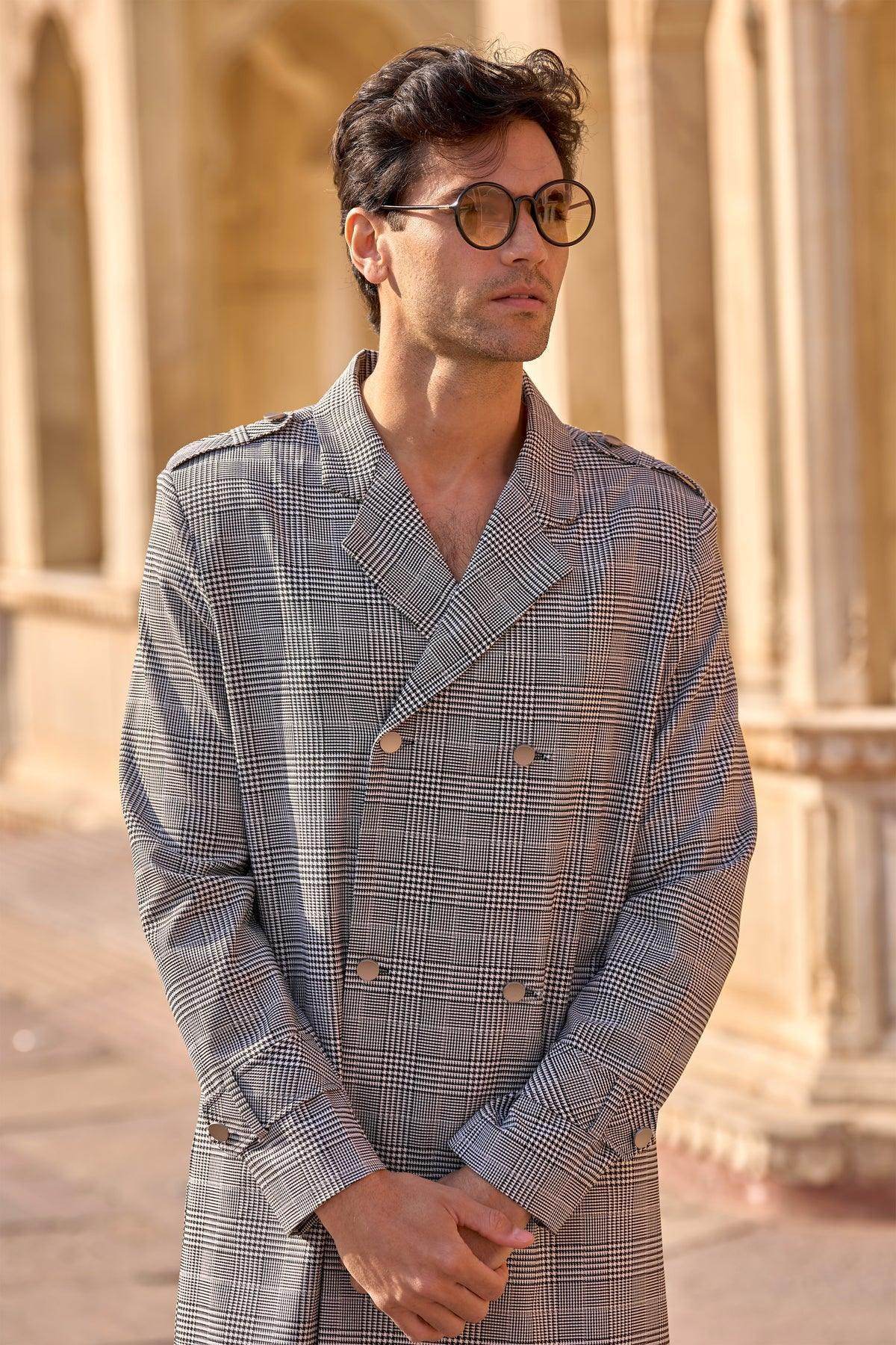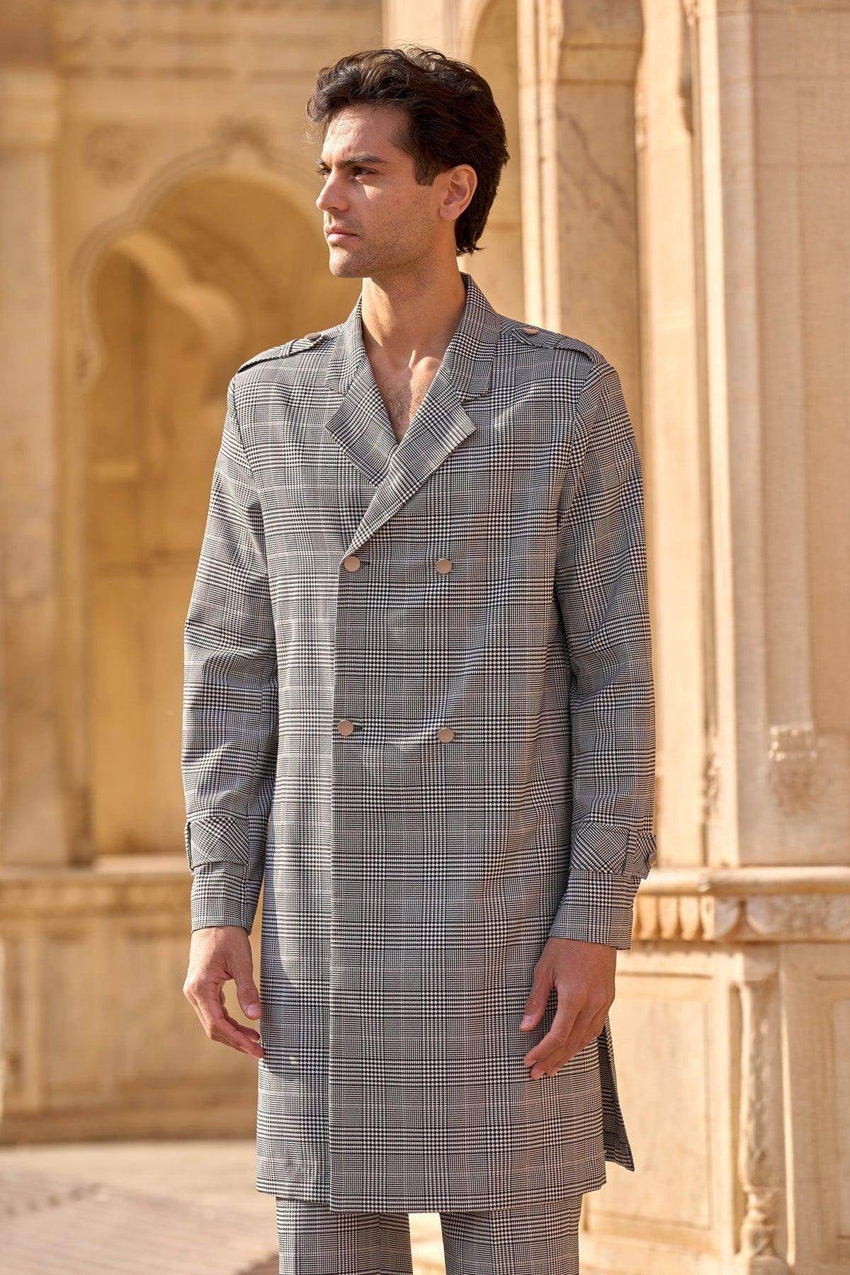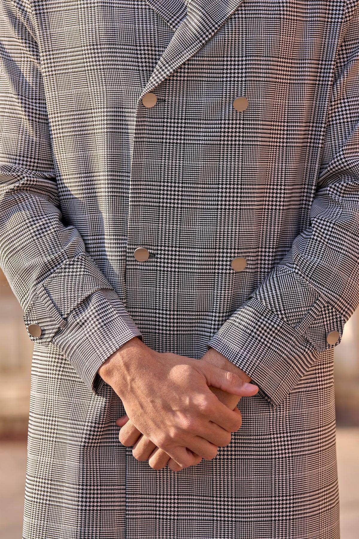 Grey, black and white houndstooth check patterned all weather suiting material. Cross between a shirt and a trench coat. Double breasted button front with a notch collar. Epaulettes on the shoulders and sleeve cuffs. Can be worn as a long shirt or outerwear. Vent in the back.Paired with matching straight fit trouser. Flat-front waist with hook and eye for closure. Belt loops at waist, pockets in the side and back.