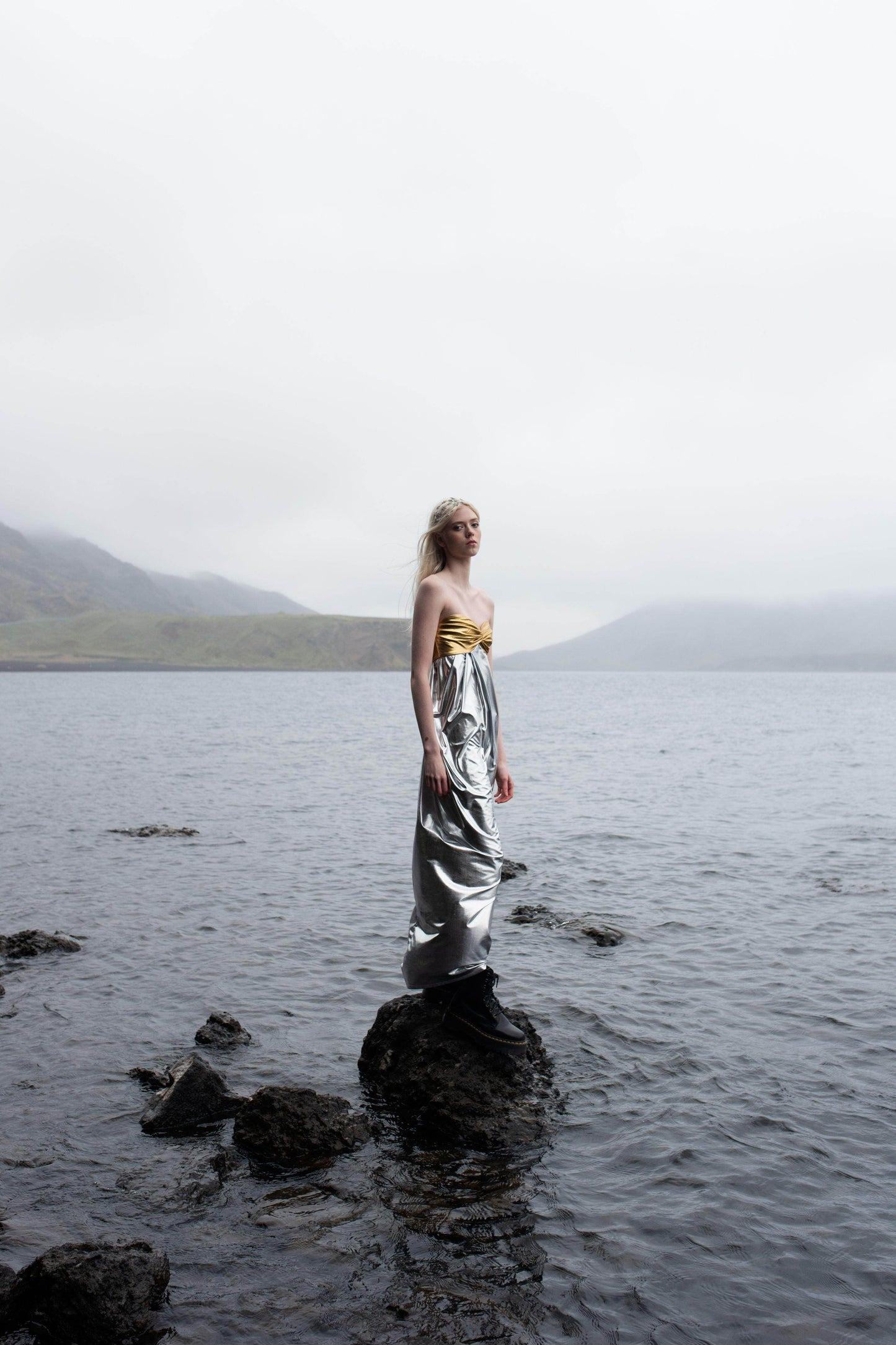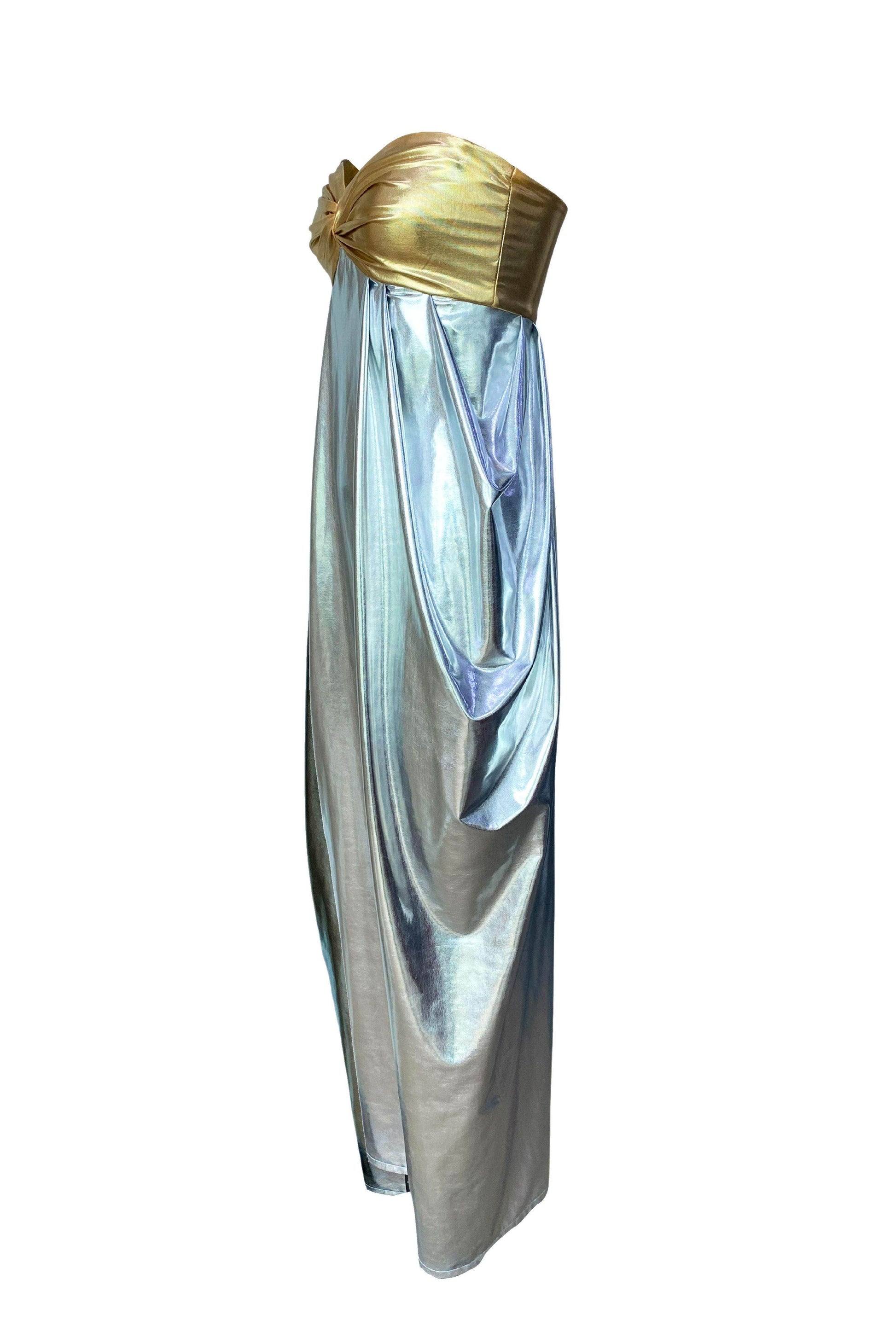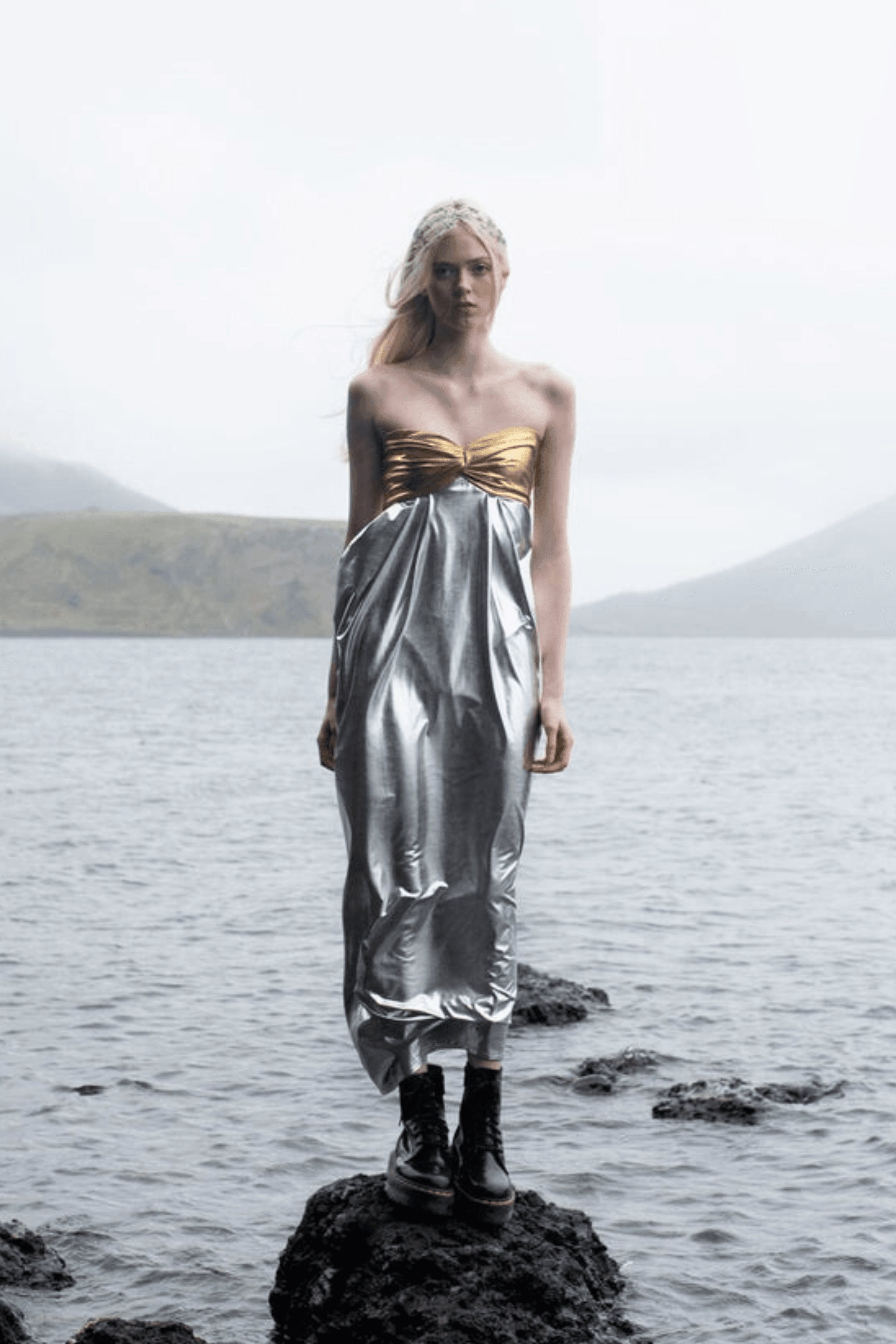 Gold and silver all over foil printed dress. Knot detail on the top, architectural pleat drape detail at the high waist to add shape. Zip closure at the back.