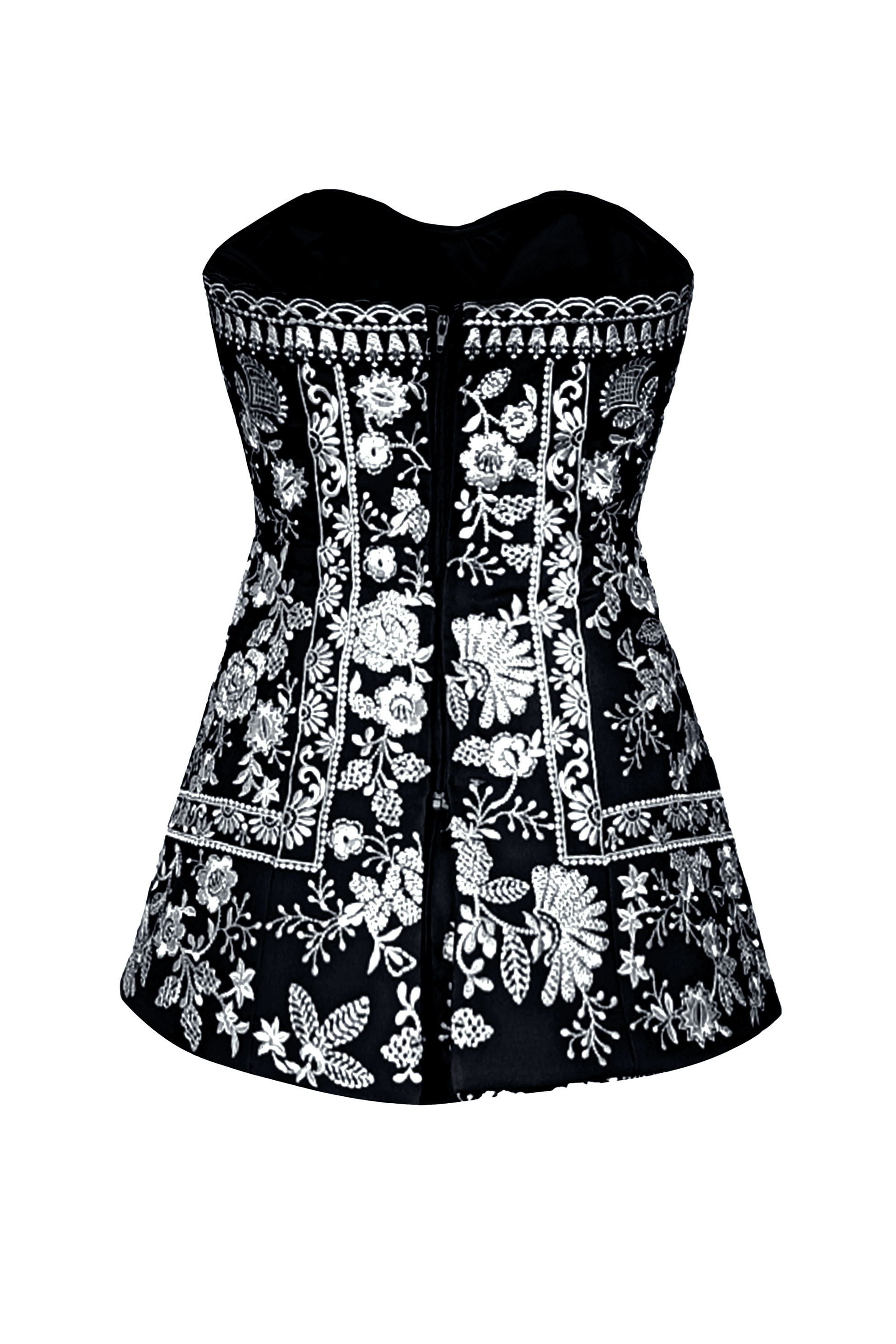 Black top with placed allover floral embroidery in a contrast silver metallic thread. Study in embroidery techniques, the garment has a mix of cross stitch, rice stitch and satin stitch. Corset-inspired peplum style off-shoulder top with a sweetheart neckline comes with detachable straps. Placed borders within the allover floral embroidery on the front and back help accentuate the body. Removable pad pockets in the front, full zip closure at the back. The garment is fully lined. Made of all weather suiting material.