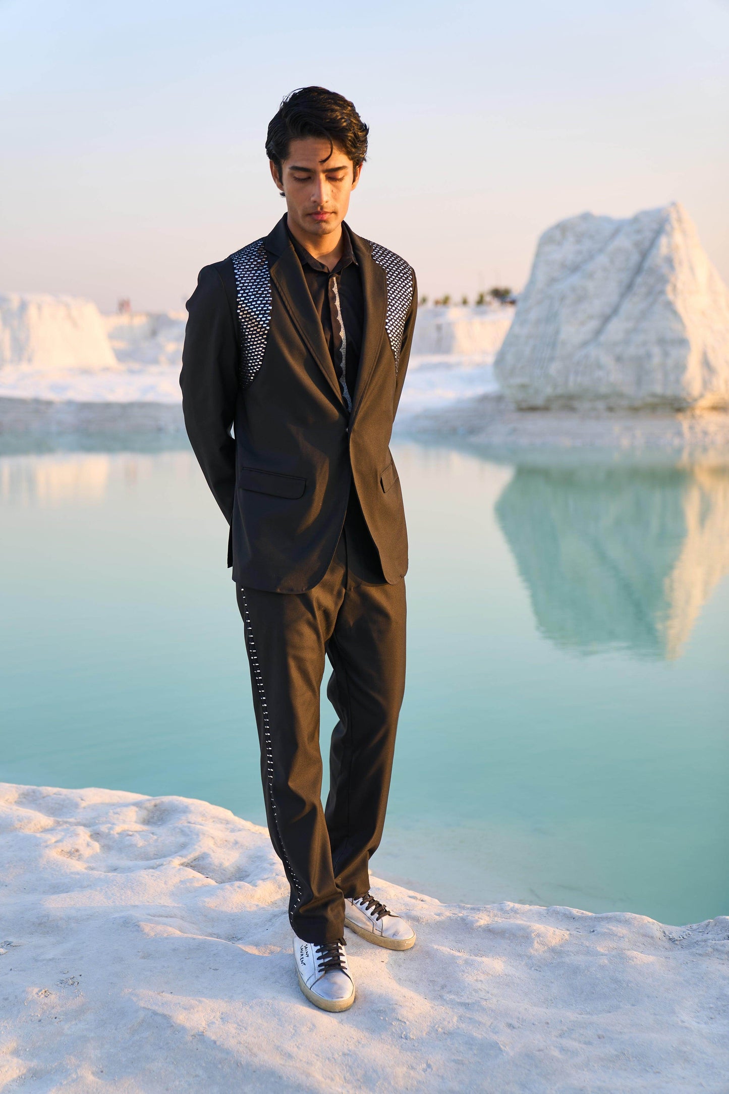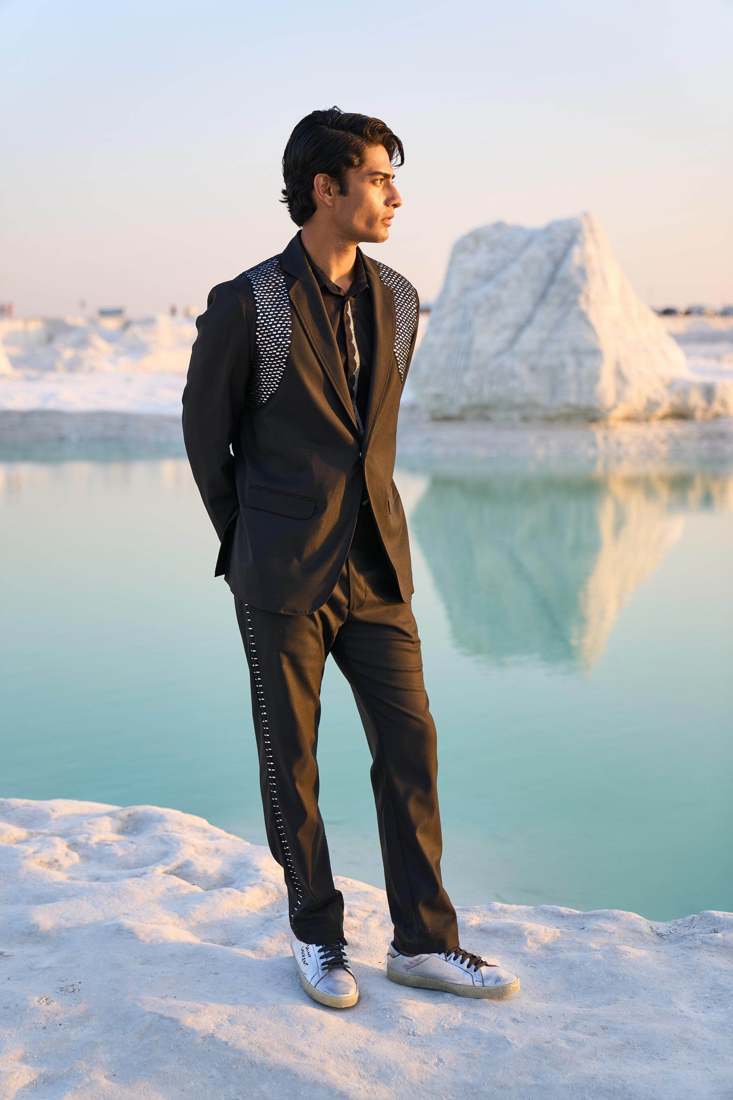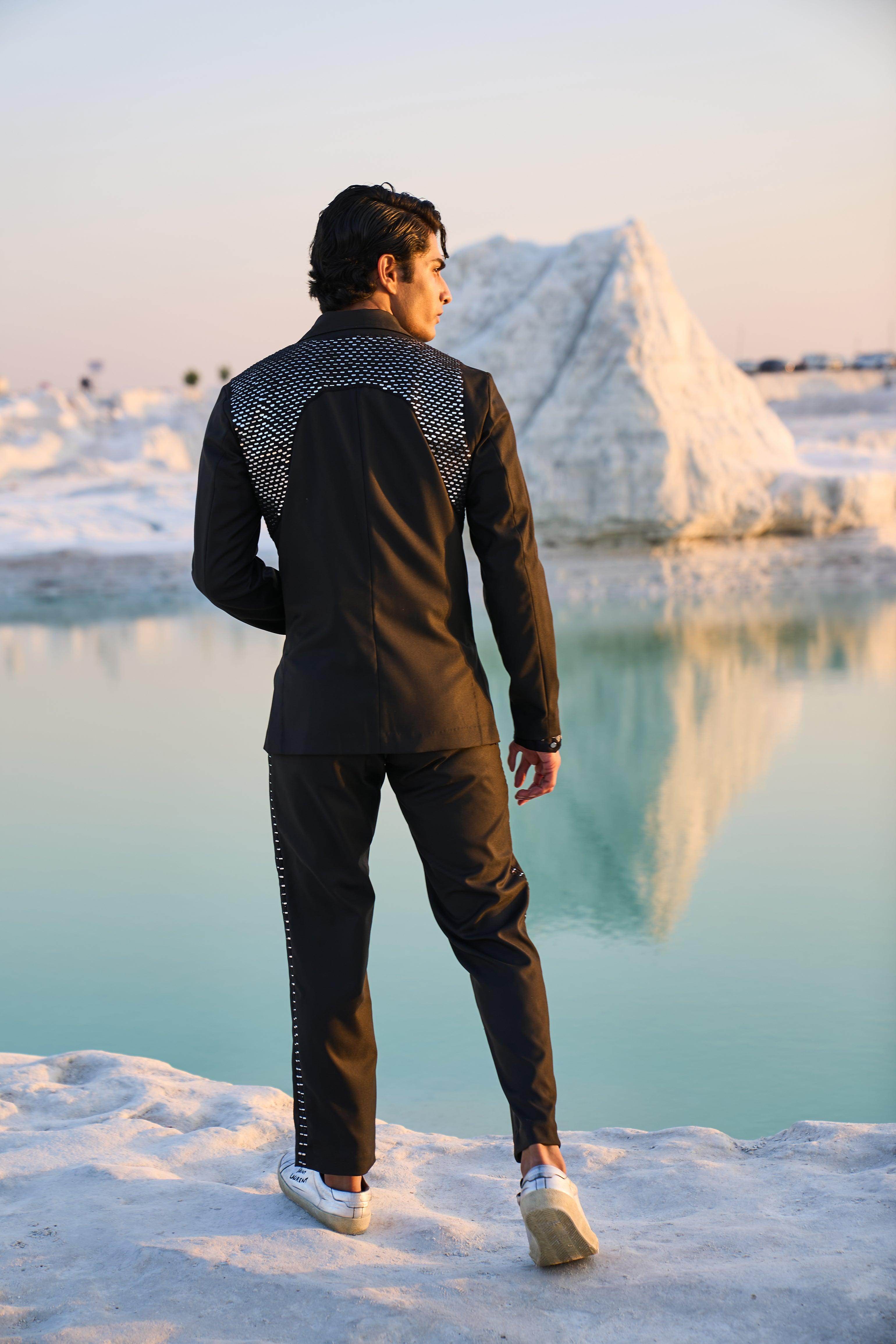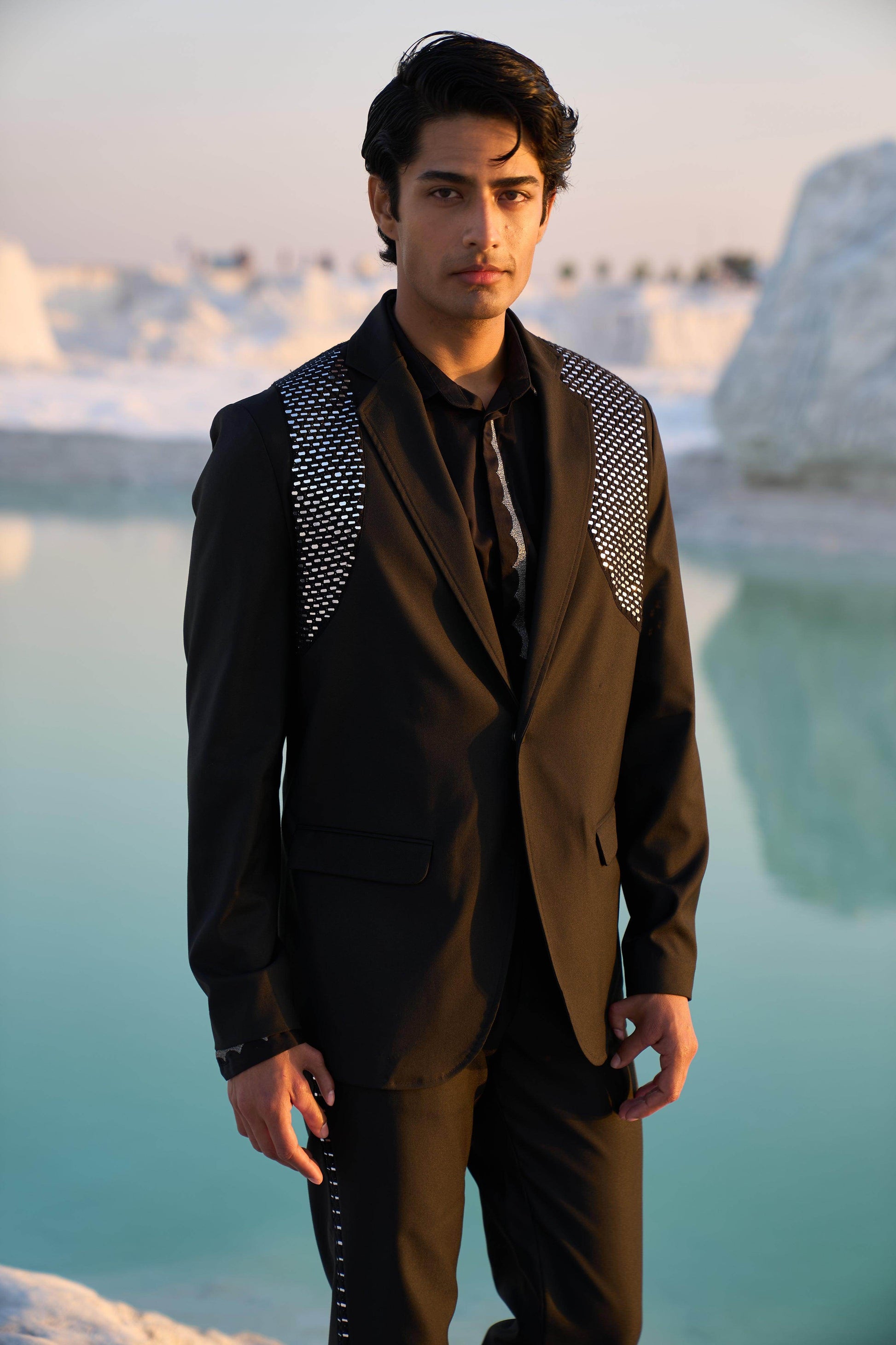 Black regular fit semi-lined blazer with allover hand and machine applied mirror embroidery in the shape of a harness. Single snap button closure. Pockets at the front.