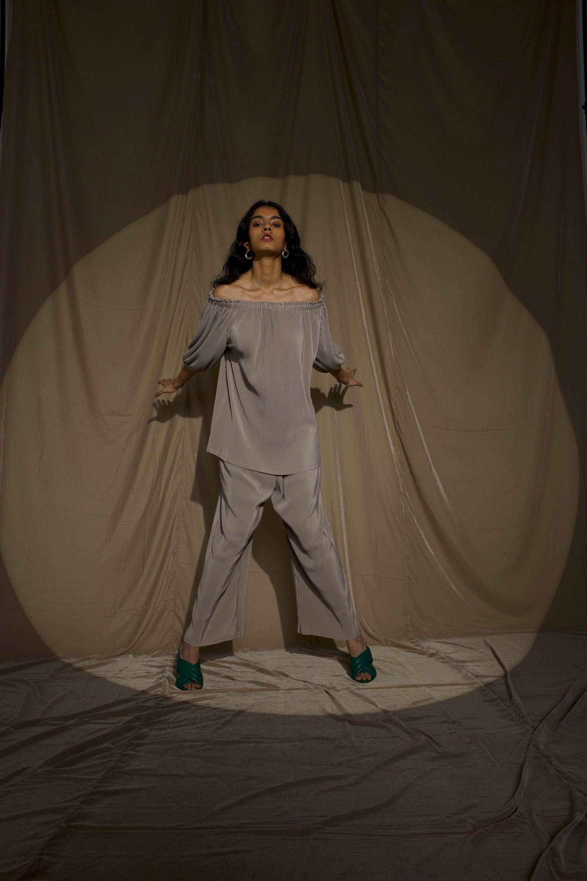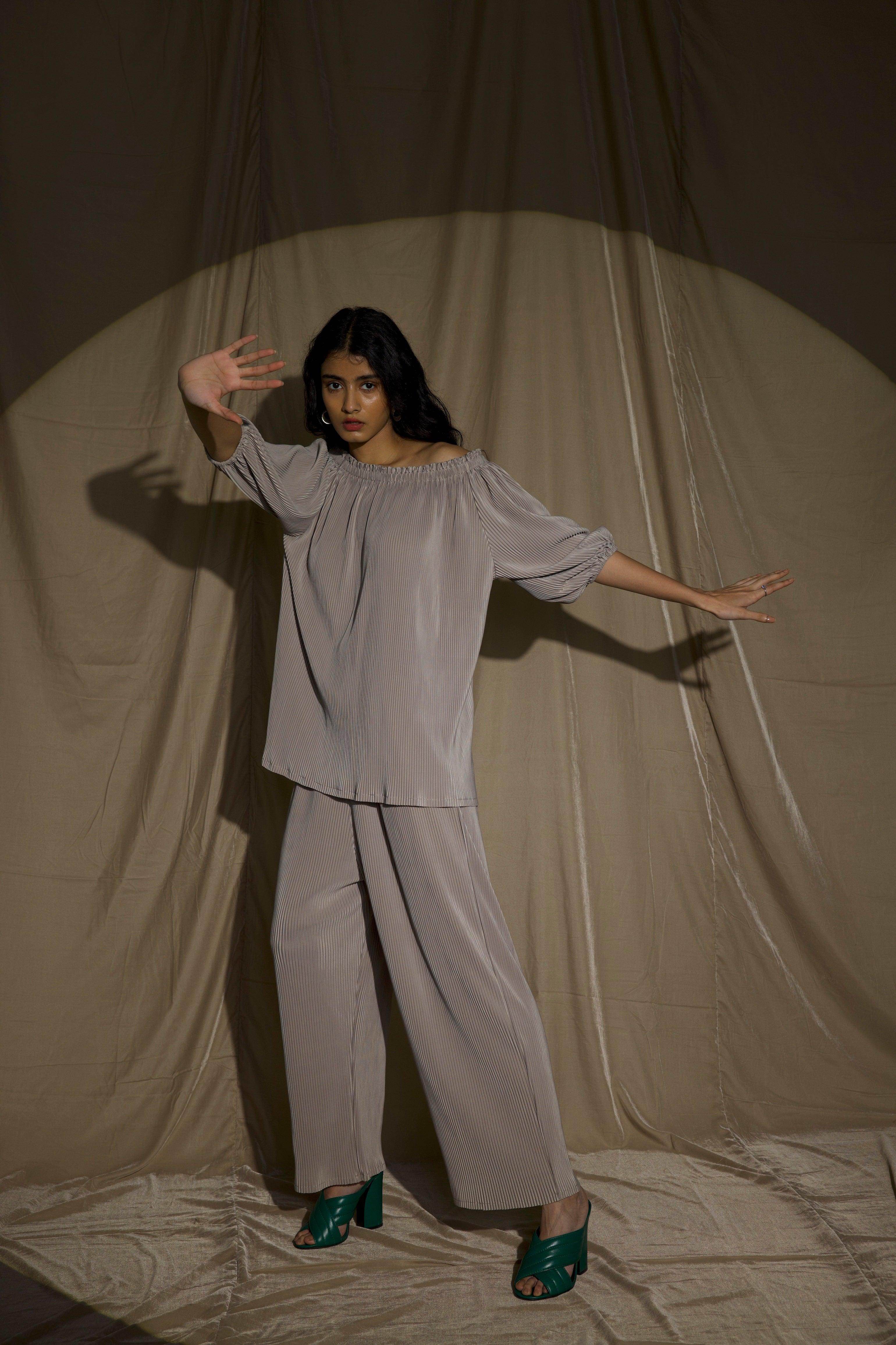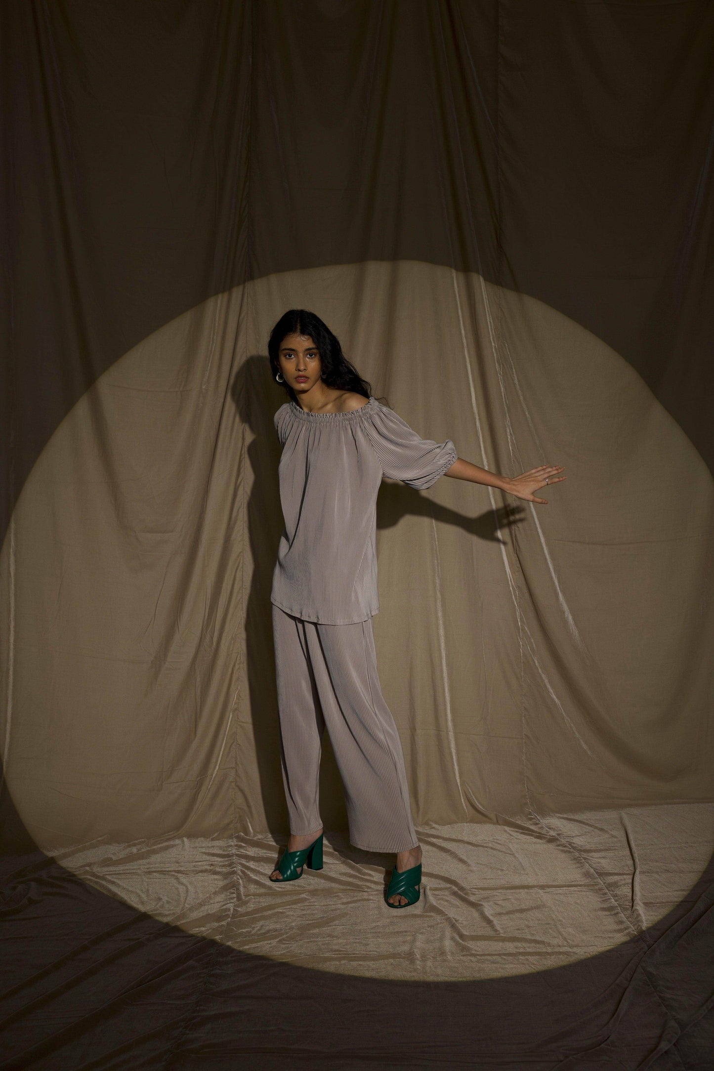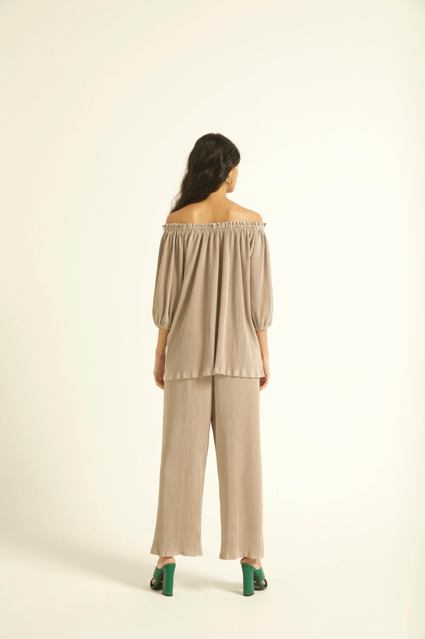 Off-the-shoulder pleat top with three-fourth sleeves. Elasticated neck and sleeve cuff, flowy fit. Matching wide-legged pants with elasticated waist.