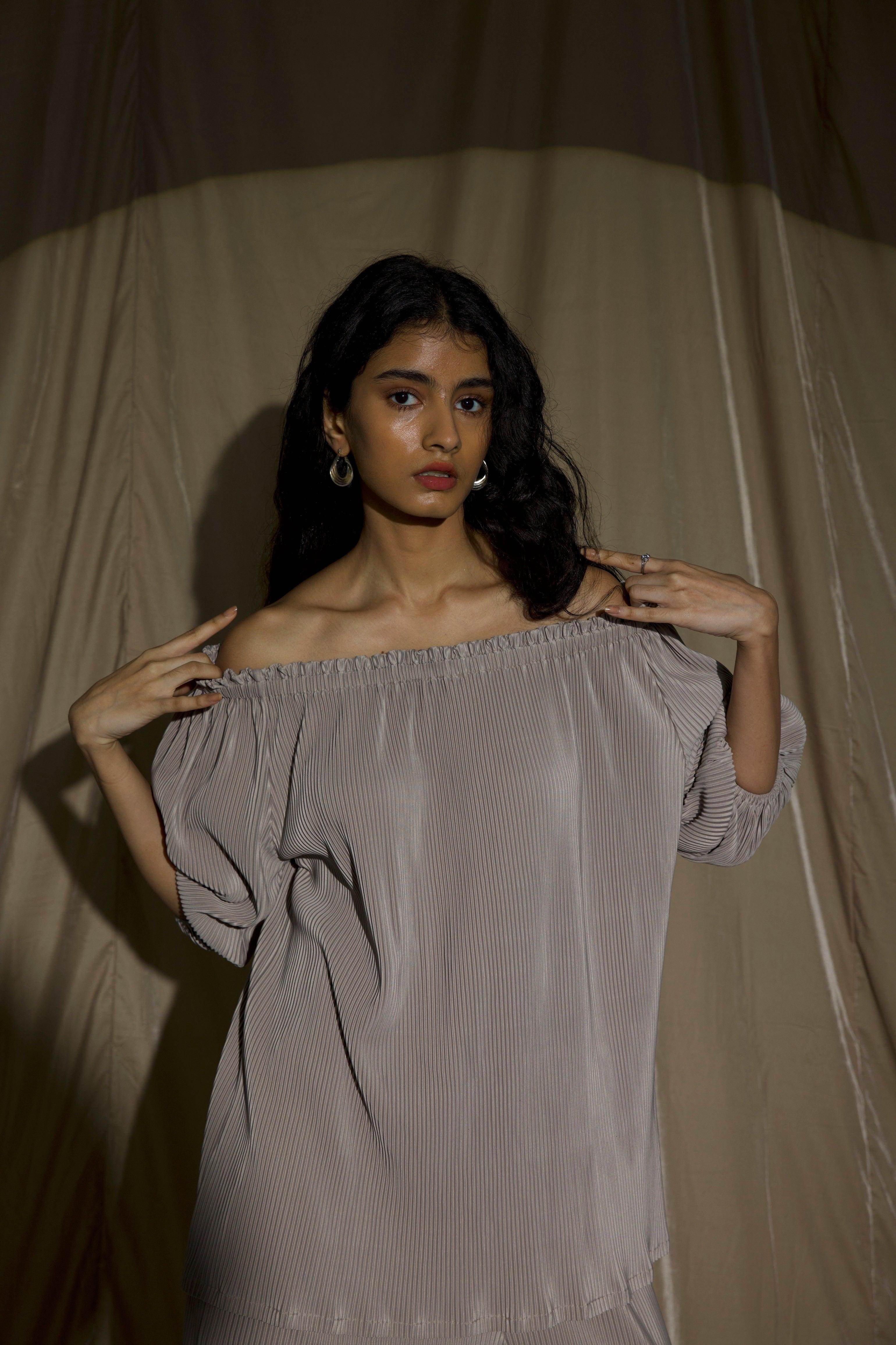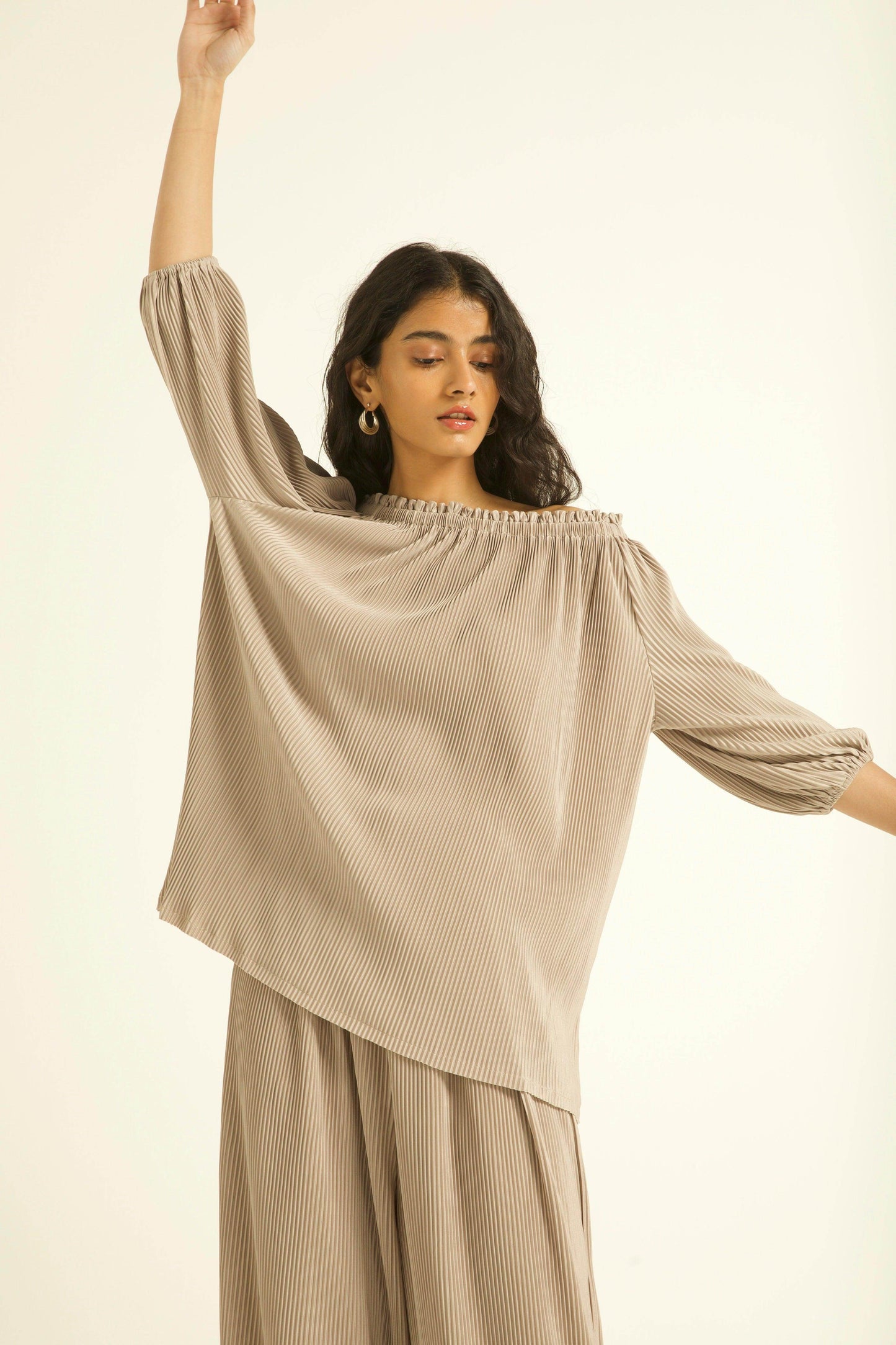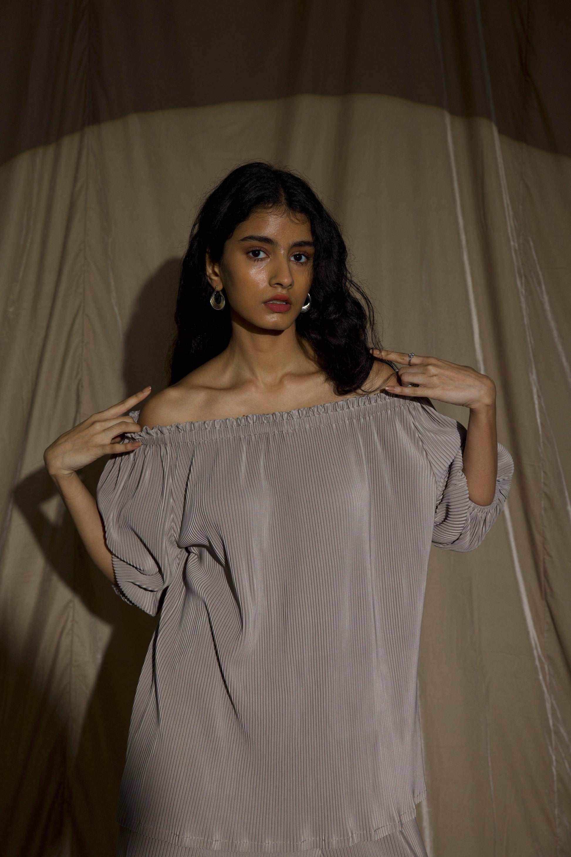Off-the-shoulder pleat top with three-fourth sleeves. Elasticated neck and sleeve cuff, flowy fit. Matching wide-legged pants with elasticated waist.