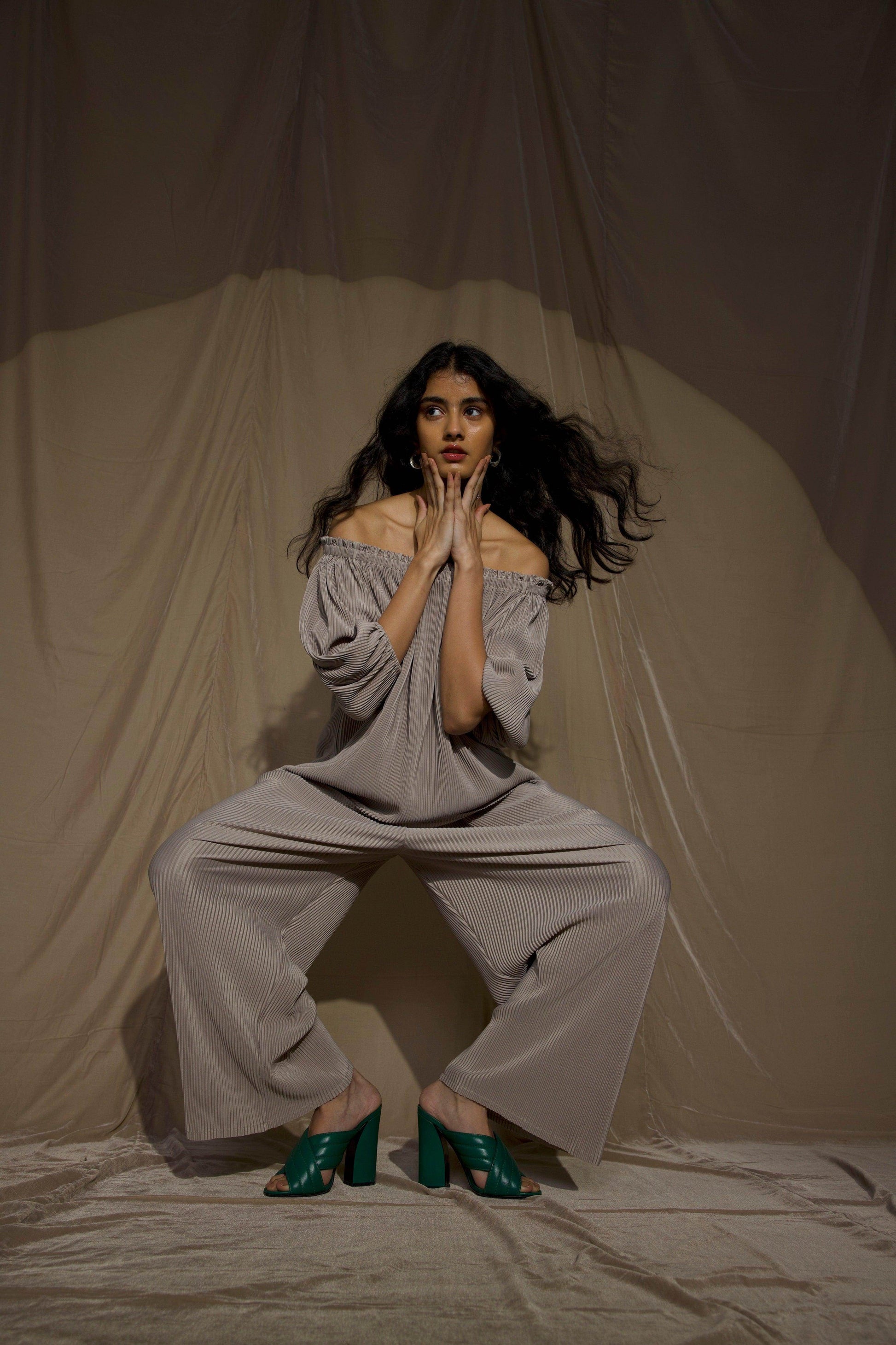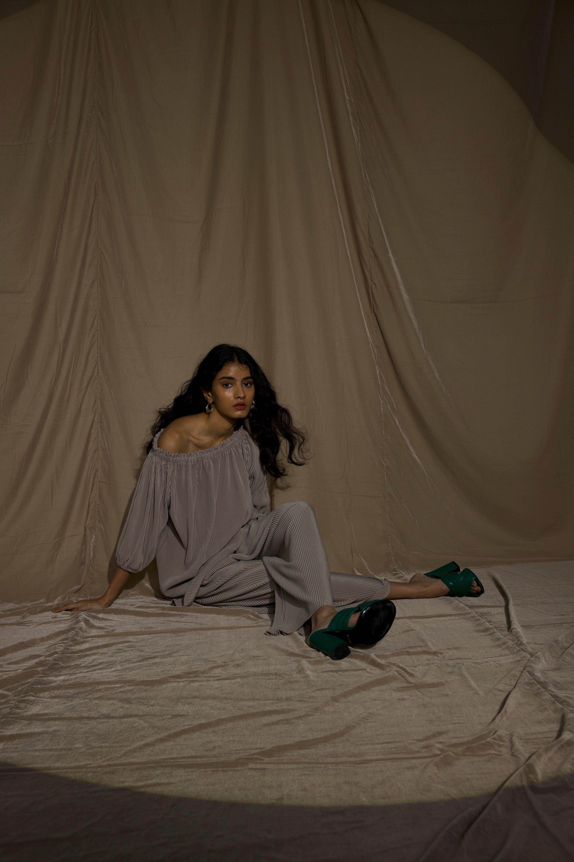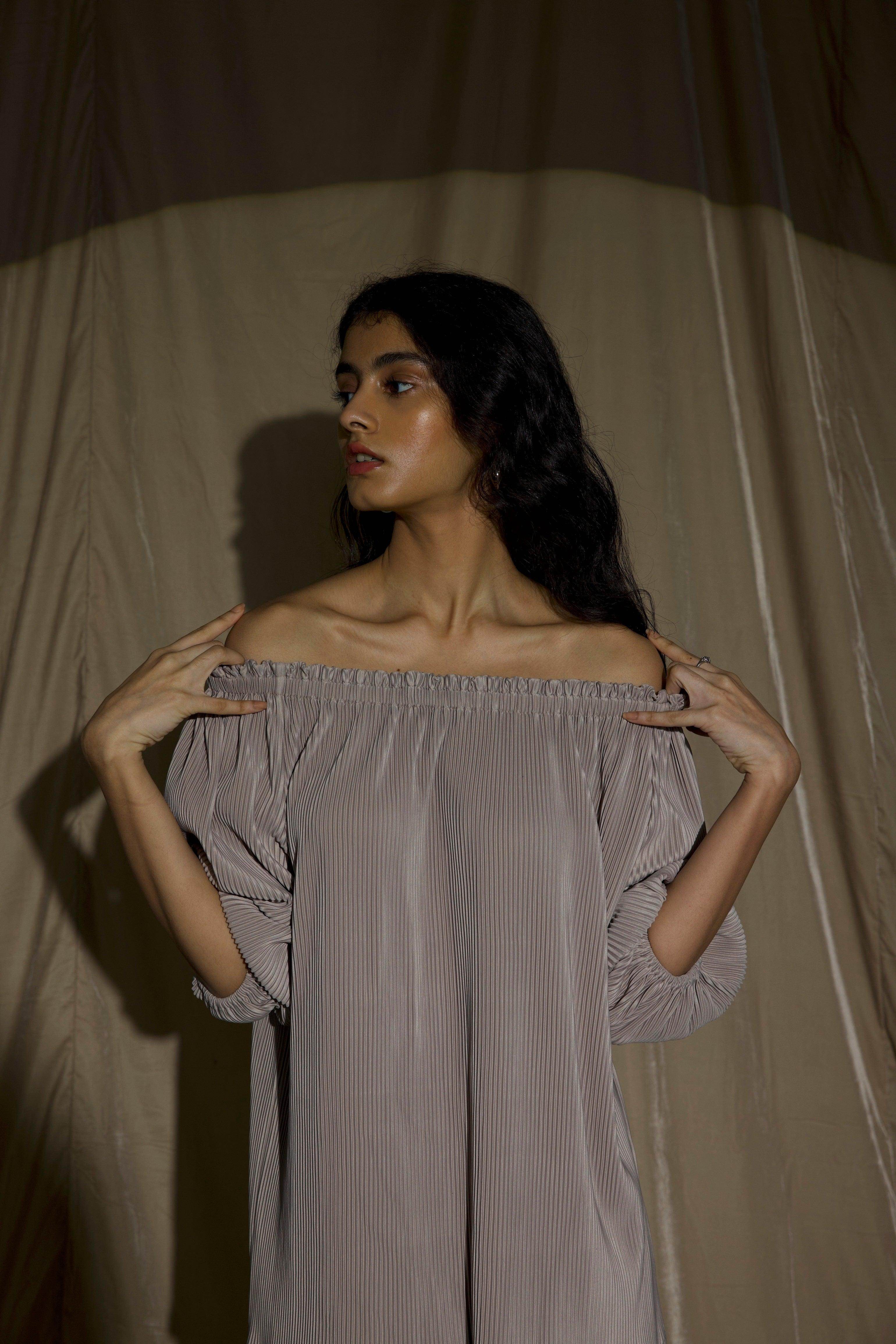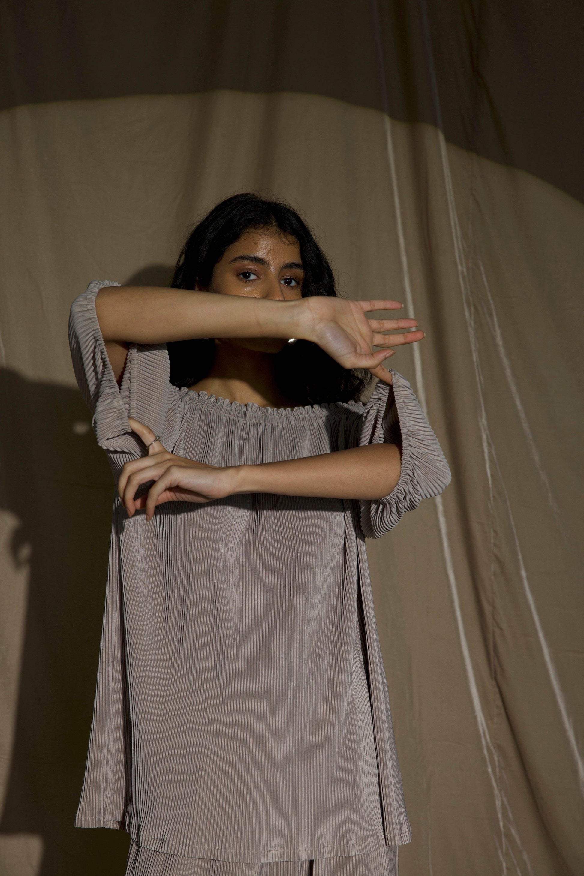 Off-the-shoulder pleat top with three-fourth sleeves. Elasticated neck and sleeve cuff, flowy fit. Matching wide-legged pants with elasticated waist.