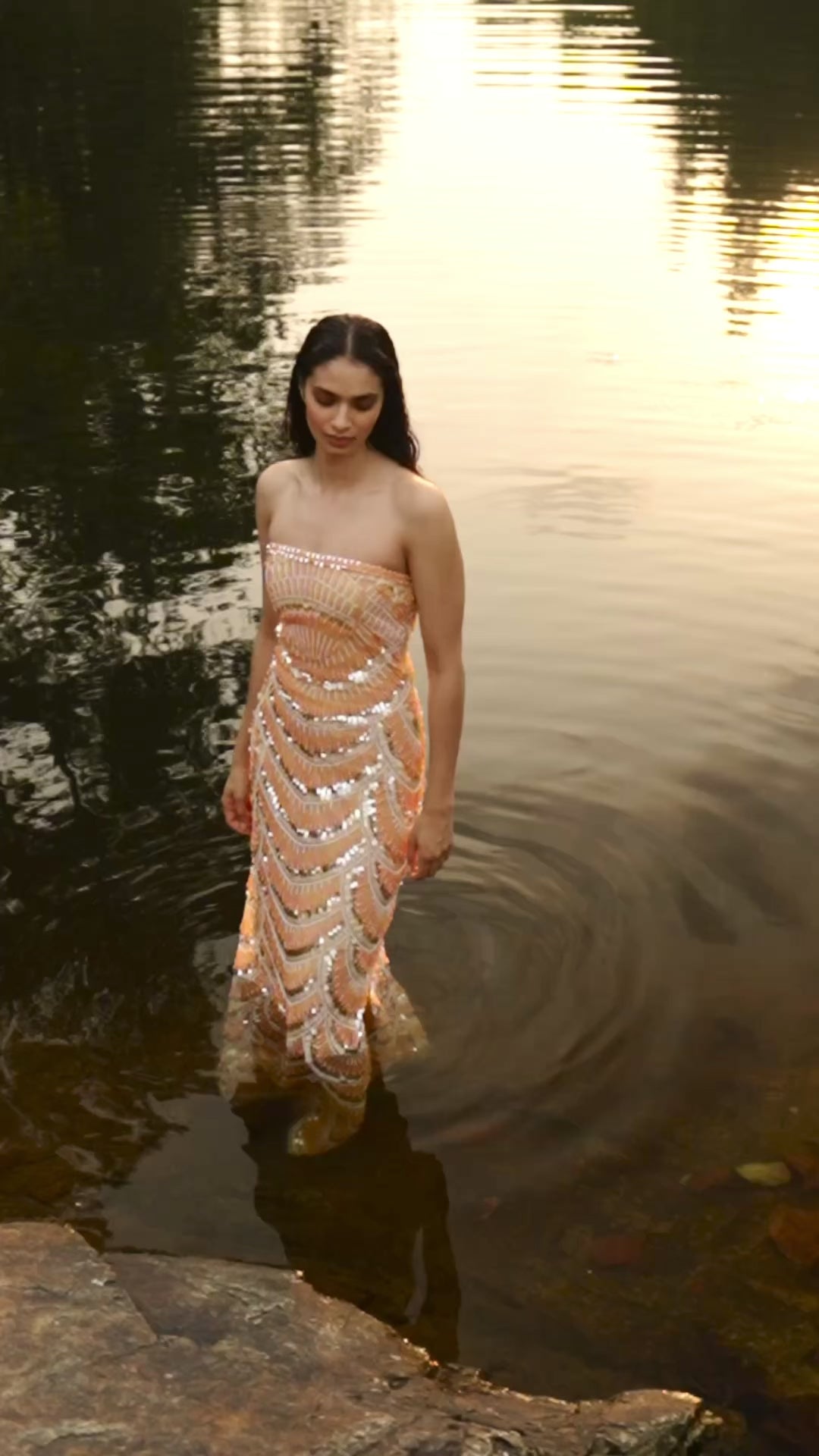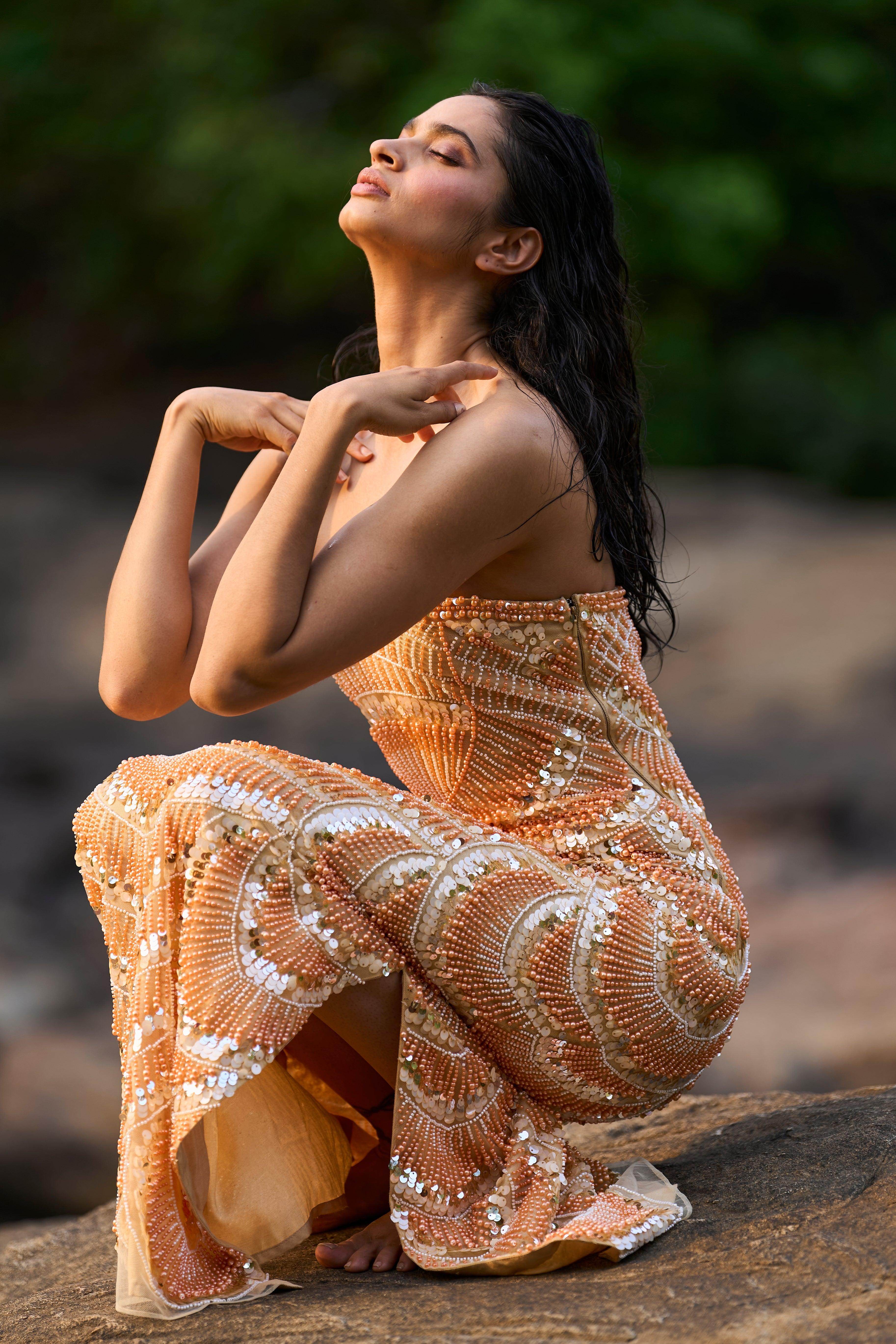 Straight fit gown adorned with delicate sequin and pearl. Placed design with a cascading embroidery. Side slit for effortless movement. Side zipper, hook-and-eye closure. Comes with adjustable detachable straps.