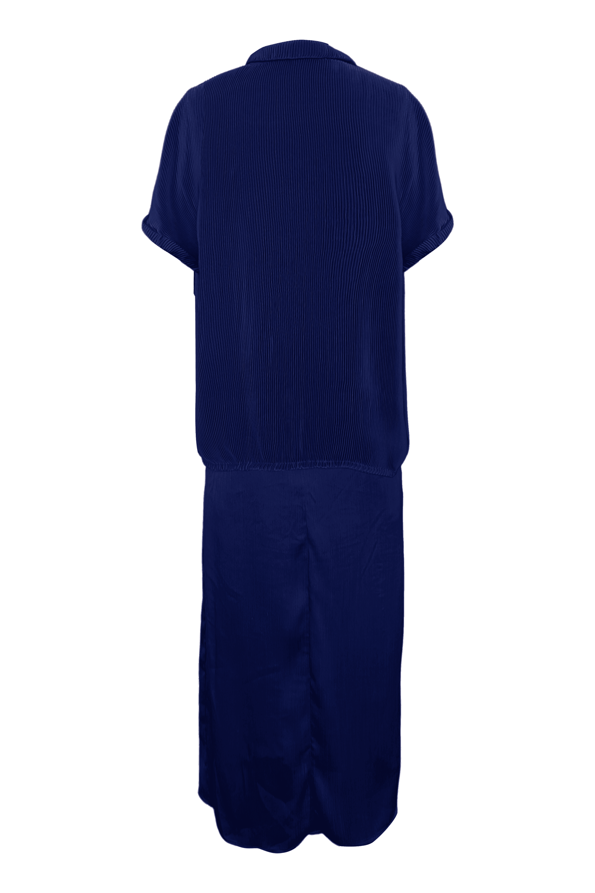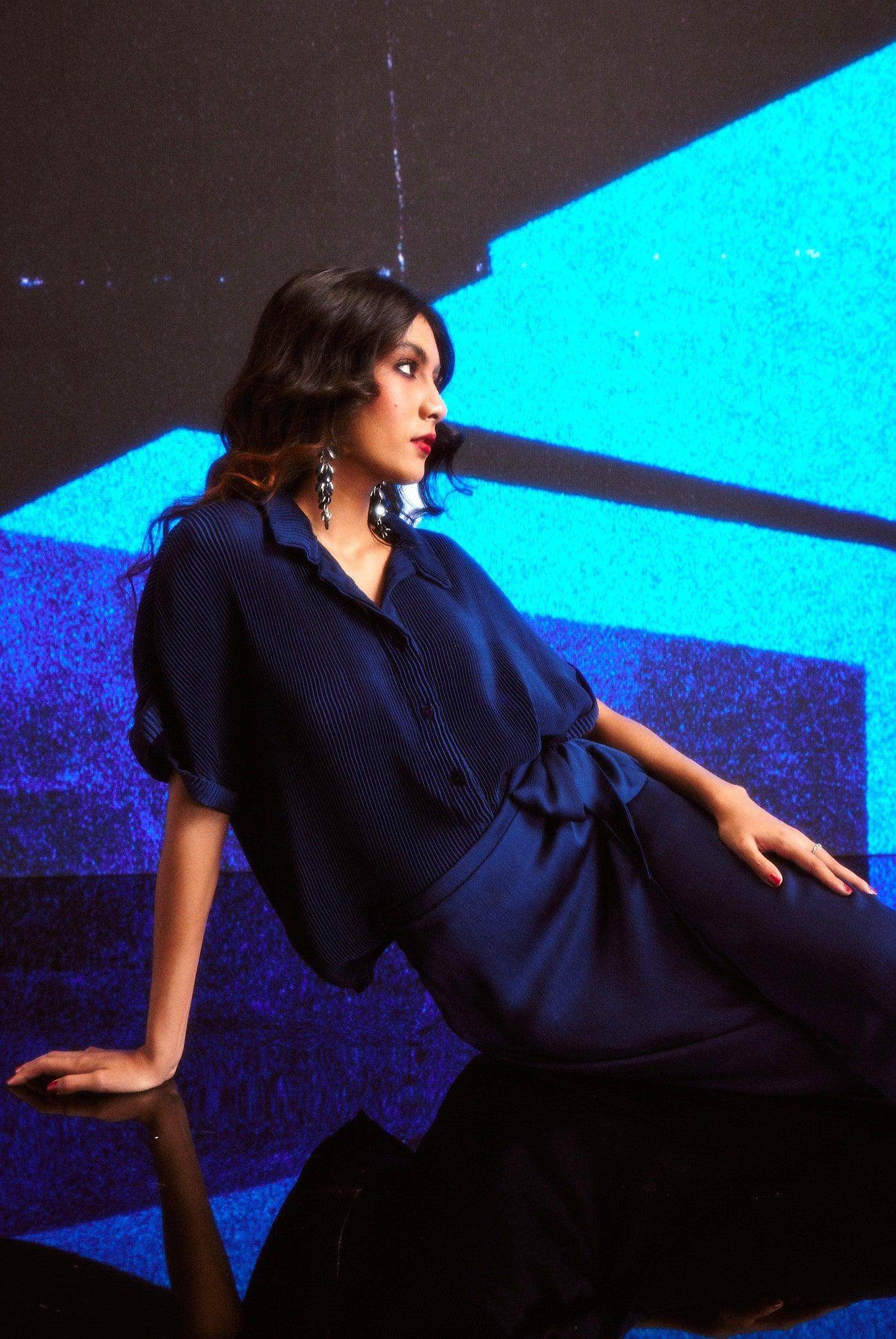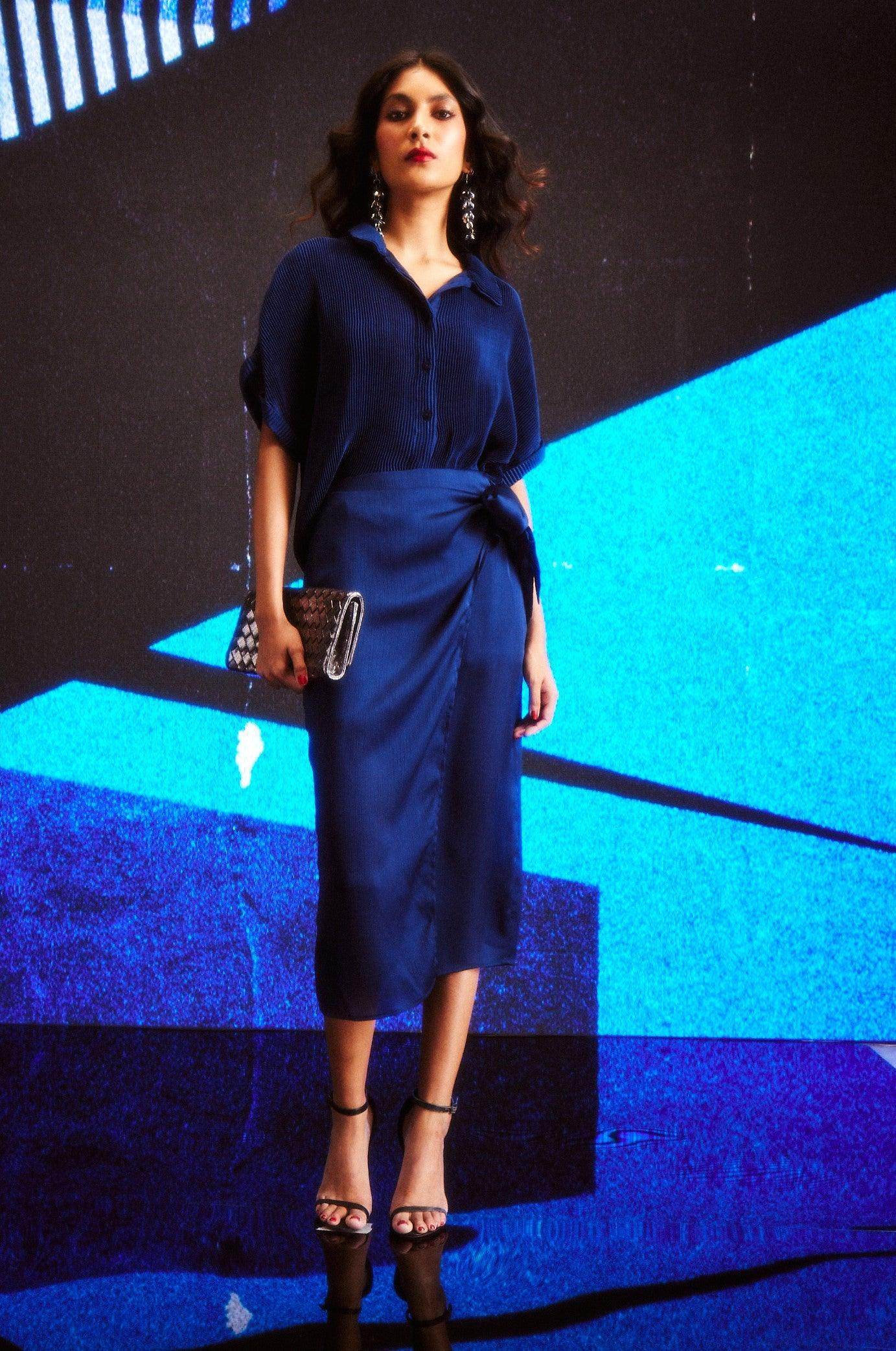 Navy pleated button-down shirt. Dolman half sleeves with turn-up cuff detail. Paired with complementary overlap skirt with tie-up at the front waist. Semi-lined. Flowy silhouette.