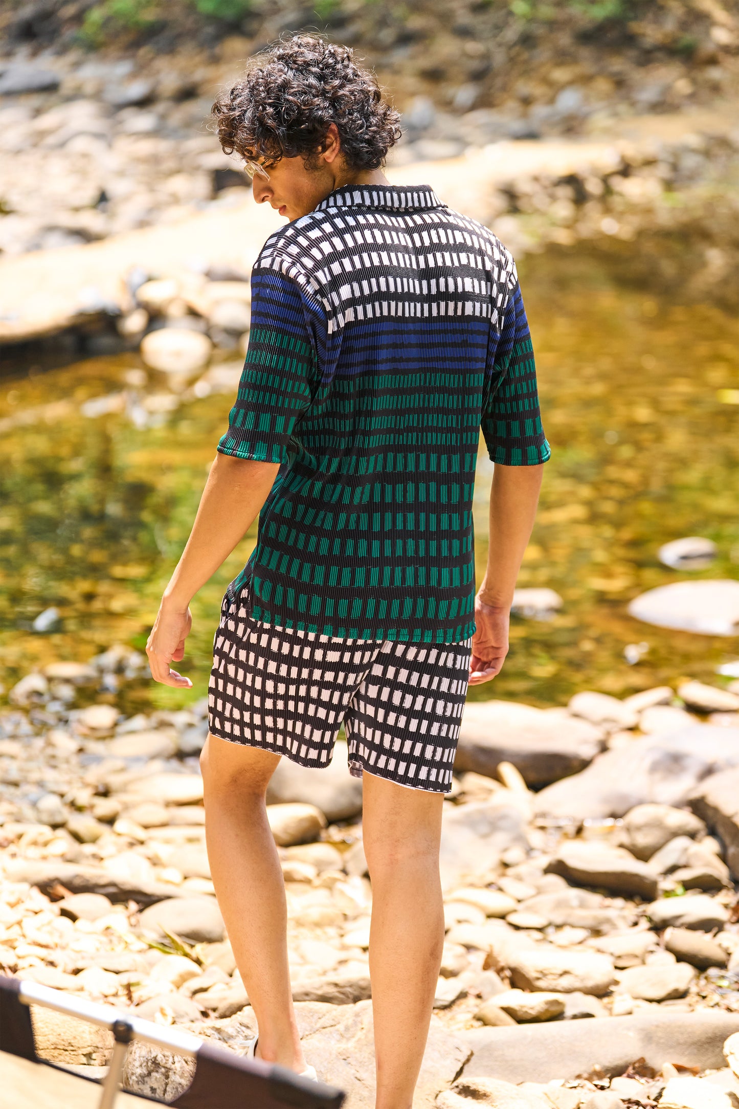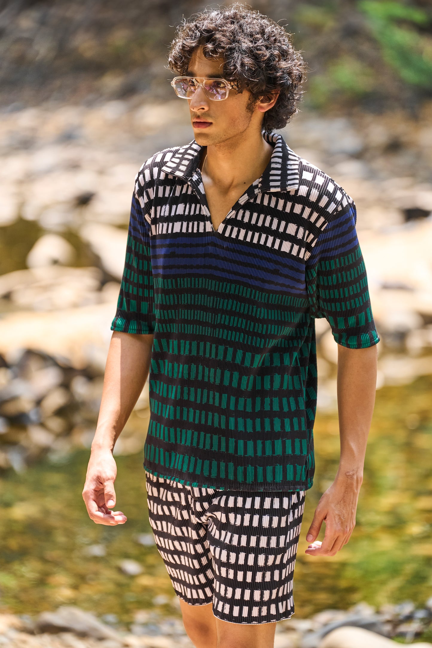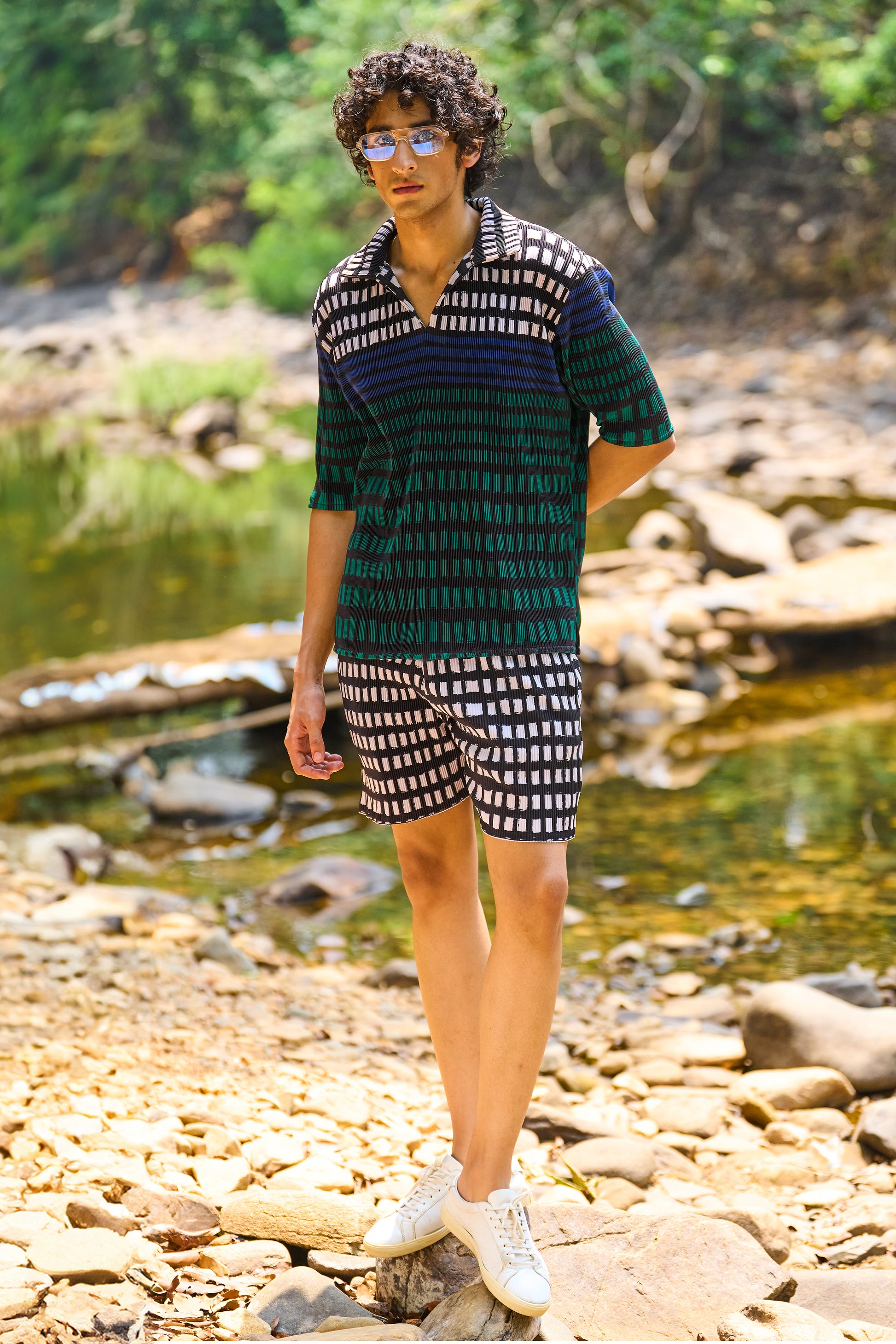 Printed pleated shorts in a hand painted black and white check. Fully elasticated waistband with a zip fly and hook closure. Side pockets.