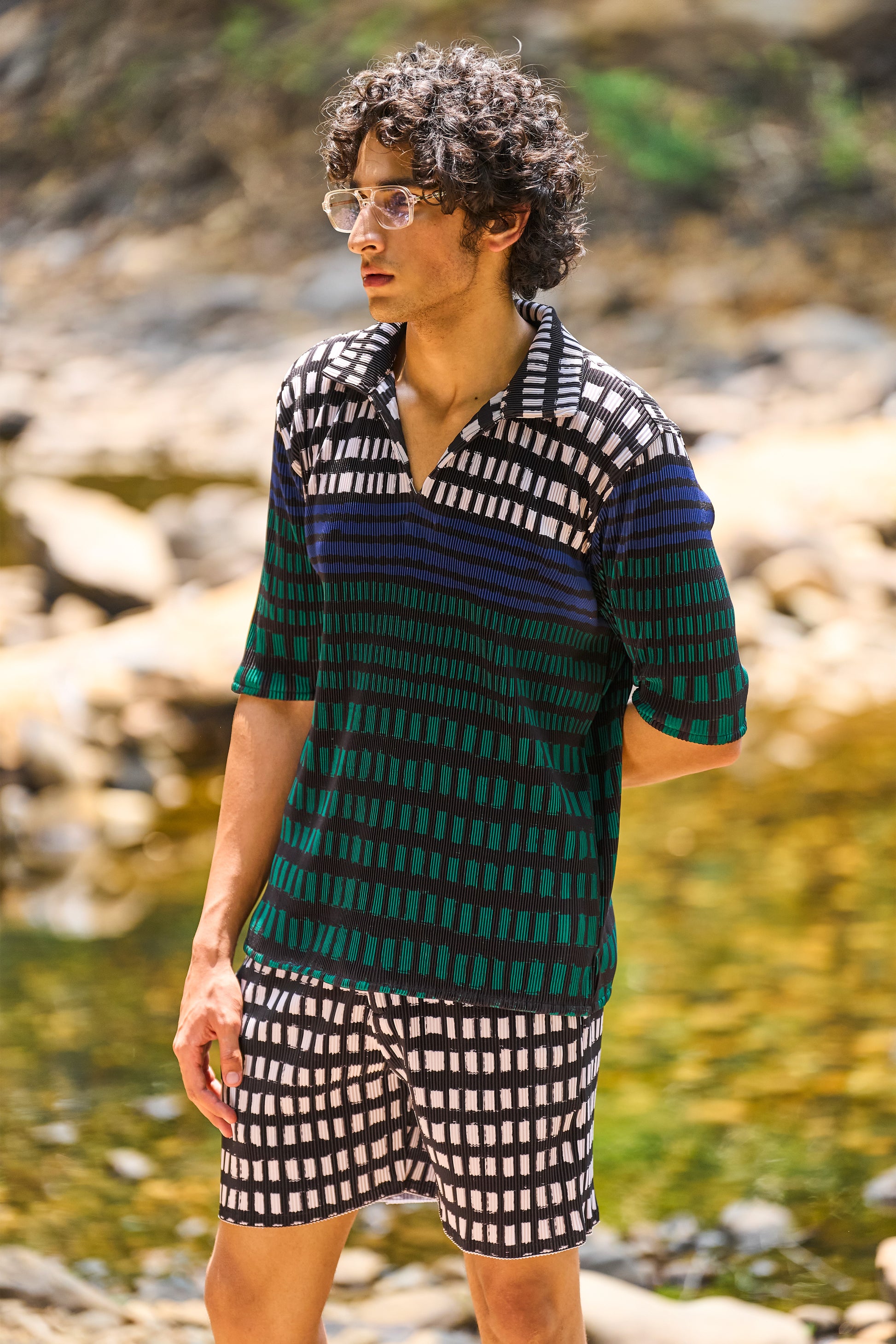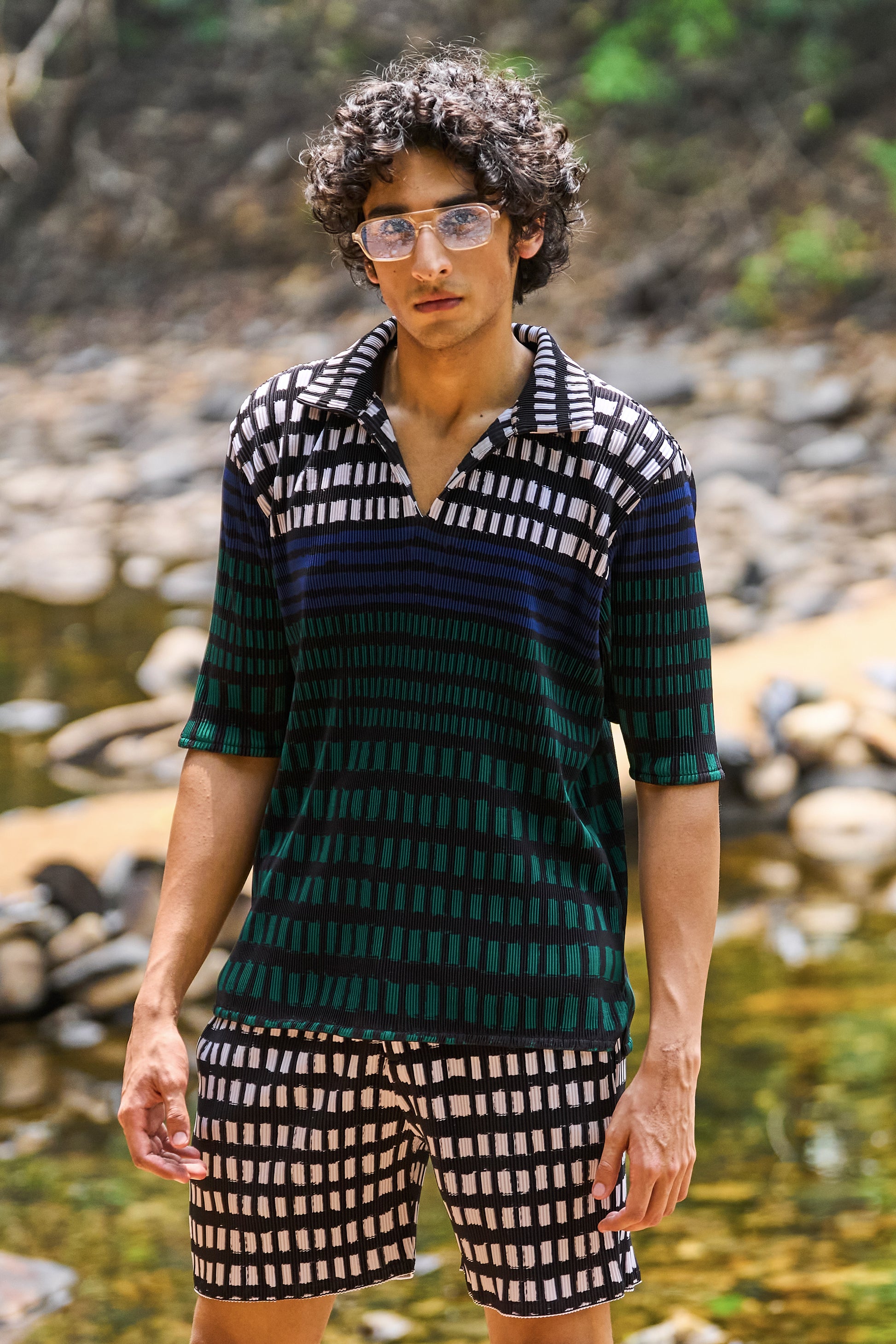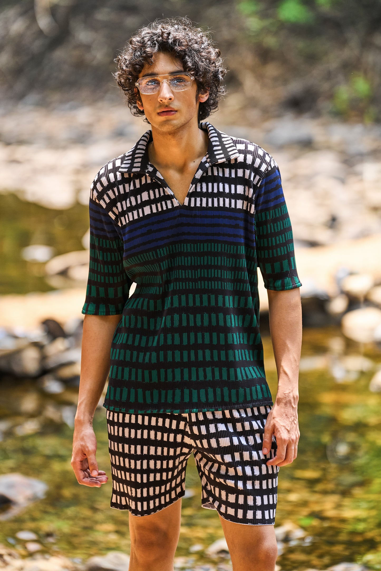 Printed pleated shorts in a hand painted black and white check. Fully elasticated waistband with a zip fly and hook closure. Side pockets.