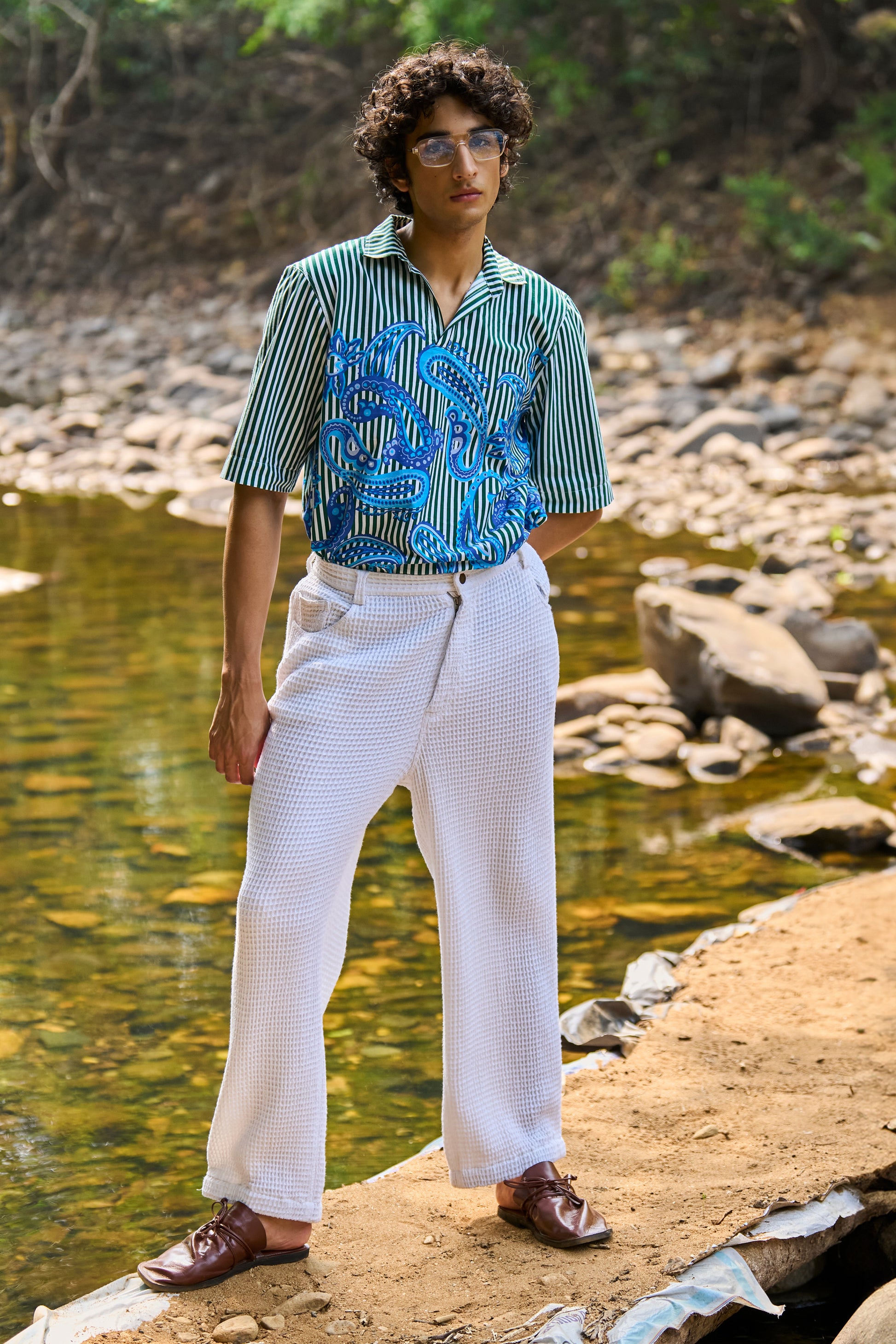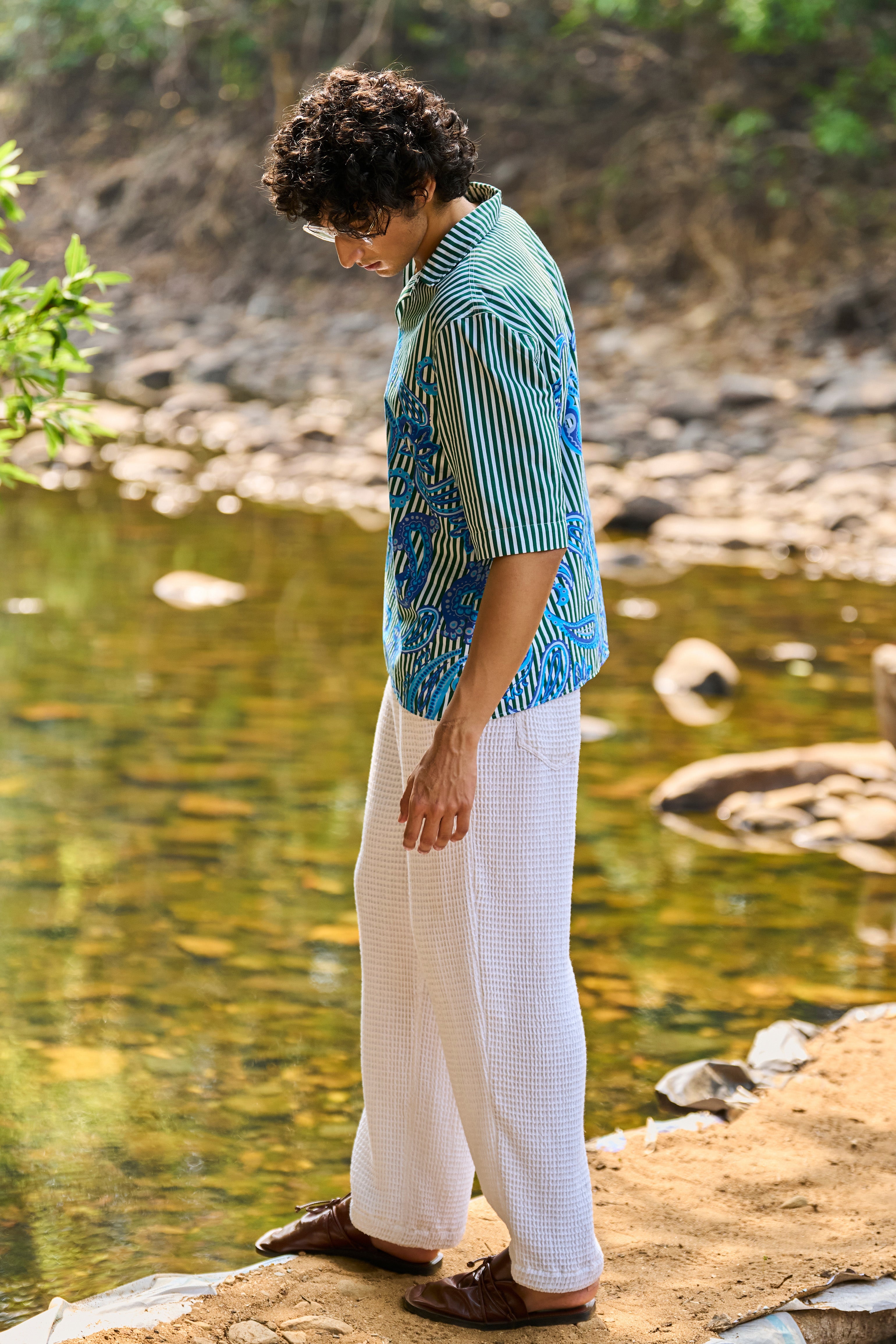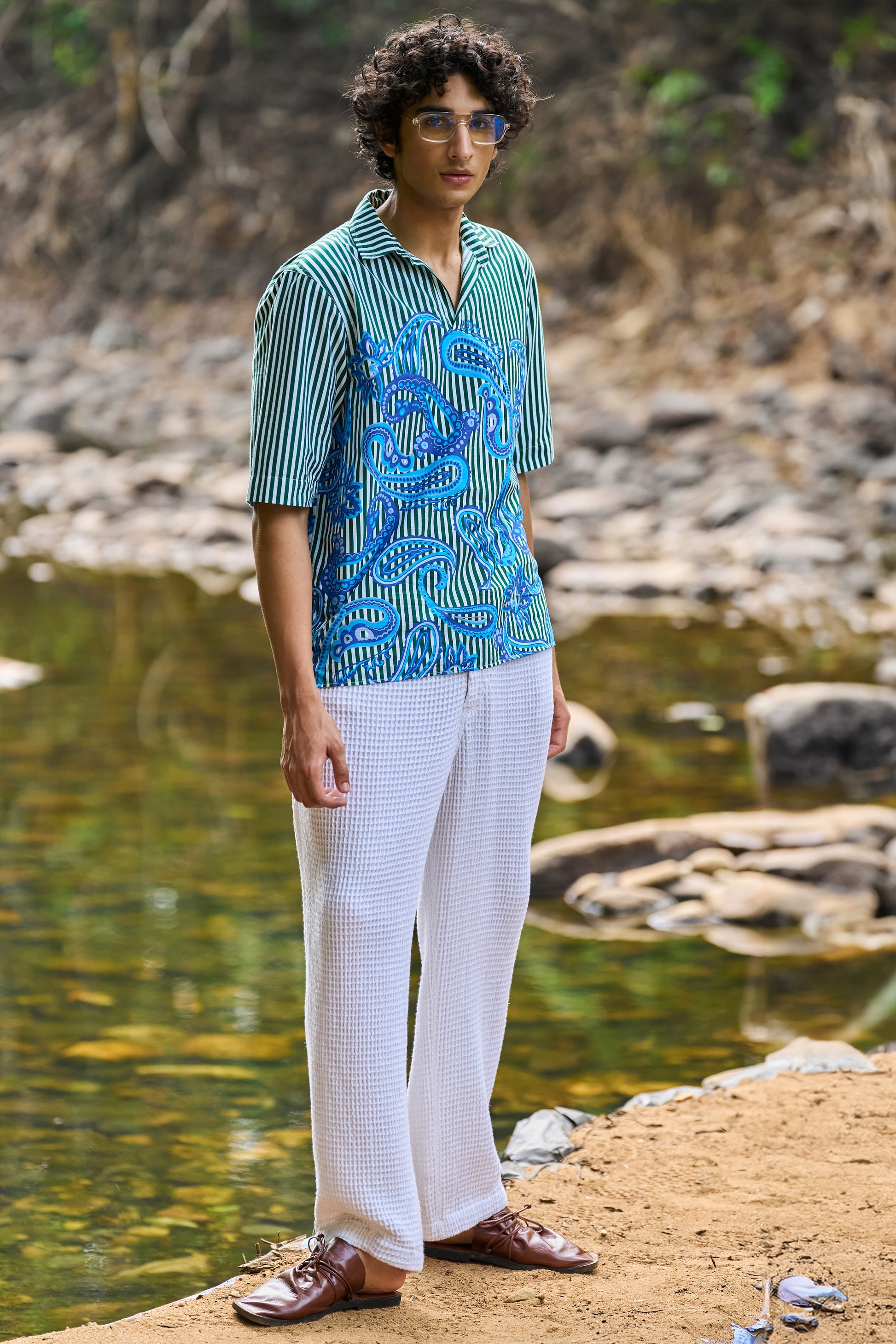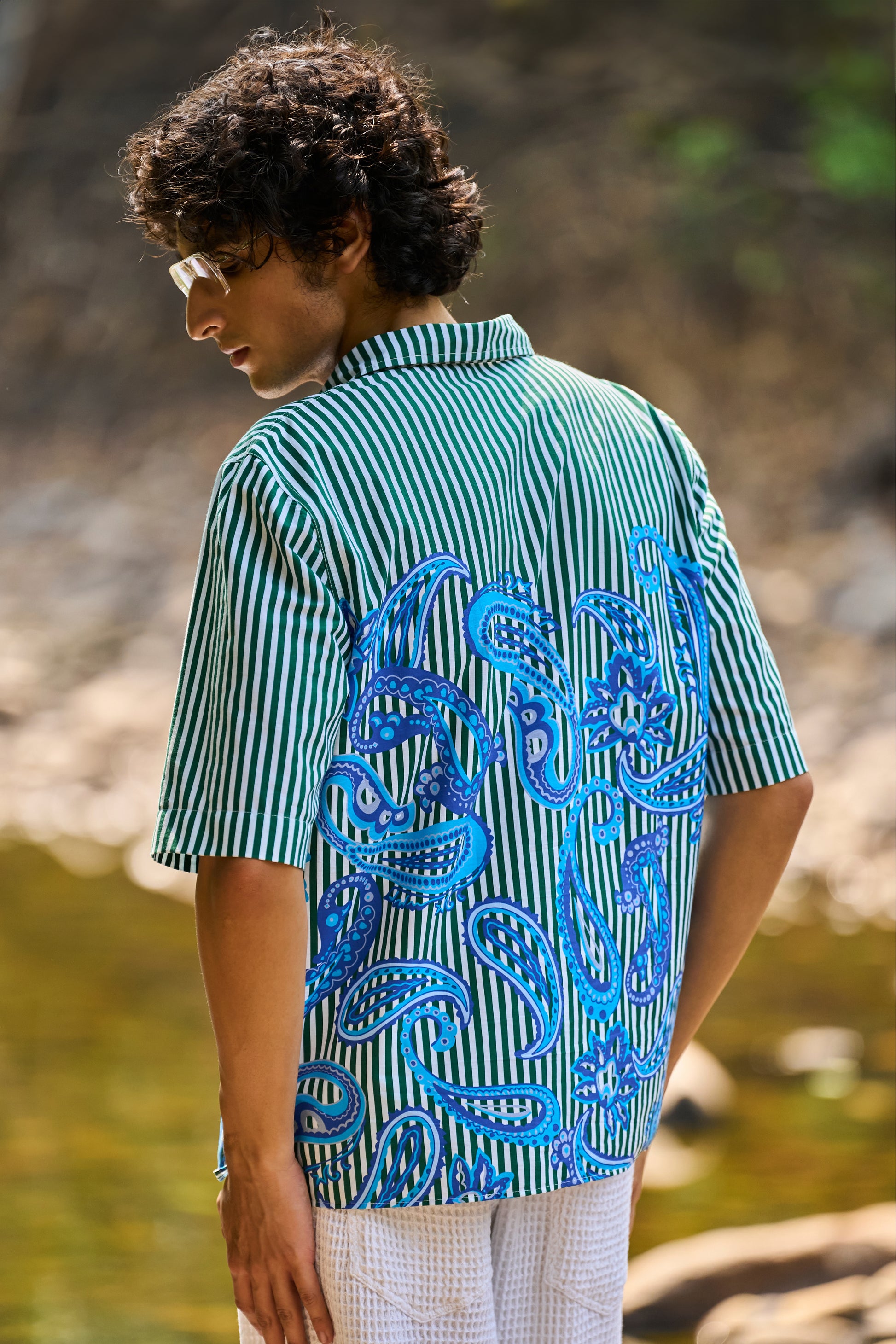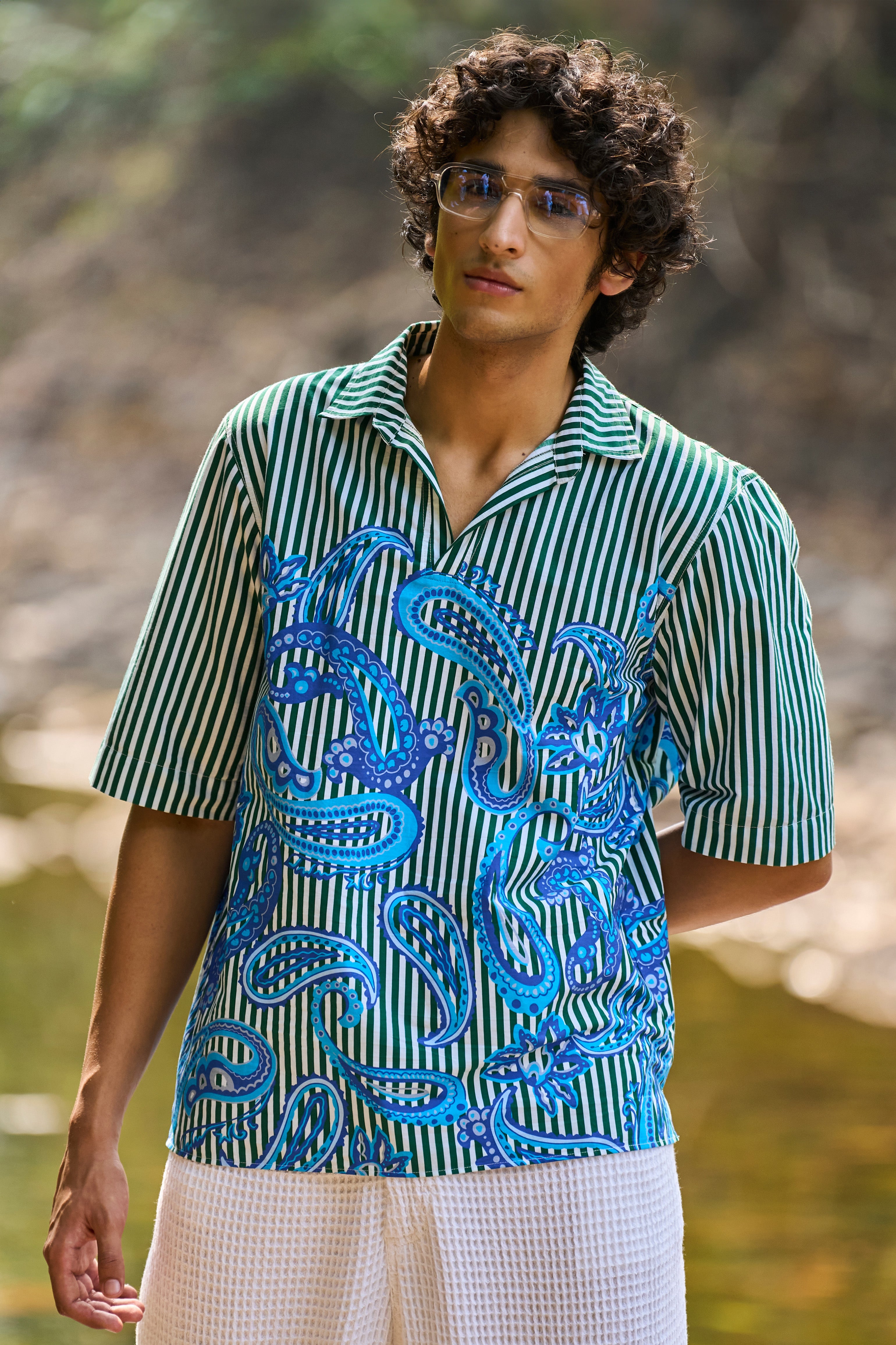 Paisley-printed popover shirt on a striped green and white base. Long straight half sleeves. Relaxed fit.