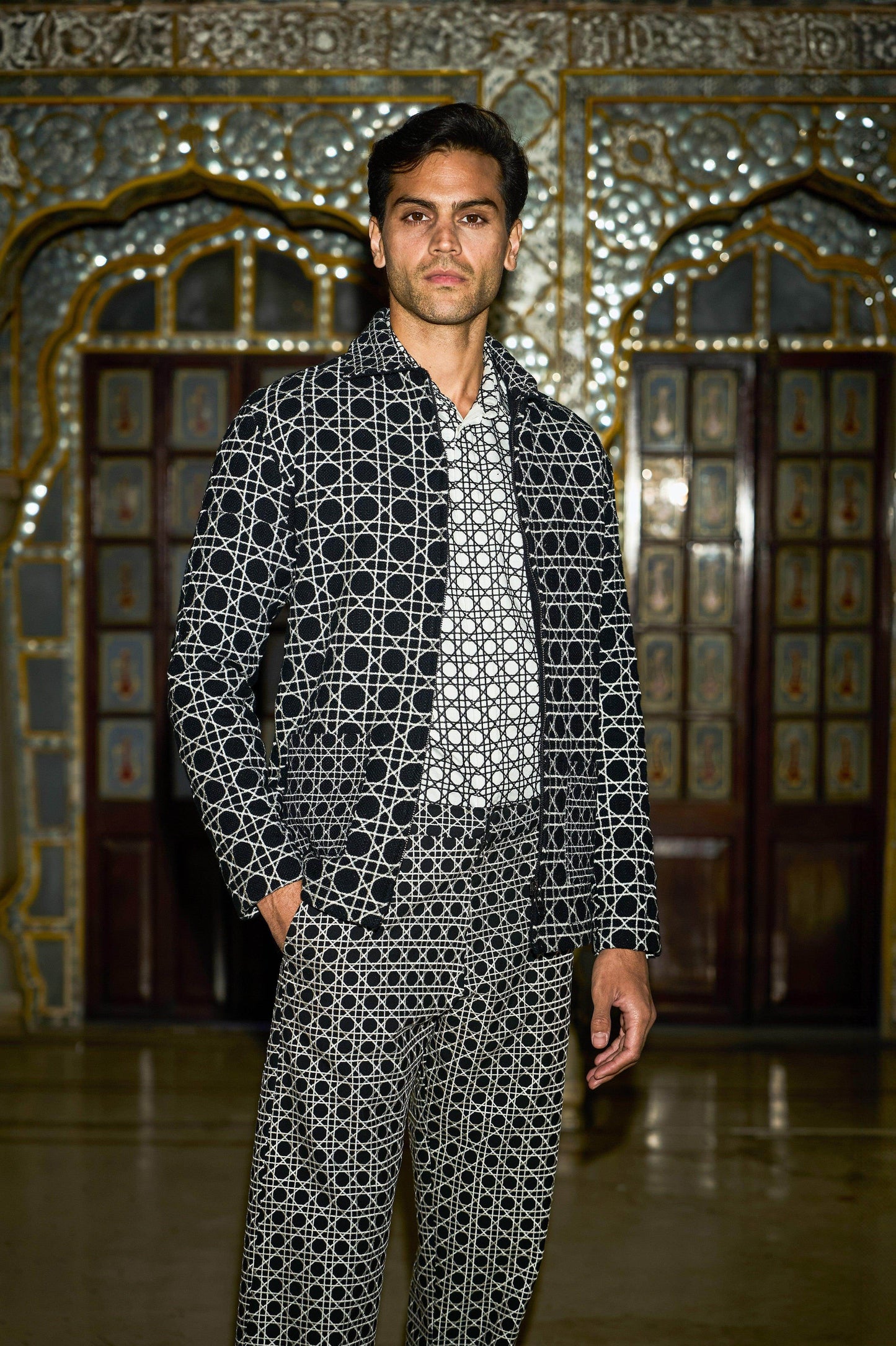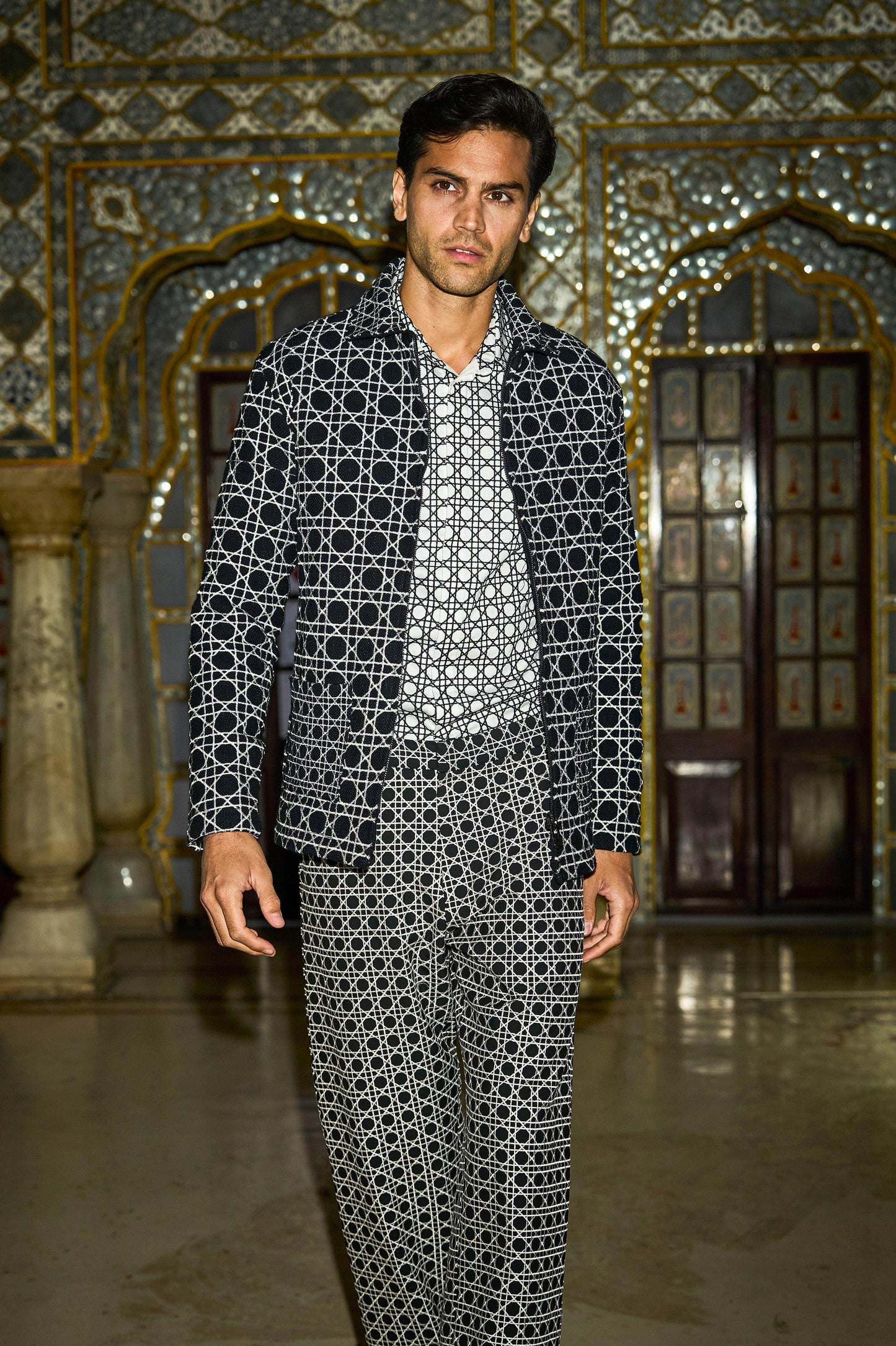 Allover white on black embroidered jacket in cotton tweed. Caning rattan inspired pattern varied in scale. Zip front closure with patch pockets in front. Worn over reversed allover black on white embroidered shirt in organic cotton poplin. Caning rattan inspired pattern varied in scale. Full sleeves with snap button detail on cuff. Shirt collar, cocealed placket. Relaxed fit. Paired with allover white on black embroidered trouser. Caning rattan inspired pattern varied in scale. Straight cut pants with pockets in the side and back. Hook/eye and zip front closure.