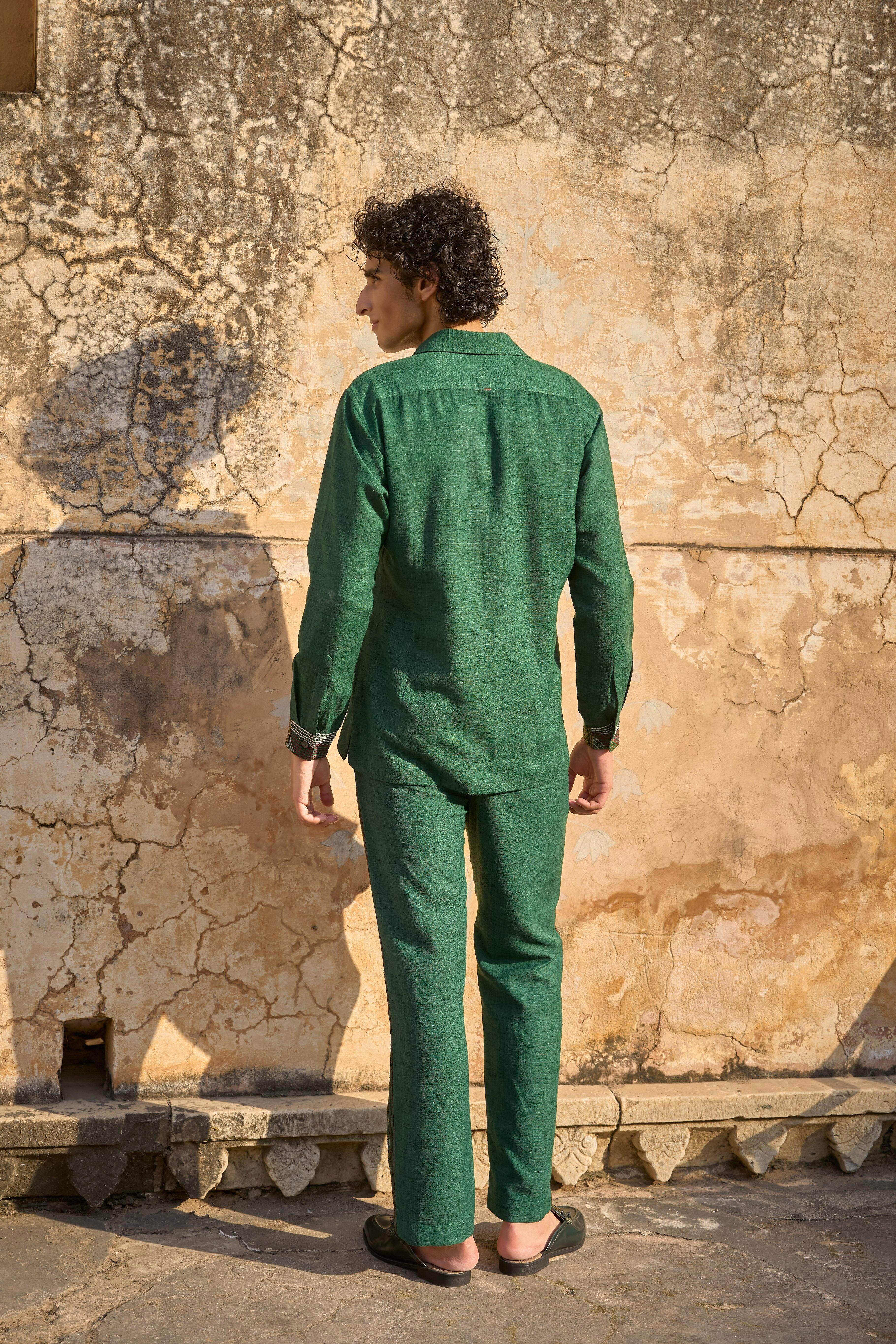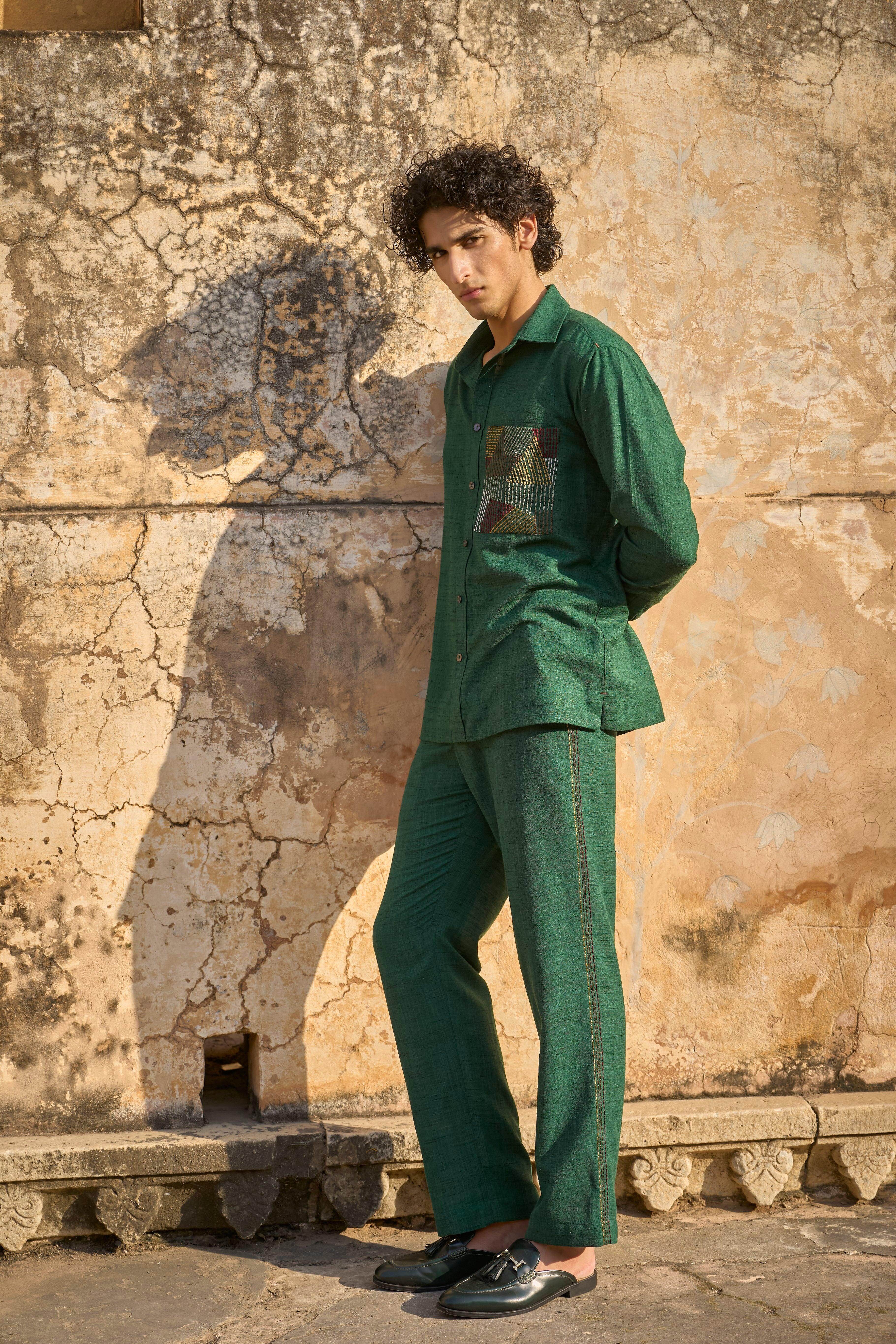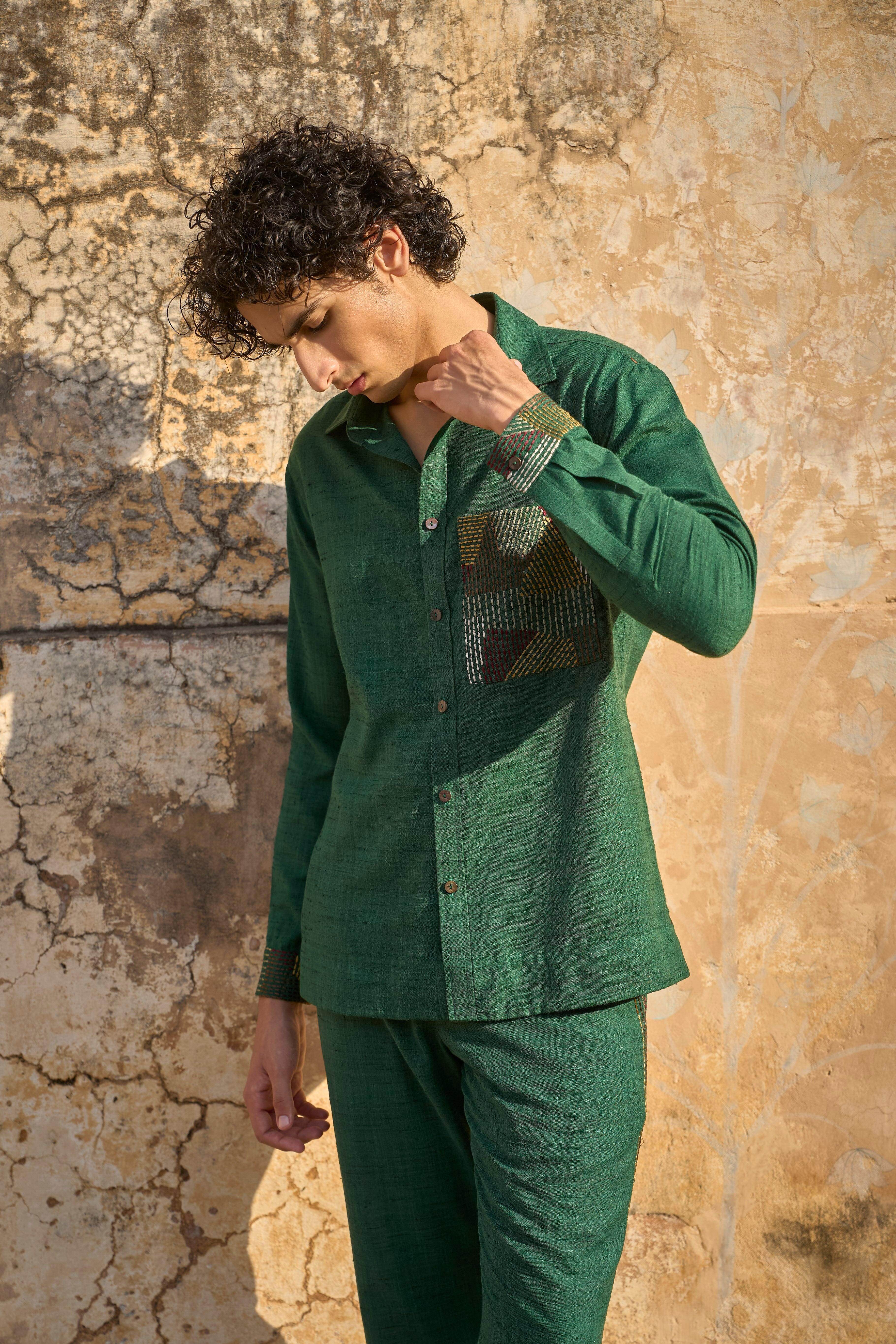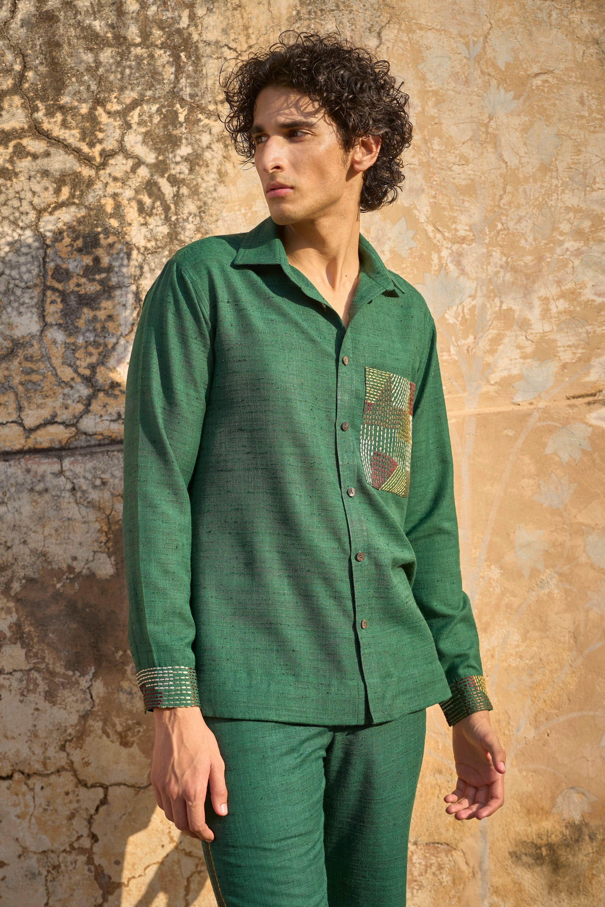 Textured slub shirt in emerald green with contrast earth toned kantha stitch detailing on the pocket and sleeve cuff. Full sleeves, relaxed fit. Full front button down.